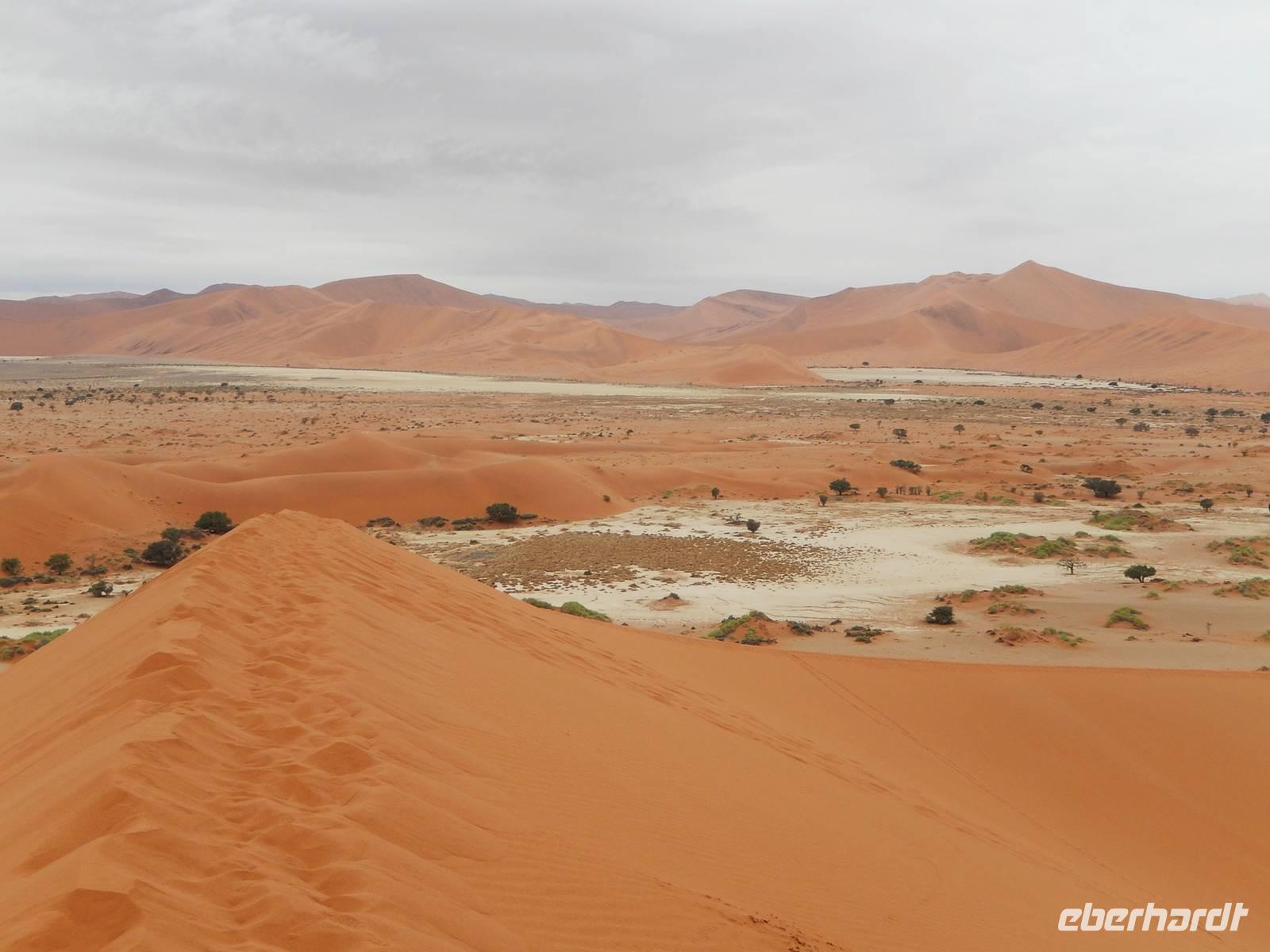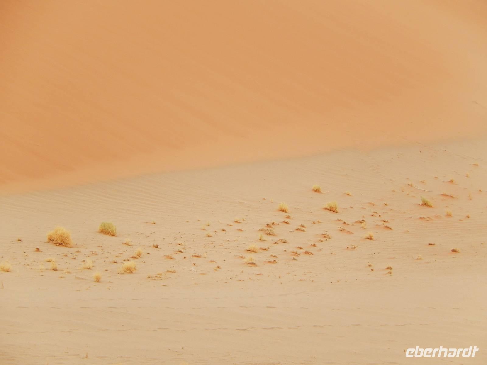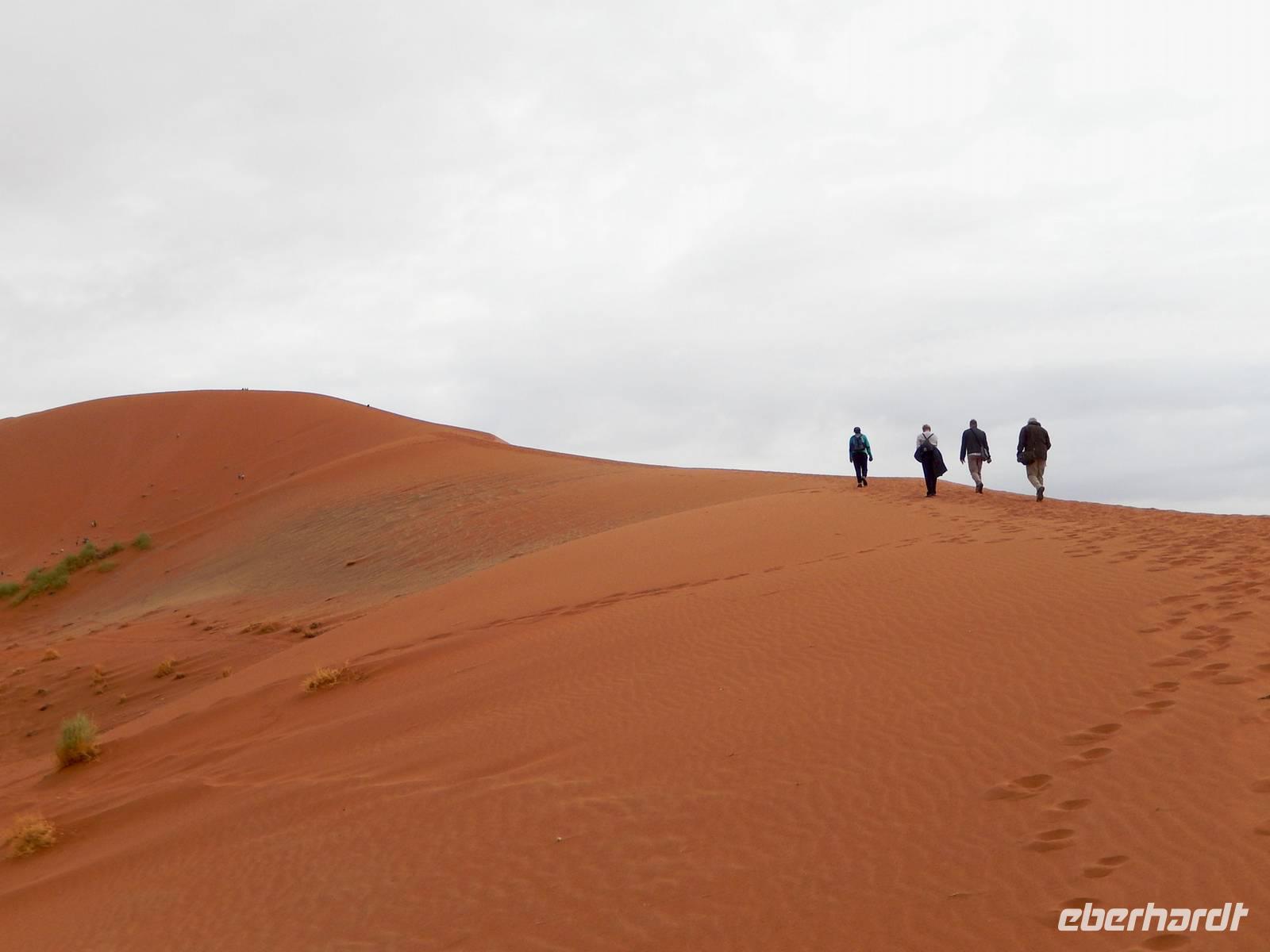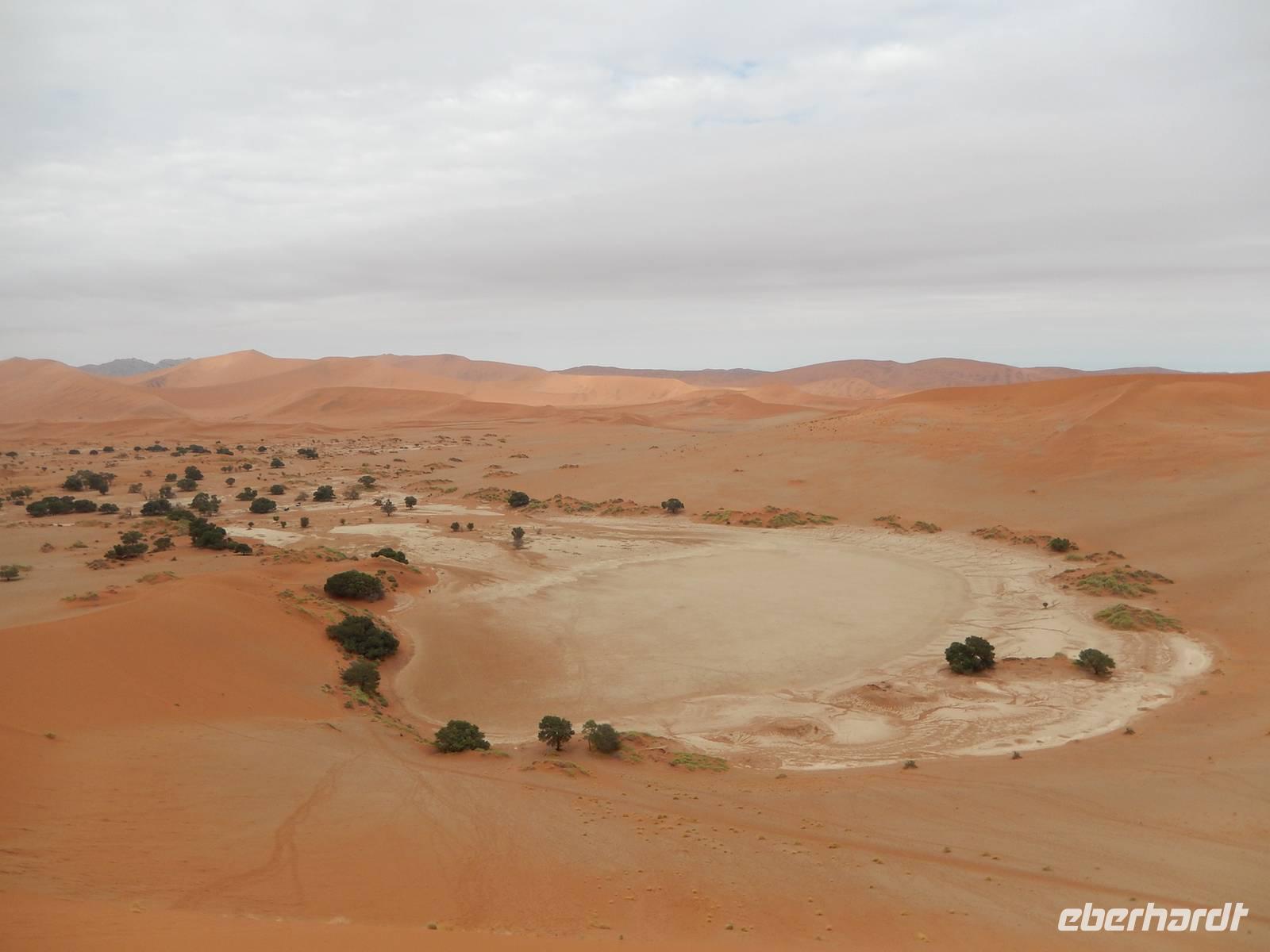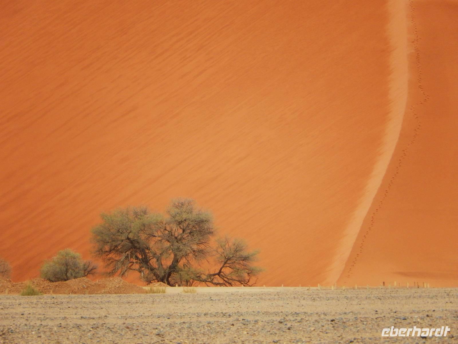 Wer hat eigentlich behauptet, dass es in der Wüste immer trocken ist? Vom Gegenteil überzeugen wir uns erneut am heutigen Tag. Bei strömendem Regen starten wir am frühen Morgen zum Sossusvlei. Die Tore des Parks öffnen mit Sonnenaufgang, also kurz vor sieben Uhr, und dann stoppt zum Glück auch der Regen und unser Abenteuer Wüste kann beginnen. Kurz hinter dem Eingang beobachten wir eine Herde Springböcke beim spielerischen Duellieren, bald darauf sehen wir zunächst einzelne Oryx und später sogar eine ganze Herde. Auch der eine oder andere Schabracken-Schakal kreuzt unseren Weg. Je weiter wir in das Sossusvlei hinein fahren, umso enger wird das Tal. Alte, knorrige Bäume vor den rot-orange leuchtenden Dünen bieten einzigartige Fotomotive. Die Berge der Wüste, die markanten Dünen, sind wohl DAS Symbol Namibias. Nach einem Stopp an der Düne 45, erreichen wir bald den Parkplatz, wo wir in den geländegängigen Jeep umsteigen. Über die Sandpiste gelangen wir zu Big Mama, wo wir uns vor dem Aufstieg erst einmal mit dem mitgebrachten Frühstück stärken. Der Aufstieg auf die Düne erfolgt nach dem Prinzip „drei Schritte vor, einer zurück", aber der Mühe Lohn ist der weite Blick über das endlos scheinende Dünenmeer - das Farbspiel ist unbeschreiblich schön. Der Abstieg erfolgt weitaus rasanter und hat etwas von Sommerski. Auf der Rückfahrt zeigt uns unser Fahrer noch einen Flecken-Uhu und bald darauf verwandelt sich die Wüste zu einer Badewanne. Das Wetter erlaubt uns gerade noch so einen Abstecher zum Sesriem Canyon und dann heißt es tatsächlich „Land unter". Bei unserer Rückkehr zur Lodge ist an eine Sundowner-Fahrt kaum zu denken, aber da sich das Wetter schlagartig ändern kann, versuchen wir es doch. Mit Geländewagen fahren wir über die (ergrünten) Dünen zu verschiedenen Aussichtspunkten und tatsächlich erleben wir bei Gin Tonic und kleinen Snacks einen herrlichen Sonnenuntergang!