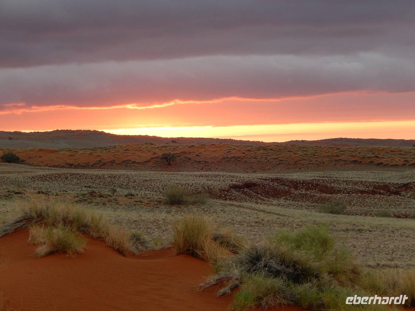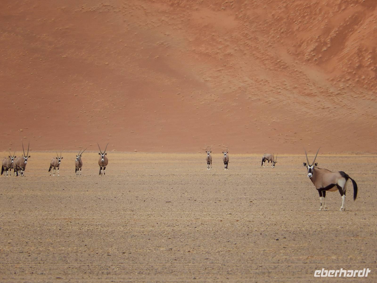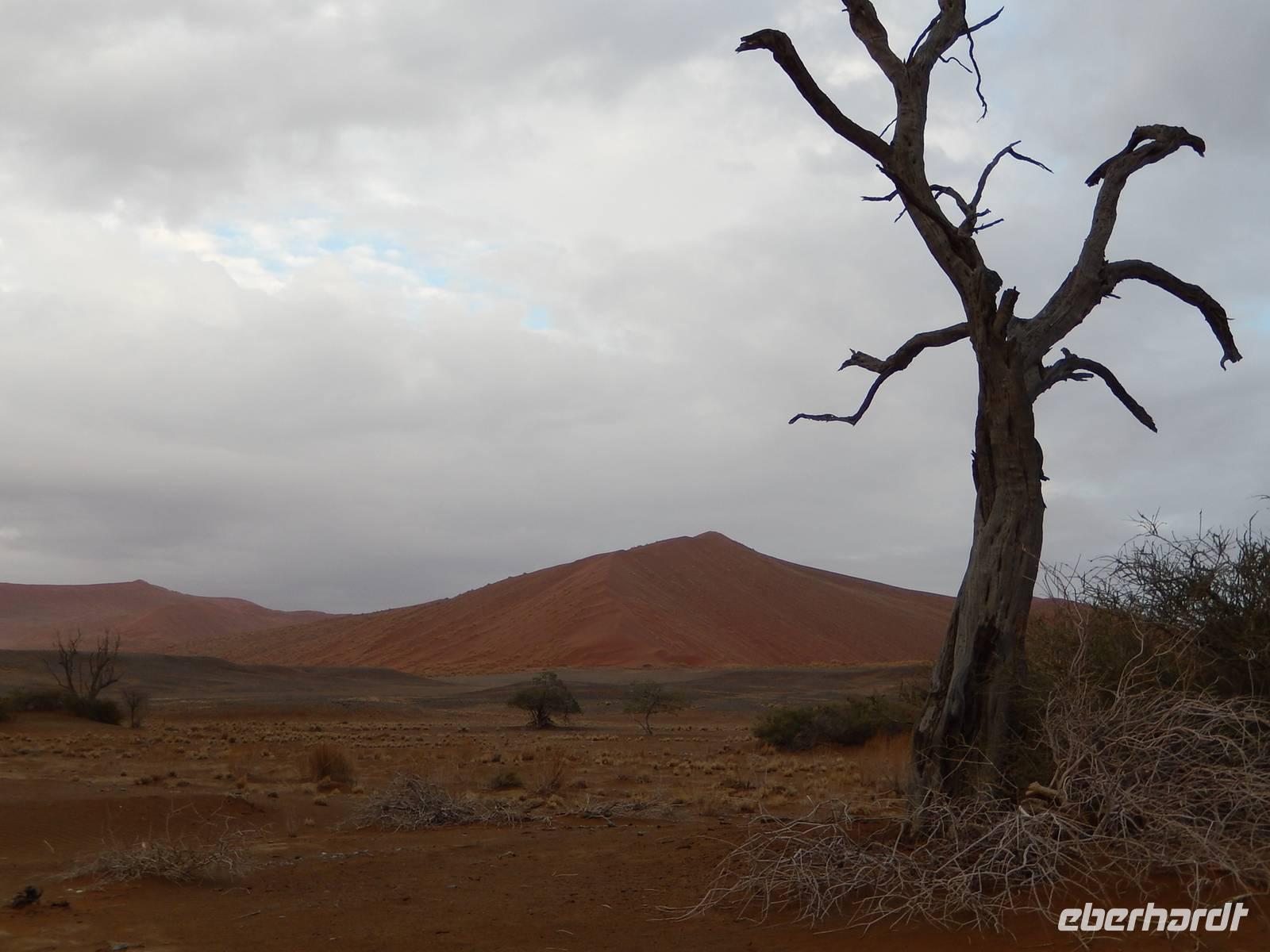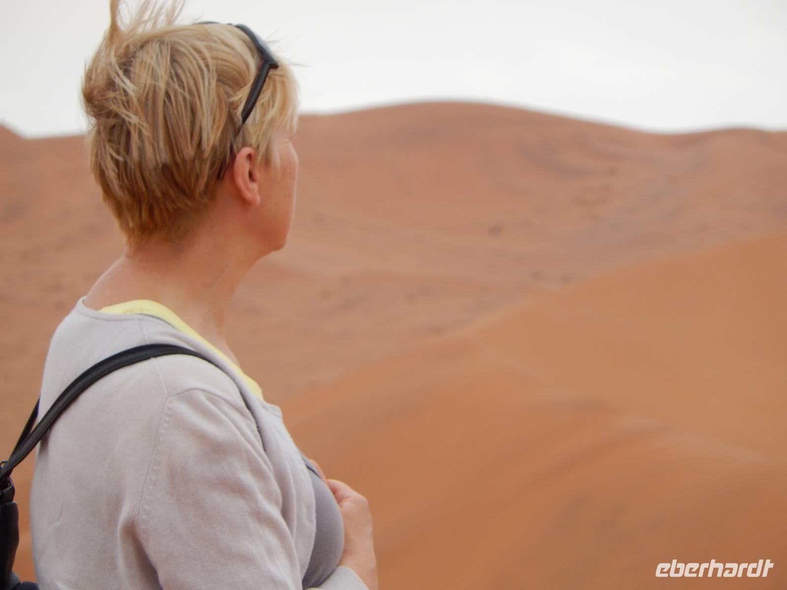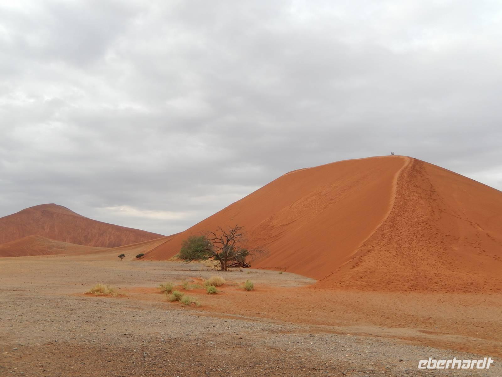 Wer hat eigentlich behauptet, dass es in der Wüste immer trocken ist? Vom Gegenteil überzeugen wir uns erneut am heutigen Tag. Bei strömendem Regen starten wir am frühen Morgen zum Sossusvlei. Die Tore des Parks öffnen mit Sonnenaufgang, also kurz vor sieben Uhr, und dann stoppt zum Glück auch der Regen und unser Abenteuer Wüste kann beginnen. Kurz hinter dem Eingang beobachten wir eine Herde Springböcke beim spielerischen Duellieren, bald darauf sehen wir zunächst einzelne Oryx und später sogar eine ganze Herde. Auch der eine oder andere Schabracken-Schakal kreuzt unseren Weg. Je weiter wir in das Sossusvlei hinein fahren, umso enger wird das Tal. Alte, knorrige Bäume vor den rot-orange leuchtenden Dünen bieten einzigartige Fotomotive. Die Berge der Wüste, die markanten Dünen, sind wohl DAS Symbol Namibias. Nach einem Stopp an der Düne 45, erreichen wir bald den Parkplatz, wo wir in den geländegängigen Jeep umsteigen. Über die Sandpiste gelangen wir zu Big Mama, wo wir uns vor dem Aufstieg erst einmal mit dem mitgebrachten Frühstück stärken. Der Aufstieg auf die Düne erfolgt nach dem Prinzip „drei Schritte vor, einer zurück", aber der Mühe Lohn ist der weite Blick über das endlos scheinende Dünenmeer - das Farbspiel ist unbeschreiblich schön. Der Abstieg erfolgt weitaus rasanter und hat etwas von Sommerski. Auf der Rückfahrt zeigt uns unser Fahrer noch einen Flecken-Uhu und bald darauf verwandelt sich die Wüste zu einer Badewanne. Das Wetter erlaubt uns gerade noch so einen Abstecher zum Sesriem Canyon und dann heißt es tatsächlich „Land unter". Bei unserer Rückkehr zur Lodge ist an eine Sundowner-Fahrt kaum zu denken, aber da sich das Wetter schlagartig ändern kann, versuchen wir es doch. Mit Geländewagen fahren wir über die (ergrünten) Dünen zu verschiedenen Aussichtspunkten und tatsächlich erleben wir bei Gin Tonic und kleinen Snacks einen herrlichen Sonnenuntergang!