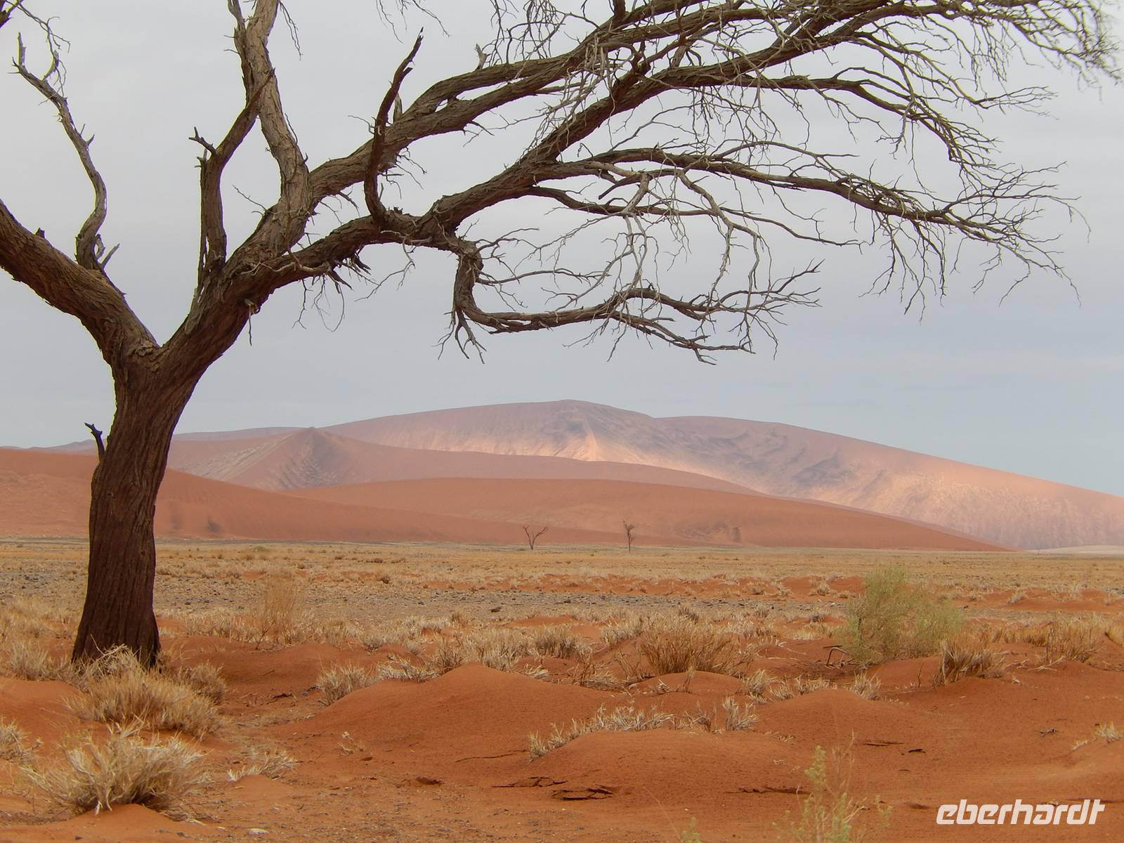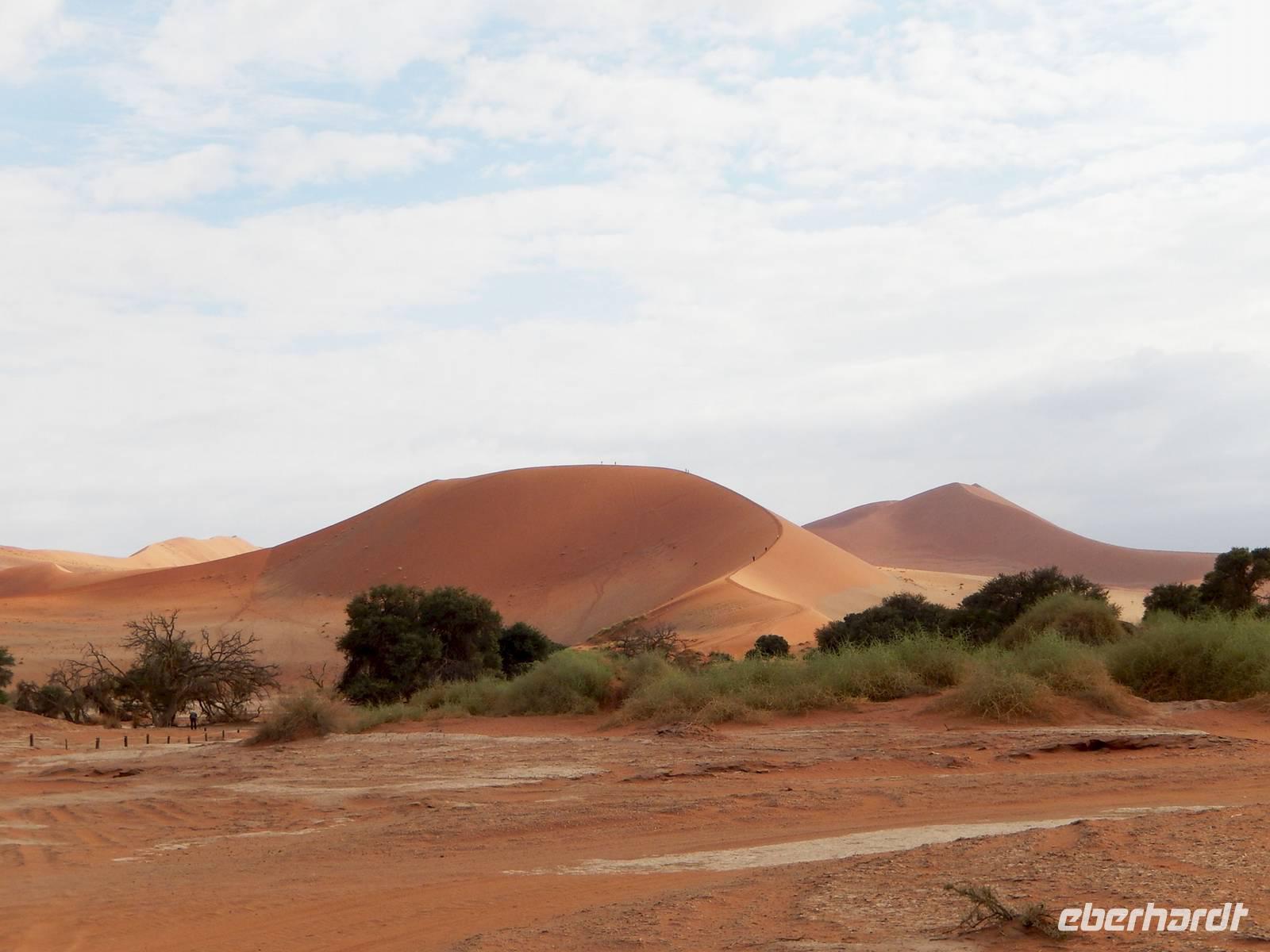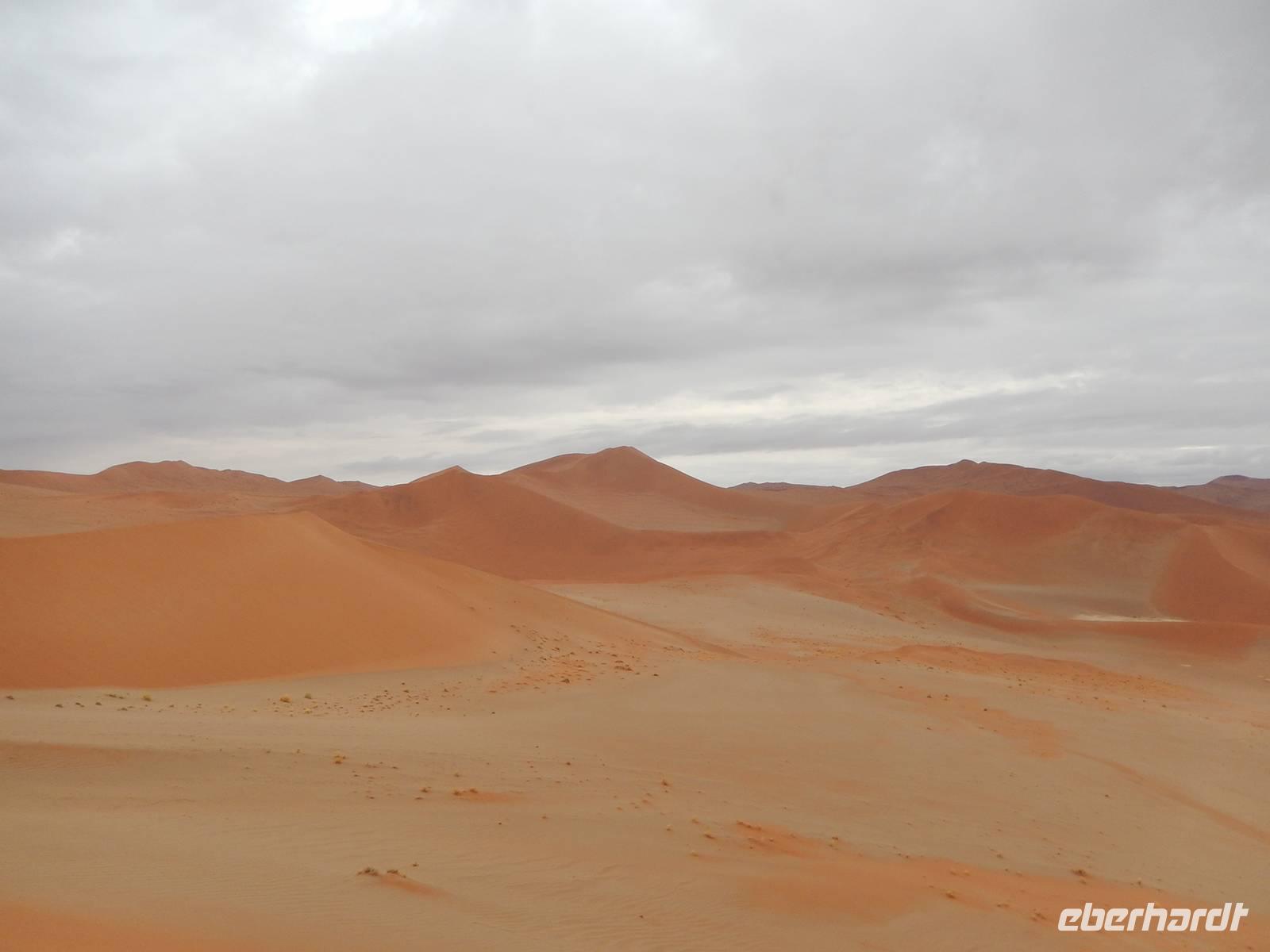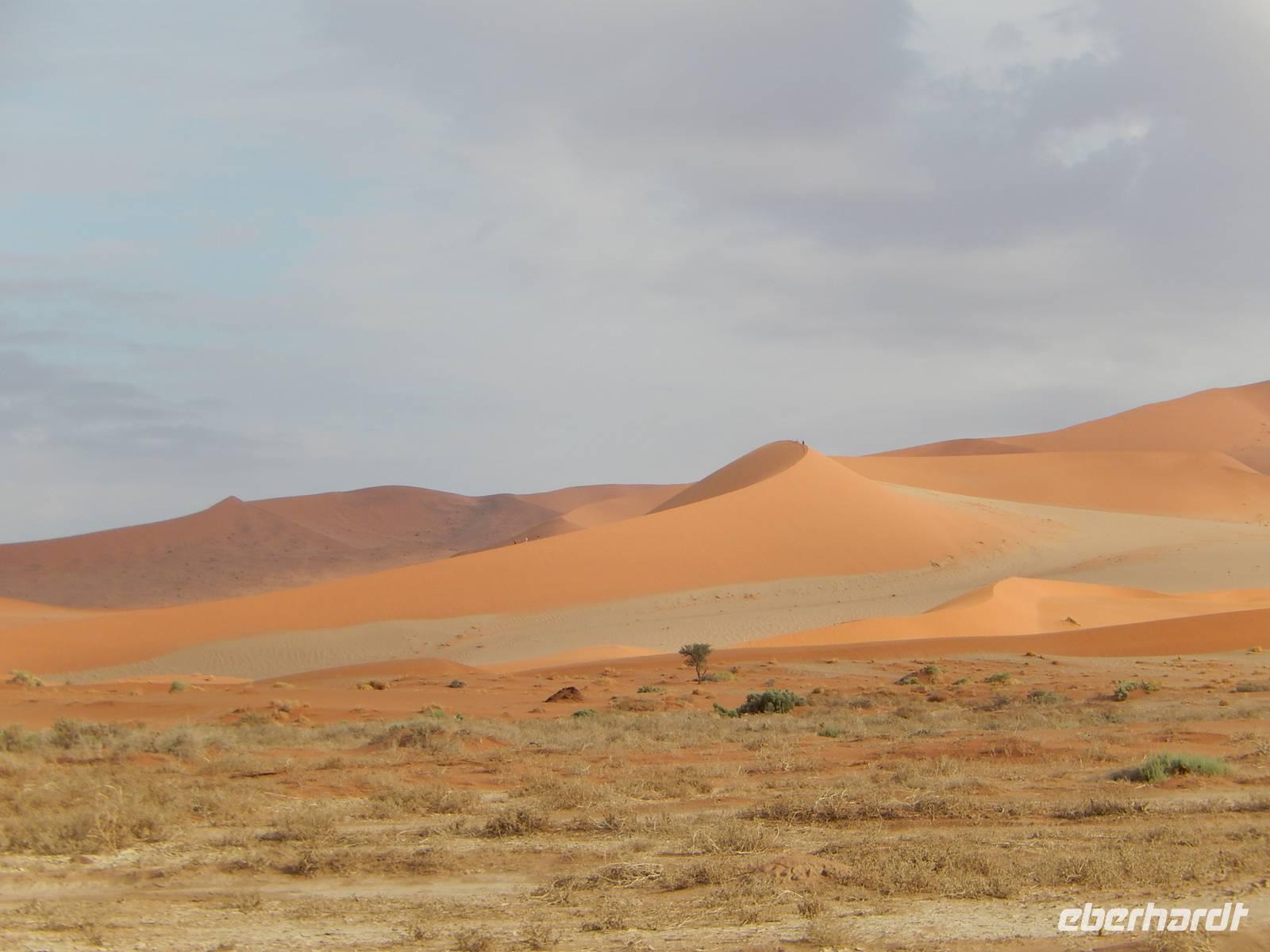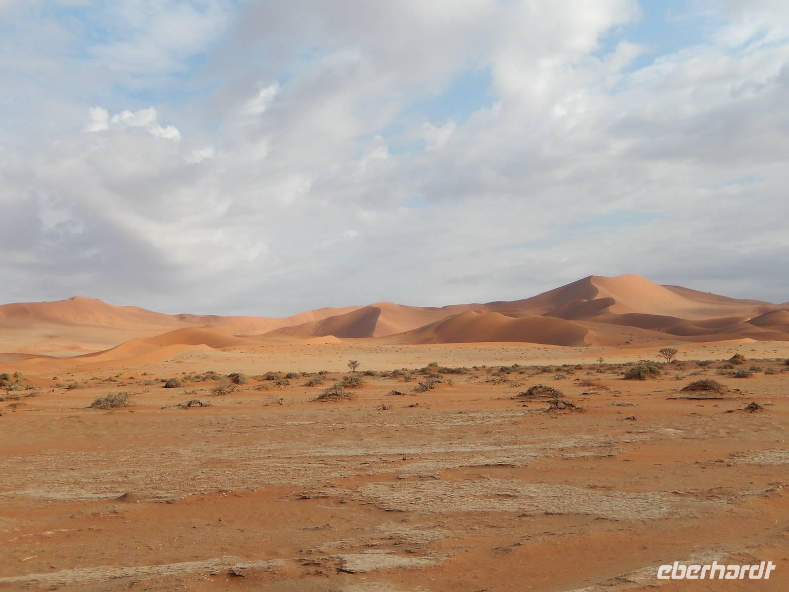 Wer hat eigentlich behauptet, dass es in der Wüste immer trocken ist? Vom Gegenteil überzeugen wir uns erneut am heutigen Tag. Bei strömendem Regen starten wir am frühen Morgen zum Sossusvlei. Die Tore des Parks öffnen mit Sonnenaufgang, also kurz vor sieben Uhr, und dann stoppt zum Glück auch der Regen und unser Abenteuer Wüste kann beginnen. Kurz hinter dem Eingang beobachten wir eine Herde Springböcke beim spielerischen Duellieren, bald darauf sehen wir zunächst einzelne Oryx und später sogar eine ganze Herde. Auch der eine oder andere Schabracken-Schakal kreuzt unseren Weg. Je weiter wir in das Sossusvlei hinein fahren, umso enger wird das Tal. Alte, knorrige Bäume vor den rot-orange leuchtenden Dünen bieten einzigartige Fotomotive. Die Berge der Wüste, die markanten Dünen, sind wohl DAS Symbol Namibias. Nach einem Stopp an der Düne 45, erreichen wir bald den Parkplatz, wo wir in den geländegängigen Jeep umsteigen. Über die Sandpiste gelangen wir zu Big Mama, wo wir uns vor dem Aufstieg erst einmal mit dem mitgebrachten Frühstück stärken. Der Aufstieg auf die Düne erfolgt nach dem Prinzip „drei Schritte vor, einer zurück", aber der Mühe Lohn ist der weite Blick über das endlos scheinende Dünenmeer - das Farbspiel ist unbeschreiblich schön. Der Abstieg erfolgt weitaus rasanter und hat etwas von Sommerski. Auf der Rückfahrt zeigt uns unser Fahrer noch einen Flecken-Uhu und bald darauf verwandelt sich die Wüste zu einer Badewanne. Das Wetter erlaubt uns gerade noch so einen Abstecher zum Sesriem Canyon und dann heißt es tatsächlich „Land unter". Bei unserer Rückkehr zur Lodge ist an eine Sundowner-Fahrt kaum zu denken, aber da sich das Wetter schlagartig ändern kann, versuchen wir es doch. Mit Geländewagen fahren wir über die (ergrünten) Dünen zu verschiedenen Aussichtspunkten und tatsächlich erleben wir bei Gin Tonic und kleinen Snacks einen herrlichen Sonnenuntergang!