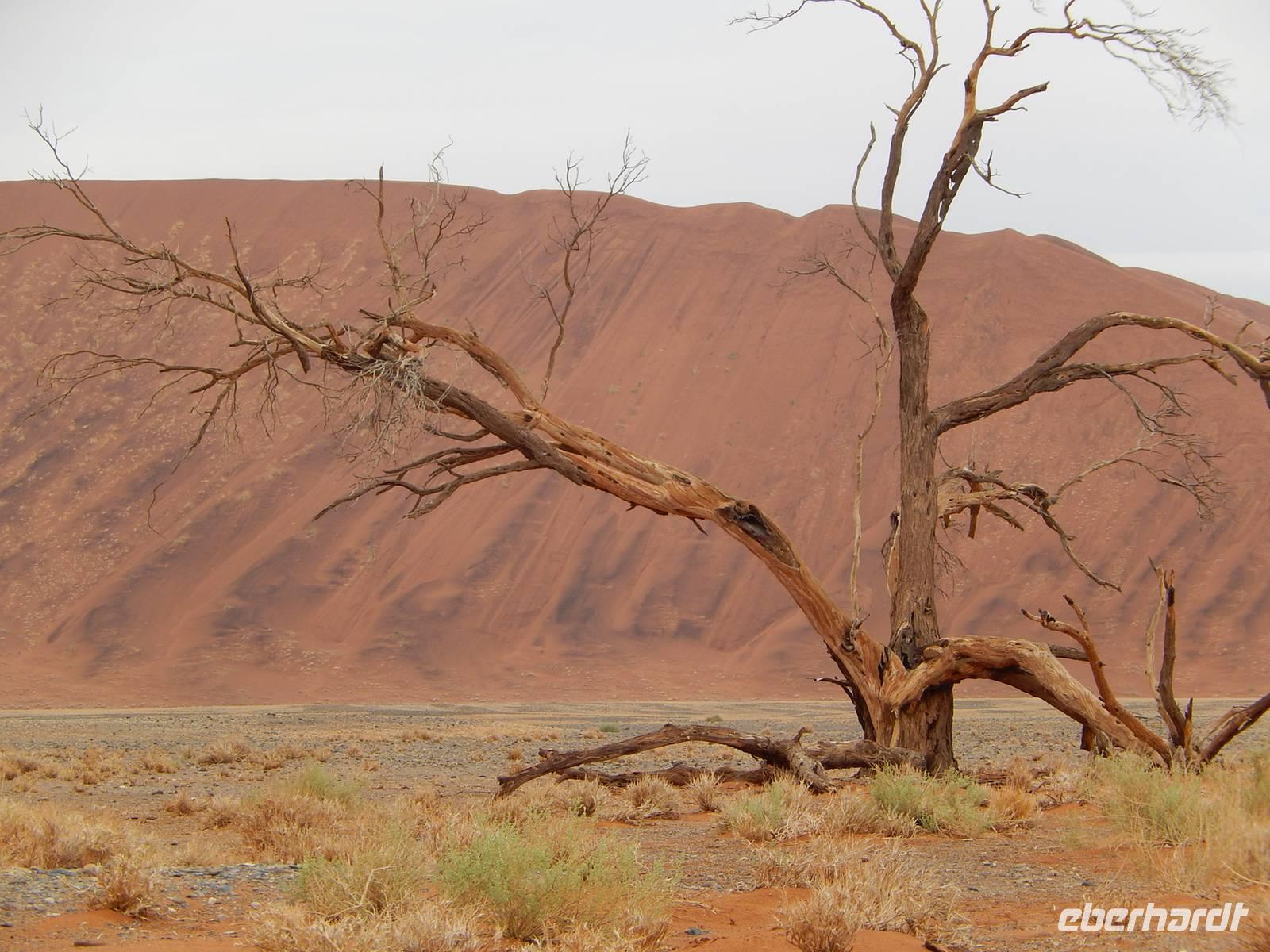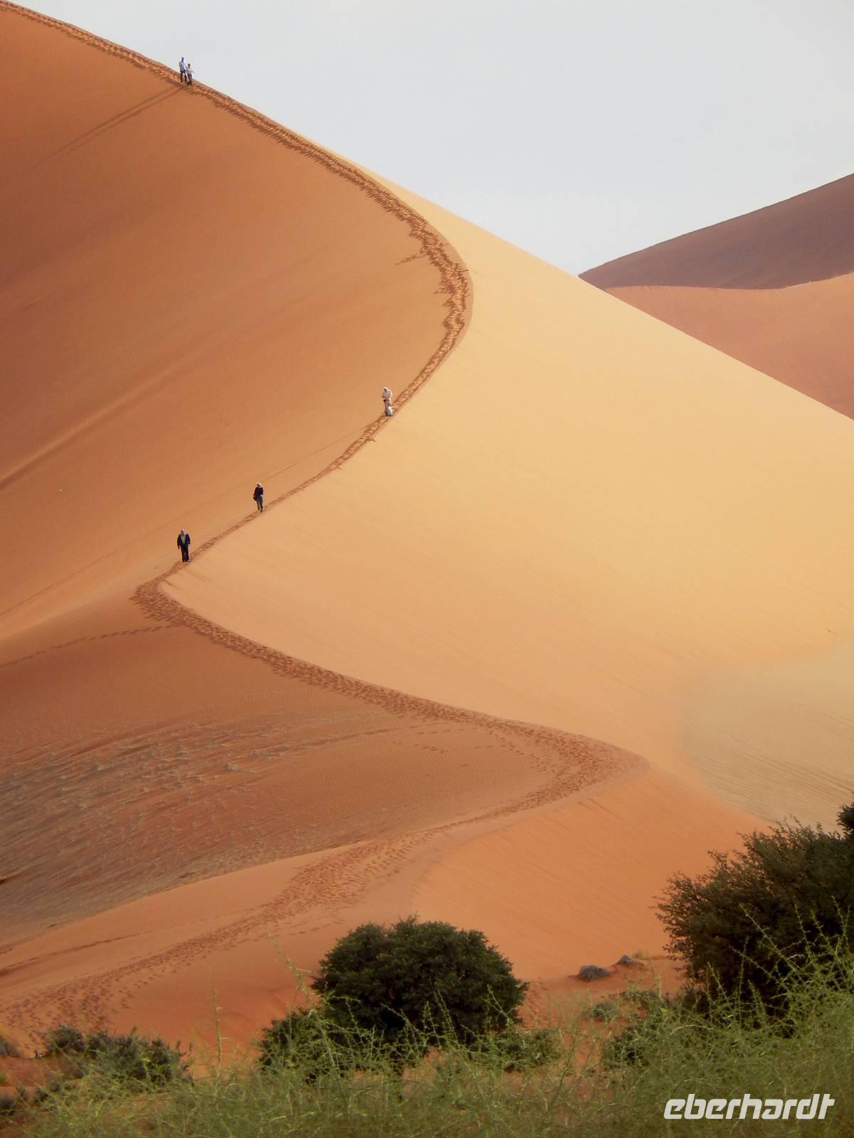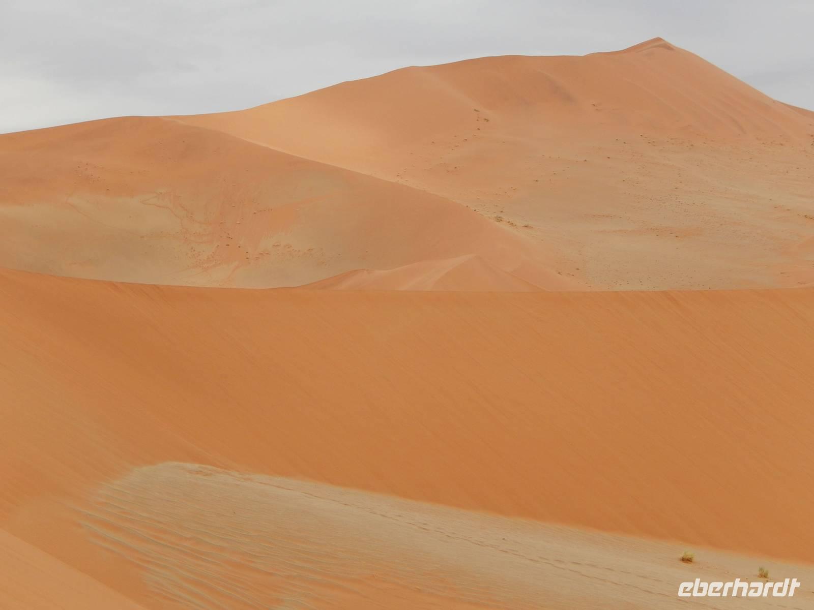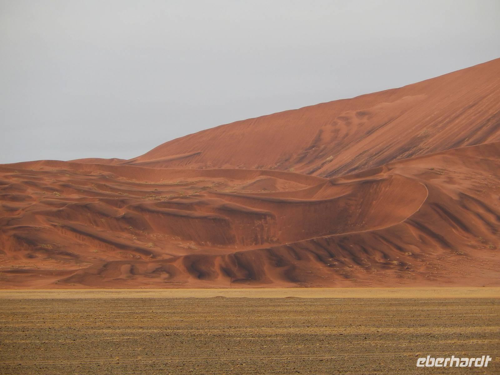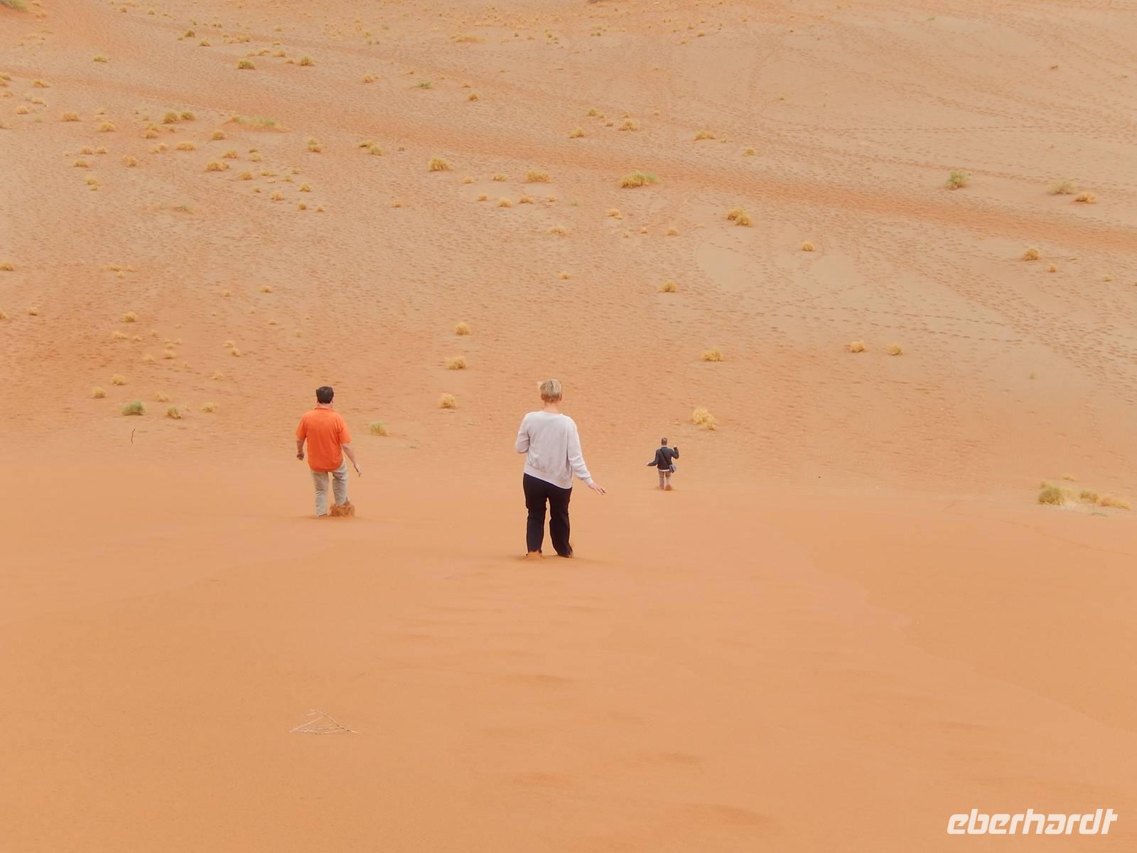Wer hat eigentlich behauptet, dass es in der Wüste immer trocken ist? Vom Gegenteil überzeugen wir uns erneut am heutigen Tag. Bei strömendem Regen starten wir am frühen Morgen zum Sossusvlei. Die Tore des Parks öffnen mit Sonnenaufgang, also kurz vor sieben Uhr, und dann stoppt zum Glück auch der Regen und unser Abenteuer Wüste kann beginnen. Kurz hinter dem Eingang beobachten wir eine Herde Springböcke beim spielerischen Duellieren, bald darauf sehen wir zunächst einzelne Oryx und später sogar eine ganze Herde. Auch der eine oder andere Schabracken-Schakal kreuzt unseren Weg. Je weiter wir in das Sossusvlei hinein fahren, umso enger wird das Tal. Alte, knorrige Bäume vor den rot-orange leuchtenden Dünen bieten einzigartige Fotomotive. Die Berge der Wüste, die markanten Dünen, sind wohl DAS Symbol Namibias. Nach einem Stopp an der Düne 45, erreichen wir bald den Parkplatz, wo wir in den geländegängigen Jeep umsteigen. Über die Sandpiste gelangen wir zu Big Mama, wo wir uns vor dem Aufstieg erst einmal mit dem mitgebrachten Frühstück stärken. Der Aufstieg auf die Düne erfolgt nach dem Prinzip „drei Schritte vor, einer zurück", aber der Mühe Lohn ist der weite Blick über das endlos scheinende Dünenmeer - das Farbspiel ist unbeschreiblich schön. Der Abstieg erfolgt weitaus rasanter und hat etwas von Sommerski. Auf der Rückfahrt zeigt uns unser Fahrer noch einen Flecken-Uhu und bald darauf verwandelt sich die Wüste zu einer Badewanne. Das Wetter erlaubt uns gerade noch so einen Abstecher zum Sesriem Canyon und dann heißt es tatsächlich „Land unter". Bei unserer Rückkehr zur Lodge ist an eine Sundowner-Fahrt kaum zu denken, aber da sich das Wetter schlagartig ändern kann, versuchen wir es doch. Mit Geländewagen fahren wir über die (ergrünten) Dünen zu verschiedenen Aussichtspunkten und tatsächlich erleben wir bei Gin Tonic und kleinen Snacks einen herrlichen Sonnenuntergang!