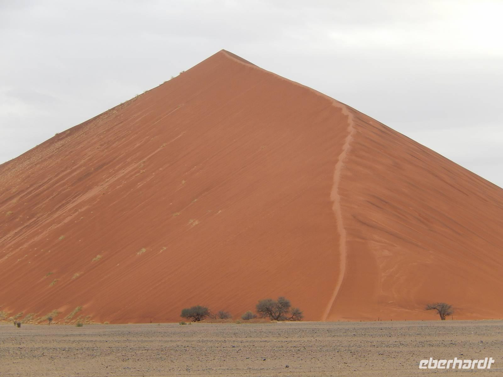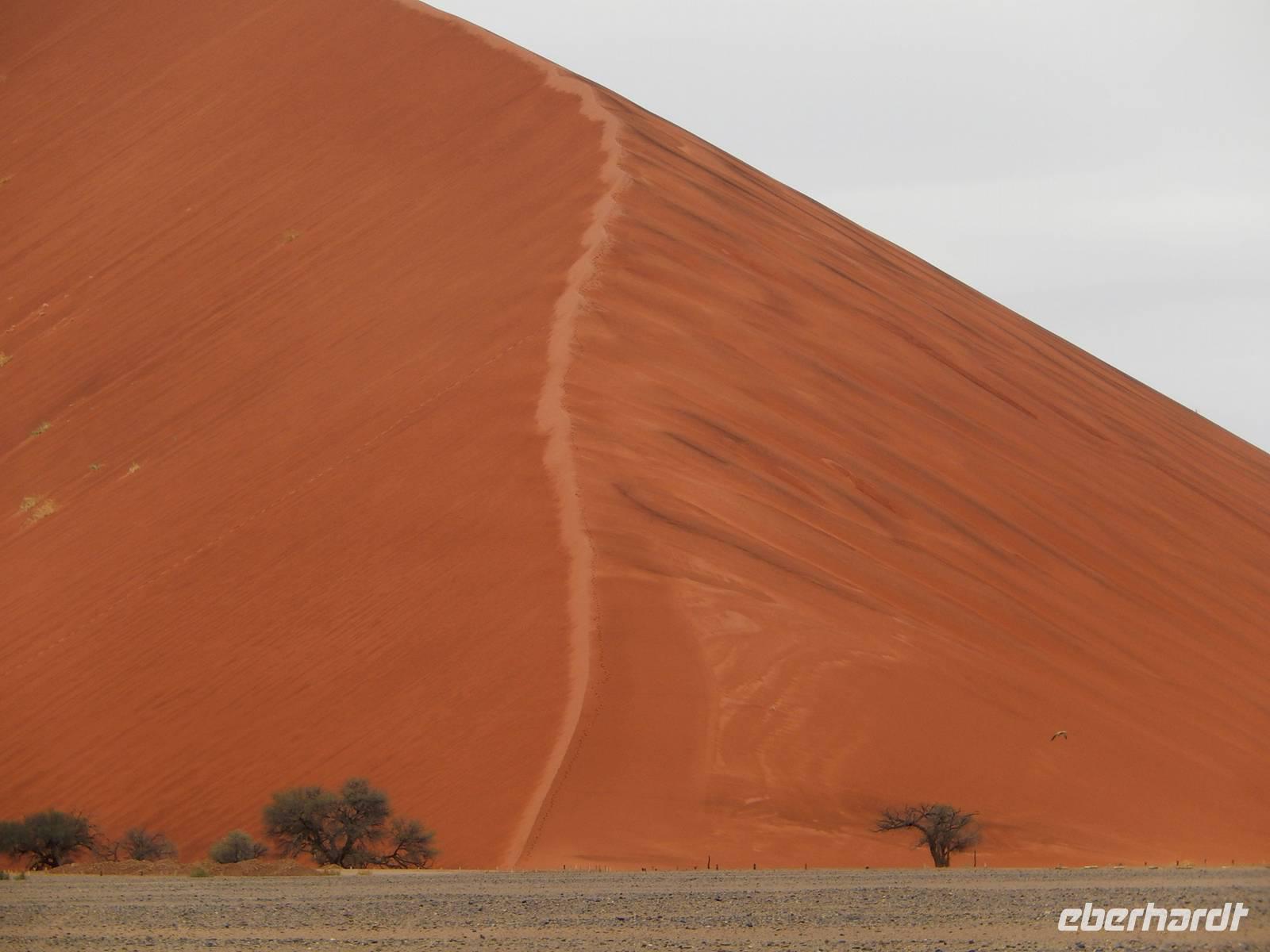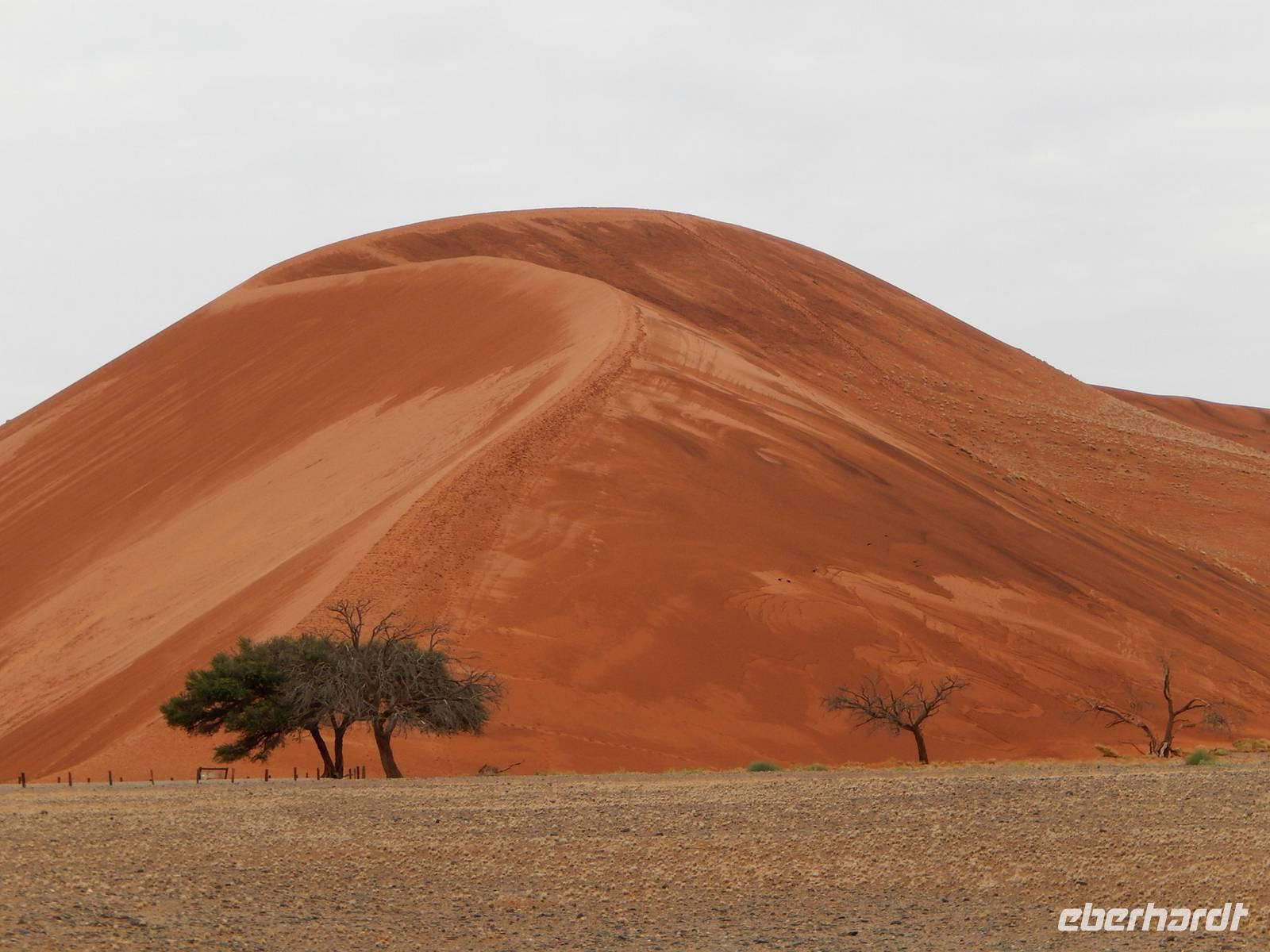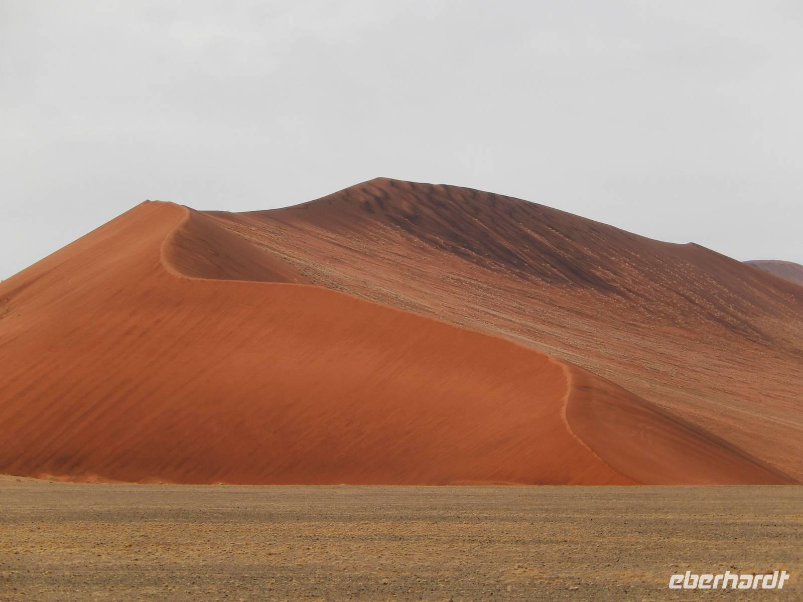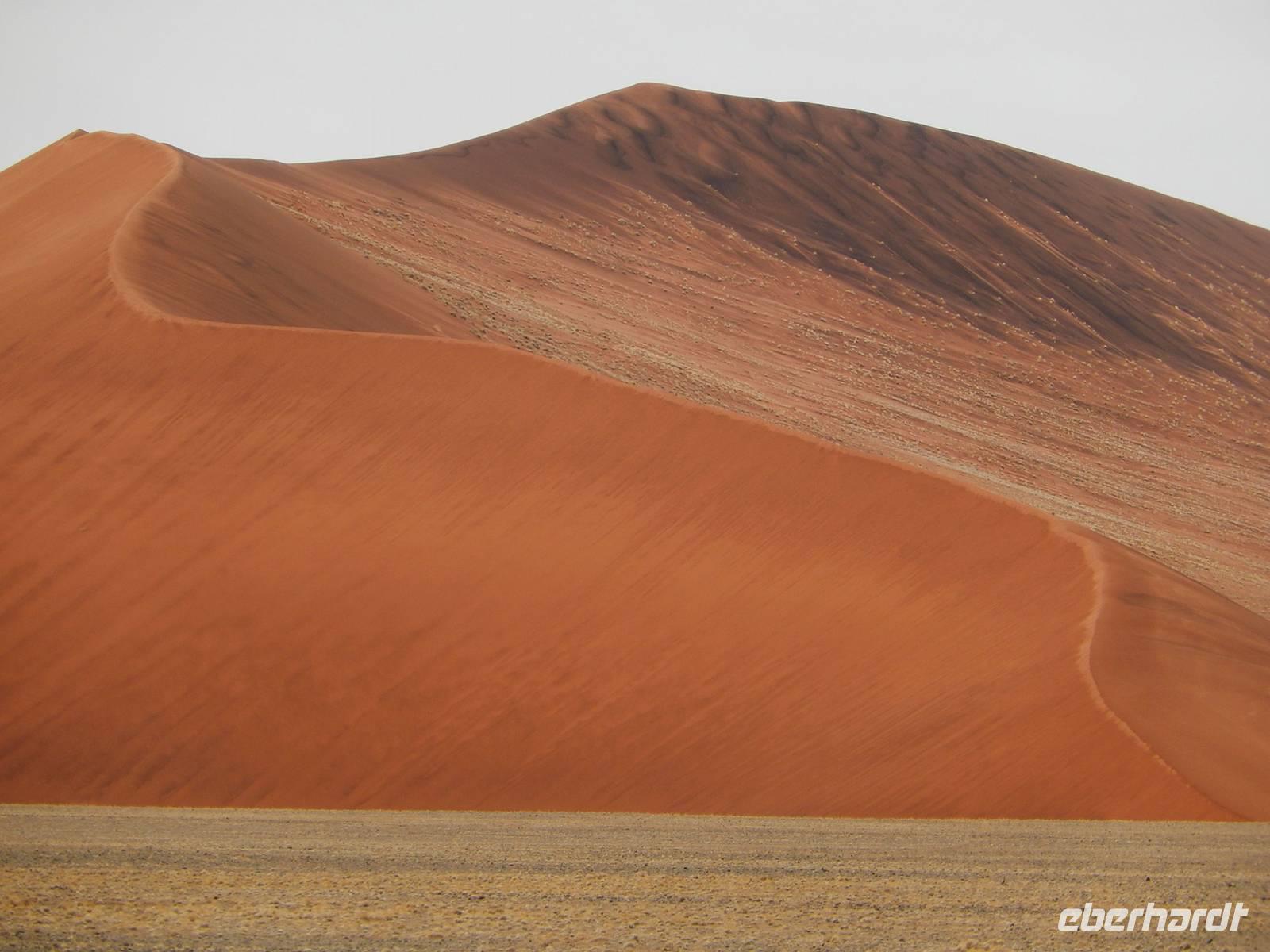 Wer hat eigentlich behauptet, dass es in der Wüste immer trocken ist? Vom Gegenteil überzeugen wir uns erneut am heutigen Tag. Bei strömendem Regen starten wir am frühen Morgen zum Sossusvlei. Die Tore des Parks öffnen mit Sonnenaufgang, also kurz vor sieben Uhr, und dann stoppt zum Glück auch der Regen und unser Abenteuer Wüste kann beginnen. Kurz hinter dem Eingang beobachten wir eine Herde Springböcke beim spielerischen Duellieren, bald darauf sehen wir zunächst einzelne Oryx und später sogar eine ganze Herde. Auch der eine oder andere Schabracken-Schakal kreuzt unseren Weg. Je weiter wir in das Sossusvlei hinein fahren, umso enger wird das Tal. Alte, knorrige Bäume vor den rot-orange leuchtenden Dünen bieten einzigartige Fotomotive. Die Berge der Wüste, die markanten Dünen, sind wohl DAS Symbol Namibias. Nach einem Stopp an der Düne 45, erreichen wir bald den Parkplatz, wo wir in den geländegängigen Jeep umsteigen. Über die Sandpiste gelangen wir zu Big Mama, wo wir uns vor dem Aufstieg erst einmal mit dem mitgebrachten Frühstück stärken. Der Aufstieg auf die Düne erfolgt nach dem Prinzip „drei Schritte vor, einer zurück", aber der Mühe Lohn ist der weite Blick über das endlos scheinende Dünenmeer - das Farbspiel ist unbeschreiblich schön. Der Abstieg erfolgt weitaus rasanter und hat etwas von Sommerski. Auf der Rückfahrt zeigt uns unser Fahrer noch einen Flecken-Uhu und bald darauf verwandelt sich die Wüste zu einer Badewanne. Das Wetter erlaubt uns gerade noch so einen Abstecher zum Sesriem Canyon und dann heißt es tatsächlich „Land unter". Bei unserer Rückkehr zur Lodge ist an eine Sundowner-Fahrt kaum zu denken, aber da sich das Wetter schlagartig ändern kann, versuchen wir es doch. Mit Geländewagen fahren wir über die (ergrünten) Dünen zu verschiedenen Aussichtspunkten und tatsächlich erleben wir bei Gin Tonic und kleinen Snacks einen herrlichen Sonnenuntergang!