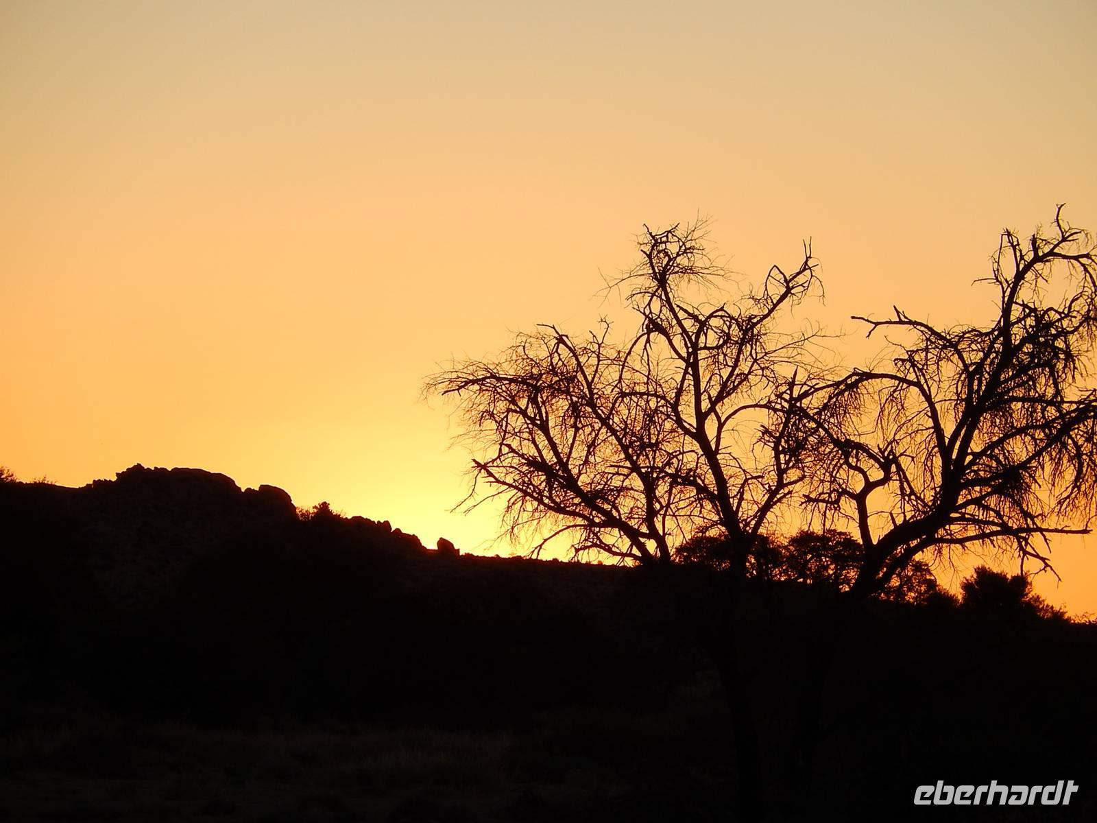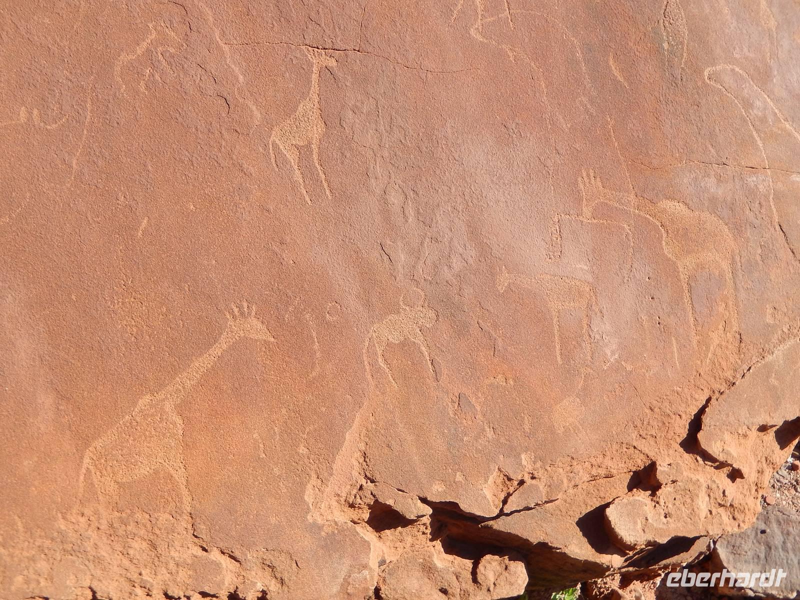 Wir verlassen Swakopmund in nördlicher Richtung. Zunächst führt die Strecke entlang der Skelettküste. Am endlos scheinenden Sandstrand liegt ein Fischtrawler in der Brandung. Landeinwärts durchfahren wir die weite hellsandige Wüste. Langsam, aber sicher steigt das Gelände an und die trockene Landschaft wandelt sich in lindgrünes Grasland. In der Ferne sehen wir den höchsten Berg Namibias, den Brandberg, an dessen Flanke wir unsere Reise fortsetzen. Wir befinden uns im Damaraland. Am Straßenrand bieten Händler Souvenirs an - wir halten an einem Stand von Himba und Herero. Es darf gehandelt werden und so erstehen wir das eine oder andere Schmuckstück für Daheim. Die Herero-Frauen tragen traditionell üppige Kleider und den dazugehörigen Kopfschmuck mit den stilisierten Hörnern - auch im Alltag, nicht nur für schöne Fotos der Touristen. Apropos Foto - hin und wieder kommen uns Einheimische mit Eselkarren entgegen, die uns natürlich auch ein schönes Motiv bieten. Unser Mittagessen genießen wir heute als rustikales Picknick mit vielen kleinen Leckereien. Das Thermometer steigt weiter auf über 30°C - den Besuch bei den Felszeichnungen von Twyfelfontein wollen wir uns dennoch nicht entgehen lassen. In dem orange-rotem Gestein bestaunen wir 2.000-6.000 Jahre alte, gut erhaltene Ritzungen mit Tiermotiven. Erst nach Sonnenuntergang, der durch die bedrohlichen Gewitterwolken am Himmel besonders eindrucksvoll ist, erreichen wir die Damara Mopane Lodge. Die zahlreichen Mopane-Bäume geben der Lodge ihren Namen und wir wohnen in hübschen kleinen Häuschen mit eigenem Garten, aus dem das Gemüse frisch auf den Abendbrottisch kommt.