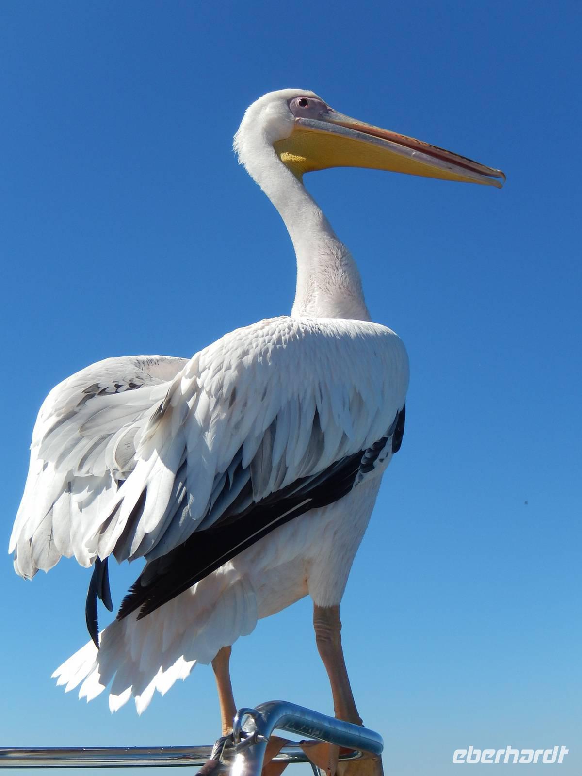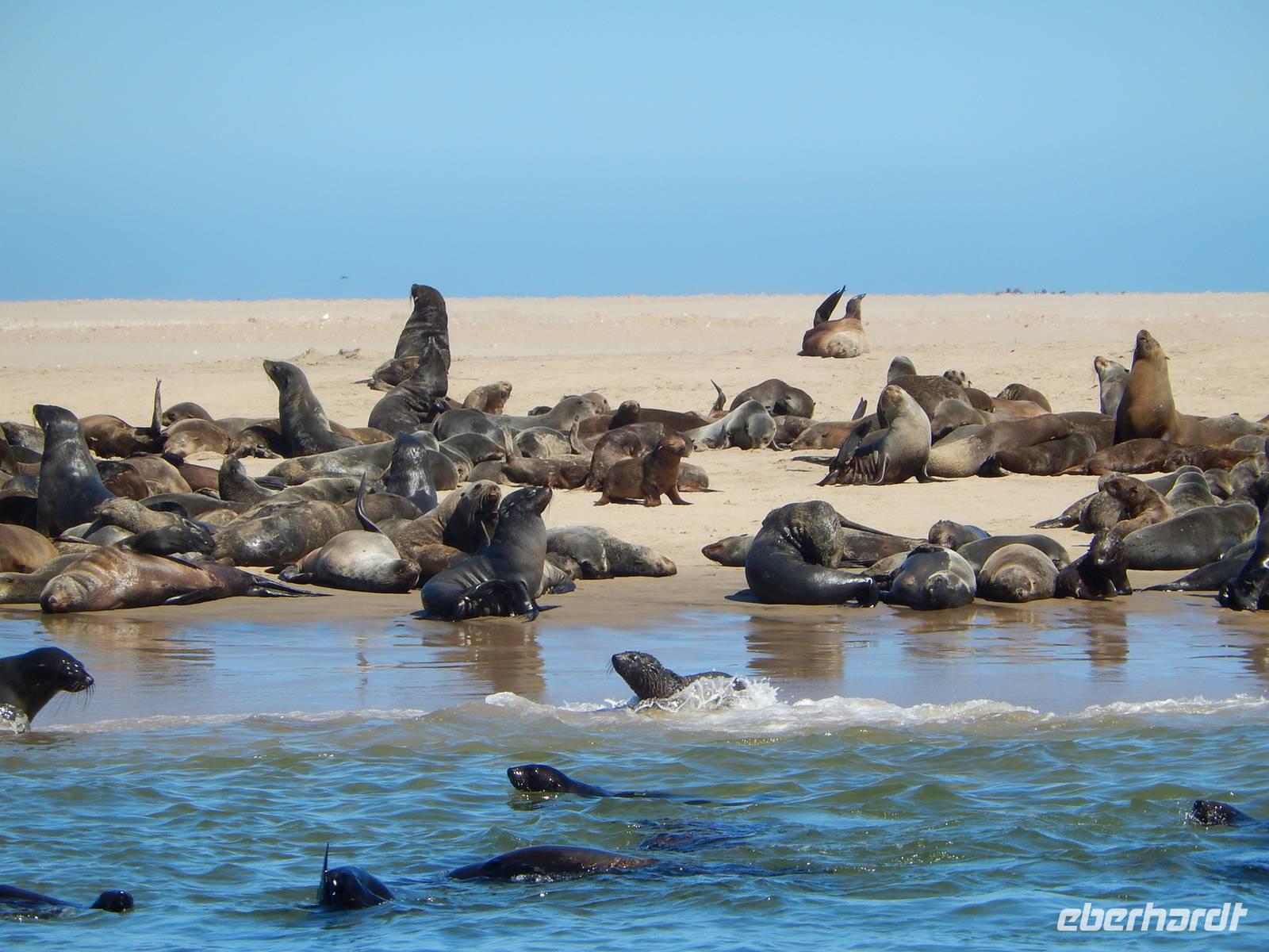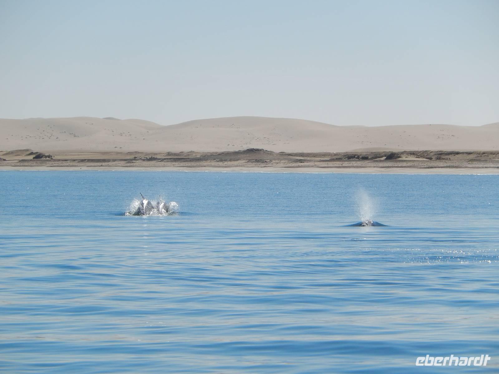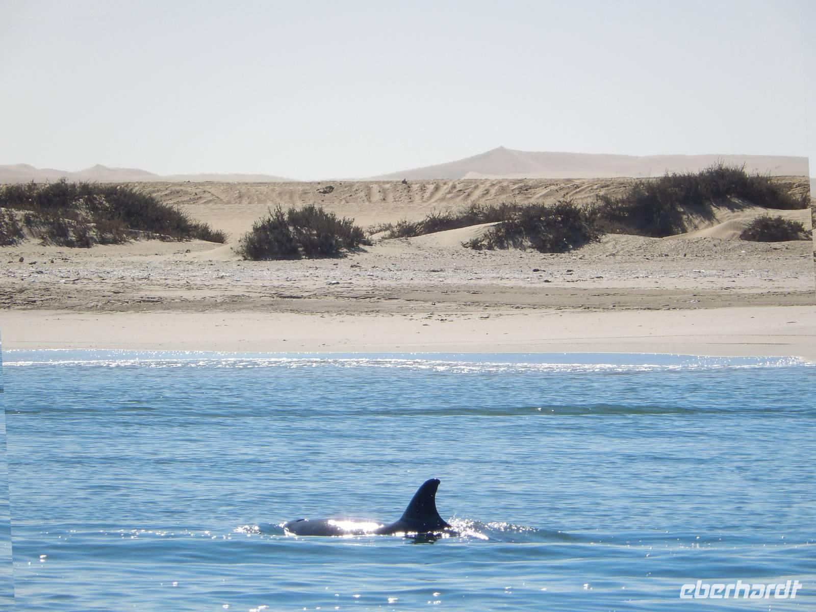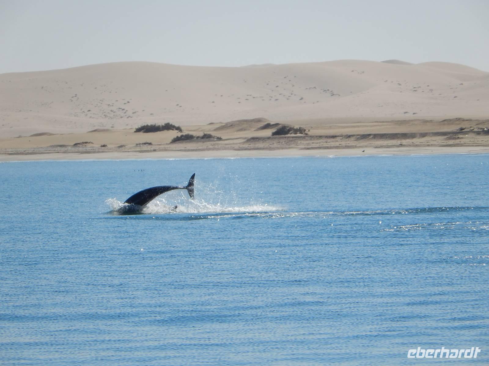 Am Morgen brechen wir auf nach Walvis Bay, wo wir den Katamaran „Silverwind" entern. Die Crew, samt Robbe Google, begrüßt uns herzlich an Bord. Dank „fliegenden Fischen" begleiten uns nicht nur Möwen, sondern auch Pelikane. Mit viel Witz, Charme und Humor erklärt uns Marco die Meeresfauna in der Bucht. Wir werden mit Sherry verwöhnt während Tausende Kormorane im Tiefflug unseren Weg kreuzen. Kormoran Fritz kommt zu uns an Bord und bekommt auch seine Ration Fisch serviert. Ein besonderes Highlight sind die berühmten „Da-da-Delfine", die sich plötzlich rund um den Katamaran tümmeln... da, da und da sind sie zu sehen ! Auf dem Weg zur Robbenkolonie passieren wir die „Rowan Renaissance", ein gigantisches Schiff, das mobil nach Erdöl bohrt. Danach leistet uns Pelikan Max Gesellschaft und wir lassen die Korken knallen und schlemmen zum Mittag vom köstlichen Austern- und Meeresfrüchte-Buffet. Es war im wahrsten Sinne des Wortes ein „tierisch guter" Ausflug. Danke an die Crew! Ein Teil der Gruppe macht sich am Nachmittag auf, um die Weite Namibias aus der Vogelperspektive zu bestaunen. Während des knapp zweieinhalb stündigen Fluges wird einem das gigantische Ausmaß der Wüste bewusst. Im Fischrestaurant Tug genießen wir schließlich unser Abendessen.