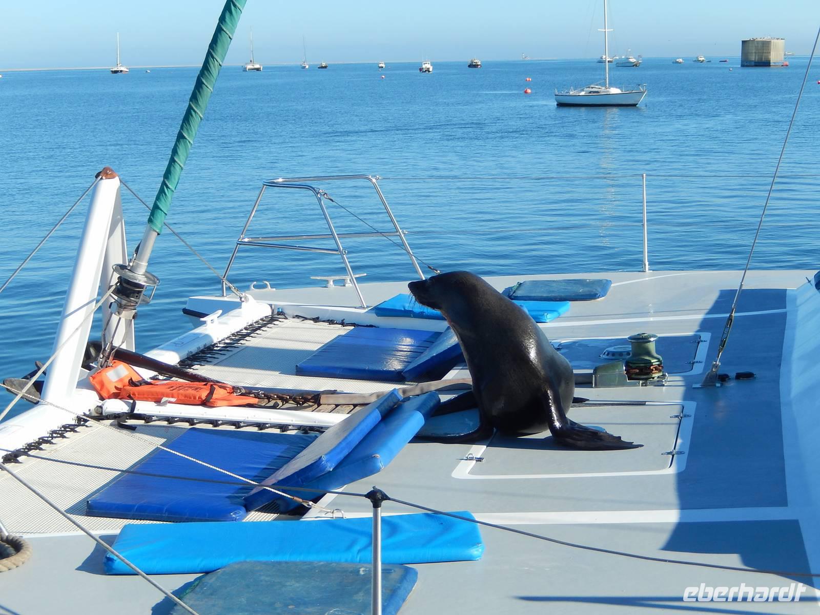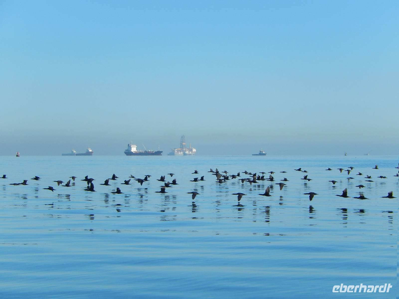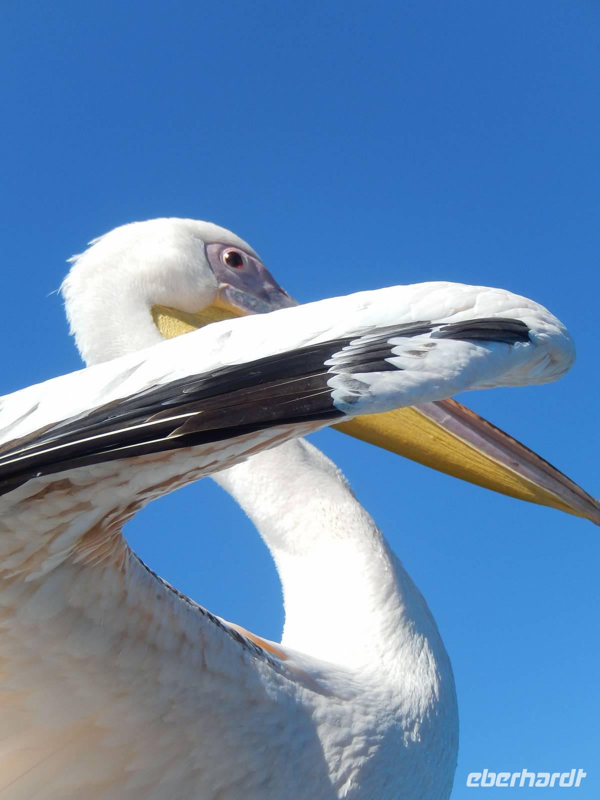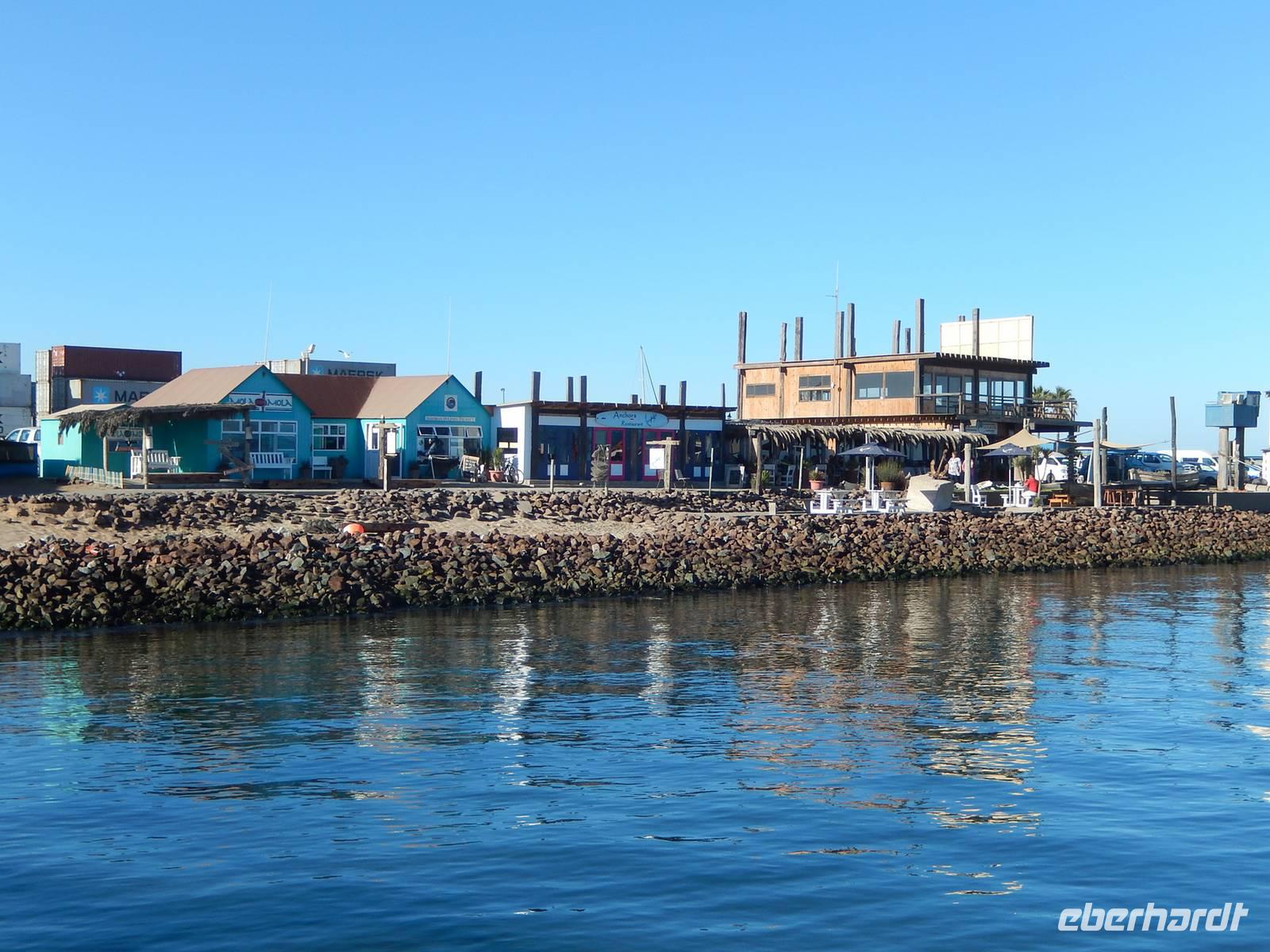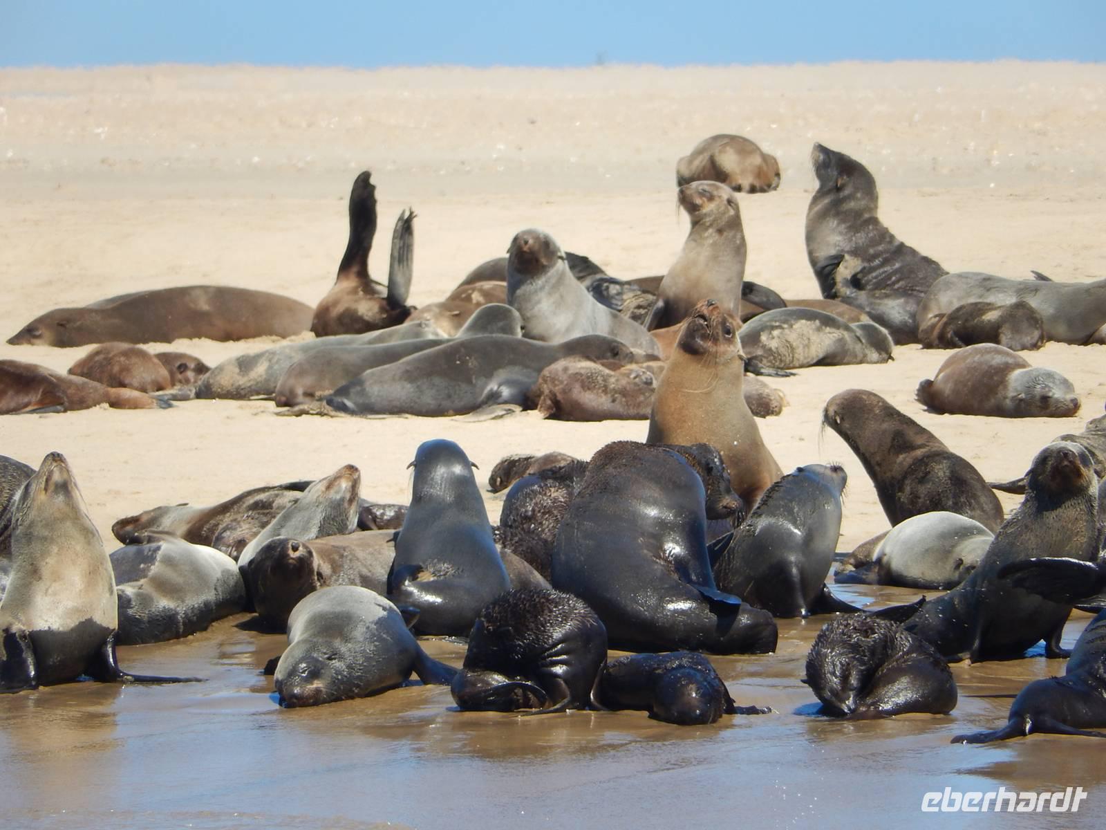 Am Morgen brechen wir auf nach Walvis Bay, wo wir den Katamaran „Silverwind" entern. Die Crew, samt Robbe Google, begrüßt uns herzlich an Bord. Dank „fliegenden Fischen" begleiten uns nicht nur Möwen, sondern auch Pelikane. Mit viel Witz, Charme und Humor erklärt uns Marco die Meeresfauna in der Bucht. Wir werden mit Sherry verwöhnt während Tausende Kormorane im Tiefflug unseren Weg kreuzen. Kormoran Fritz kommt zu uns an Bord und bekommt auch seine Ration Fisch serviert. Ein besonderes Highlight sind die berühmten „Da-da-Delfine", die sich plötzlich rund um den Katamaran tümmeln... da, da und da sind sie zu sehen ! Auf dem Weg zur Robbenkolonie passieren wir die „Rowan Renaissance", ein gigantisches Schiff, das mobil nach Erdöl bohrt. Danach leistet uns Pelikan Max Gesellschaft und wir lassen die Korken knallen und schlemmen zum Mittag vom köstlichen Austern- und Meeresfrüchte-Buffet. Es war im wahrsten Sinne des Wortes ein „tierisch guter" Ausflug. Danke an die Crew! Ein Teil der Gruppe macht sich am Nachmittag auf, um die Weite Namibias aus der Vogelperspektive zu bestaunen. Während des knapp zweieinhalb stündigen Fluges wird einem das gigantische Ausmaß der Wüste bewusst. Im Fischrestaurant Tug genießen wir schließlich unser Abendessen.