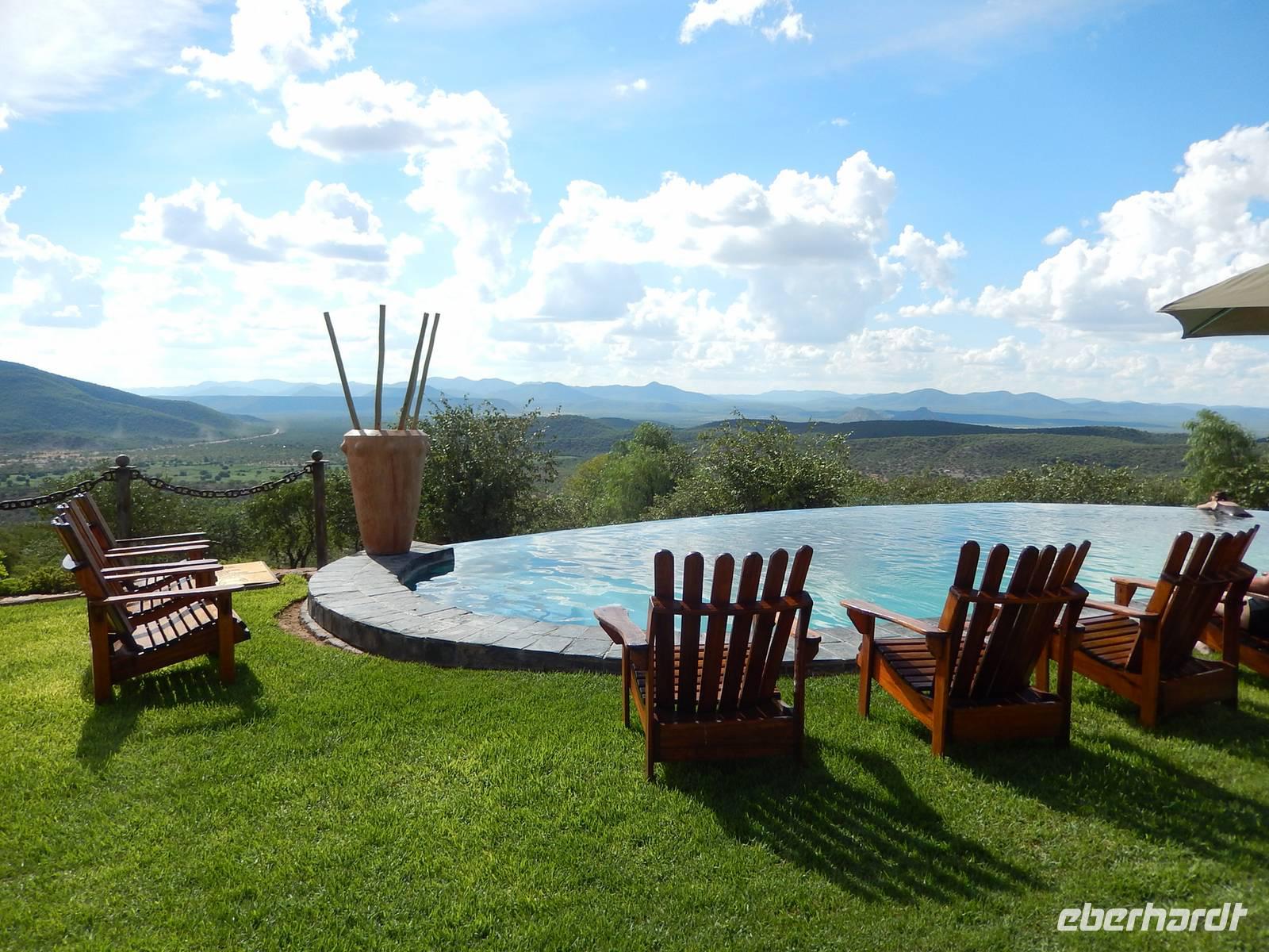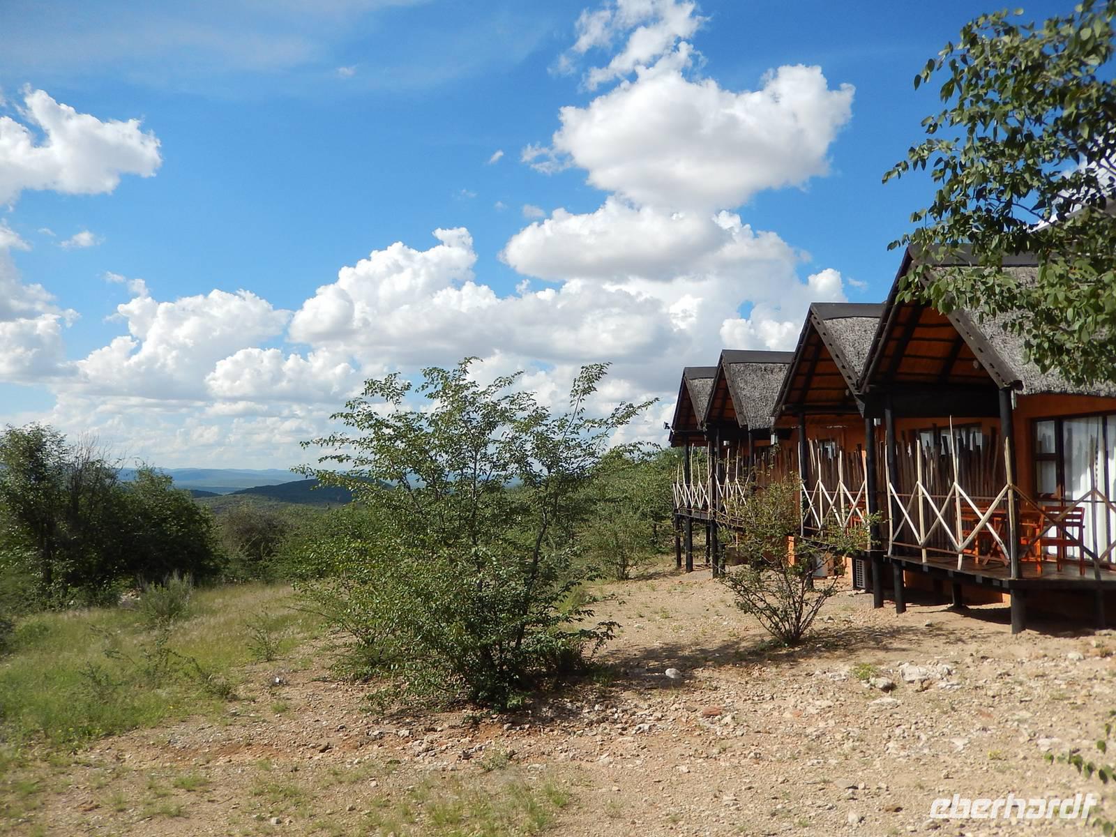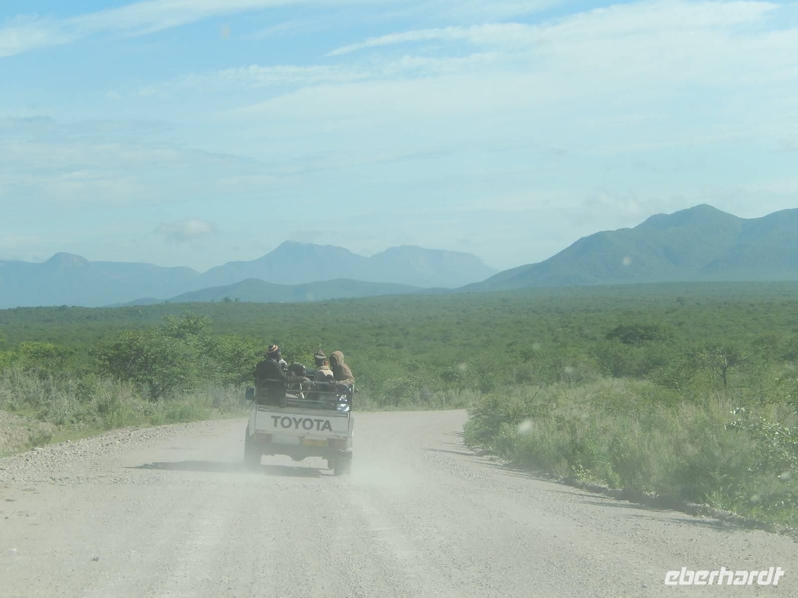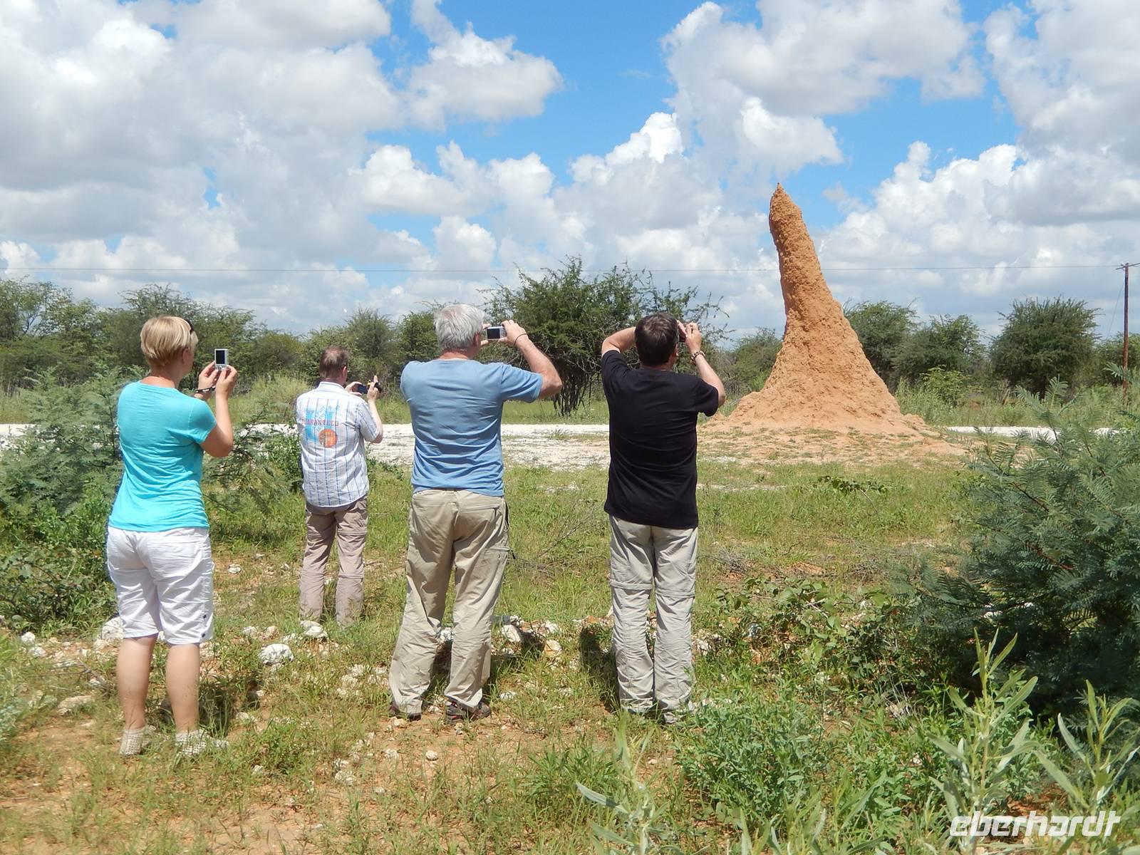 Begleitet von afrikanischen Klängen fahren wir durch die grüne Landschaft und halten Ausschau nach Elefanten, die hier vorkommen sollen. Da sich die großen Dickhäuter nicht zeigen, hat Klaus einen Blick für das Kleine: wir sehen einen Tausendfüßler, schauen uns ein Chamäleon näher an (und es uns) und eine kleine Leopardenschildkröte, die kaum größer als eine Streichholzschachtel ist. Schließlich sehen wir noch Giraffen am Straßenrand und einen ca. fünf Meter hohen, rot gefärbten Termitenhügel. Am Nachmittag beobachten wir noch das lebendige Treiben in Opuwo. Bei einem Bummel durch den Ort sehen wir ein buntes Völkergemisch aus Himba und Herero, überwiegend in ihrer traditionellen Kleidung - ein sehr authentischer und lebendiger Eindruck Afrikas. Das Opuwo Country Hotel liegt malerisch an einem Hang mit einem weiten Blick in die Landschaft. Zum Abendessen werden uns heute unter anderem fünf verschiedene Fleischspezialitäten gereicht: Springbock, Oryx, Elanantilope, Zebra und Giraffe. Guten Appetit!