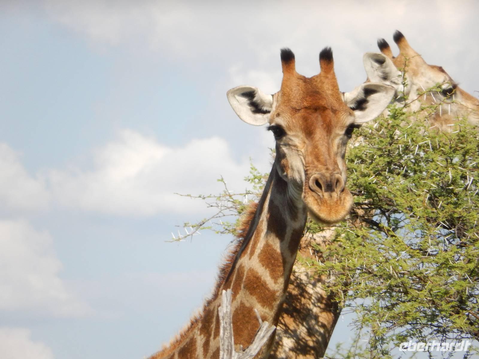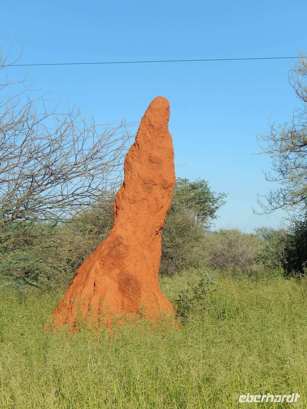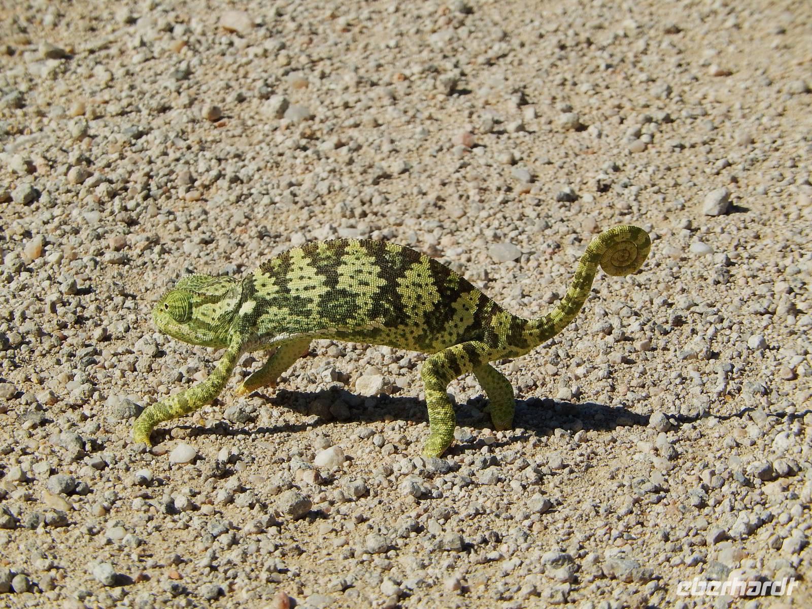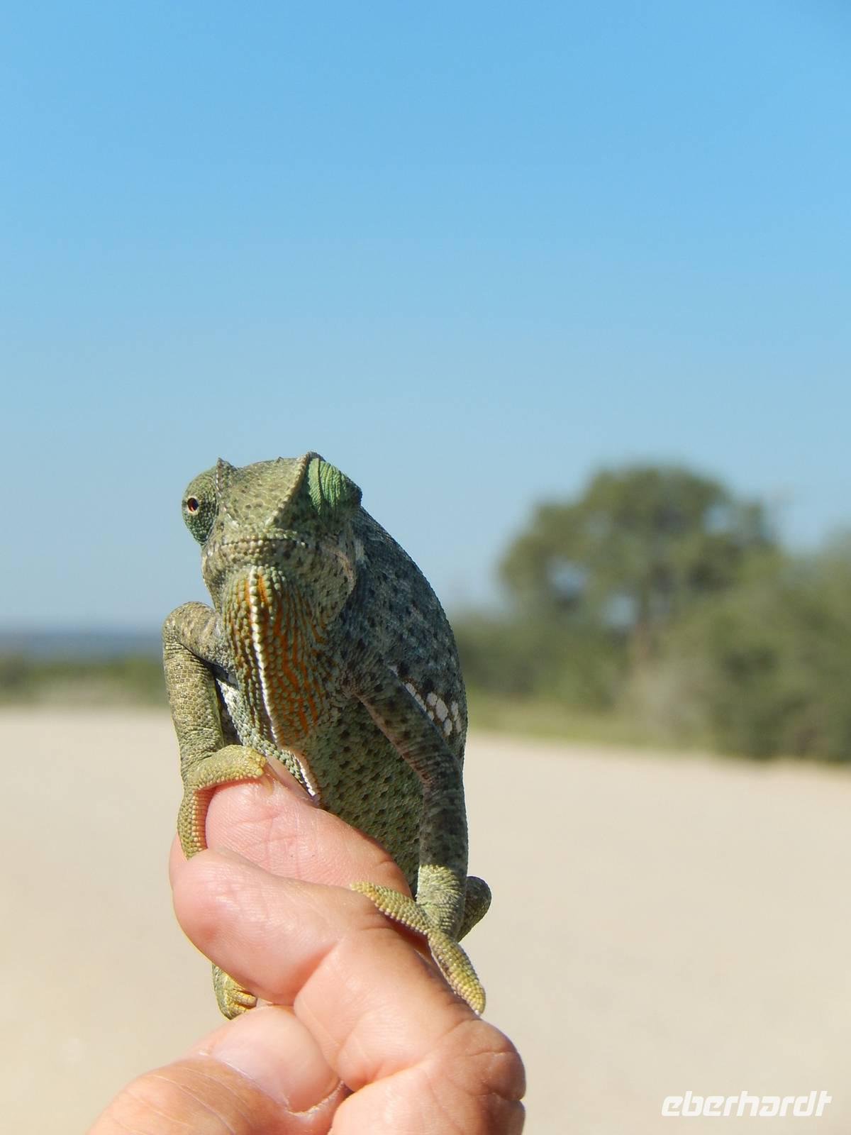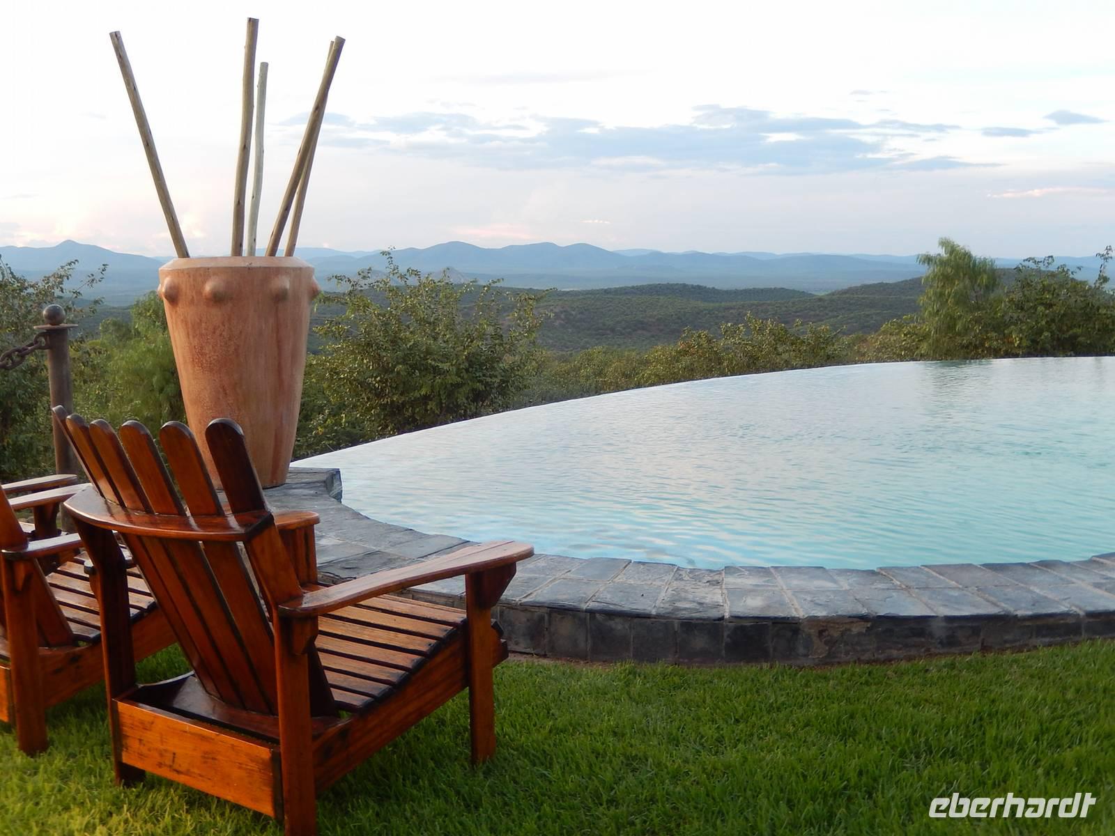 Begleitet von afrikanischen Klängen fahren wir durch die grüne Landschaft und halten Ausschau nach Elefanten, die hier vorkommen sollen. Da sich die großen Dickhäuter nicht zeigen, hat Klaus einen Blick für das Kleine: wir sehen einen Tausendfüßler, schauen uns ein Chamäleon näher an (und es uns) und eine kleine Leopardenschildkröte, die kaum größer als eine Streichholzschachtel ist. Schließlich sehen wir noch Giraffen am Straßenrand und einen ca. fünf Meter hohen, rot gefärbten Termitenhügel. Am Nachmittag beobachten wir noch das lebendige Treiben in Opuwo. Bei einem Bummel durch den Ort sehen wir ein buntes Völkergemisch aus Himba und Herero, überwiegend in ihrer traditionellen Kleidung - ein sehr authentischer und lebendiger Eindruck Afrikas. Das Opuwo Country Hotel liegt malerisch an einem Hang mit einem weiten Blick in die Landschaft. Zum Abendessen werden uns heute unter anderem fünf verschiedene Fleischspezialitäten gereicht: Springbock, Oryx, Elanantilope, Zebra und Giraffe. Guten Appetit!