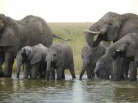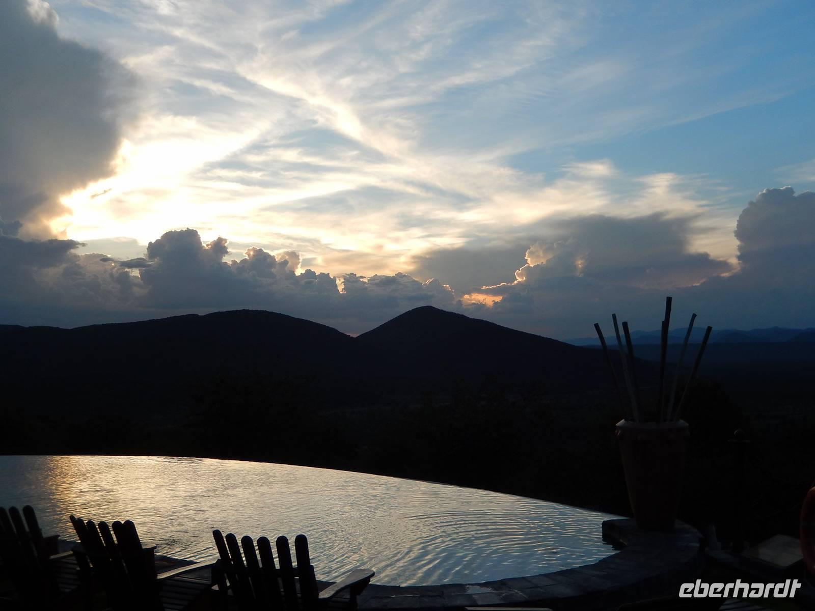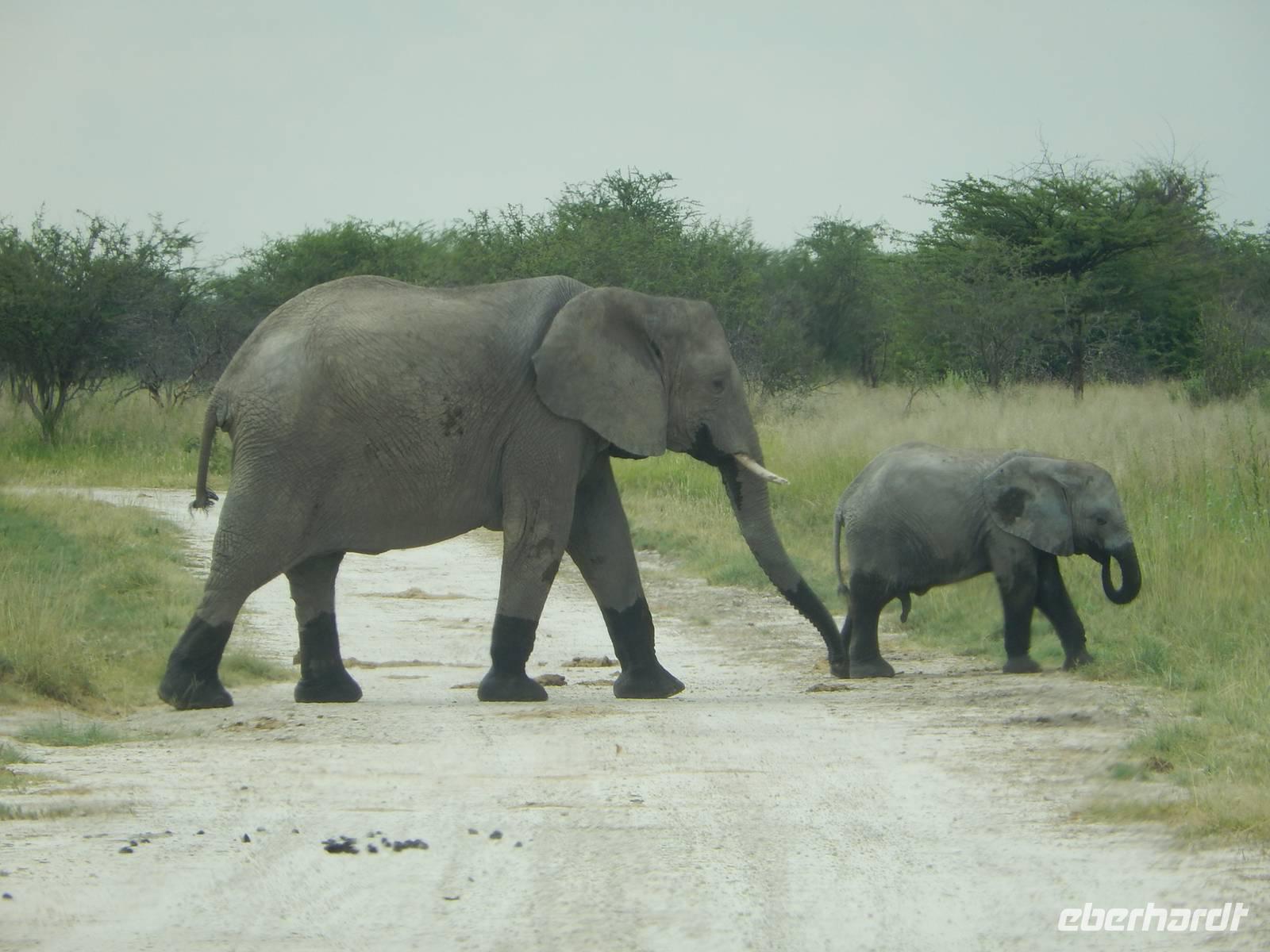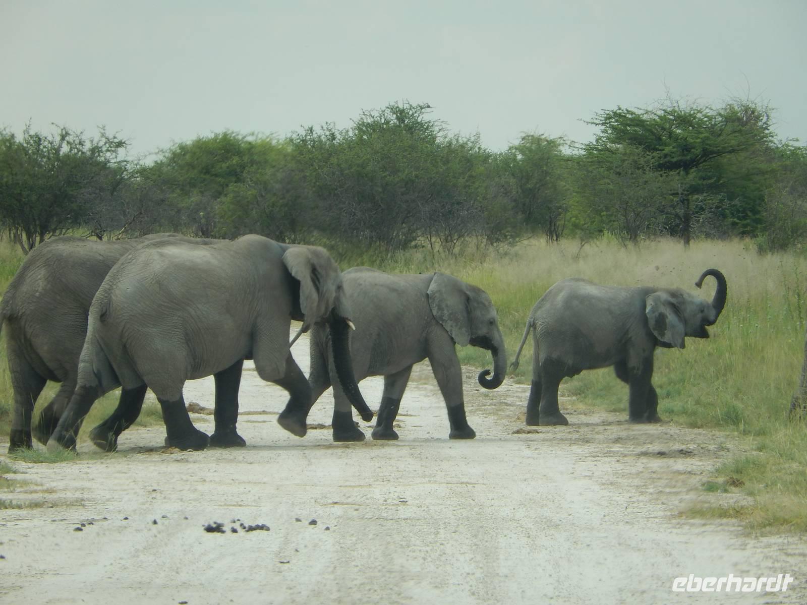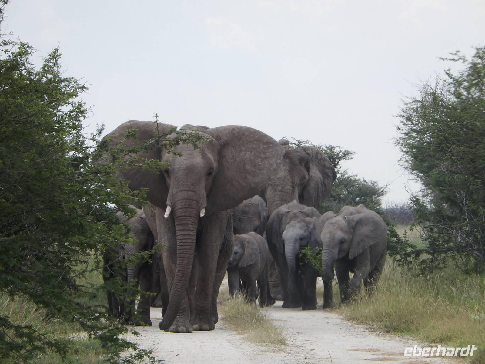Wir entschließen uns heute spontan, die Reiseroute zur nächsten Unterkunft etwas zu verändern und fahren über Okahao und Oshakati mitten durch das wasserreiche und verhältnismäßig dicht besiedelte Owamboland. Es ist Sonntag und wir sehen viele hübsch gekleidete Namibier auf dem Weg zur Kirche. Während der Fahrt zum Etosha-Nationalpark müssen wir immer mal wieder Rindern und Eseln auf der Straße den Vortritt lassen, denn auf kommunalem Land wird viel Viehzucht betrieben. Wem müssen wir denn im Etosha-Park Vortritt lassen? Kurz hinter dem Gate sehen wir in der Ferne graue Felsen, die sich bei näherer Betrachtung als Elefanten entpuppen - nicht nur ein paar Dickhäuter kreuzen unseren Weg, sondern eine riesige Herde mit ca. 60 Tieren! Die Babys - oder besser gesagt Riesenbabys - sind besonders süß! Ganz geheuer ist es uns dennoch nicht, als plötzlich ein Elefantenbulle mit Drohgebärden vor uns steht! Wir können uns wirklich glücklich schätzen, so viele Elefanten so hautnah zu erleben! Aber das soll nicht das einzige Highlight unserer Fahrt durch den Park bleiben. Neben den großen Tieren entdecken wir auch die bezaubernde Blau-und Gabelracke sowie einen Mistkäfer, wir bestaunen die grazilen Giraffen und schwarz-weiß-gestreiften Zebras. Plötzlich stoppen wir, denn unmittelbar neben der Straße liegt wieder ein großer grauer Fels - ein Spitzmaulnashorn nimmt ein Bad im Schlamm. Es ist ein gigantisches Tier, obwohl es im Vergleich zum Breitmaulnashorn noch klein sein soll! Mit gebührendem Abstand machen wir unglaubliche Aufnahmen von dem Black Rhino. In kürzester Zeit sehen wir unfassbar viele Tiere, so dass wir fast übermütig auch noch die Großkatzen sehen möchten... und tatsächlich entdecken wir ein kleines Rudel Löwen in der Ferne. Zum krönenden Abschluss läuft uns noch eine Tüpfelhyäne über den Weg, bevor wir begleitet von einem herrlichen Sonnenuntergang das Etosha Safari Camp erreichen. Die Lodge ist wie ein kleines Museum, wo man liebevoll alte Gebrauchsgegenstände wie Fahrräder, Autoreifen, Badewannen usw. als Möbiliar umgebaut hat. Eine Unterkunft mit besonders viel Charme und Atmosphäre. Unser leckeres Abendessen wird garniert mit afrikanischer Live-Musik. Es ist ein gebührender Abschluss dieses eindrucksvollen Tages!