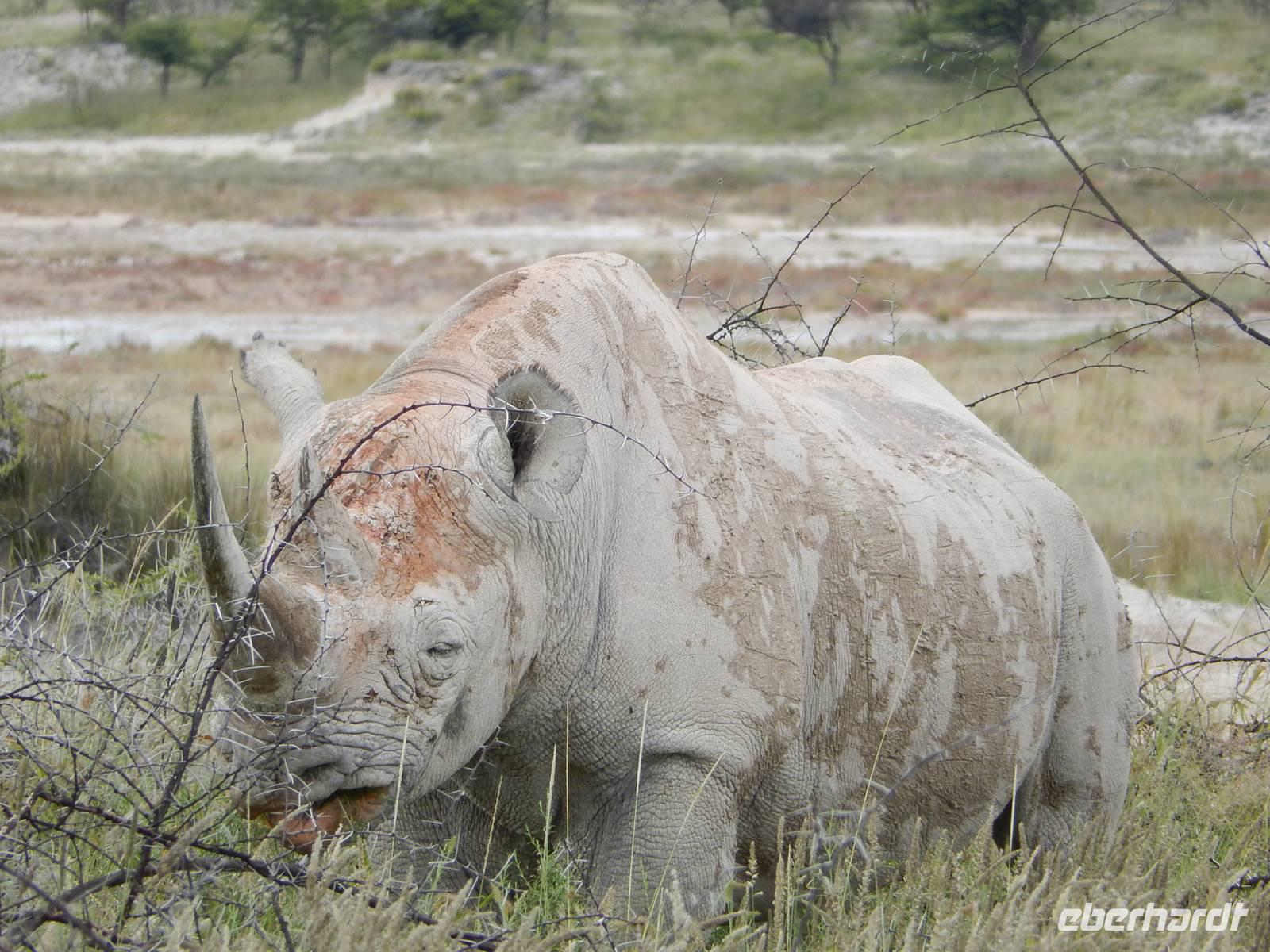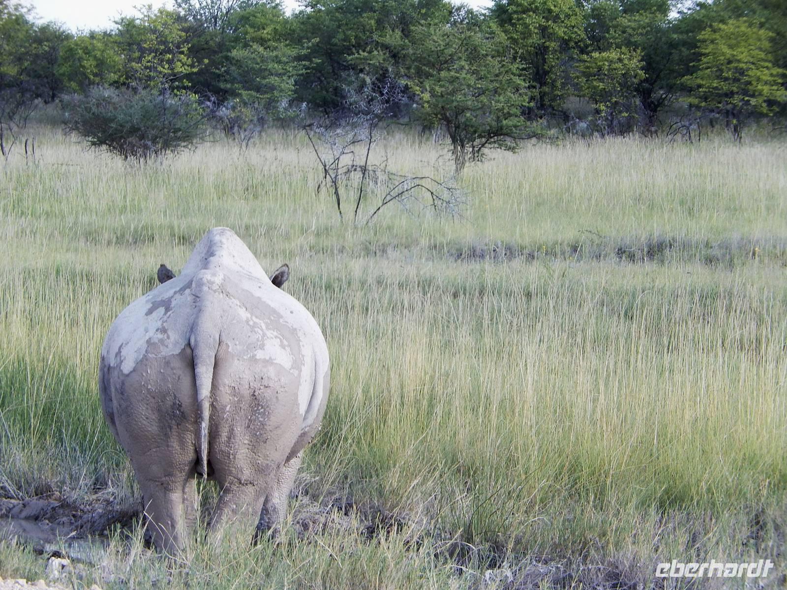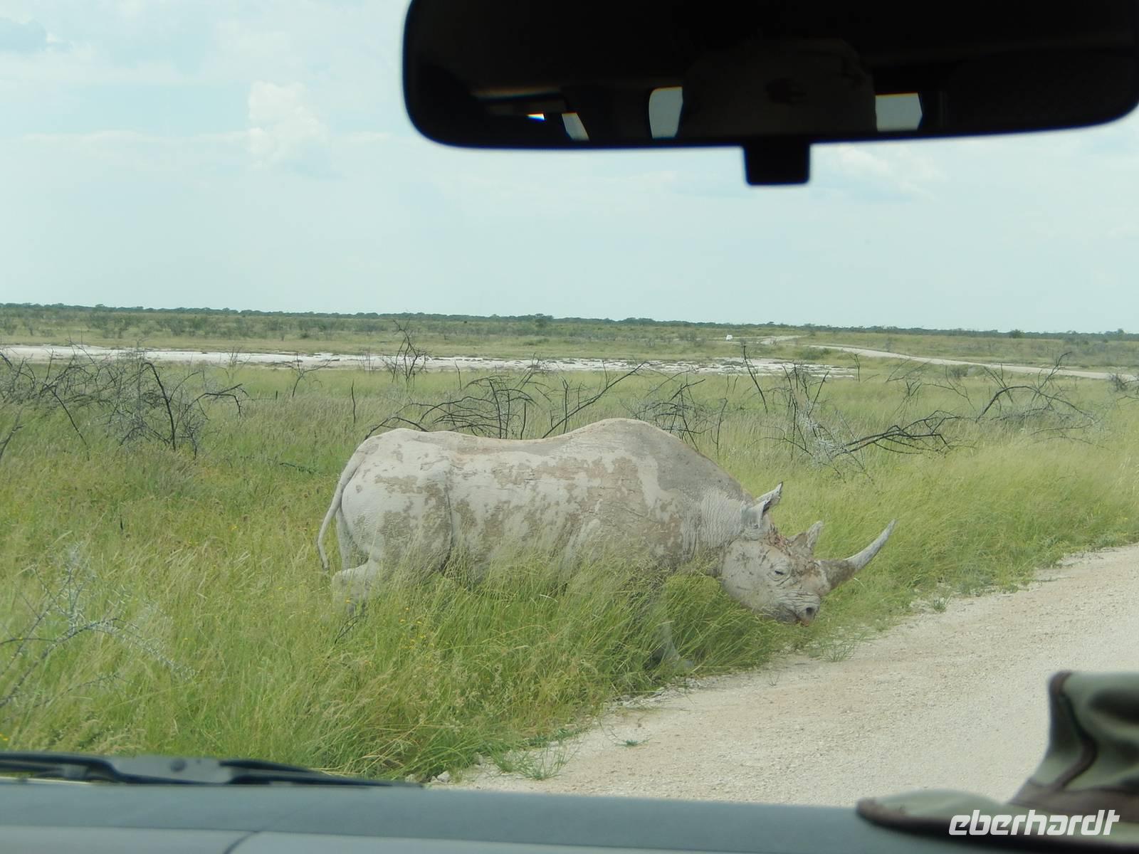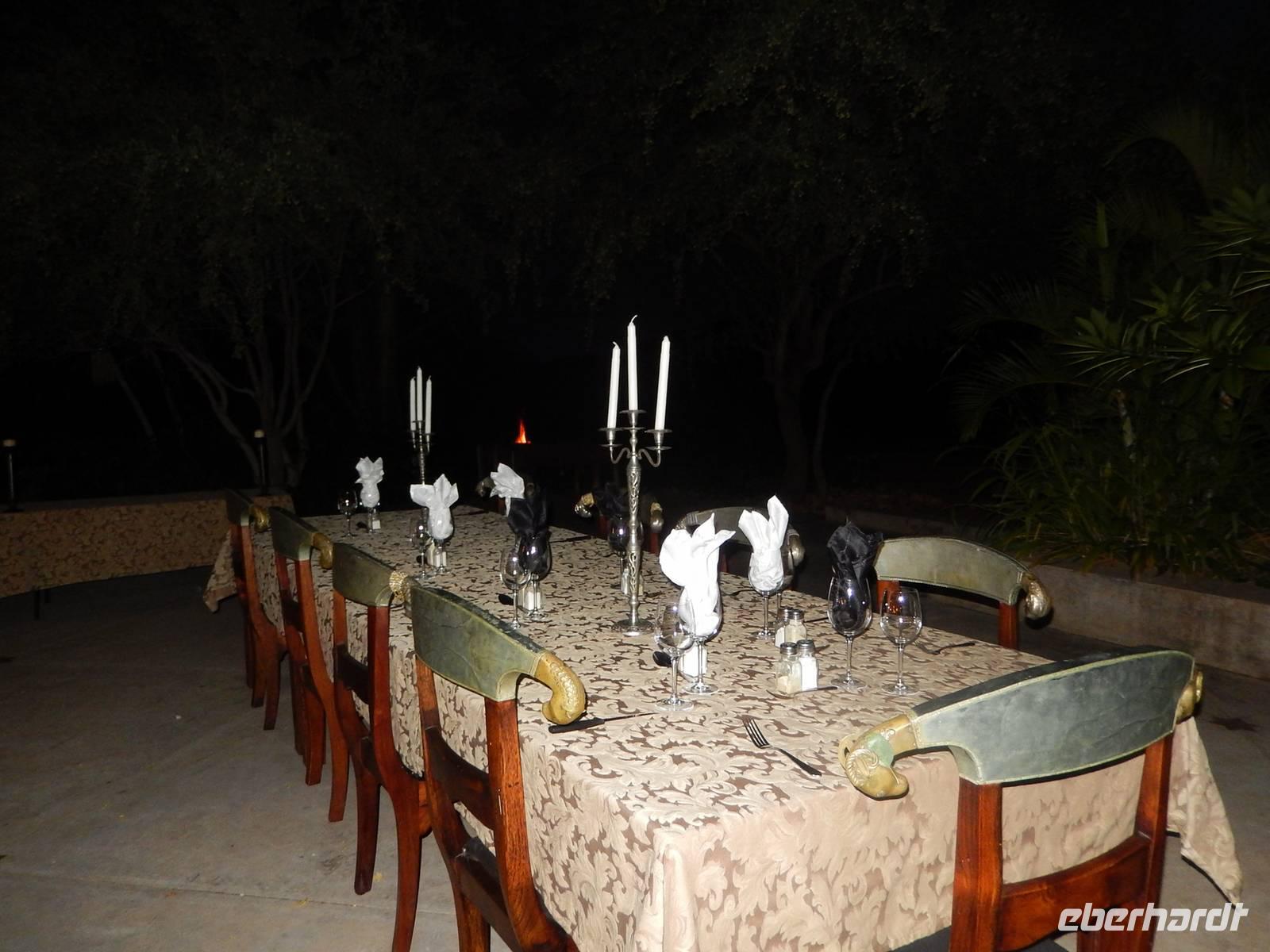 Noch einmal begeben wir uns auf Safari im Etosha-Nationalpark. Doch das Glück ist uns am Vormittag wieder nicht hold und wir sehen kaum mehr als einige Vögel in der weiten Landschaft. Nach einer Kaffeepause im Camp Halali und einem Fotostopp an der Etosha-Pfanne wird es endlich wieder wild - im Busch bewegen sich zwei Nashörner und mit ein bisschen Geduld können wir eines sogar aus nächster Nähe beobachten und fotografieren. Danach präsentieren sich noch ein stolzer Kudu und der Sekretär (samt Sekretärin ;-)). Im Fort Namutoni machen wir Mittagspause und probieren erneut unser Glück im Norden des Parks, wo wir anfangs die riesige Herde Elefanten sahen. Und tatsächlich tauchen die sanften Dickhäuter wieder in großer Anzahl auf und vergnügen sich vor unseren Augen am Wasserloch. Darüber hinaus begegnen uns noch einige Giraffen. Am Abend werden wir in der Uris Safari Lodge mit einem typisch namibischen Braai überrascht - im Garten ist für uns unter einem Marula-Baum liebevoll ein Tisch hergerichtet und es werden Spezialitäten frisch vom Grill serviert. Was für eine wunderbare Atmosphäre!