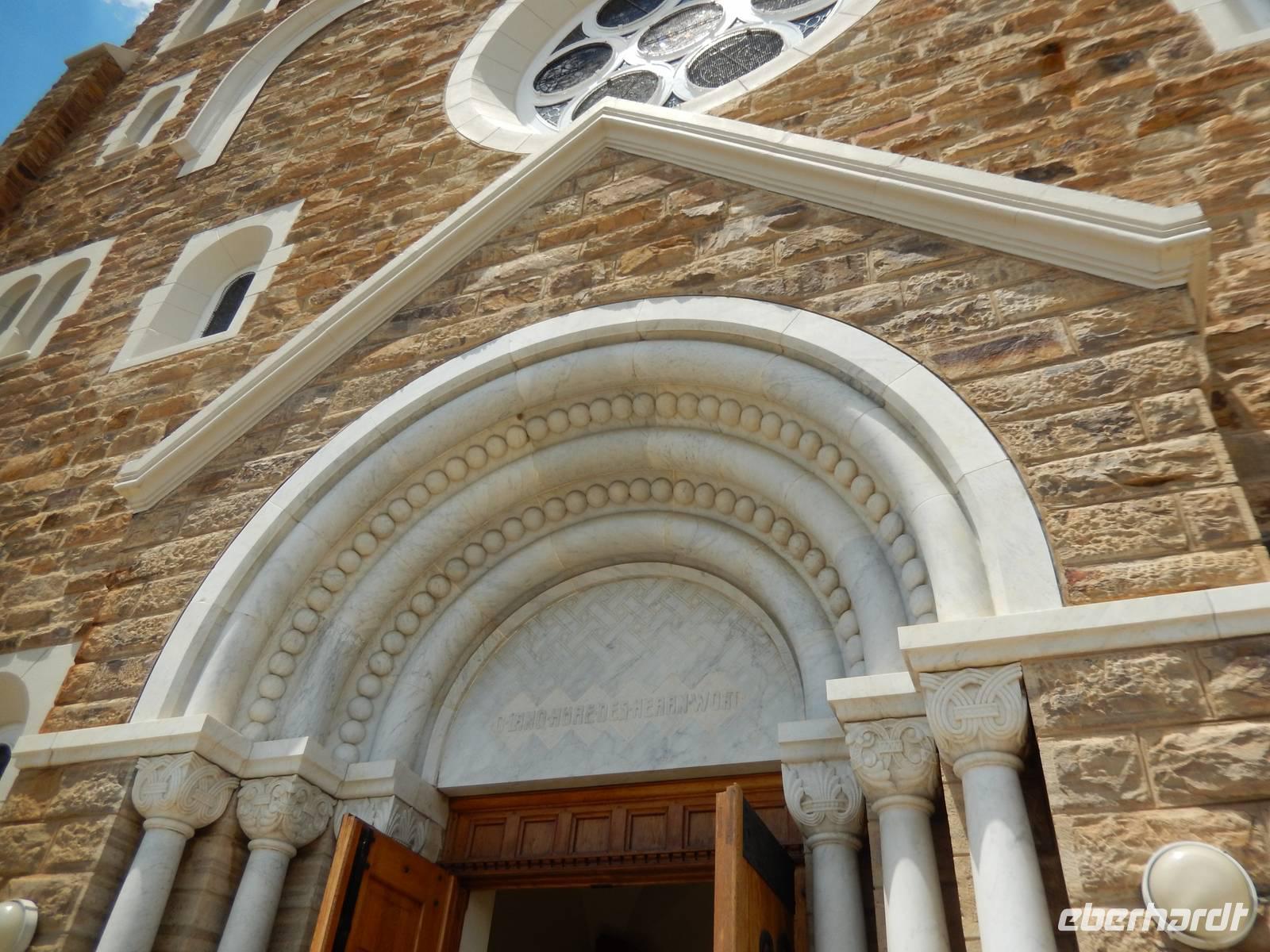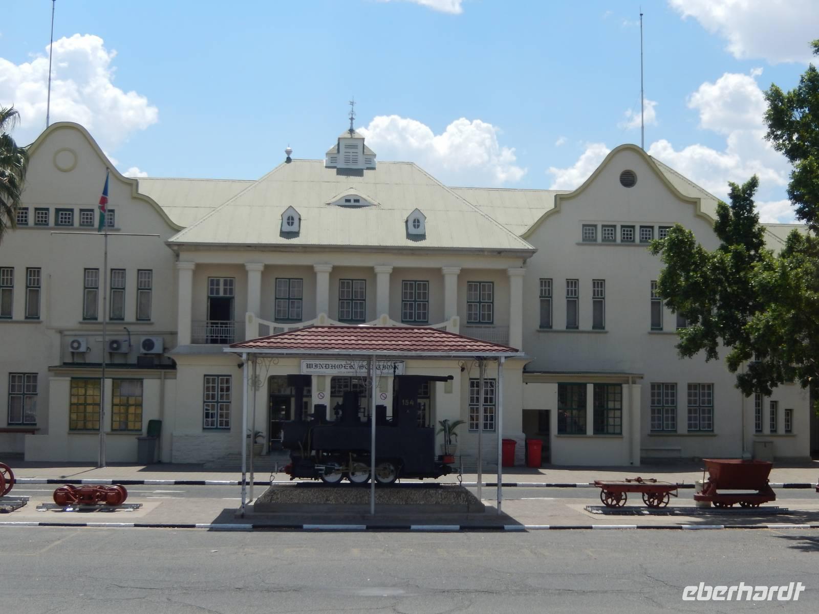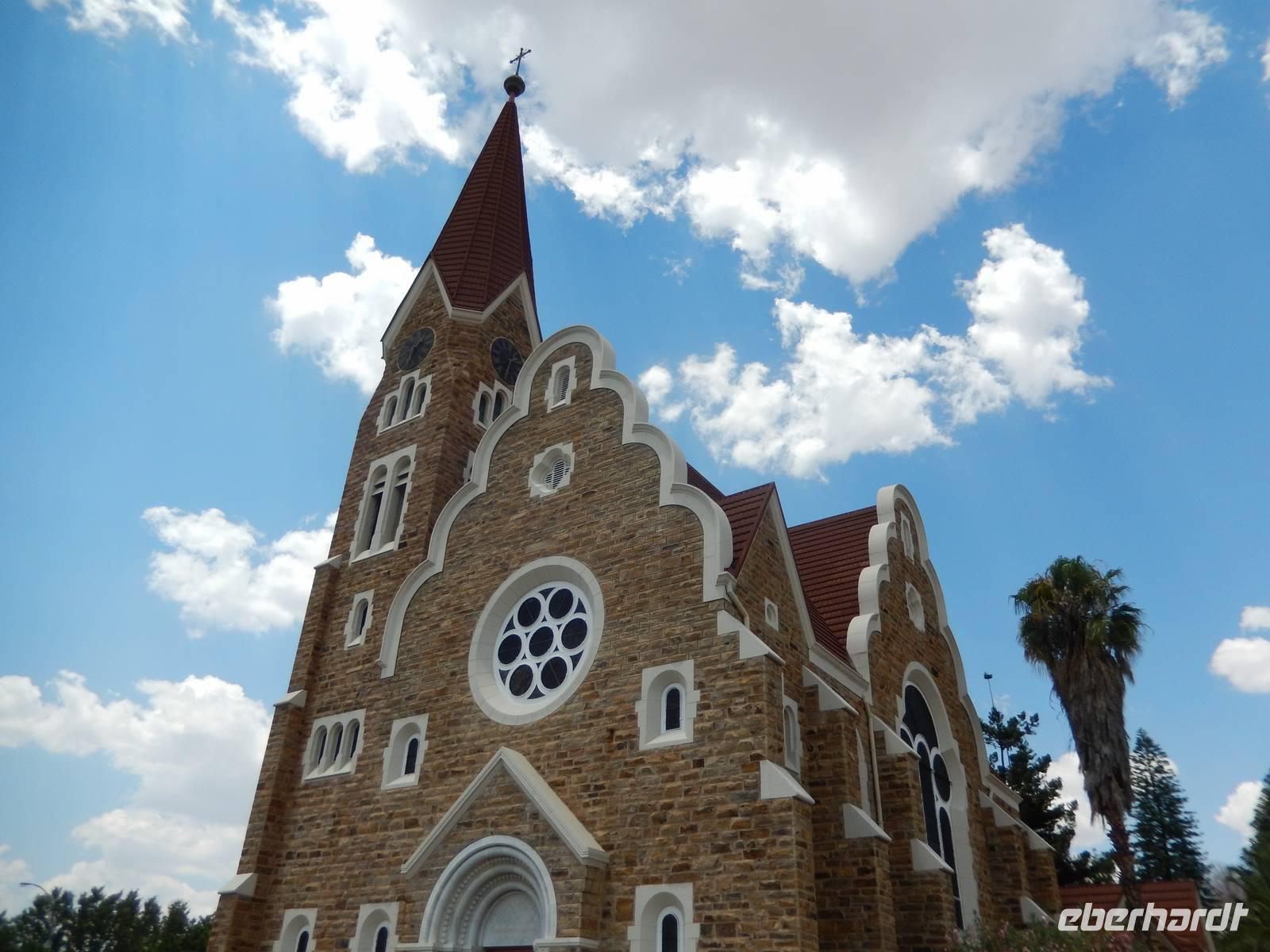Nach ca. 40 Kilometern erreichten wir schließlich Windhoek - Hauptstadt und zugleich größte Stadt des Landes auf einer durchschnittlichen Höhe von 1.600 Metern. Bei unserer Stadtrundfahrt präsentierte sich Windhoek als eine Stadt zwischen zwei Welten: modern und europäisch im Zentrum und in den Wohngebieten der Weißen, arm und afrikanisch in den Vororten der Farbigen. Claus zeigte uns zunächst die Christuskirche, die 1910 für die evangelisch-lutherische Gemeine geweiht wurde. Besonders sehenswert war das aus Carrara-Marmor gefertigte Portal. Gleich dahinter befindet sich der Tintenpalast. Der als Verwaltungssitz für die deutsche Kolonialregierung konzipierte Bau ist heute der Sitz der Nationalversammlung. Auf dem Weg zur Alten Feste (ältestes Gebäude der Stadt mit Teilen des Staatsmuseums) passierten wir das Independence Memorial Museum (die "Kaffeemaschine"). Der letzte Stopp im Zentrum der Stadt war der 1912 gebaute Bahnhof, der ein Gemisch aus wilhelminischer Architektur und Jugendstil ist. Um einen Gesamteindruck der Bevölkerungsstruktur der Stadt zu erhalten, führte uns Claus auch in den äußeren Stadtteil Katutura, der in der Zeit der südafrikanischen Apartheitsherrschaft entstand und auch über 15 Jahre nach Erreichen der Unabhängigkeit die Unterschiede von Weiß und Schwarz wiederspiegelt. Dominiert wird dieses Viertel auch heute noch von einfachen Häusern, barackenähnlichen Gebäuden, Wellblechhütten und anderen notdürftigen Unterkünften.