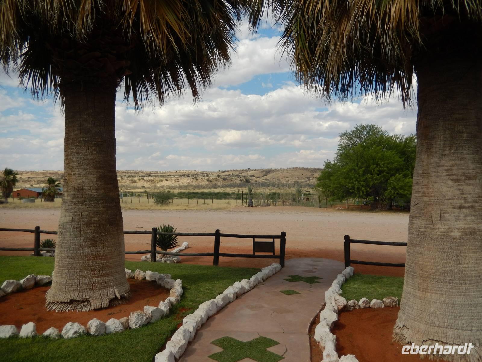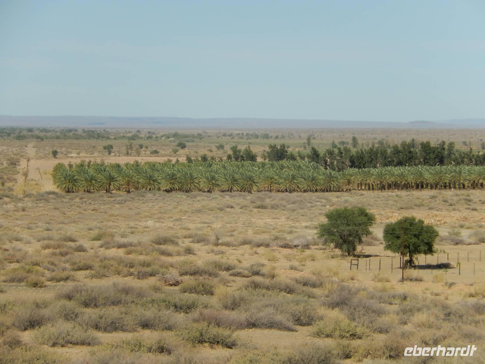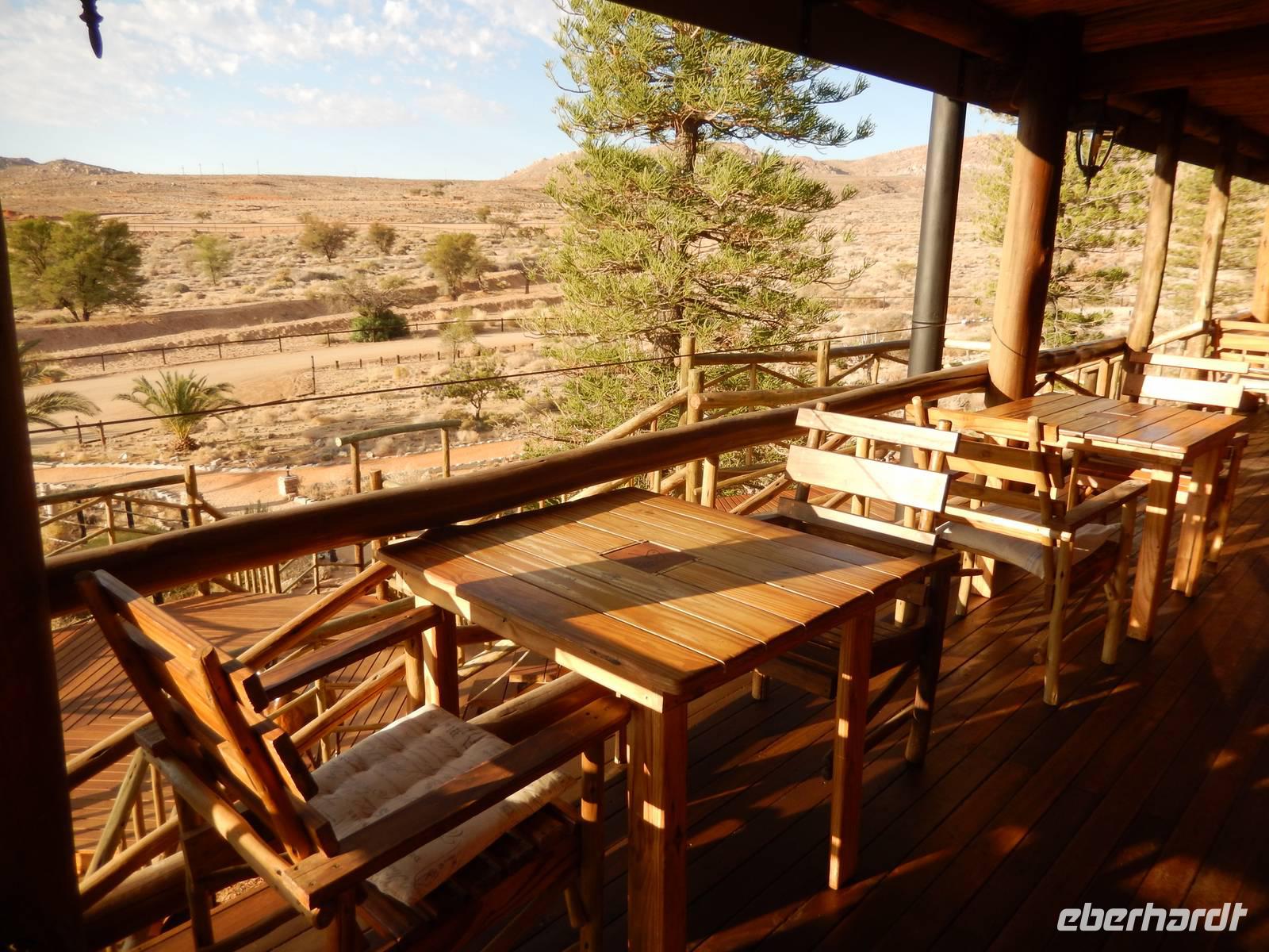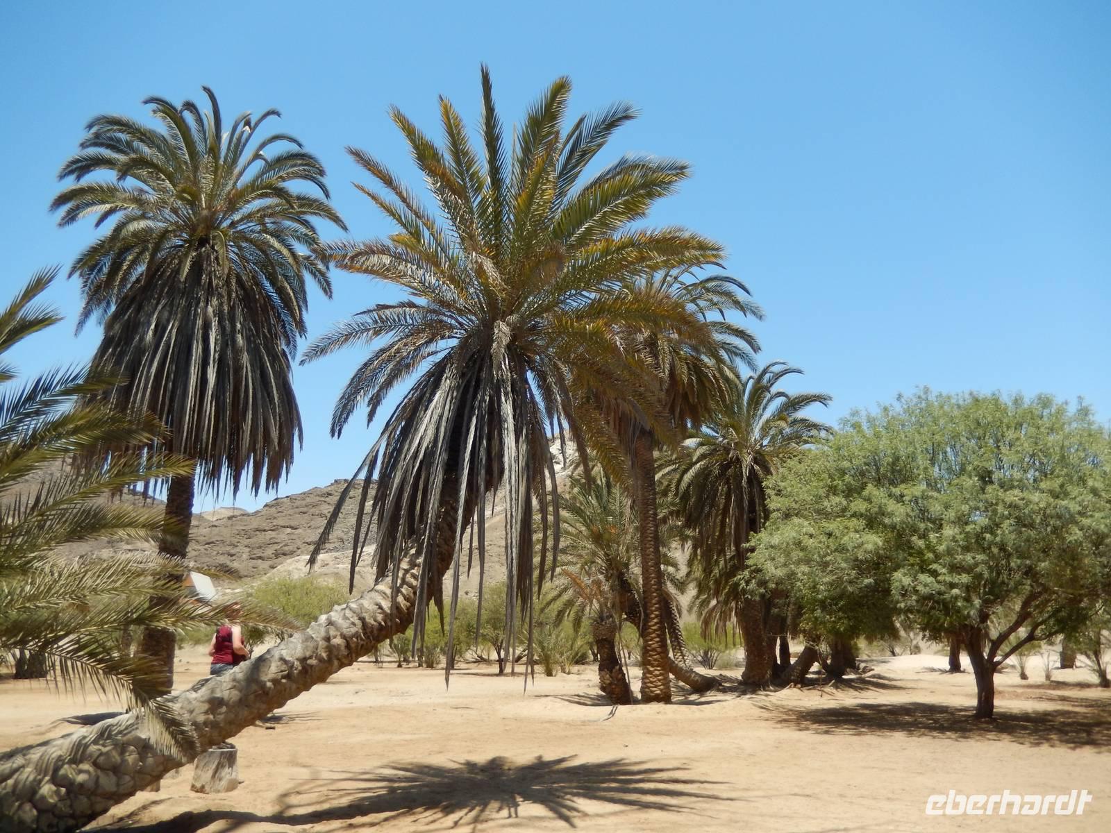 Die Mittagspause verbrachten wir in der Goanikontes-Oase im Swakoptal auf der Veranda einer netten Gaststätte. Ringsherum spendeten riesige Dattelpalmen lang ersehnten Schatten.