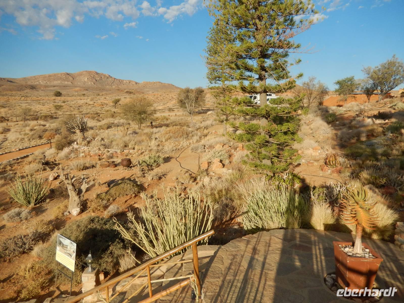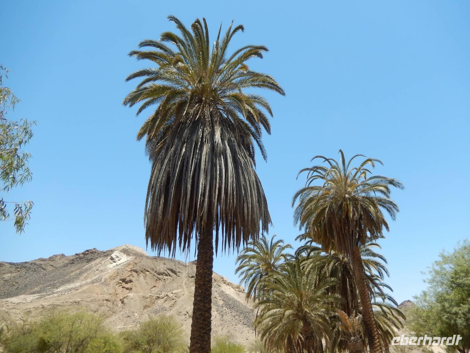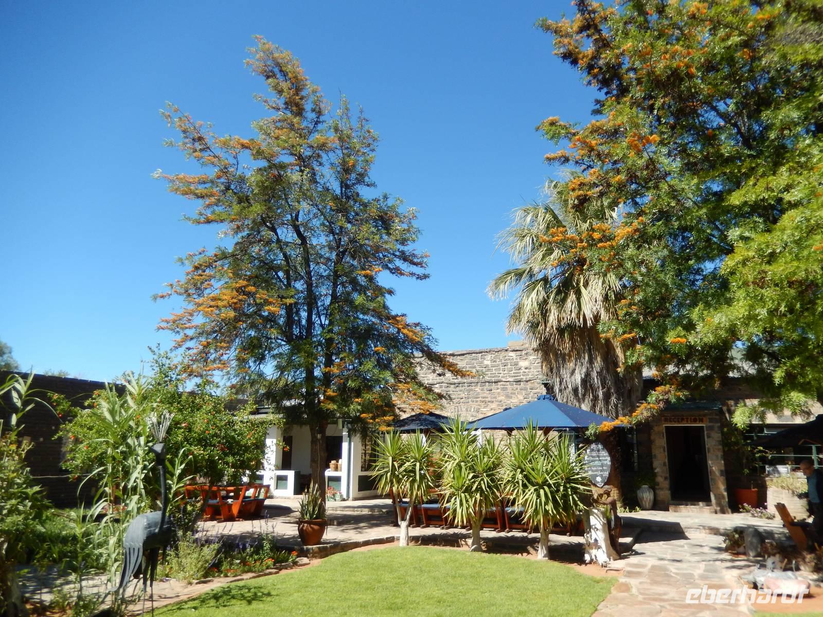 Die Mittagspause verbrachten wir in der Goanikontes-Oase im Swakoptal auf der Veranda einer netten Gaststätte. Ringsherum spendeten riesige Dattelpalmen lang ersehnten Schatten.