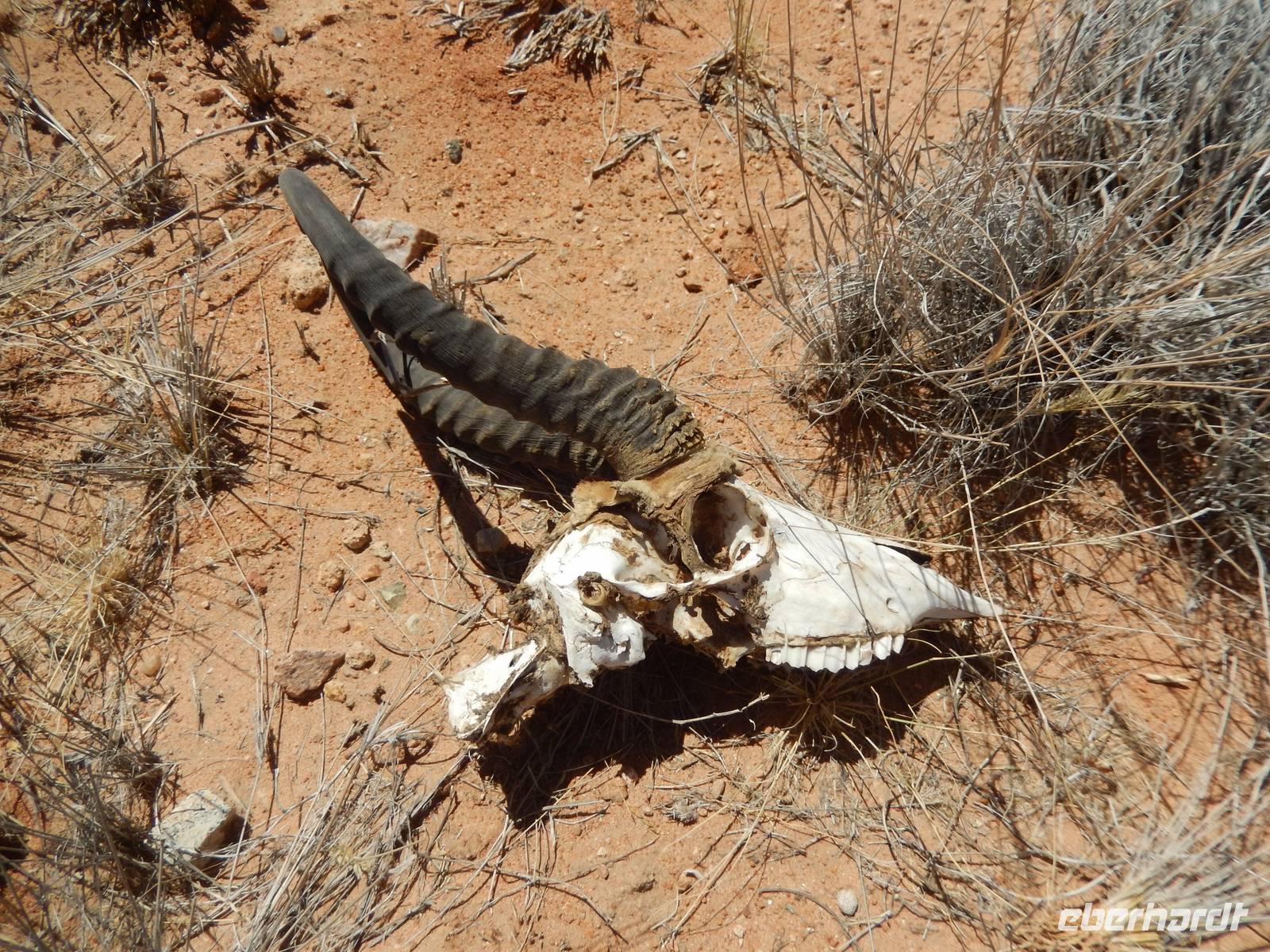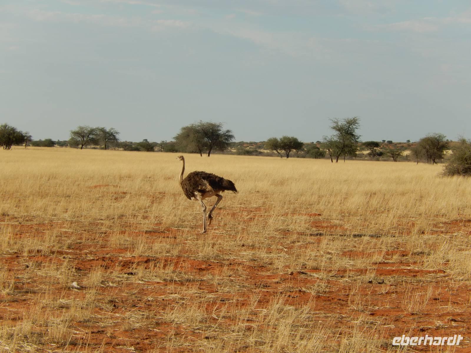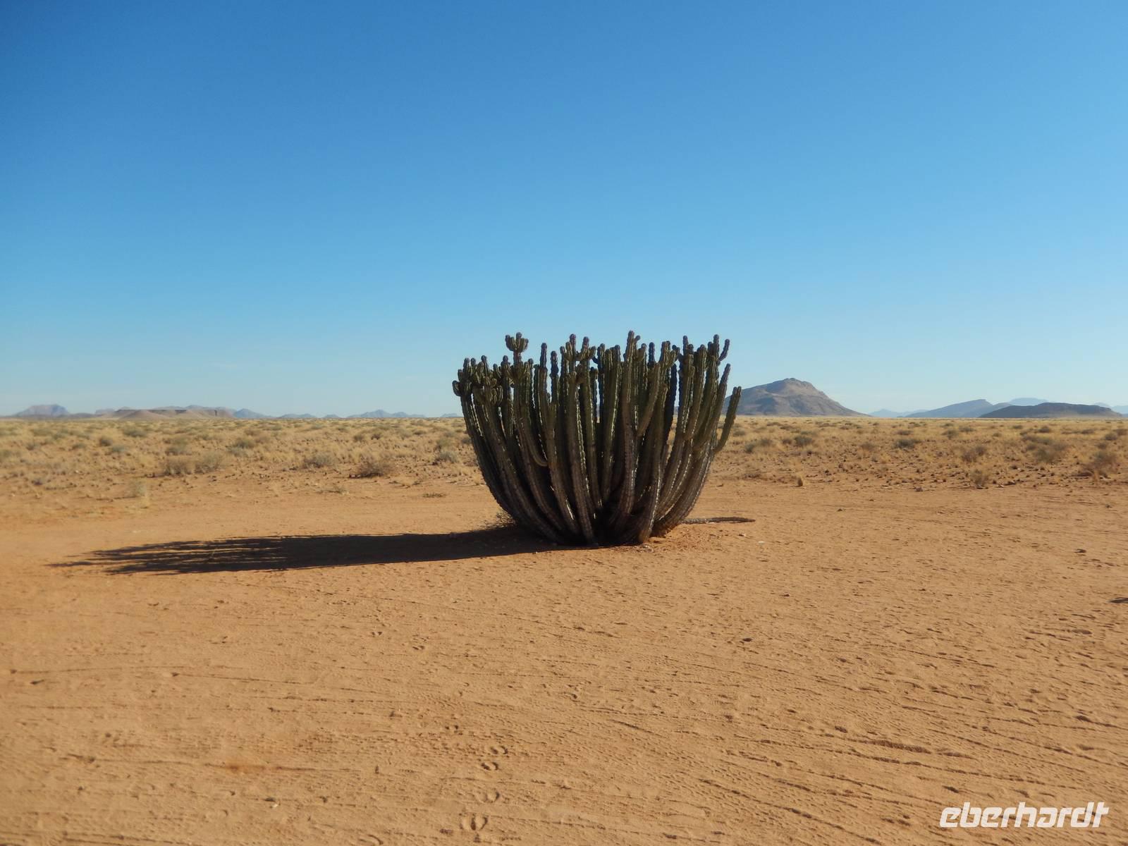 Während der Fahrt wurde uns wieder klar, warum Namibia auch "das Land der unendlichen Weite" genannt wird. Viele Kilometer nichts, nur Sand, Geröll, ab und zu mal ein Springbock und eine Oryx-Antilope, kleinere Büsche und Sträucher. Und dann entdeckten wir eine riesige Euphorbia virosa, die namibische Giftwolfsmilch. Schnell wurden Fotos an der über 2 Meter hohen, kakteenartigen Pflanze geschossen. Nun erreichten wir wieder den südlichen Wendekreis des Steinbocks und kamen zum relativ undspektakulären Gaub-Pass, über den wir in das Gebiet des Kuiseb Canyons kamen. Immer wieder sahen wir frei laufende Strauße. Das war es aber auch, was sich als Abwechslung zur Staubpiste anbot.
