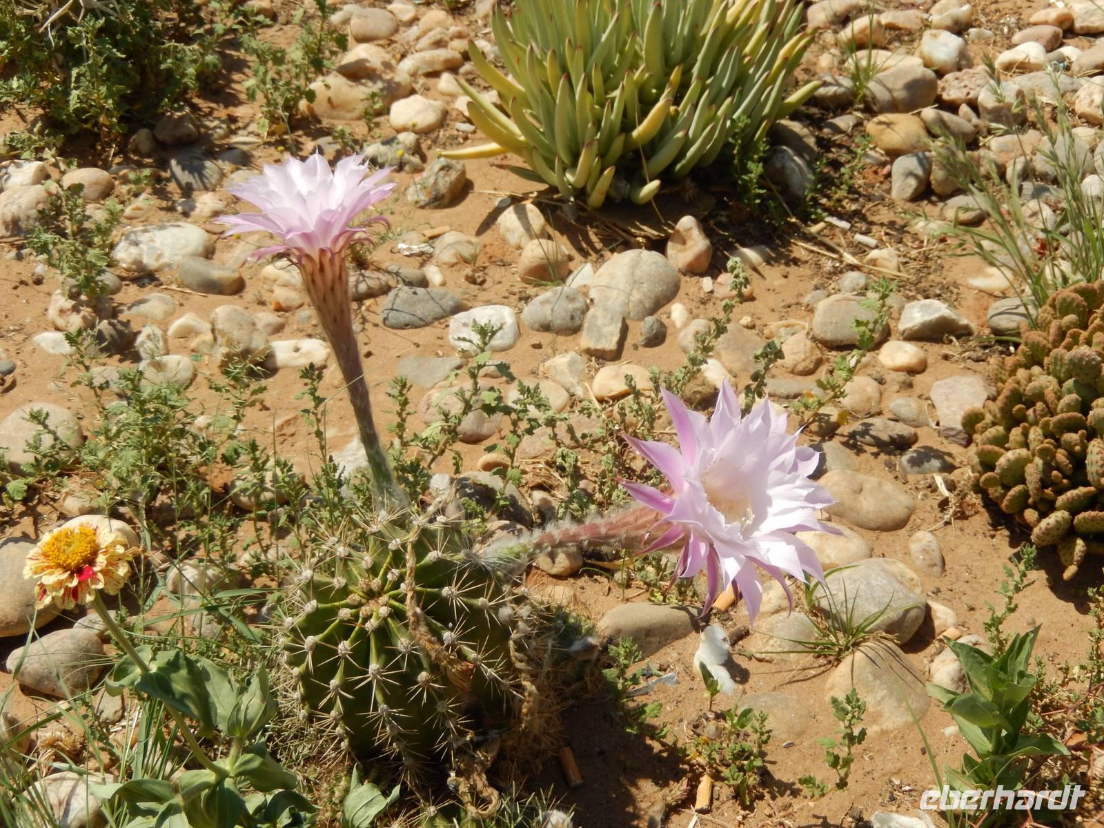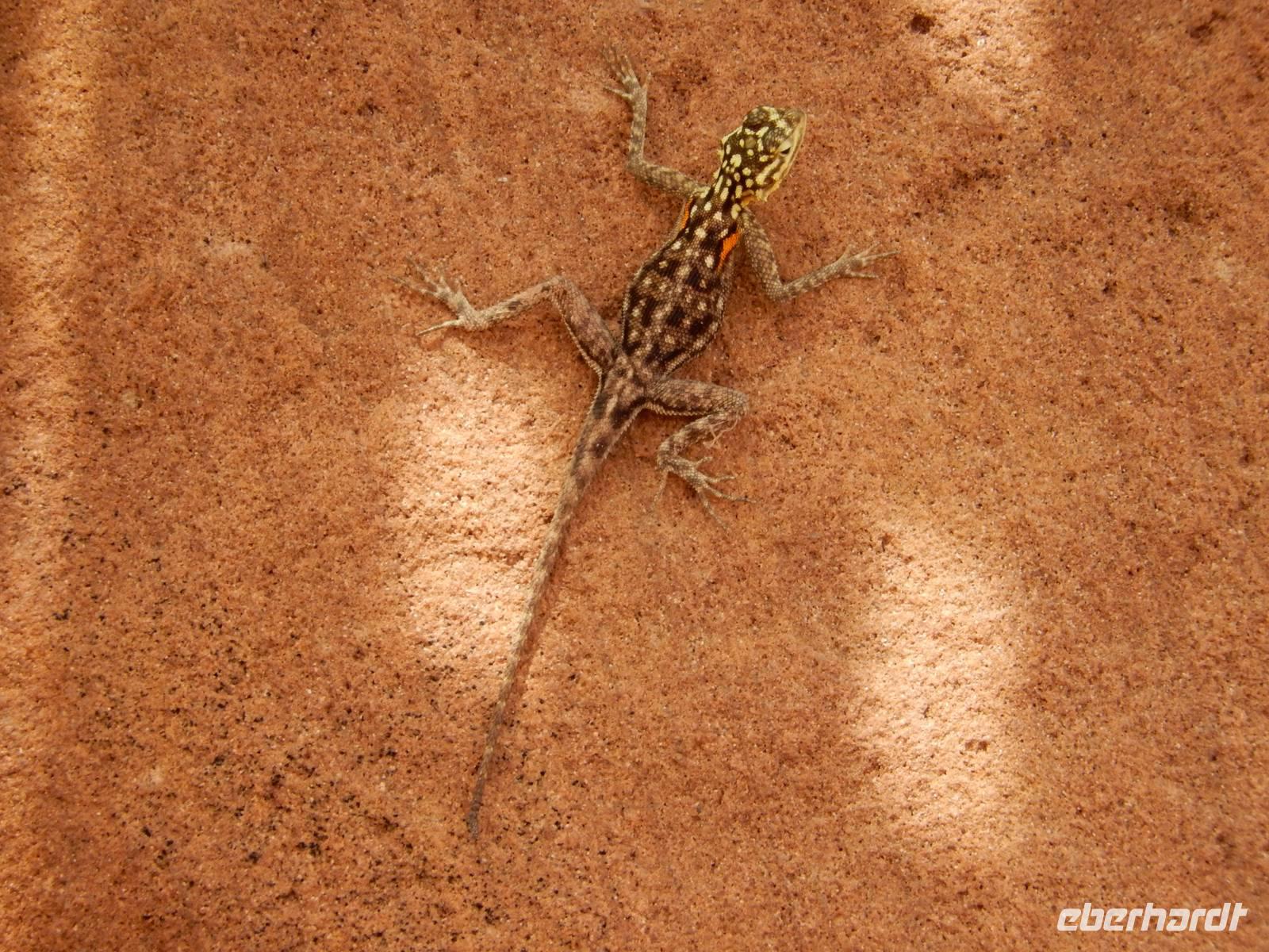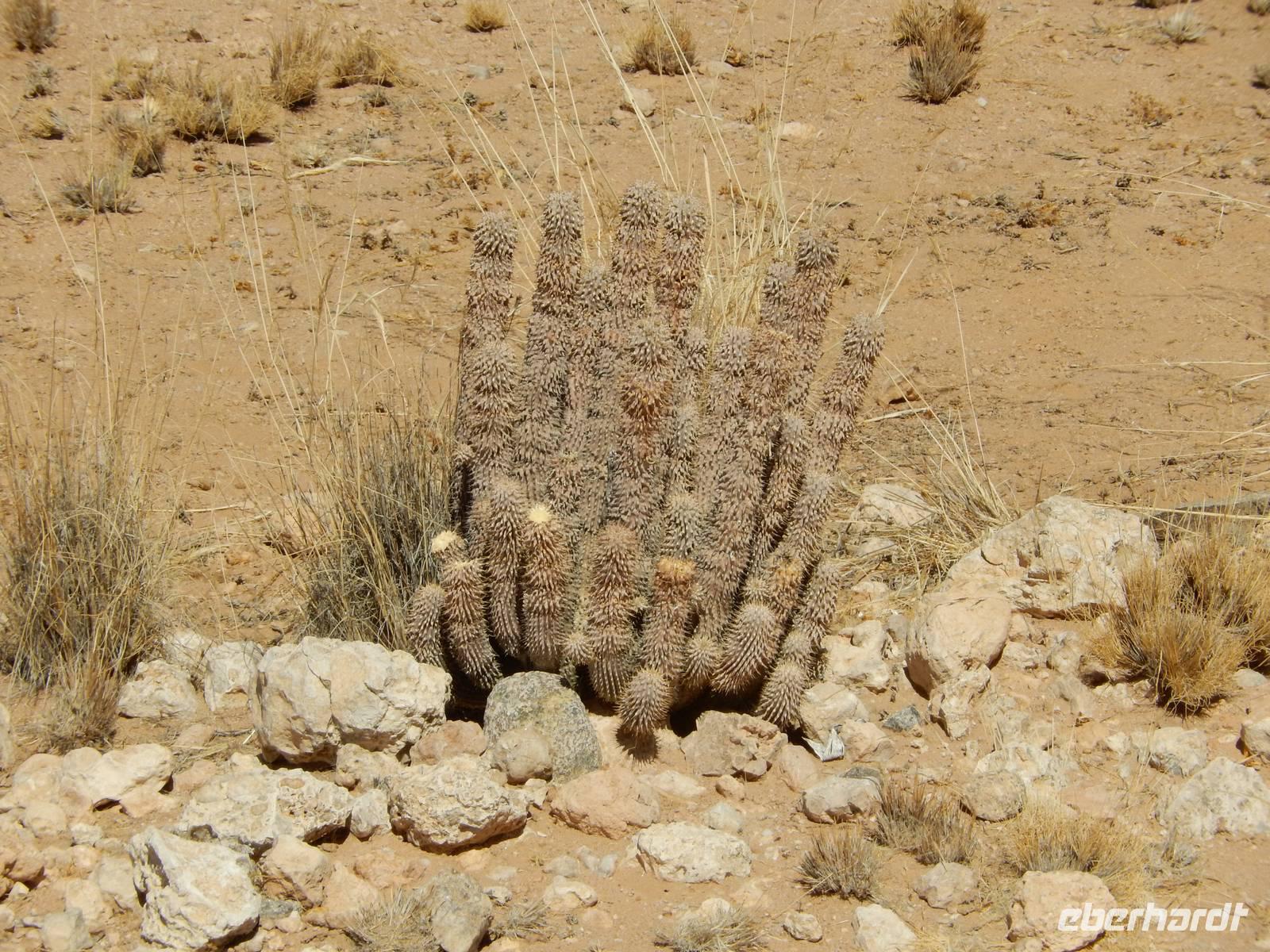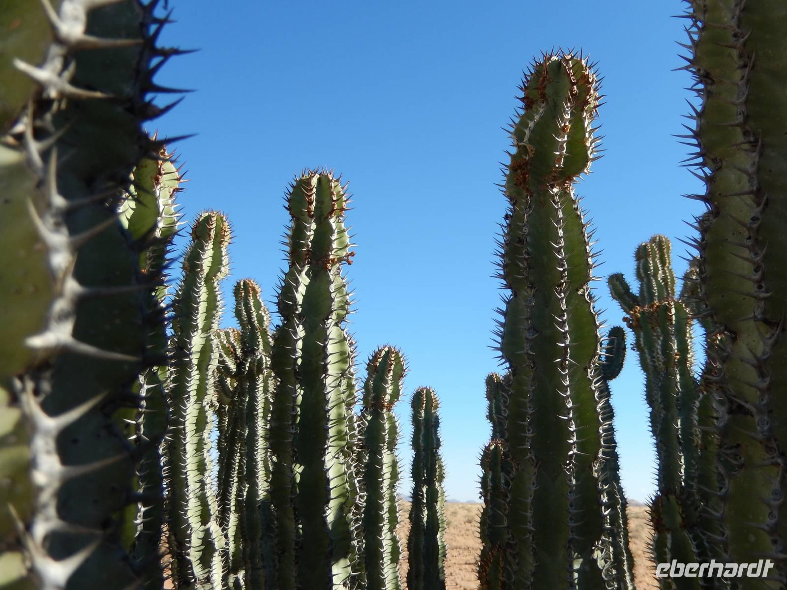 Während der Fahrt wurde uns wieder klar, warum Namibia auch "das Land der unendlichen Weite" genannt wird. Viele Kilometer nichts, nur Sand, Geröll, ab und zu mal ein Springbock und eine Oryx-Antilope, kleinere Büsche und Sträucher. Und dann entdeckten wir eine riesige Euphorbia virosa, die namibische Giftwolfsmilch. Schnell wurden Fotos an der über 2 Meter hohen, kakteenartigen Pflanze geschossen. Nun erreichten wir wieder den südlichen Wendekreis des Steinbocks und kamen zum relativ undspektakulären Gaub-Pass, über den wir in das Gebiet des Kuiseb Canyons kamen. Immer wieder sahen wir frei laufende Strauße. Das war es aber auch, was sich als Abwechslung zur Staubpiste anbot.