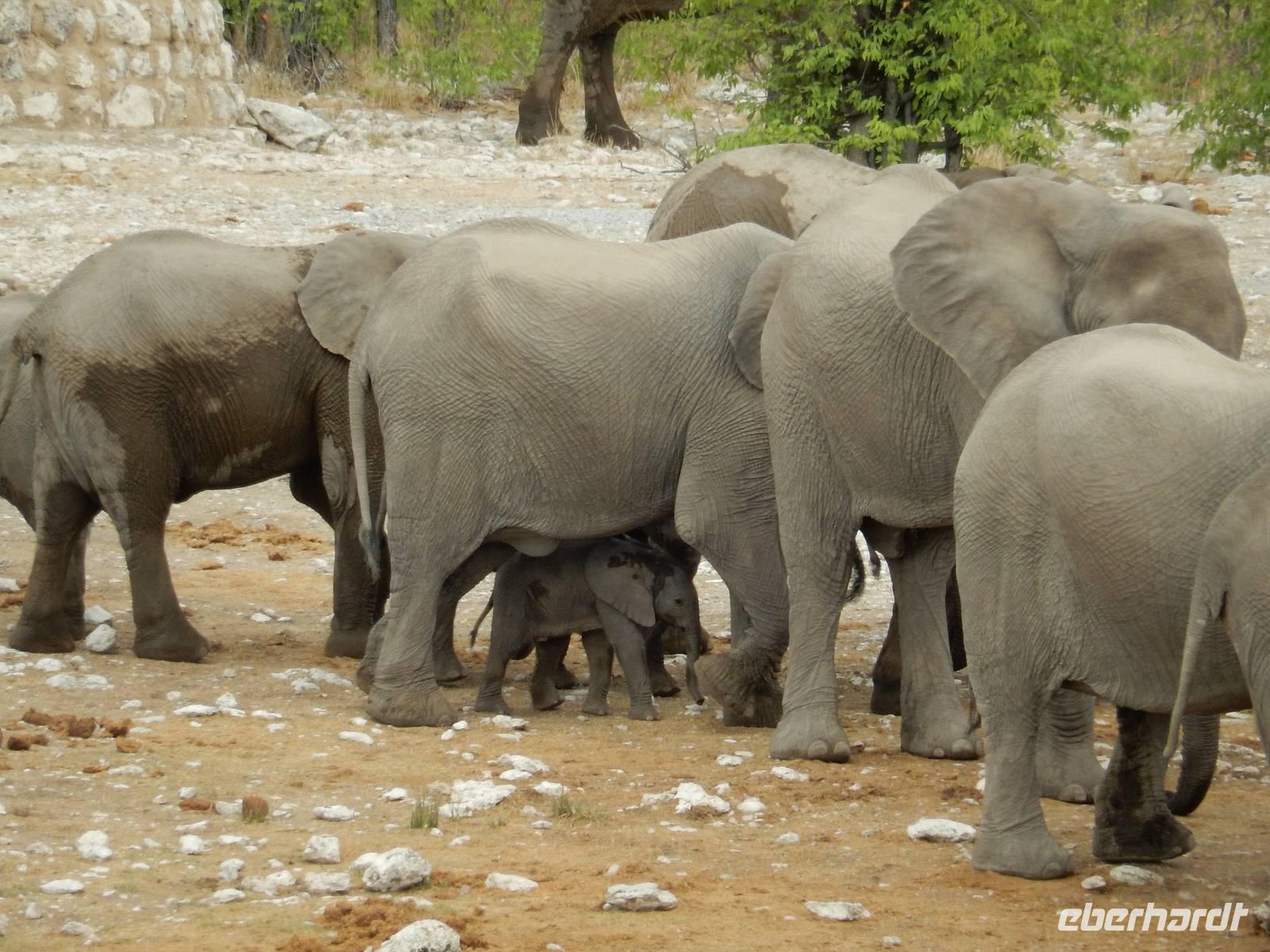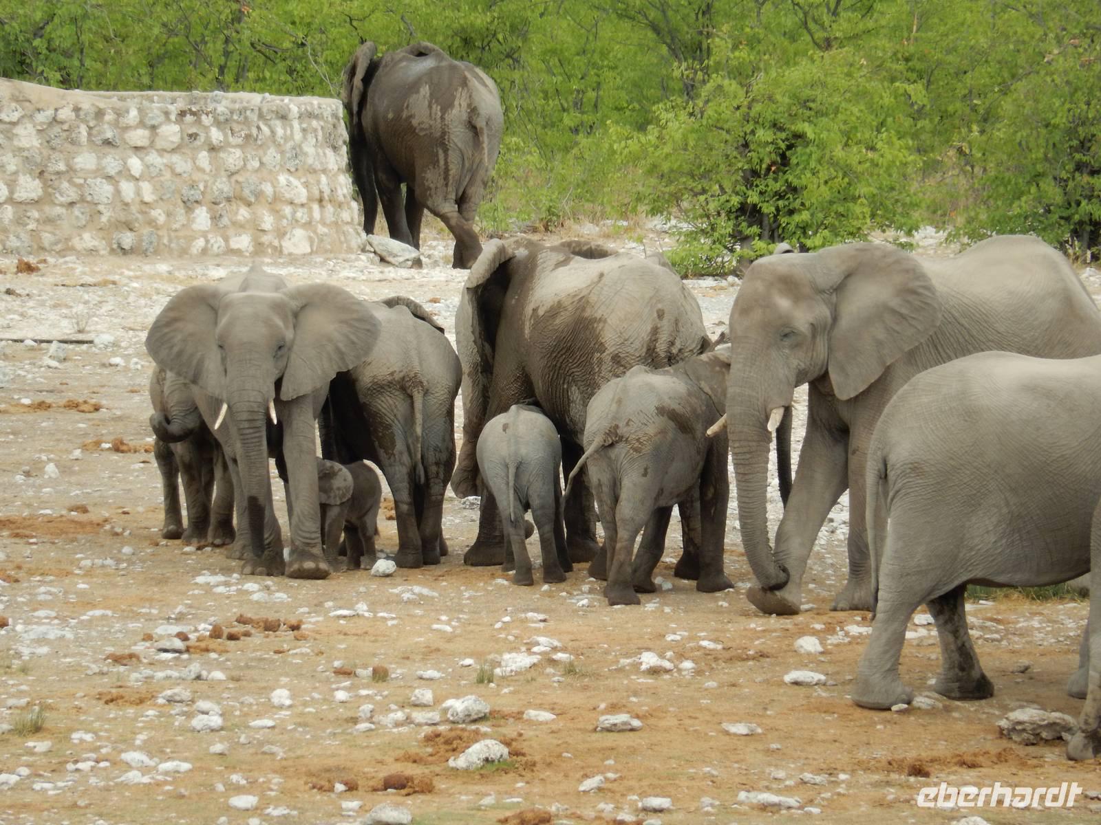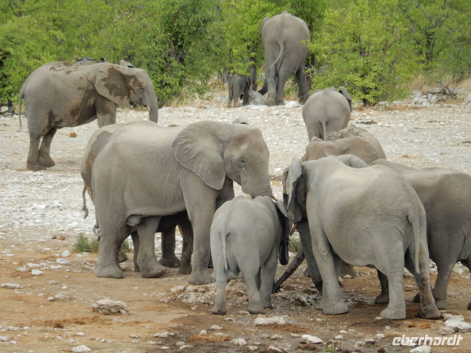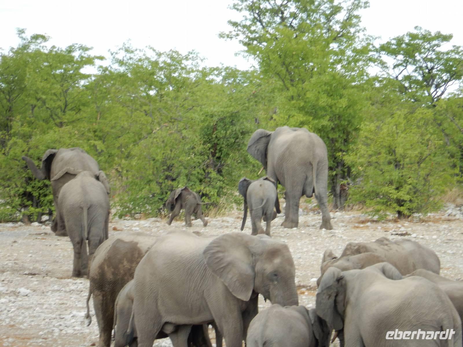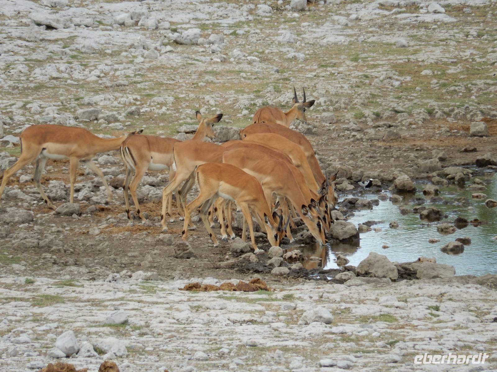 Am Wasserloch Gemsbokvlakte erblickten wir in einem Busch ein Löwenpärchen, die gerade für Nachwuchs sorgten. Am Wasserloch Olifantsbad war nicht so sehr viel los und so beschlossen wir, noch einen Abstecher zum Wasserloch Aus zu machen. Eine große Gruppe Schwarznasenimpalas zwang uns, einen Stopp auf der Straße einzulegen und dann erreichten wir das Wasserloch. Nichtsahnend näherten wir uns durch das mannshohe Gebüsch der natürlichen Wasserstelle und konnten es nicht glauben! Eine riesengroße Elefantenherde, sogar mit Nachwuchs, versammelte sich hier. Dazu noch Kudus, Oryx-Antilopen, Springböcke und Steppenzebras! Wir waren also zur richtigen Zeit am richtigen Ort! Darauf mussten wir erst einmal einen trinken! Gut gekühlten Amarula hatten wir zufällig dabei
