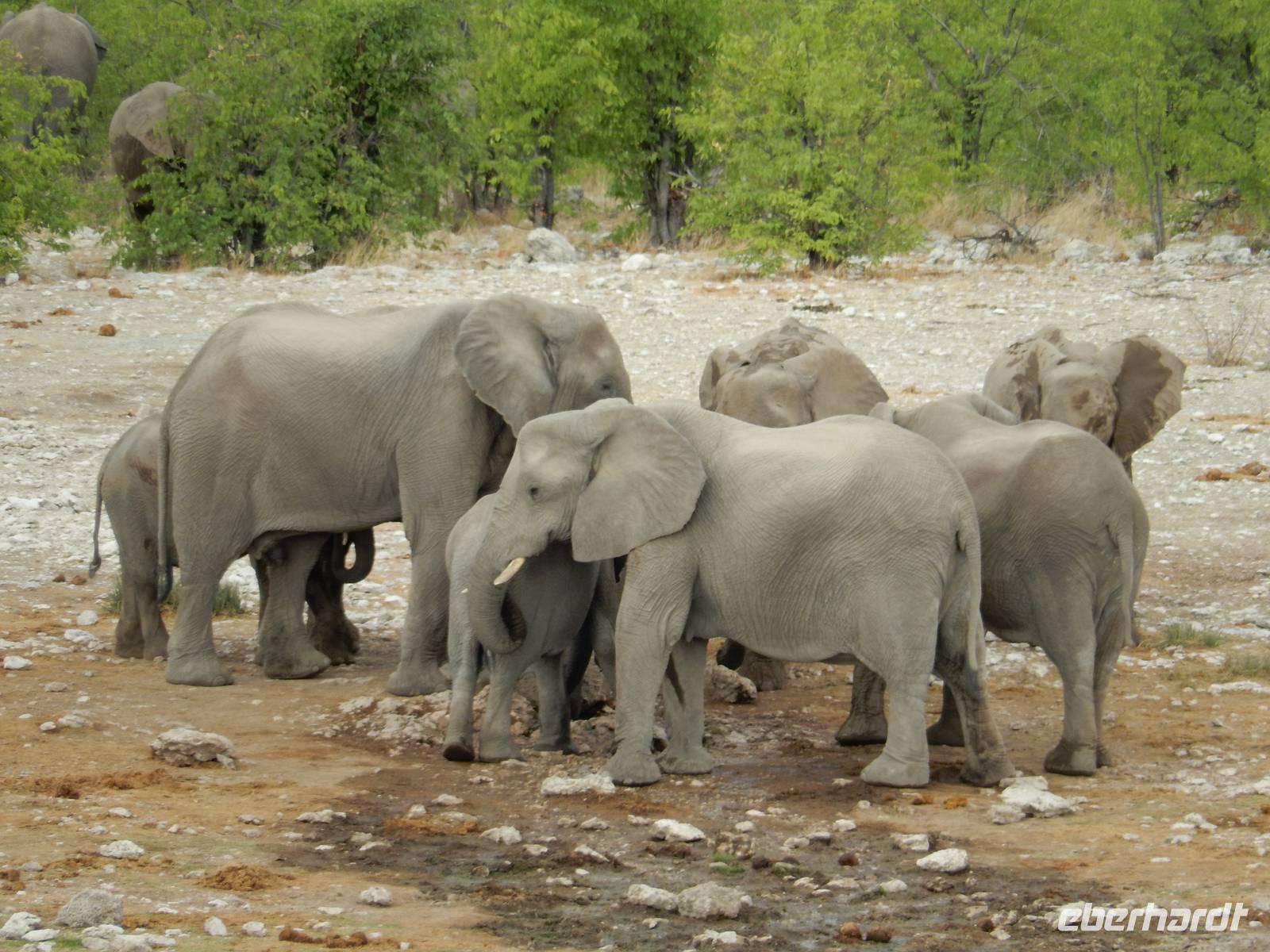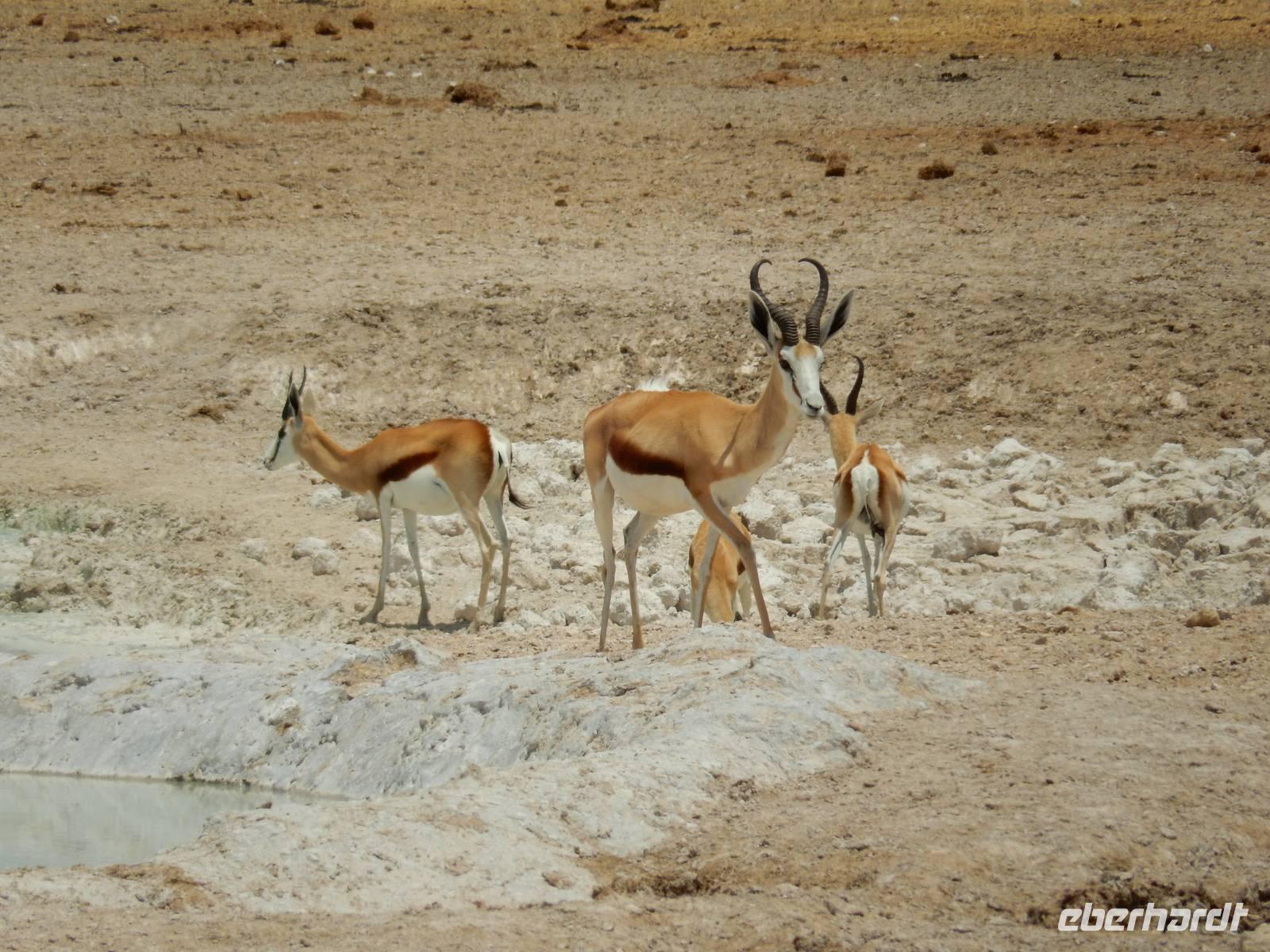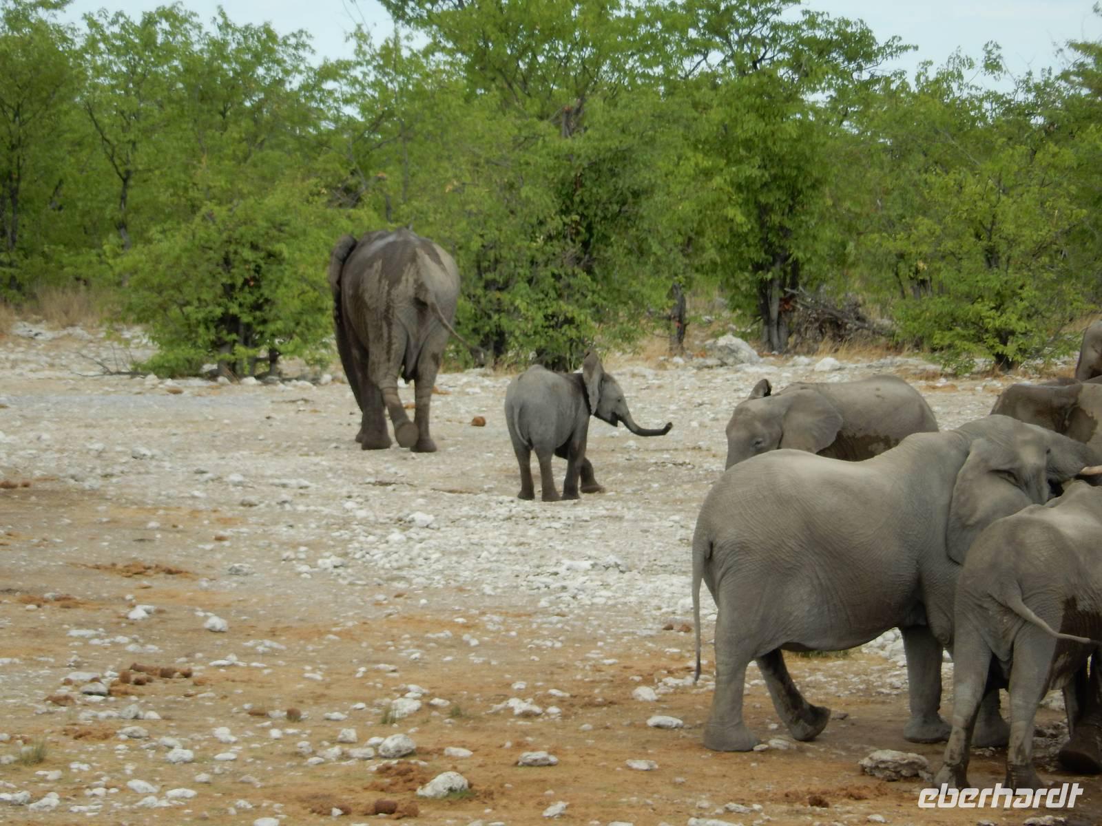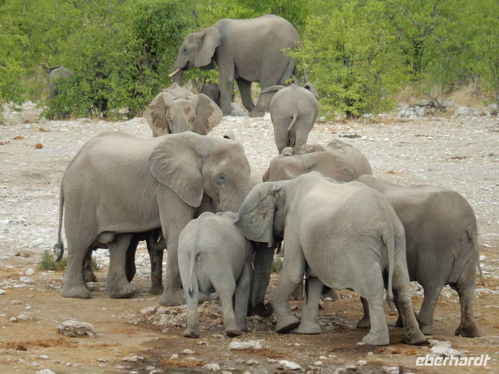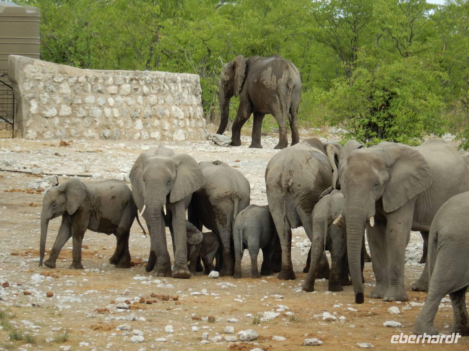 Am Wasserloch Gemsbokvlakte erblickten wir in einem Busch ein Löwenpärchen, die gerade für Nachwuchs sorgten. Am Wasserloch Olifantsbad war nicht so sehr viel los und so beschlossen wir, noch einen Abstecher zum Wasserloch Aus zu machen. Eine große Gruppe Schwarznasenimpalas zwang uns, einen Stopp auf der Straße einzulegen und dann erreichten wir das Wasserloch. Nichtsahnend näherten wir uns durch das mannshohe Gebüsch der natürlichen Wasserstelle und konnten es nicht glauben! Eine riesengroße Elefantenherde, sogar mit Nachwuchs, versammelte sich hier. Dazu noch Kudus, Oryx-Antilopen, Springböcke und Steppenzebras! Wir waren also zur richtigen Zeit am richtigen Ort! Darauf mussten wir erst einmal einen trinken! Gut gekühlten Amarula hatten wir zufällig dabei