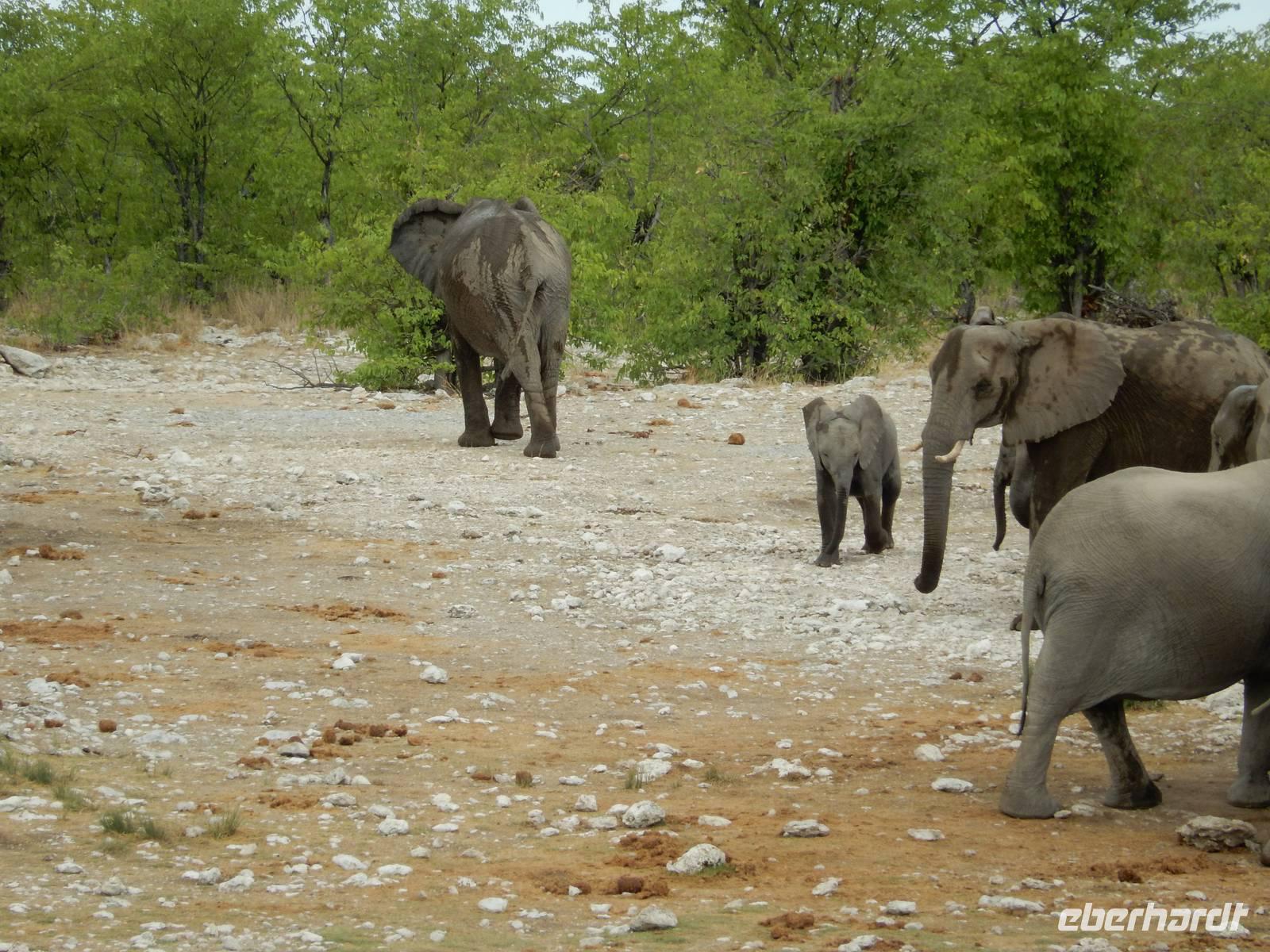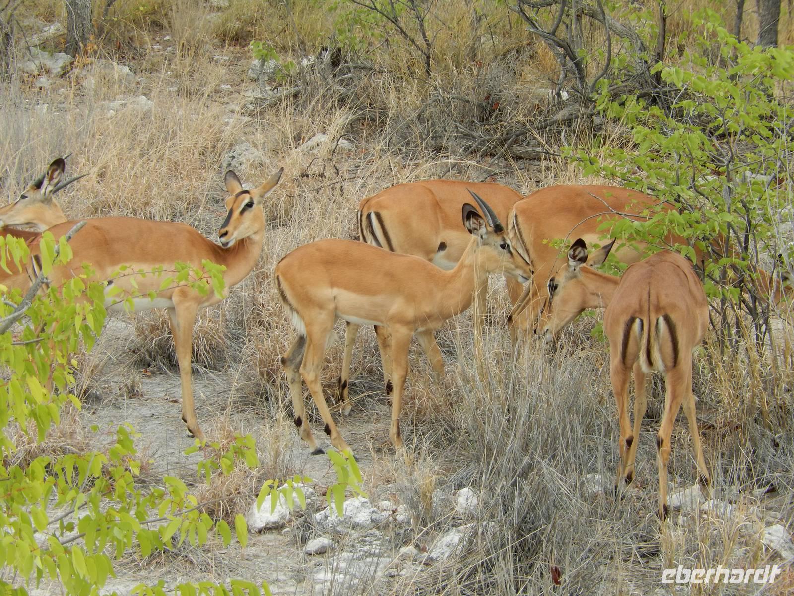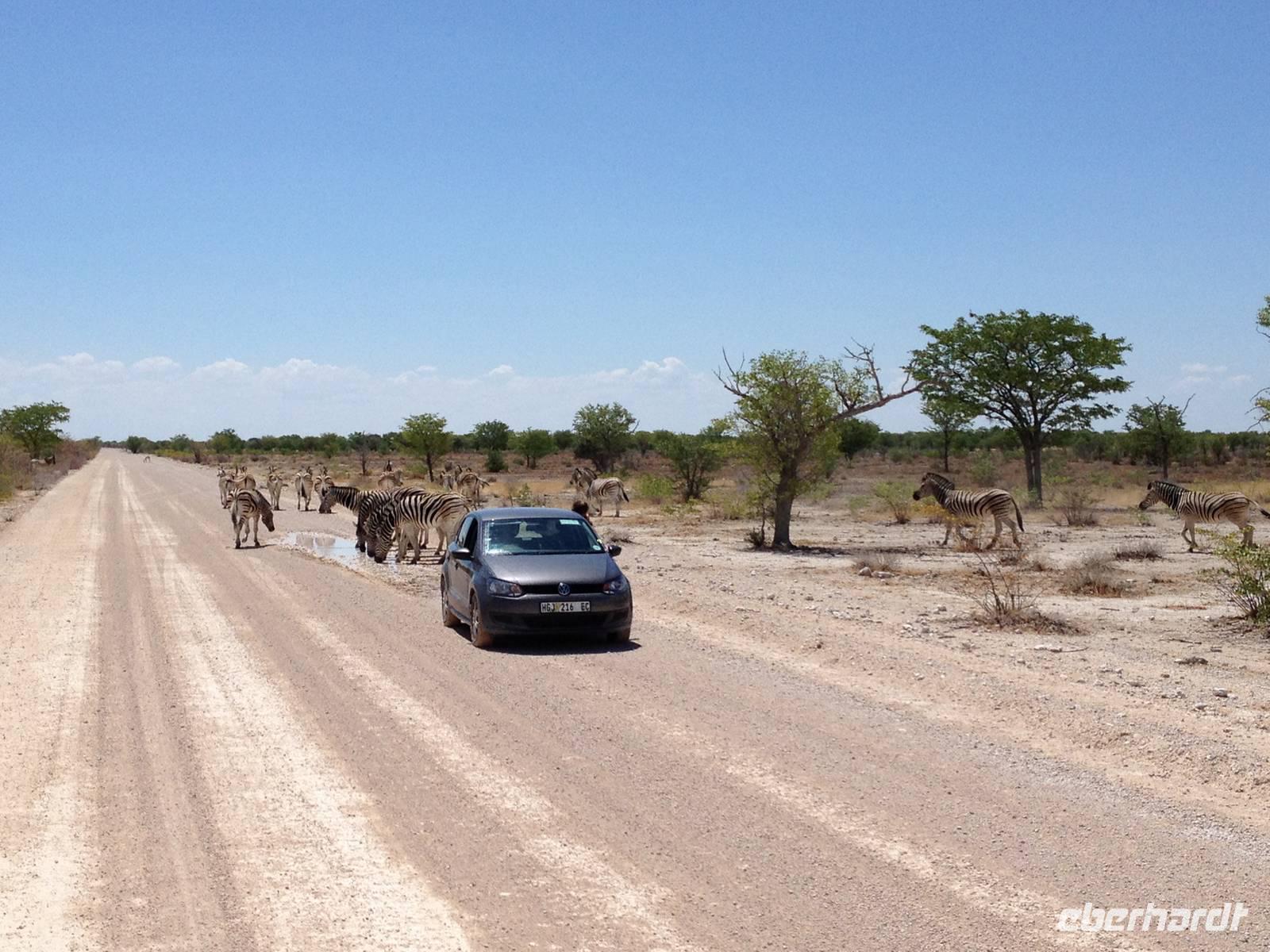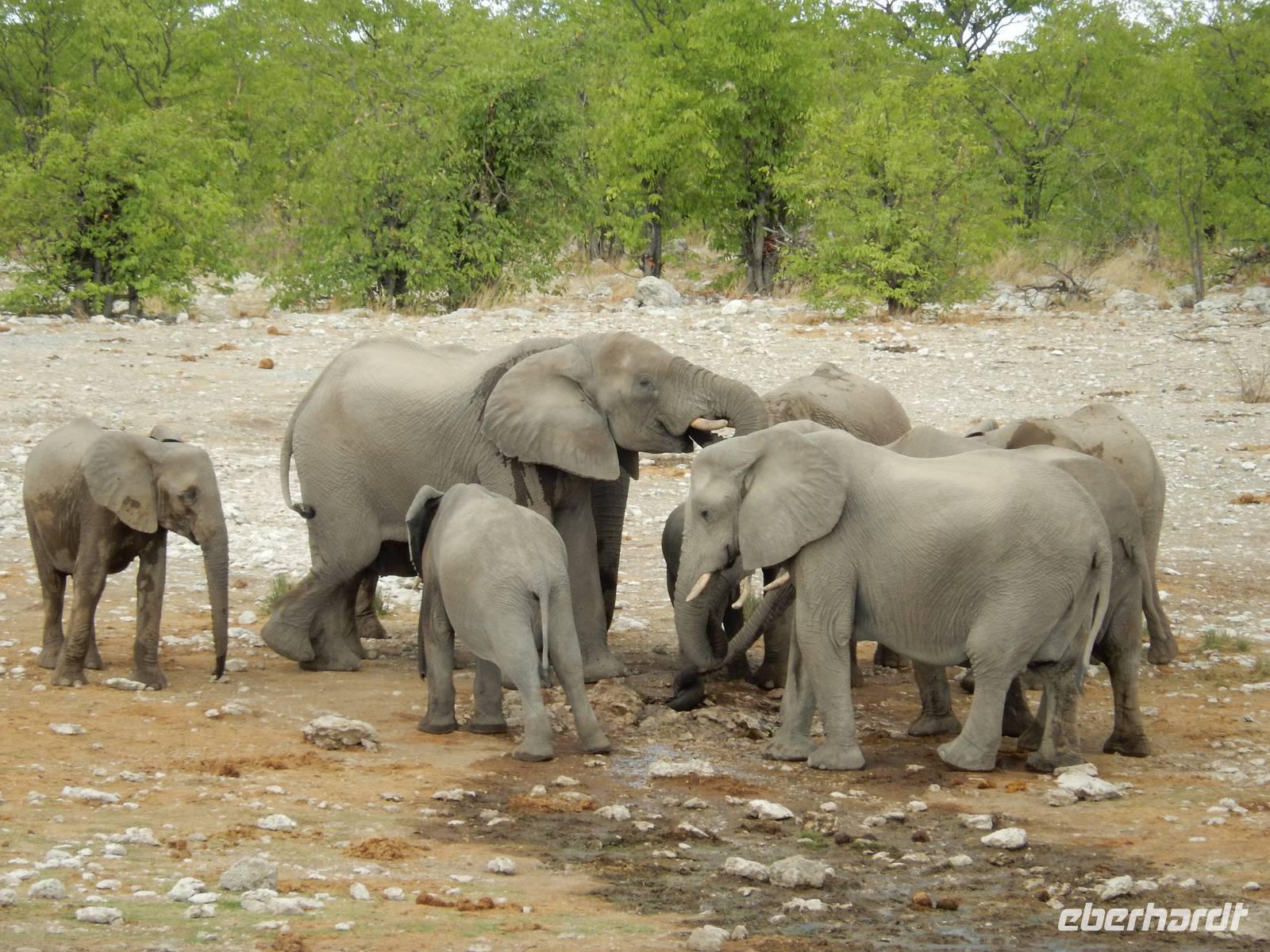 Am Wasserloch Gemsbokvlakte erblickten wir in einem Busch ein Löwenpärchen, die gerade für Nachwuchs sorgten. Am Wasserloch Olifantsbad war nicht so sehr viel los und so beschlossen wir, noch einen Abstecher zum Wasserloch Aus zu machen. Eine große Gruppe Schwarznasenimpalas zwang uns, einen Stopp auf der Straße einzulegen und dann erreichten wir das Wasserloch. Nichtsahnend näherten wir uns durch das mannshohe Gebüsch der natürlichen Wasserstelle und konnten es nicht glauben! Eine riesengroße Elefantenherde, sogar mit Nachwuchs, versammelte sich hier. Dazu noch Kudus, Oryx-Antilopen, Springböcke und Steppenzebras! Wir waren also zur richtigen Zeit am richtigen Ort! Darauf mussten wir erst einmal einen trinken! Gut gekühlten Amarula hatten wir zufällig dabei