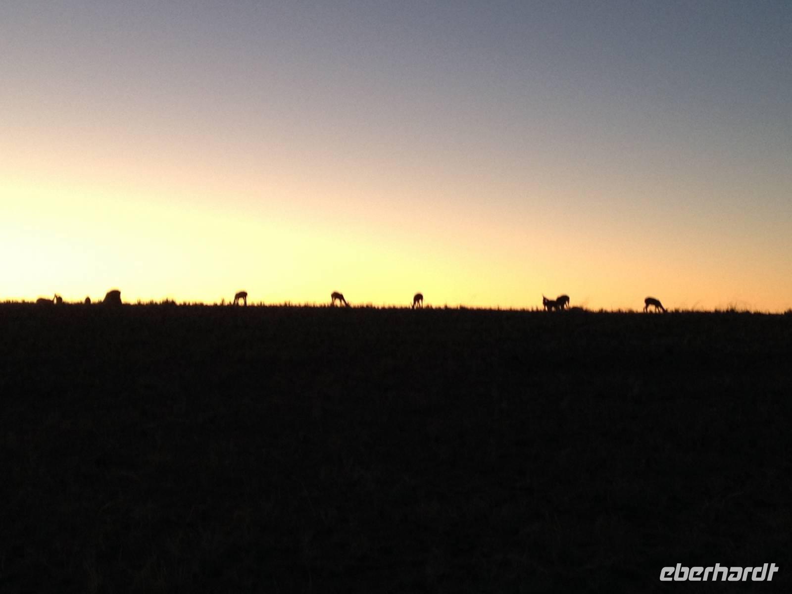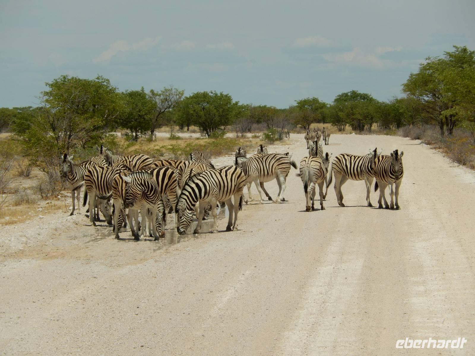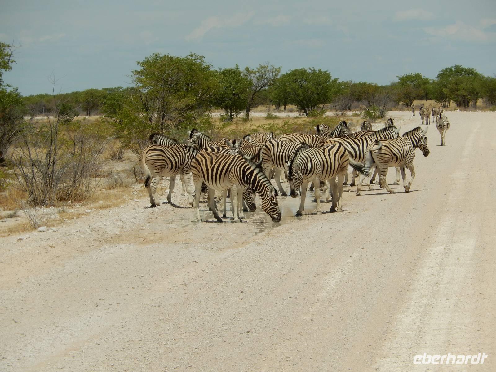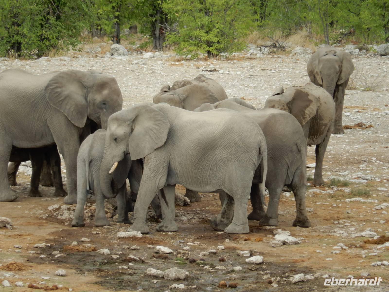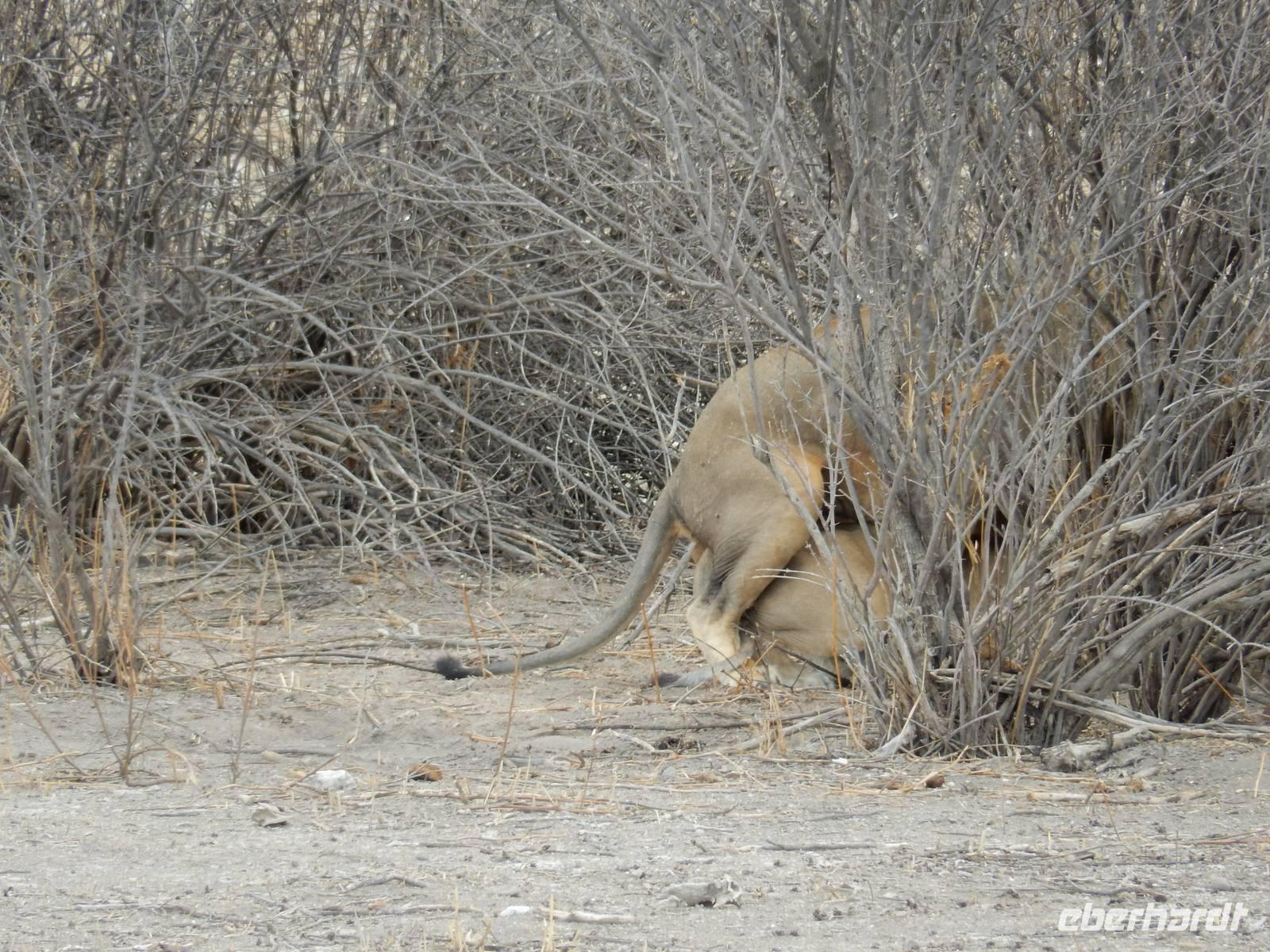 Am Wasserloch Gemsbokvlakte erblickten wir in einem Busch ein Löwenpärchen, die gerade für Nachwuchs sorgten. Am Wasserloch Olifantsbad war nicht so sehr viel los und so beschlossen wir, noch einen Abstecher zum Wasserloch Aus zu machen. Eine große Gruppe Schwarznasenimpalas zwang uns, einen Stopp auf der Straße einzulegen und dann erreichten wir das Wasserloch. Nichtsahnend näherten wir uns durch das mannshohe Gebüsch der natürlichen Wasserstelle und konnten es nicht glauben! Eine riesengroße Elefantenherde, sogar mit Nachwuchs, versammelte sich hier. Dazu noch Kudus, Oryx-Antilopen, Springböcke und Steppenzebras! Wir waren also zur richtigen Zeit am richtigen Ort! Darauf mussten wir erst einmal einen trinken! Gut gekühlten Amarula hatten wir zufällig dabei