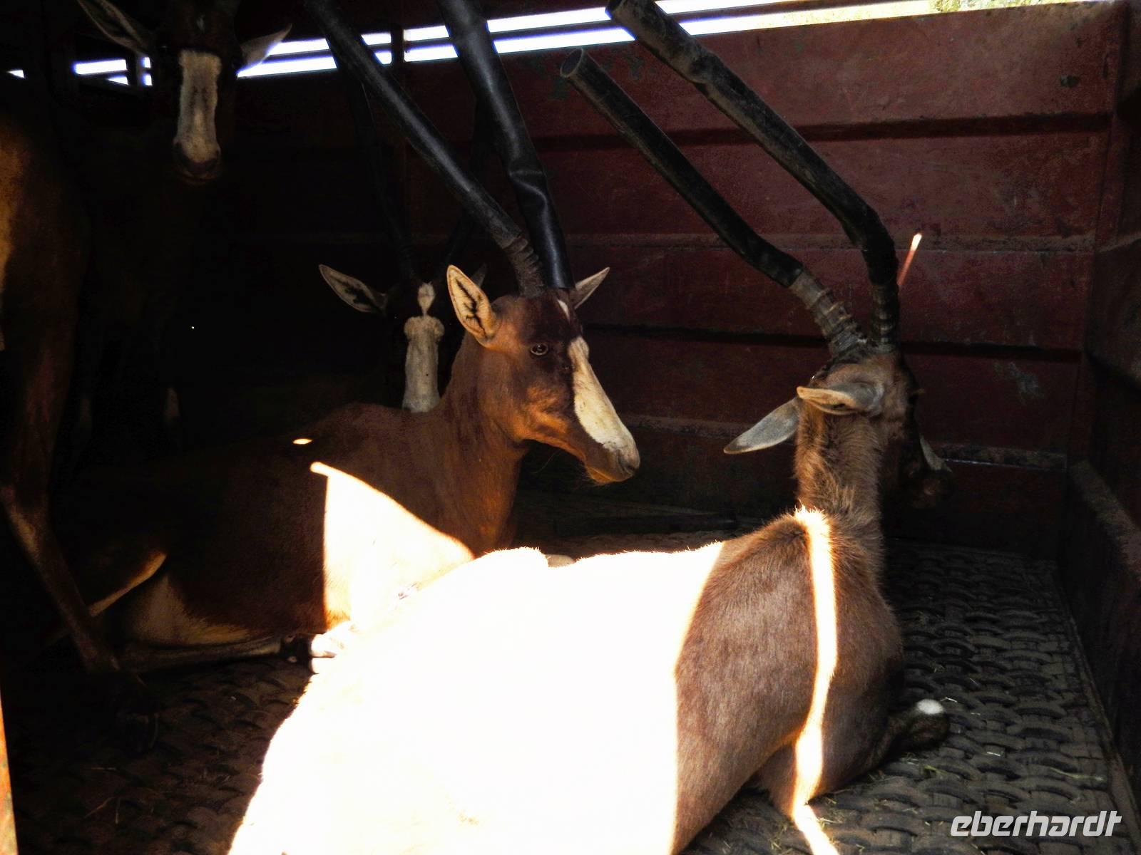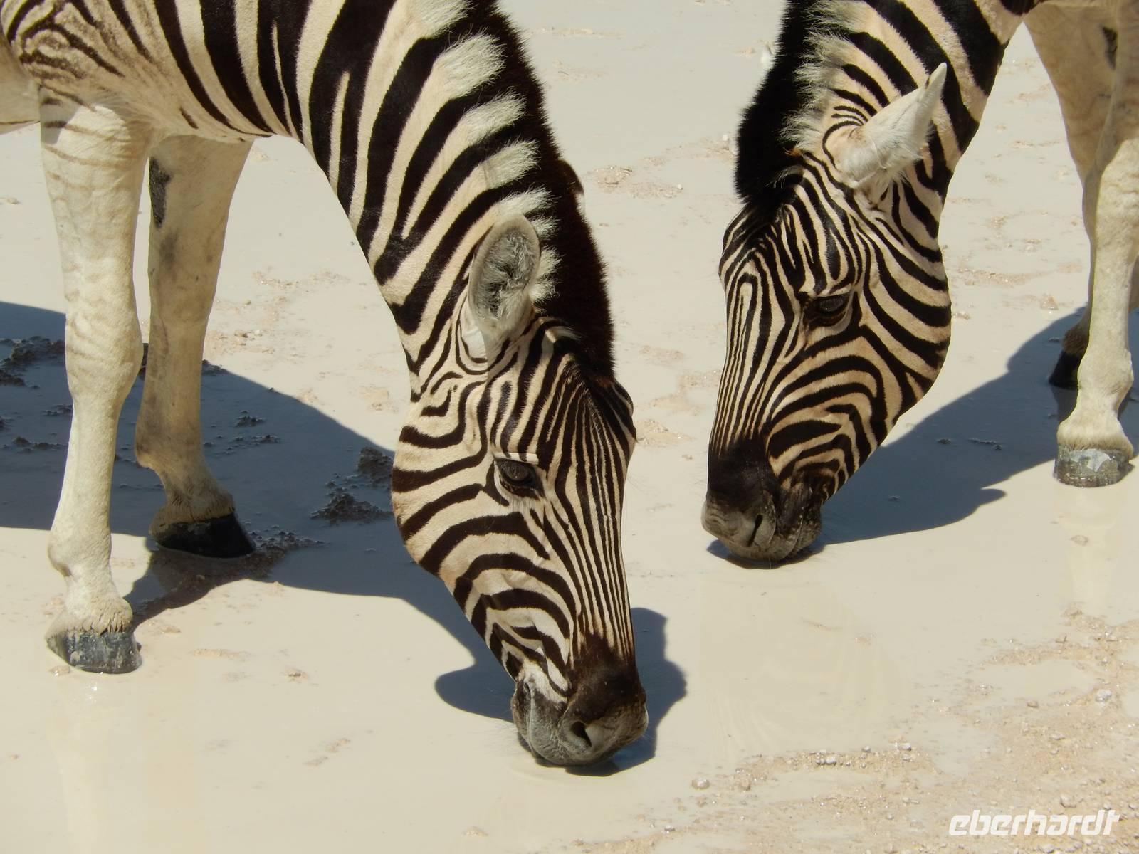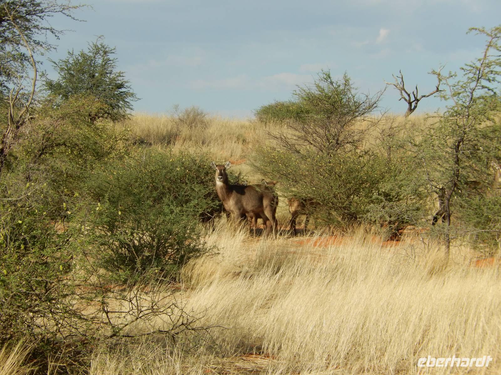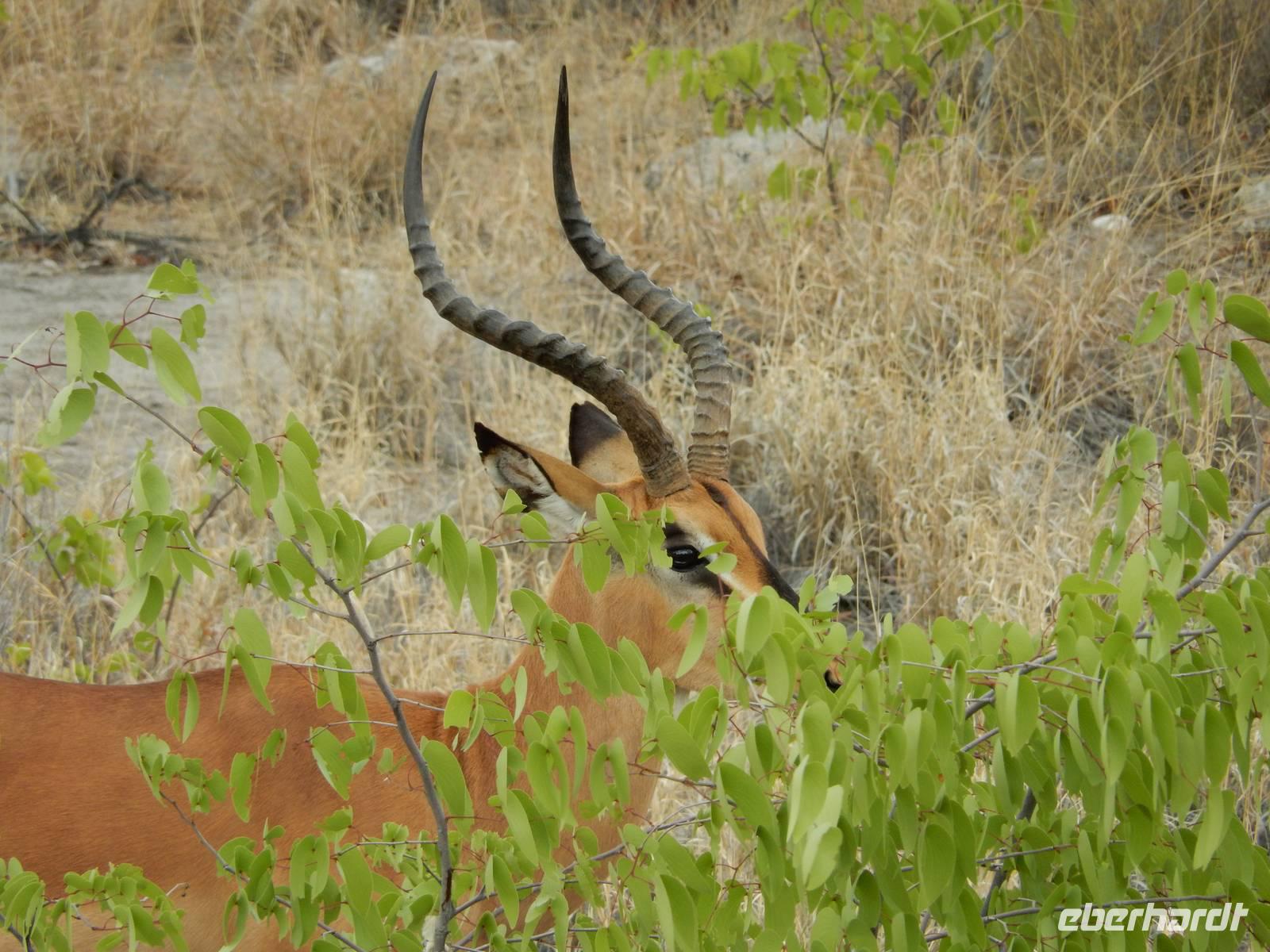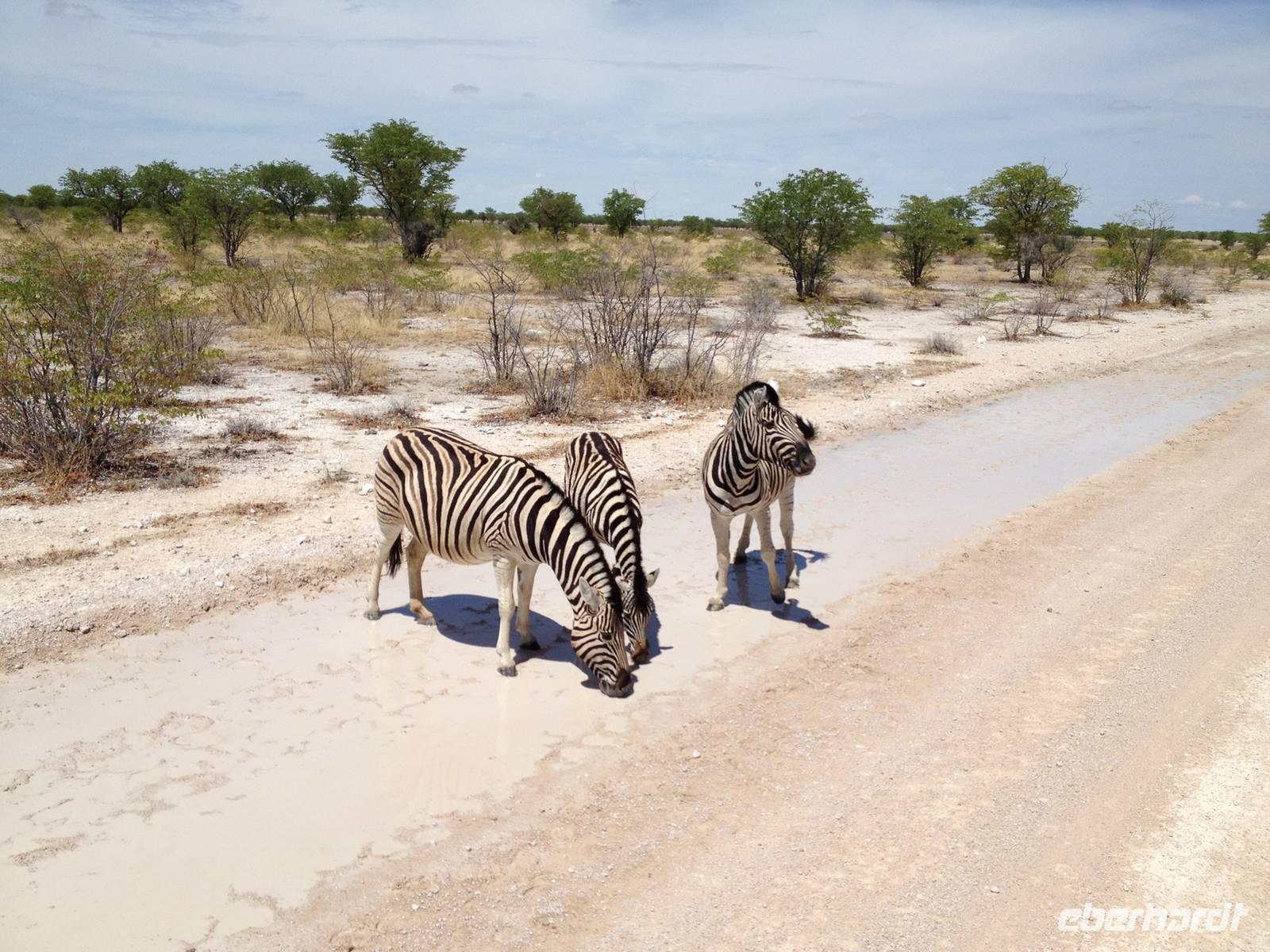 Am Wasserloch Gemsbokvlakte erblickten wir in einem Busch ein Löwenpärchen, die gerade für Nachwuchs sorgten. Am Wasserloch Olifantsbad war nicht so sehr viel los und so beschlossen wir, noch einen Abstecher zum Wasserloch Aus zu machen. Eine große Gruppe Schwarznasenimpalas zwang uns, einen Stopp auf der Straße einzulegen und dann erreichten wir das Wasserloch. Nichtsahnend näherten wir uns durch das mannshohe Gebüsch der natürlichen Wasserstelle und konnten es nicht glauben! Eine riesengroße Elefantenherde, sogar mit Nachwuchs, versammelte sich hier. Dazu noch Kudus, Oryx-Antilopen, Springböcke und Steppenzebras! Wir waren also zur richtigen Zeit am richtigen Ort! Darauf mussten wir erst einmal einen trinken! Gut gekühlten Amarula hatten wir zufällig dabei