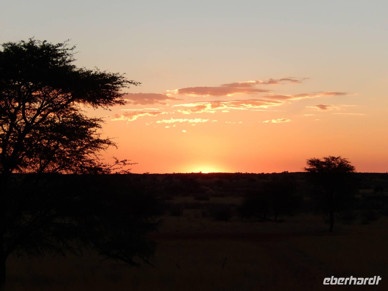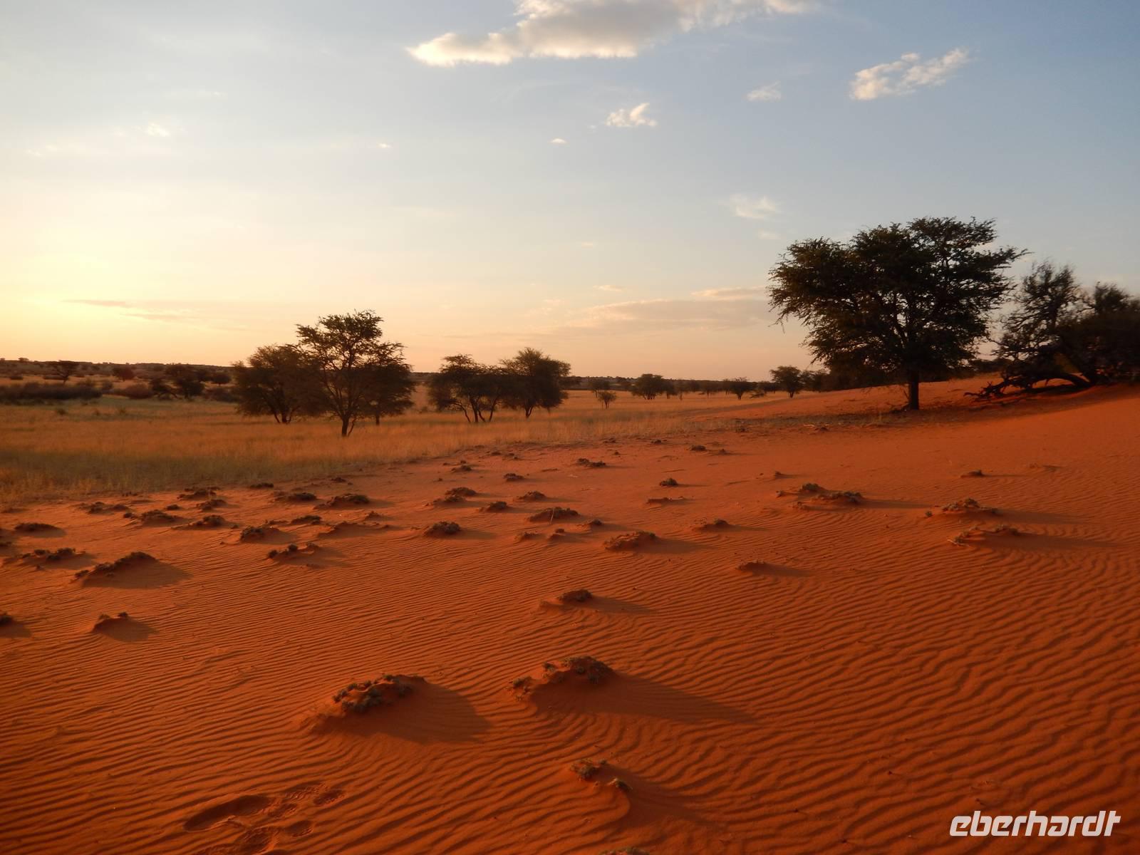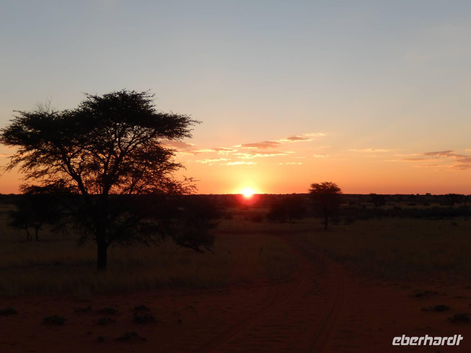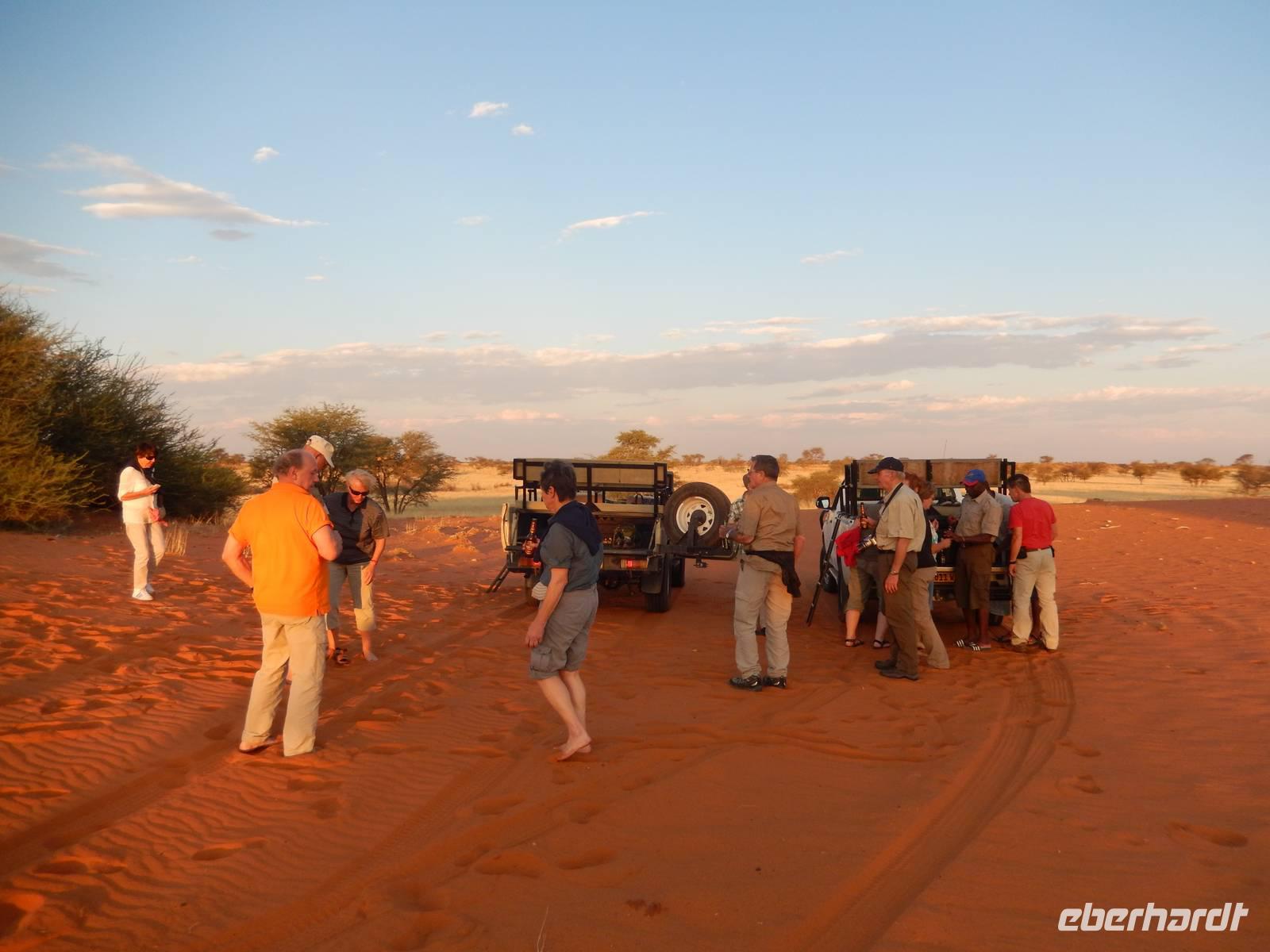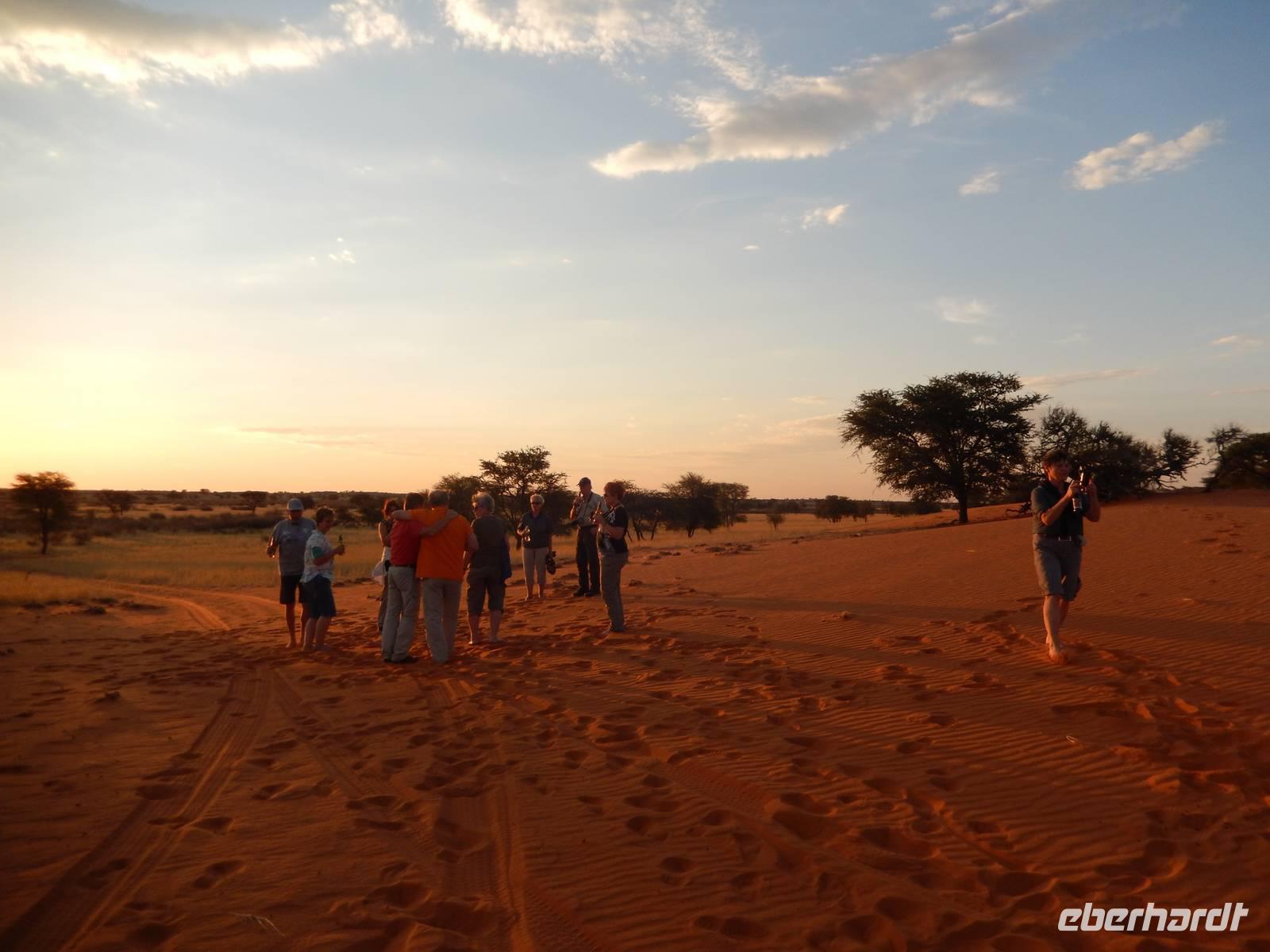 Unsere Reise führte uns heute in Richtung Süden. Auf einer schnurgeraden, gut asphaltierten Straße führte uns der Weg nach Rehoboth, eine knappe Stunde von Windhoek entfernt. Viel zu bieten hat die kleine Ortschaft nicht, deswegen legten wir hier nur einen kleinen Stopp ein. Stark zergliedert schmiegen sich die vielen kleinen Häuser an die sanften Hänge entlang des Trockenflussbettes des Oanob. Rund 15 km südlich der Ortschaft erreichten wir den "Tropic of Capricorn" - den südlichen Wendekreis des Steinbocks. Immer weiter südlich durch eine trockene, ja fast trostlose, aber keineswegs langweilige Landschaft entlang der Kalahari erreichten wir am Mittag eine kleine nette Lodge. Gemütlich genossen wir Springbock, Salat oder Fisch - dazu ein einheimisches Bier oder das namibianische Erfrischungsgetränk "Rock Shandy"! Nach diesem leckeren Mittagessen erreichten wir die kleine Ortschaft Stampried. Hier war dann auch die Asphaltstraße zuende und wir fuhren auf der Schotterpiste immer durch das Tal des ausgetrockneten Flusses Auob die gleichnamige, gemütliche Lodge. Nach einem Erfrischungsgetränk sowie Kaffee und Kuchen in der netten Anlage unternahmen wir alle gemeinsam eine erste Pirschfahrt im offenen Geländewagen auf dem weitläufigen Areal der Lodge. Zu sehen bekamen wir nicht nur eine tolle, abwechslungsreiche Landschaft (wir waren ja jetzt mitten in der Kalahari), sondern auch Springböcke, Antilopen, Wasserböcke, Gnus, Impalas und zu guter Letzt auch eine stattliche Giraffe. Den Sonnenuntergang erlebten wir bei einem kühlen Bier auf einer für die Kalahari typischen, roten Sanddüne.