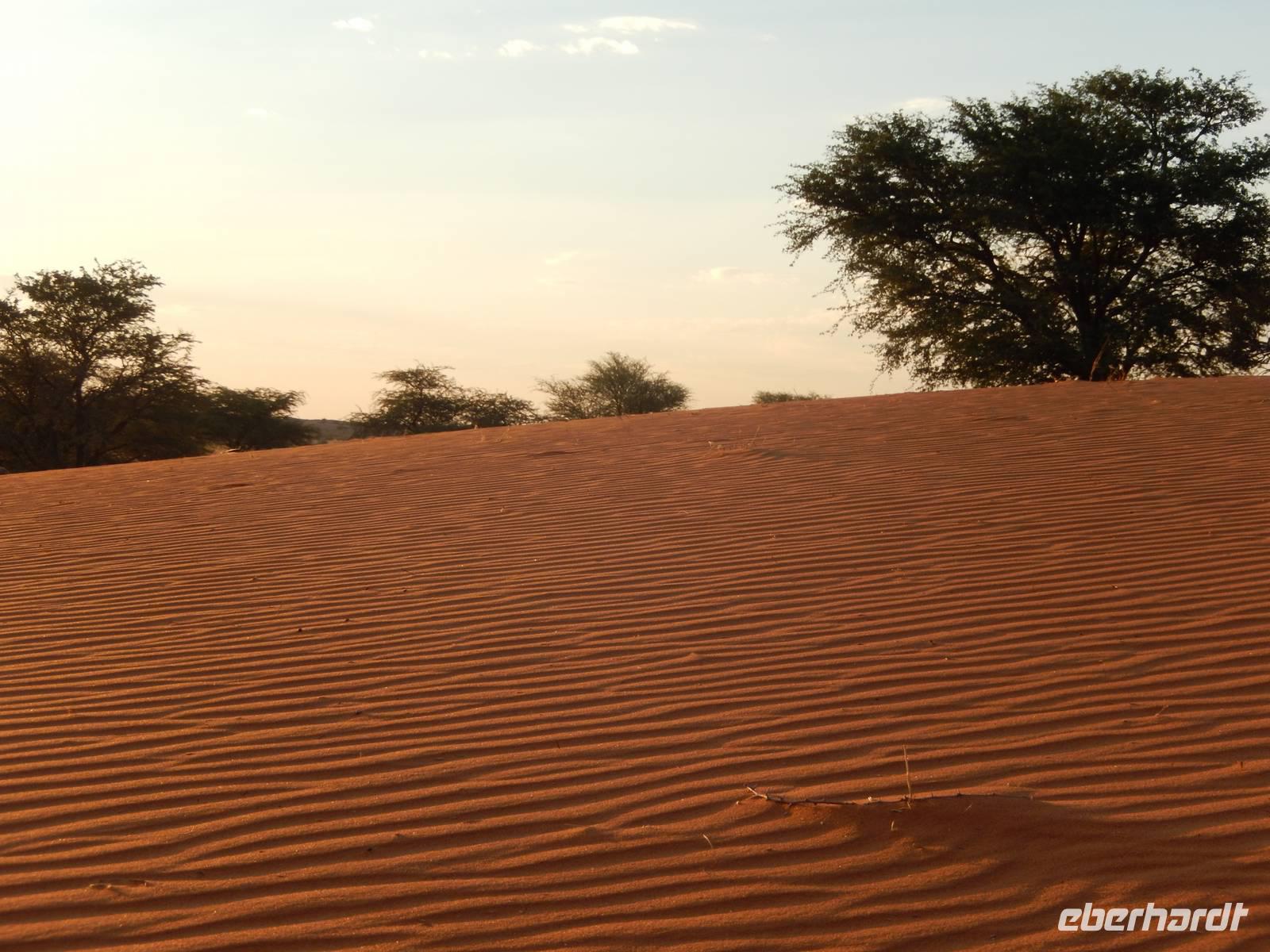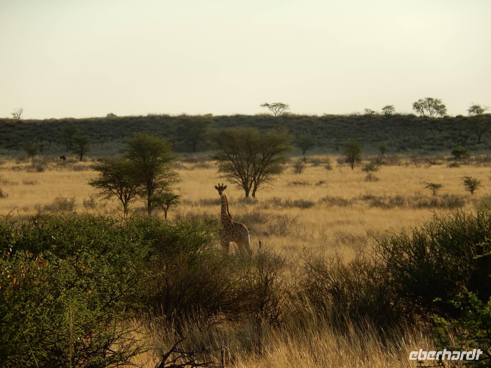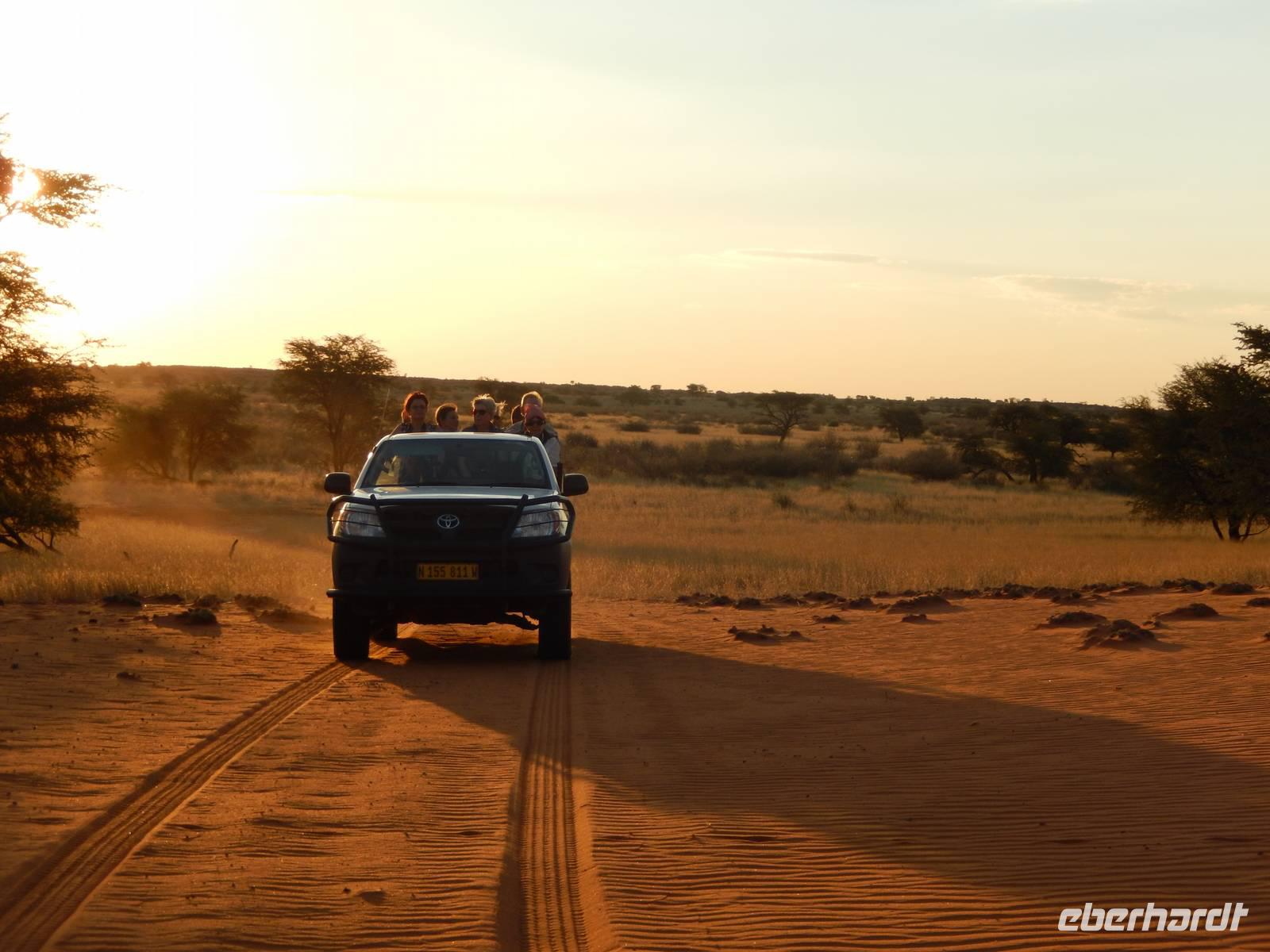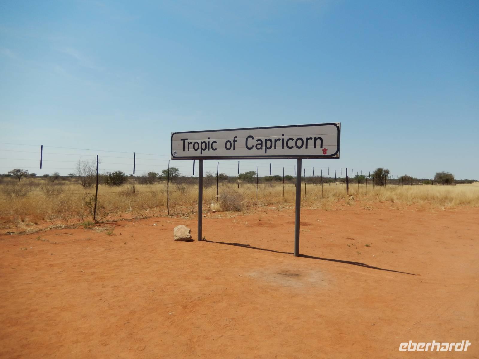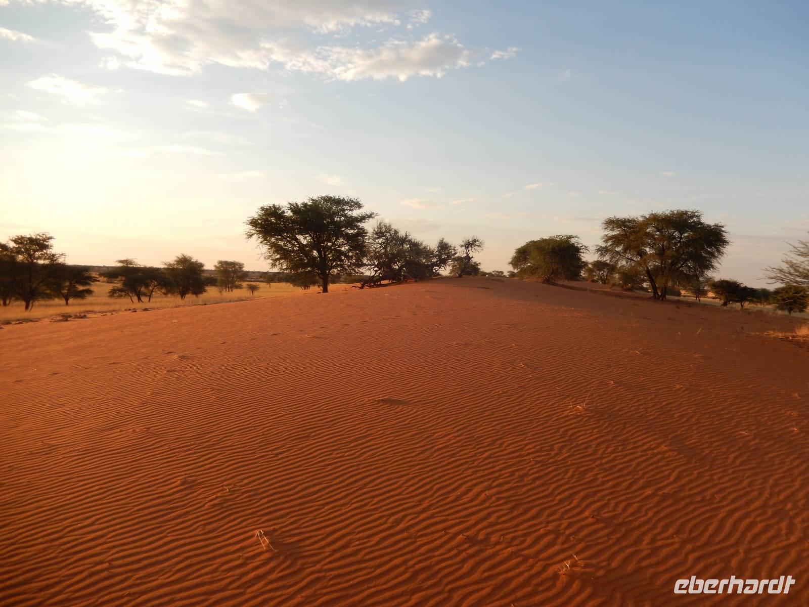 Unsere Reise führte uns heute in Richtung Süden. Auf einer schnurgeraden, gut asphaltierten Straße führte uns der Weg nach Rehoboth, eine knappe Stunde von Windhoek entfernt. Viel zu bieten hat die kleine Ortschaft nicht, deswegen legten wir hier nur einen kleinen Stopp ein. Stark zergliedert schmiegen sich die vielen kleinen Häuser an die sanften Hänge entlang des Trockenflussbettes des Oanob. Rund 15 km südlich der Ortschaft erreichten wir den "Tropic of Capricorn" - den südlichen Wendekreis des Steinbocks. Immer weiter südlich durch eine trockene, ja fast trostlose, aber keineswegs langweilige Landschaft entlang der Kalahari erreichten wir am Mittag eine kleine nette Lodge. Gemütlich genossen wir Springbock, Salat oder Fisch - dazu ein einheimisches Bier oder das namibianische Erfrischungsgetränk "Rock Shandy"! Nach diesem leckeren Mittagessen erreichten wir die kleine Ortschaft Stampried. Hier war dann auch die Asphaltstraße zuende und wir fuhren auf der Schotterpiste immer durch das Tal des ausgetrockneten Flusses Auob die gleichnamige, gemütliche Lodge. Nach einem Erfrischungsgetränk sowie Kaffee und Kuchen in der netten Anlage unternahmen wir alle gemeinsam eine erste Pirschfahrt im offenen Geländewagen auf dem weitläufigen Areal der Lodge. Zu sehen bekamen wir nicht nur eine tolle, abwechslungsreiche Landschaft (wir waren ja jetzt mitten in der Kalahari), sondern auch Springböcke, Antilopen, Wasserböcke, Gnus, Impalas und zu guter Letzt auch eine stattliche Giraffe. Den Sonnenuntergang erlebten wir bei einem kühlen Bier auf einer für die Kalahari typischen, roten Sanddüne.