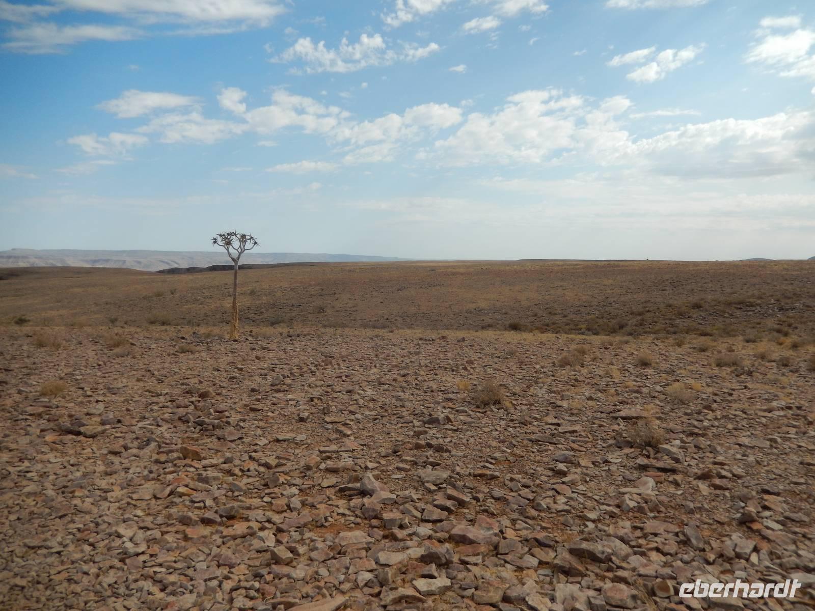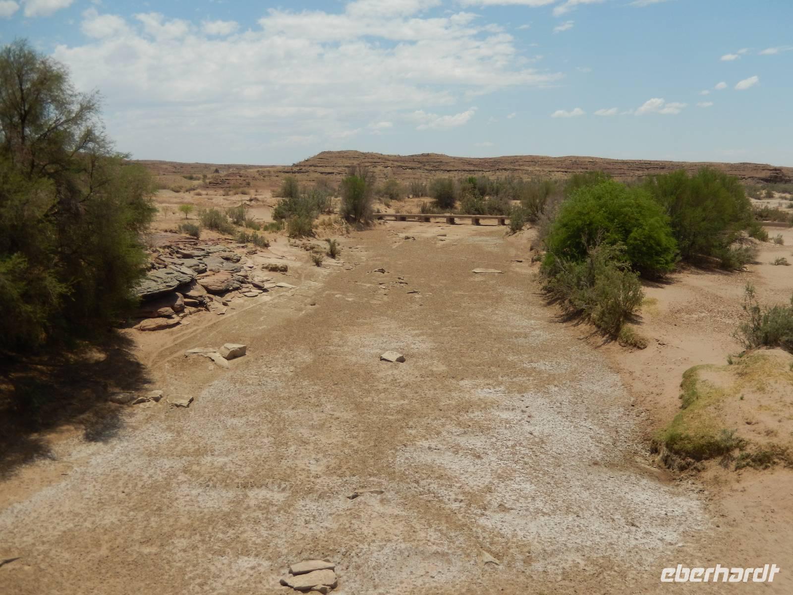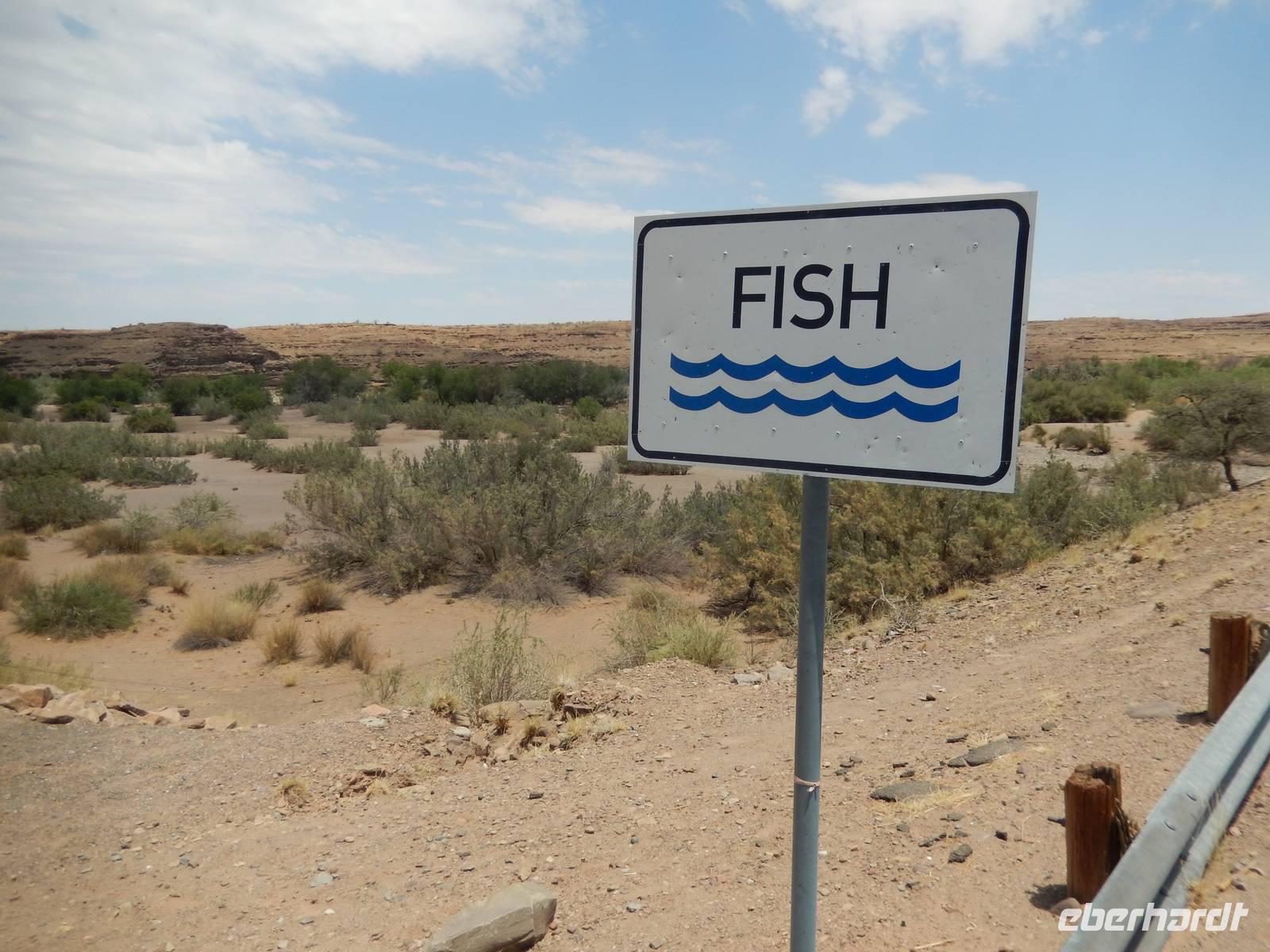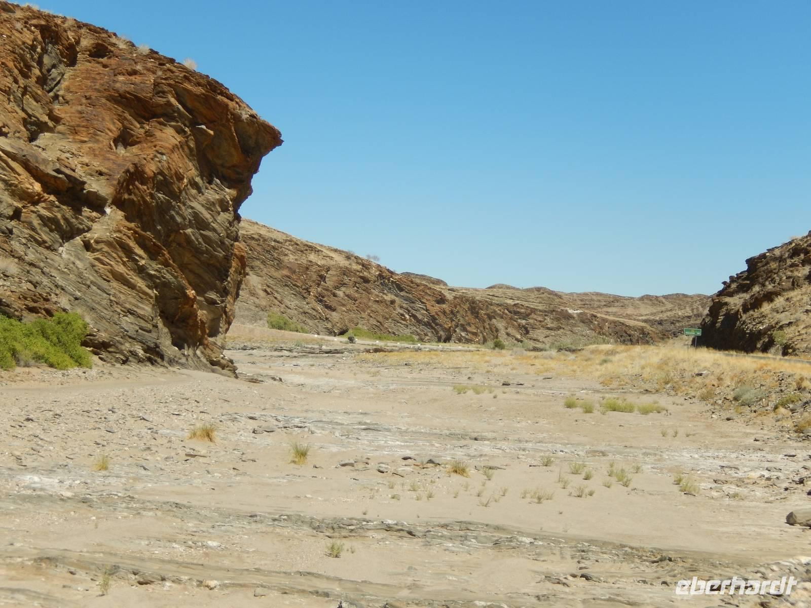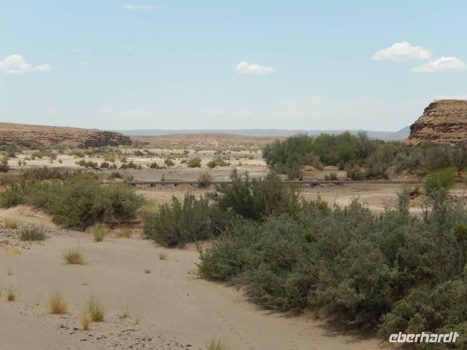 Wieder auf der Straße in Richtung Westen angekommen, überquerten wir den Fischfluss, der dem zuvor besuchten Canyon seinen Namen gab. Mit seiner Länge von 650 Kilometern ist er der längste Fluss Namibias und mündet in den Oranje, den Grenzfluss zu Südafrika. Da er aber nur periodisch Wasser führt, war er derzeit ausgetrocknet.