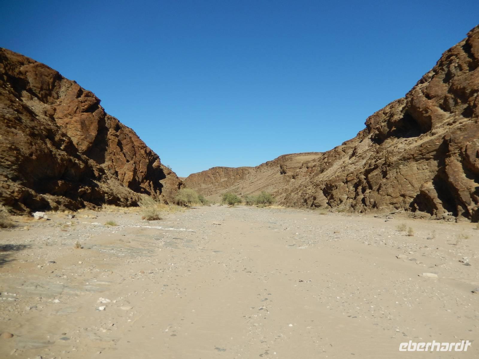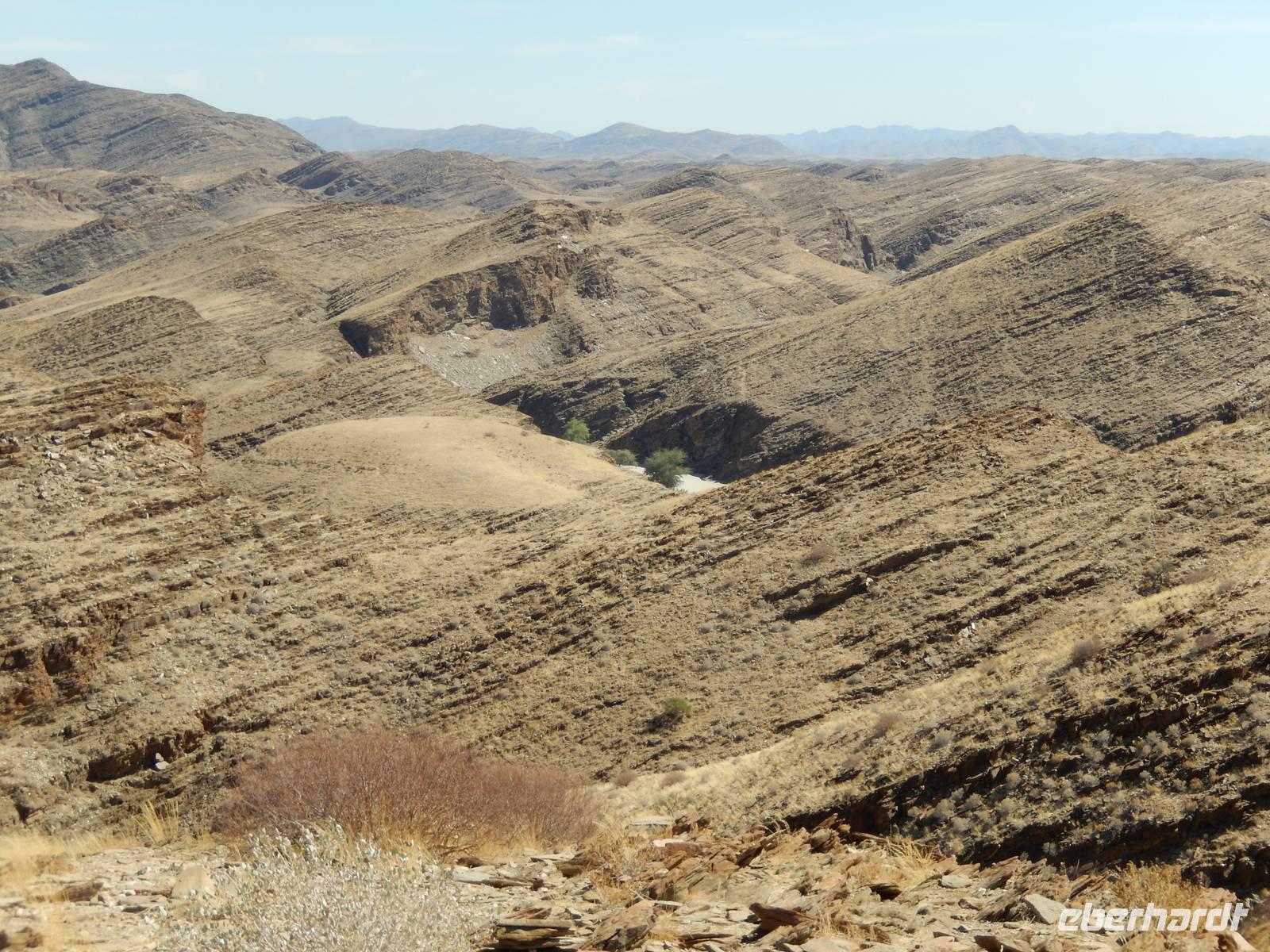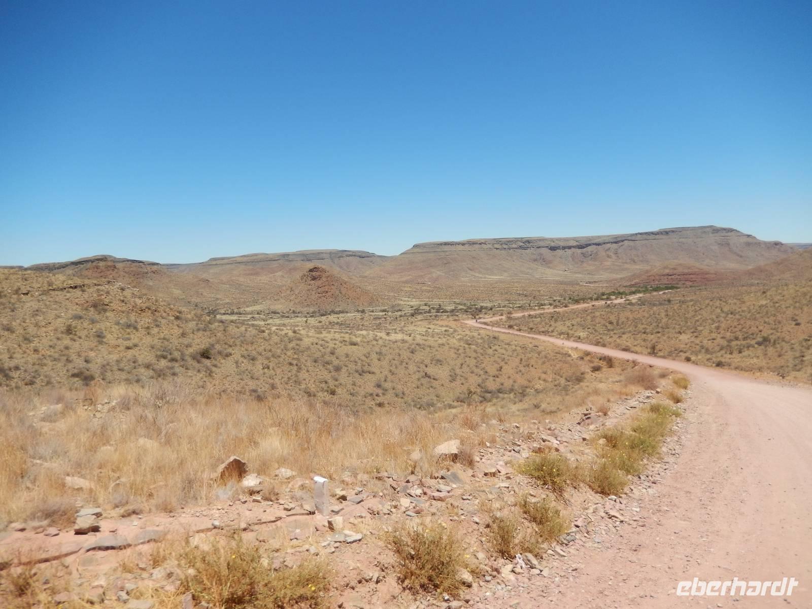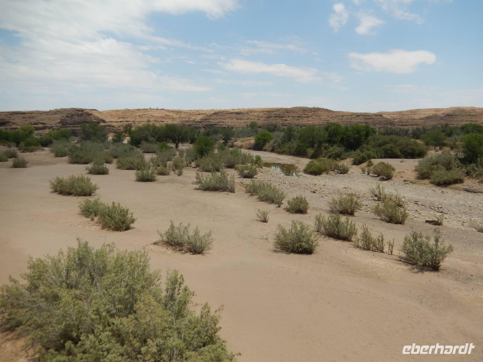 Wieder auf der Straße in Richtung Westen angekommen, überquerten wir den Fischfluss, der dem zuvor besuchten Canyon seinen Namen gab. Mit seiner Länge von 650 Kilometern ist er der längste Fluss Namibias und mündet in den Oranje, den Grenzfluss zu Südafrika. Da er aber nur periodisch Wasser führt, war er derzeit ausgetrocknet.
