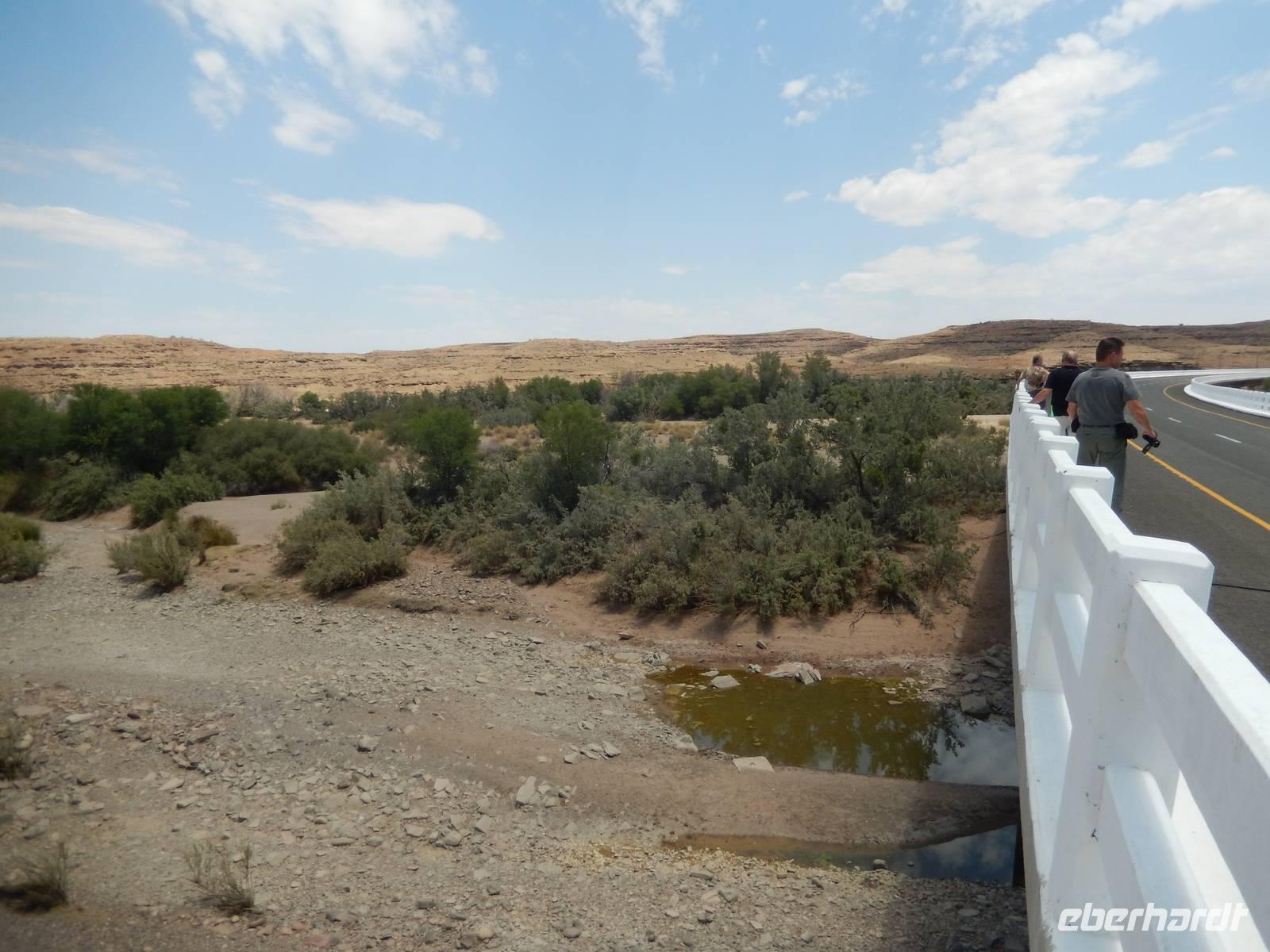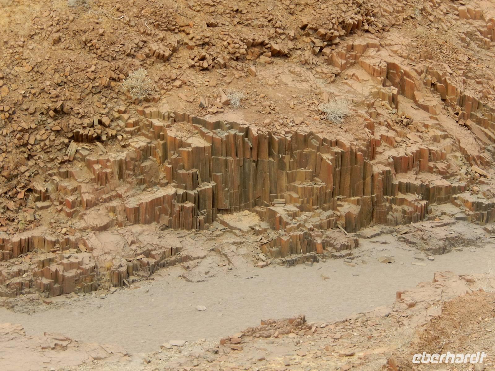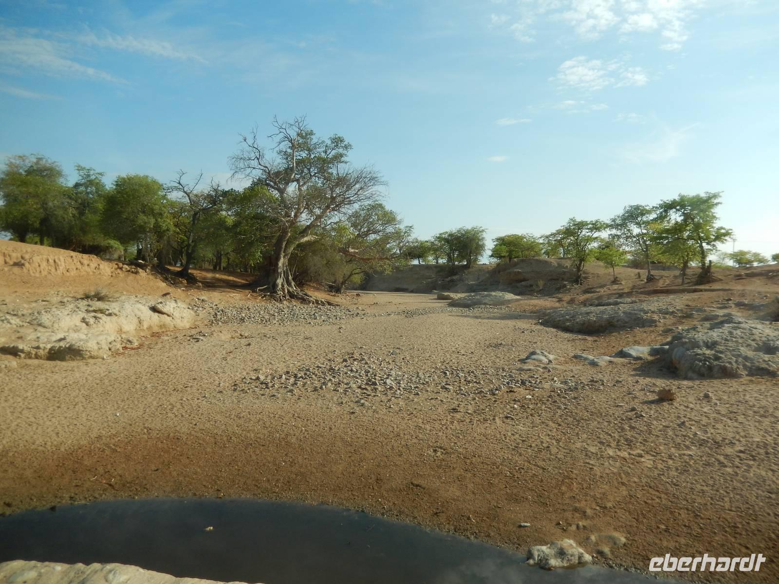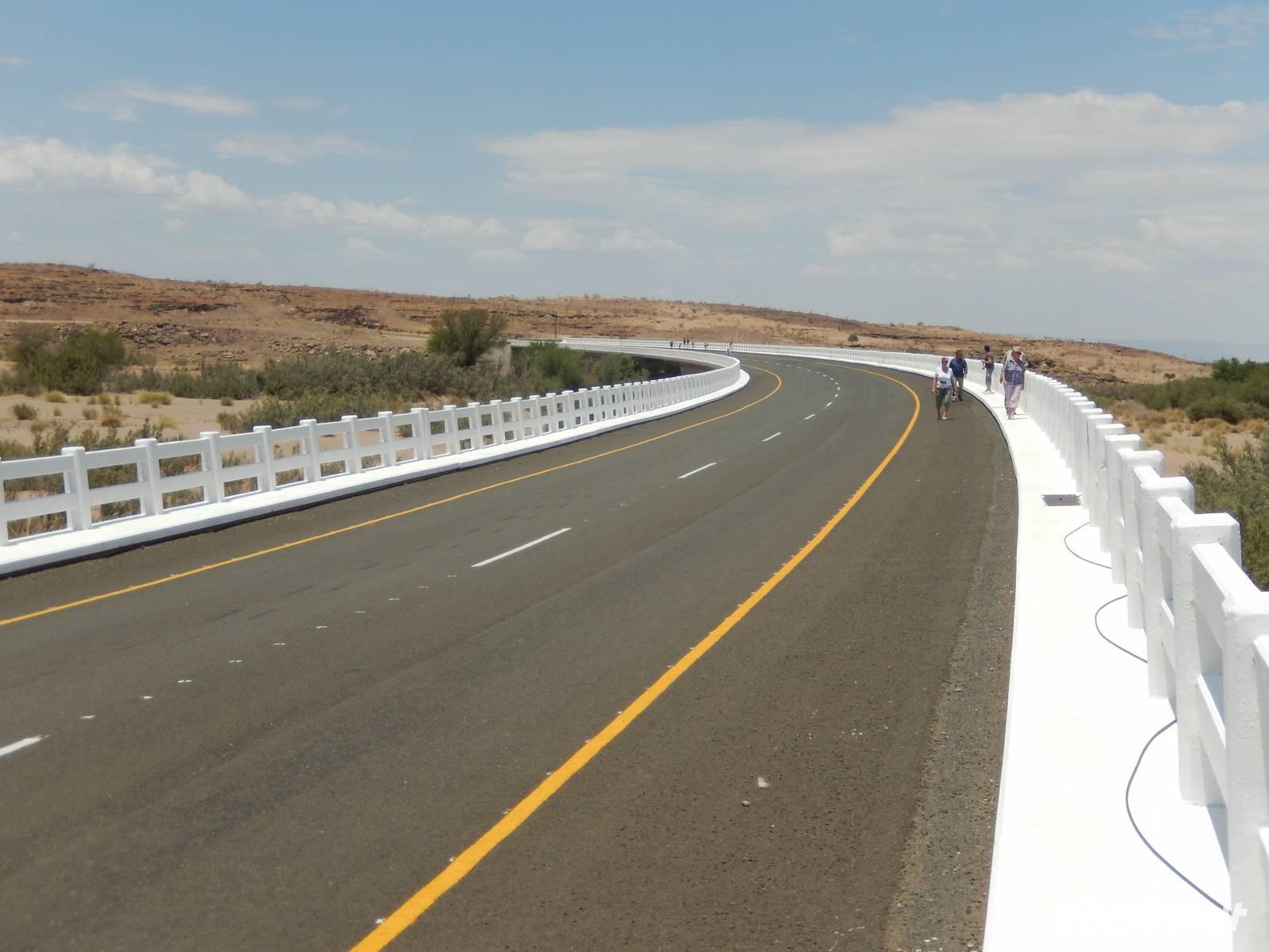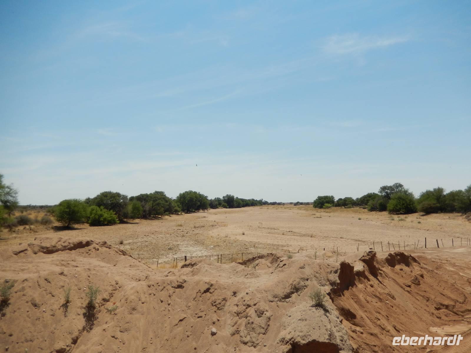 Wieder auf der Straße in Richtung Westen angekommen, überquerten wir den Fischfluss, der dem zuvor besuchten Canyon seinen Namen gab. Mit seiner Länge von 650 Kilometern ist er der längste Fluss Namibias und mündet in den Oranje, den Grenzfluss zu Südafrika. Da er aber nur periodisch Wasser führt, war er derzeit ausgetrocknet.
