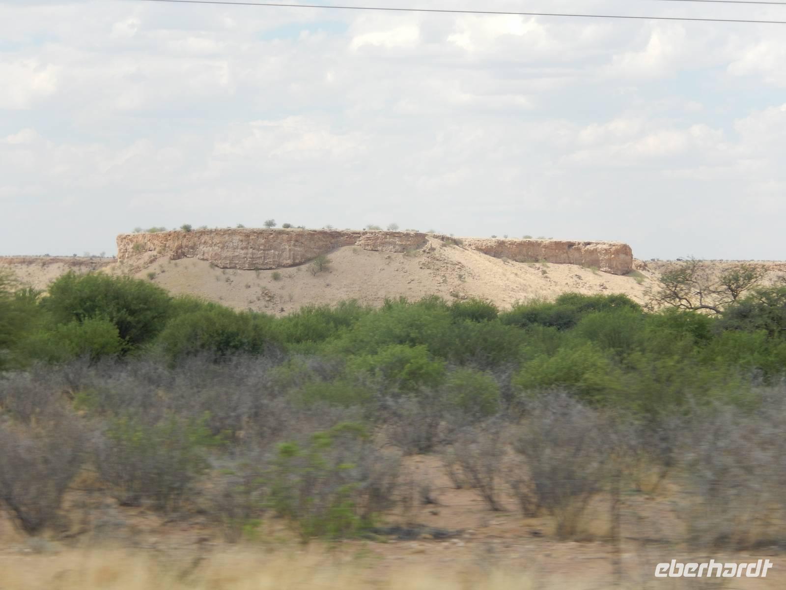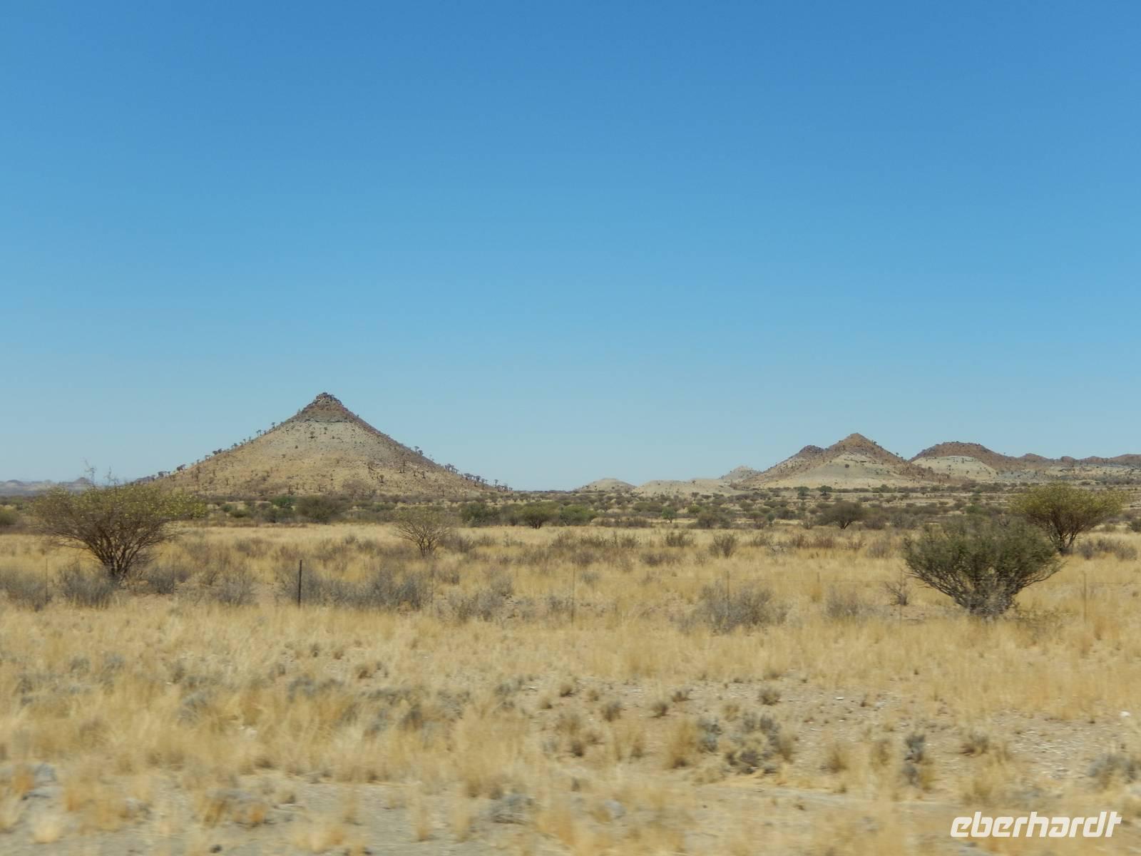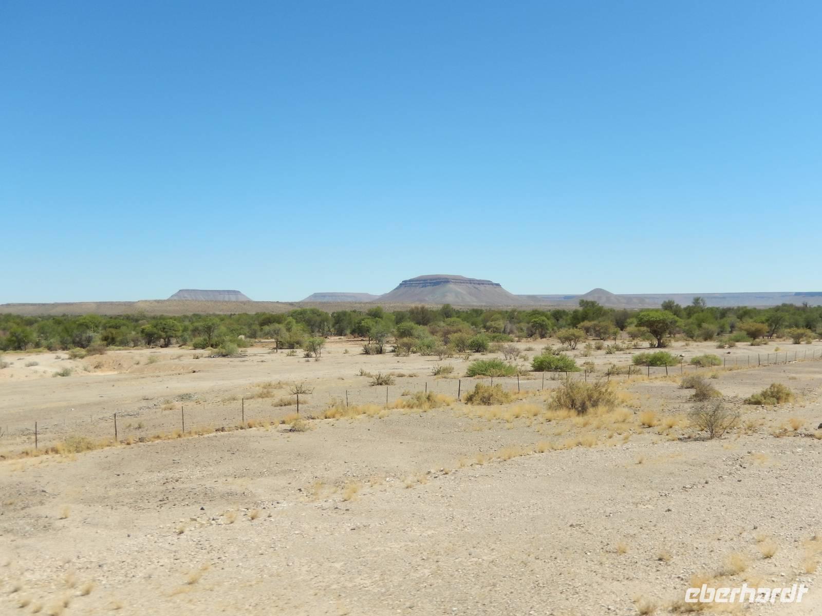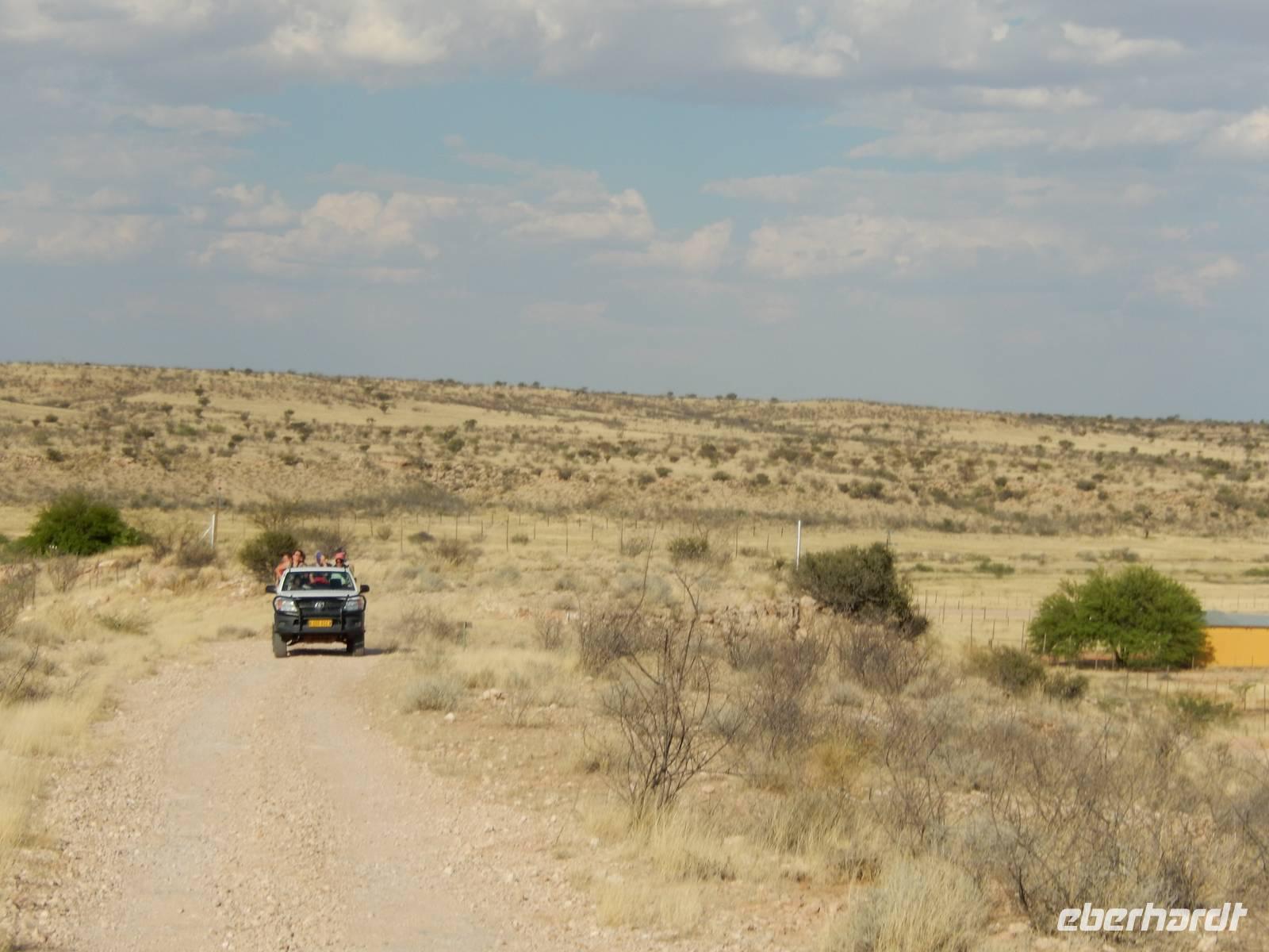Unsere Fahrt brachte und immer weiter in Richtung Norden. Rechts von uns begleitete uns bis kurz vor dem Städtchen Maltahöhe, Zentrum der Karakulzucht und Versorgungsort der umliegenden Farmen, die Hochebene Schwarzrand. Sie gehört zum südnamibischen Schichtstufenland und bildet dessen westliche Grenze und ist mit der höchsten Erhebung von 1.792 Metern schon von Weitem zu erkennen. Da wir uns hier gerade inmitten von Bergmassiven befanden, erklärte uns Claus die äußerst interessante Geologie des Landes. Auf dem weiteren Weg in Richtung Hammerstein sahen wir einige Rinder- und Karakulherden, Windhosen fegten an uns vorbei und dann wurden wir von einigen Fata Morganas aufs Korn genommen.