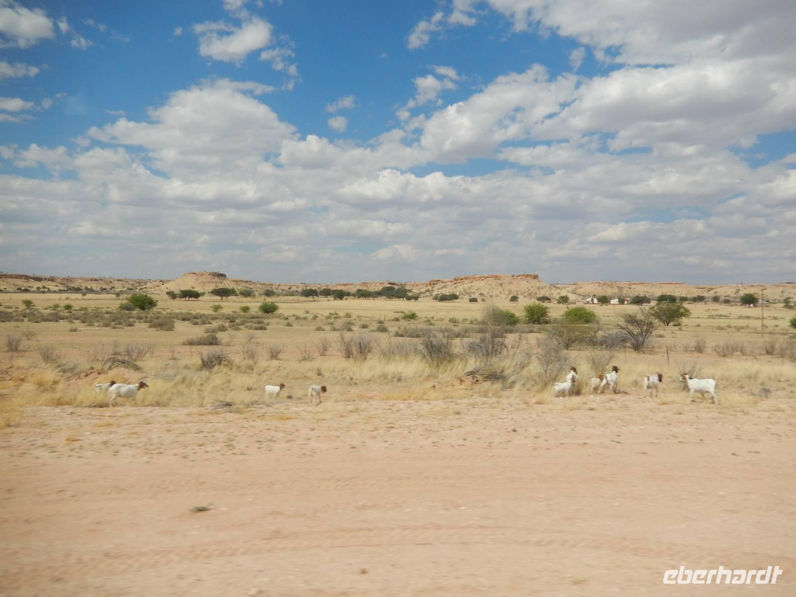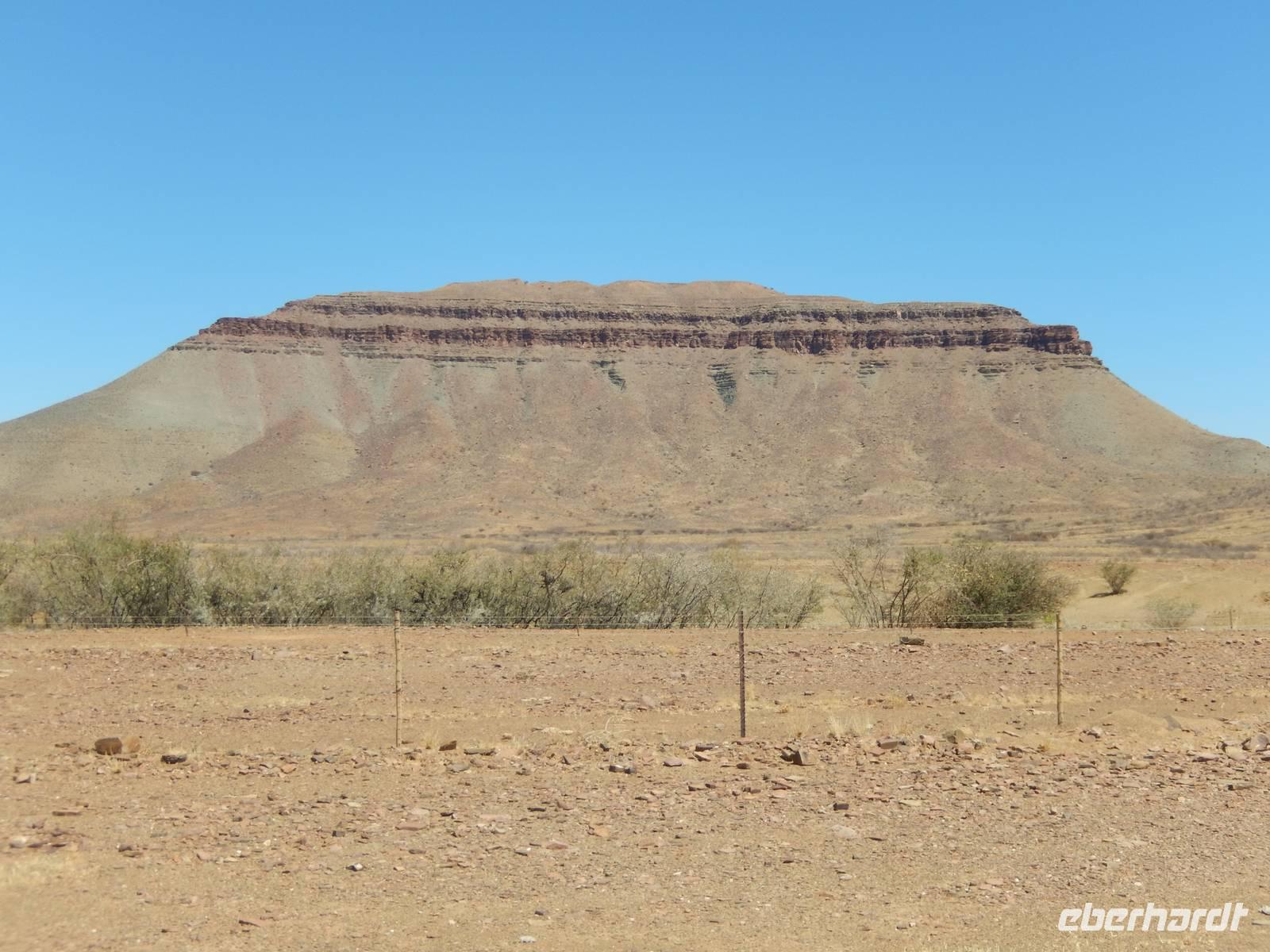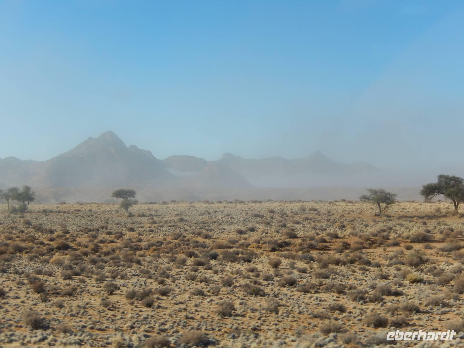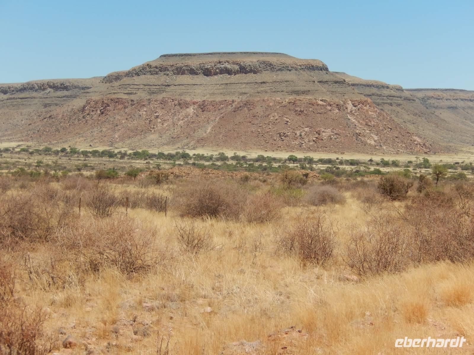 Unsere Fahrt brachte und immer weiter in Richtung Norden. Rechts von uns begleitete uns bis kurz vor dem Städtchen Maltahöhe, Zentrum der Karakulzucht und Versorgungsort der umliegenden Farmen, die Hochebene Schwarzrand. Sie gehört zum südnamibischen Schichtstufenland und bildet dessen westliche Grenze und ist mit der höchsten Erhebung von 1.792 Metern schon von Weitem zu erkennen. Da wir uns hier gerade inmitten von Bergmassiven befanden, erklärte uns Claus die äußerst interessante Geologie des Landes. Auf dem weiteren Weg in Richtung Hammerstein sahen wir einige Rinder- und Karakulherden, Windhosen fegten an uns vorbei und dann wurden wir von einigen Fata Morganas aufs Korn genommen.