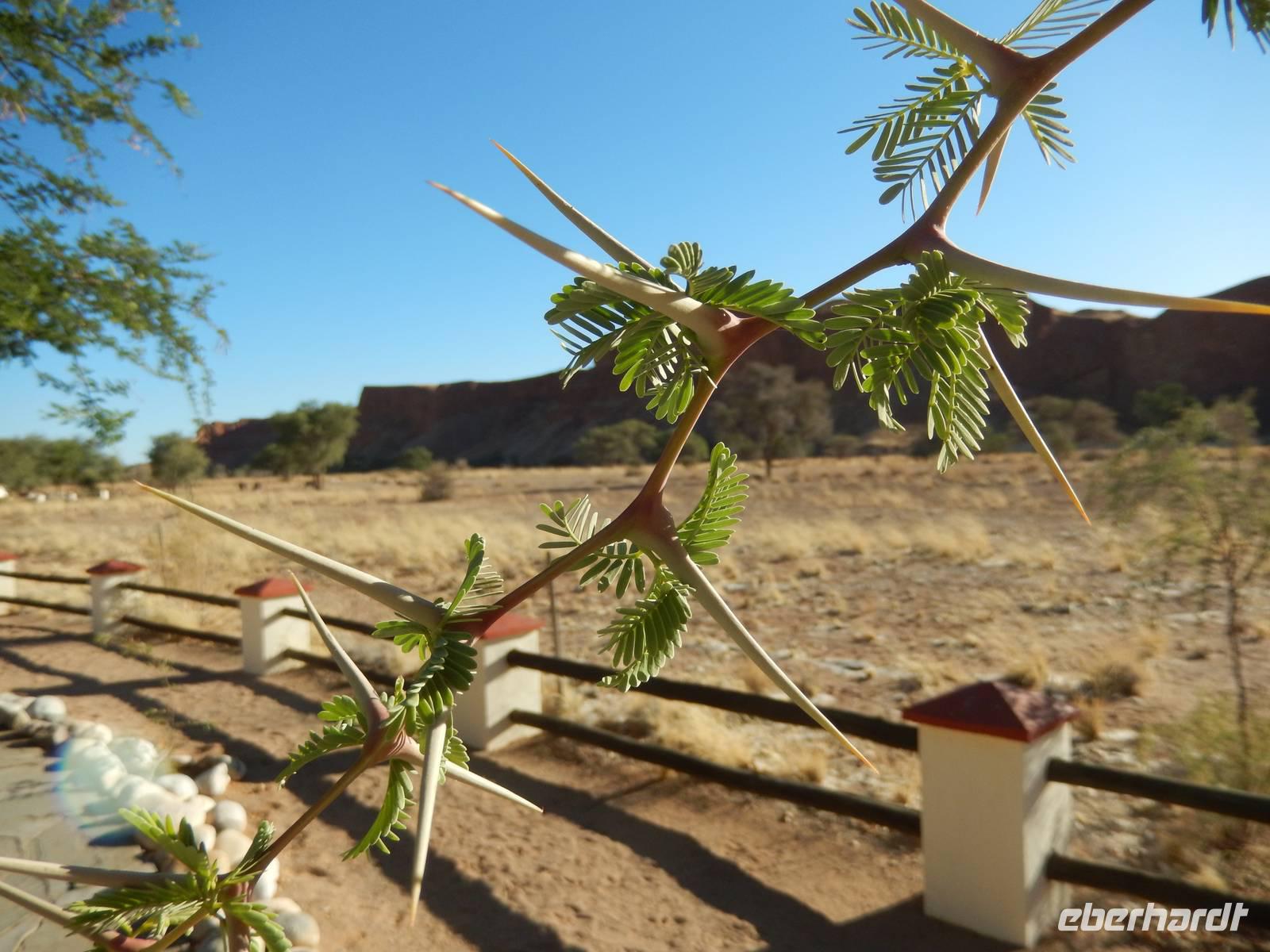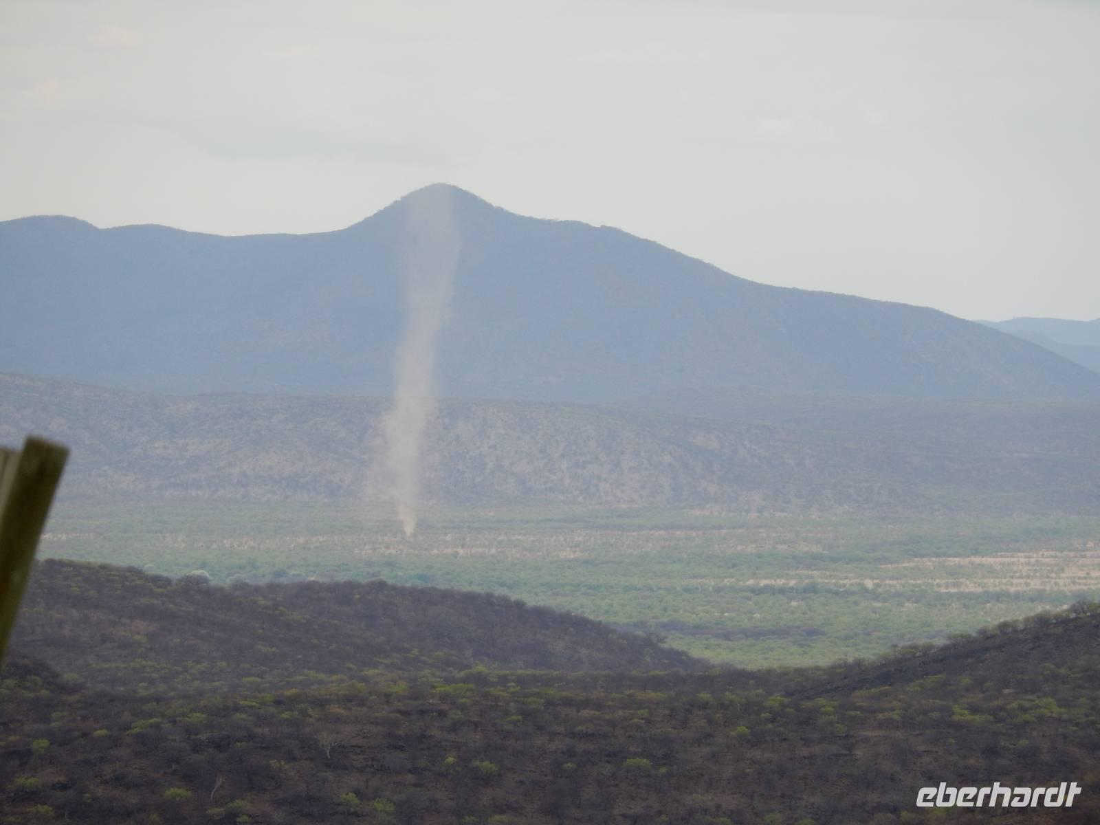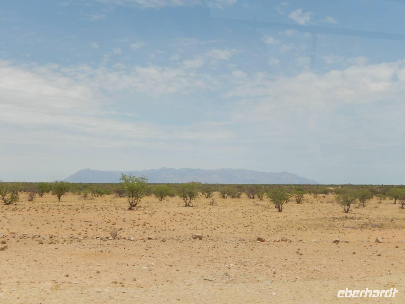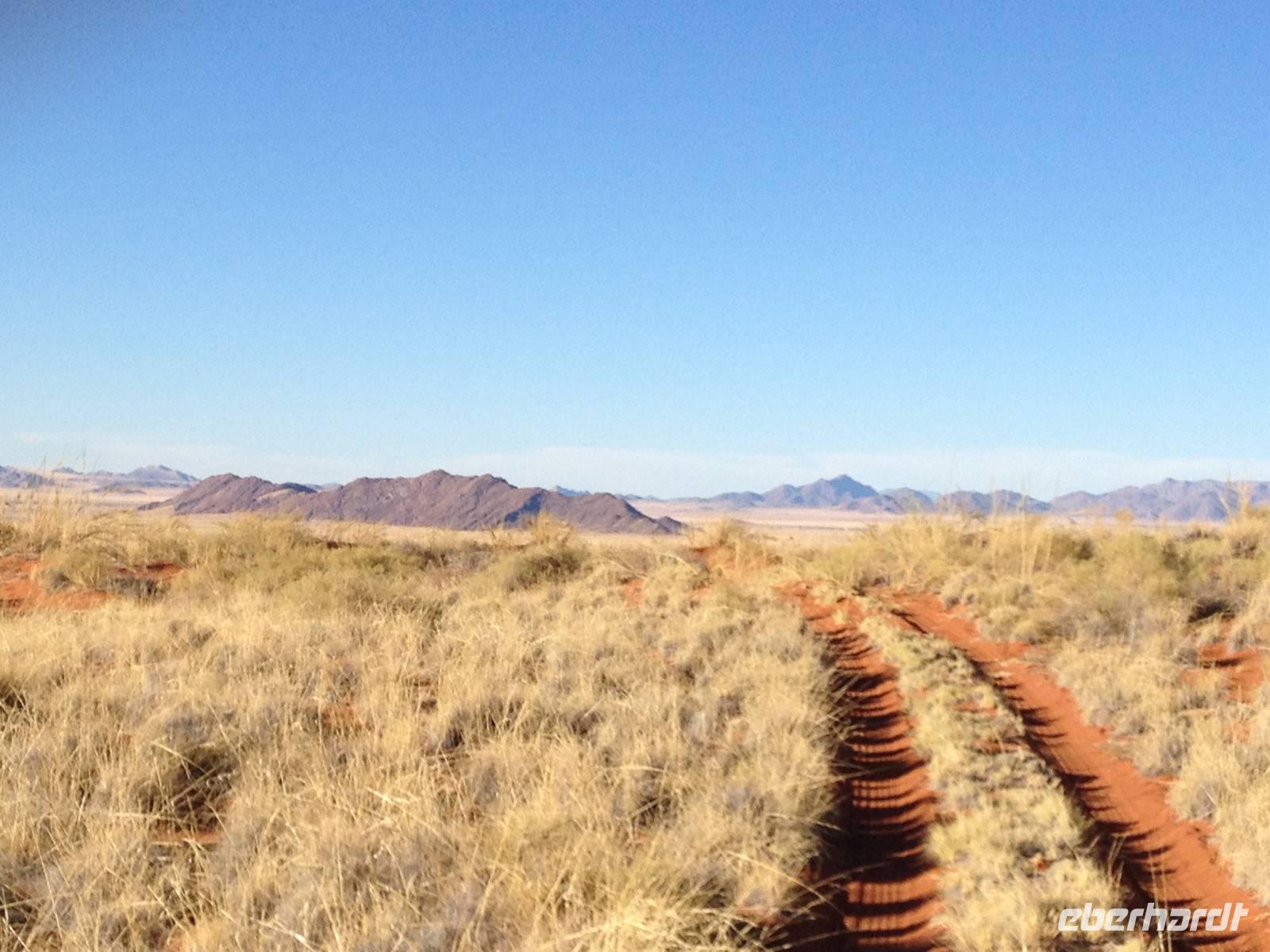 Unsere Fahrt brachte und immer weiter in Richtung Norden. Rechts von uns begleitete uns bis kurz vor dem Städtchen Maltahöhe, Zentrum der Karakulzucht und Versorgungsort der umliegenden Farmen, die Hochebene Schwarzrand. Sie gehört zum südnamibischen Schichtstufenland und bildet dessen westliche Grenze und ist mit der höchsten Erhebung von 1.792 Metern schon von Weitem zu erkennen. Da wir uns hier gerade inmitten von Bergmassiven befanden, erklärte uns Claus die äußerst interessante Geologie des Landes. Auf dem weiteren Weg in Richtung Hammerstein sahen wir einige Rinder- und Karakulherden, Windhosen fegten an uns vorbei und dann wurden wir von einigen Fata Morganas aufs Korn genommen.
