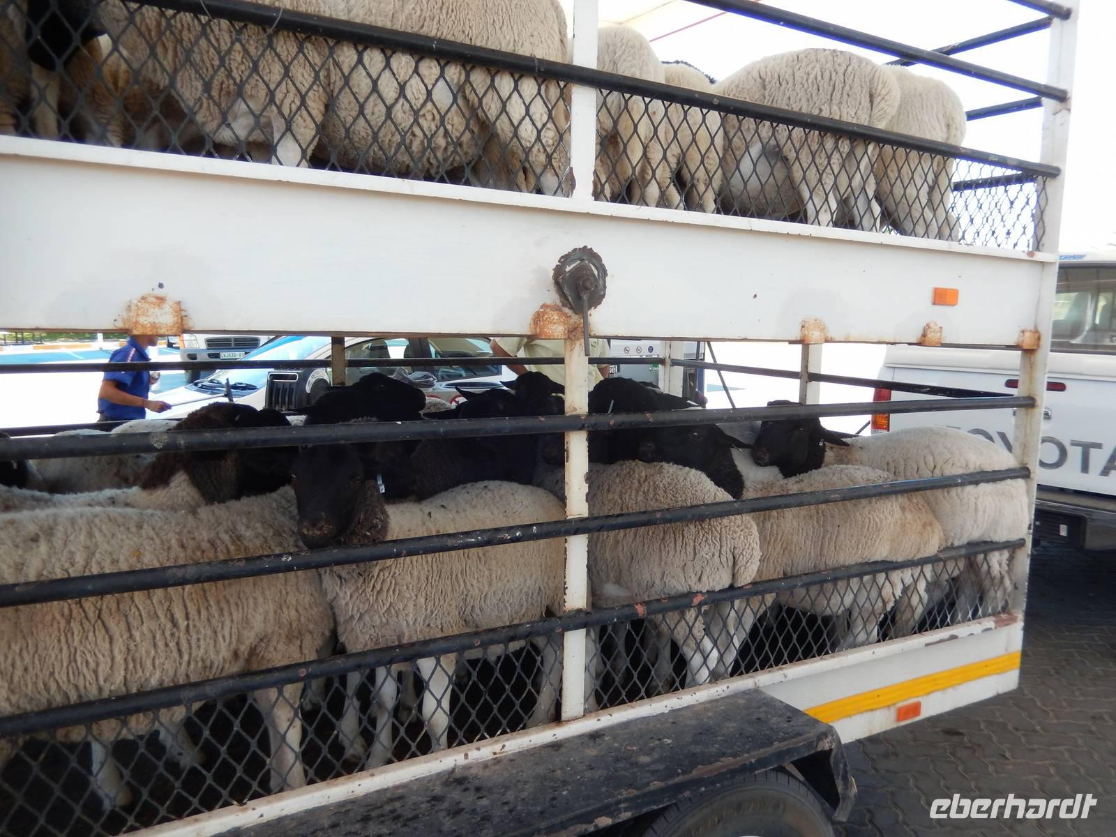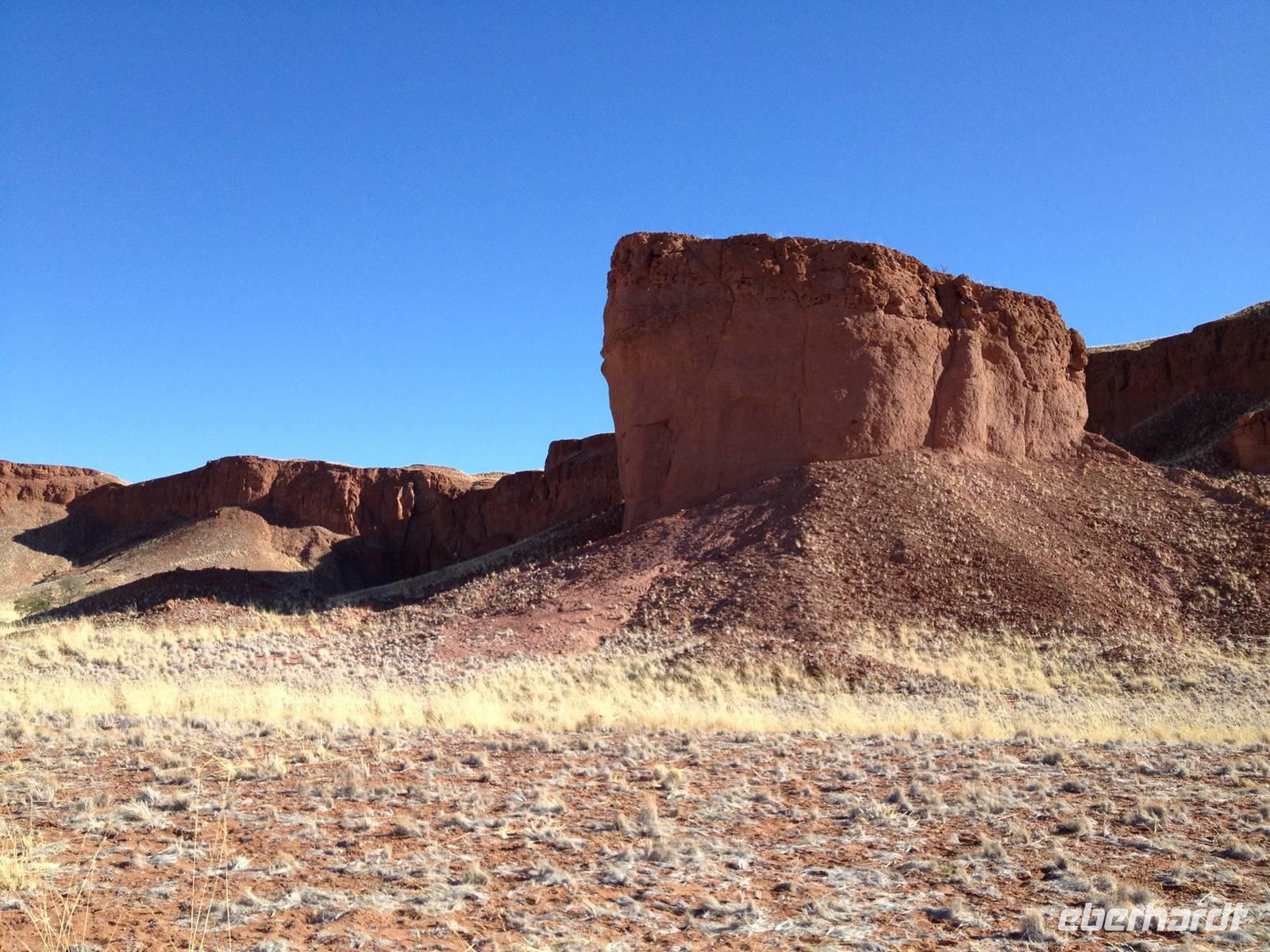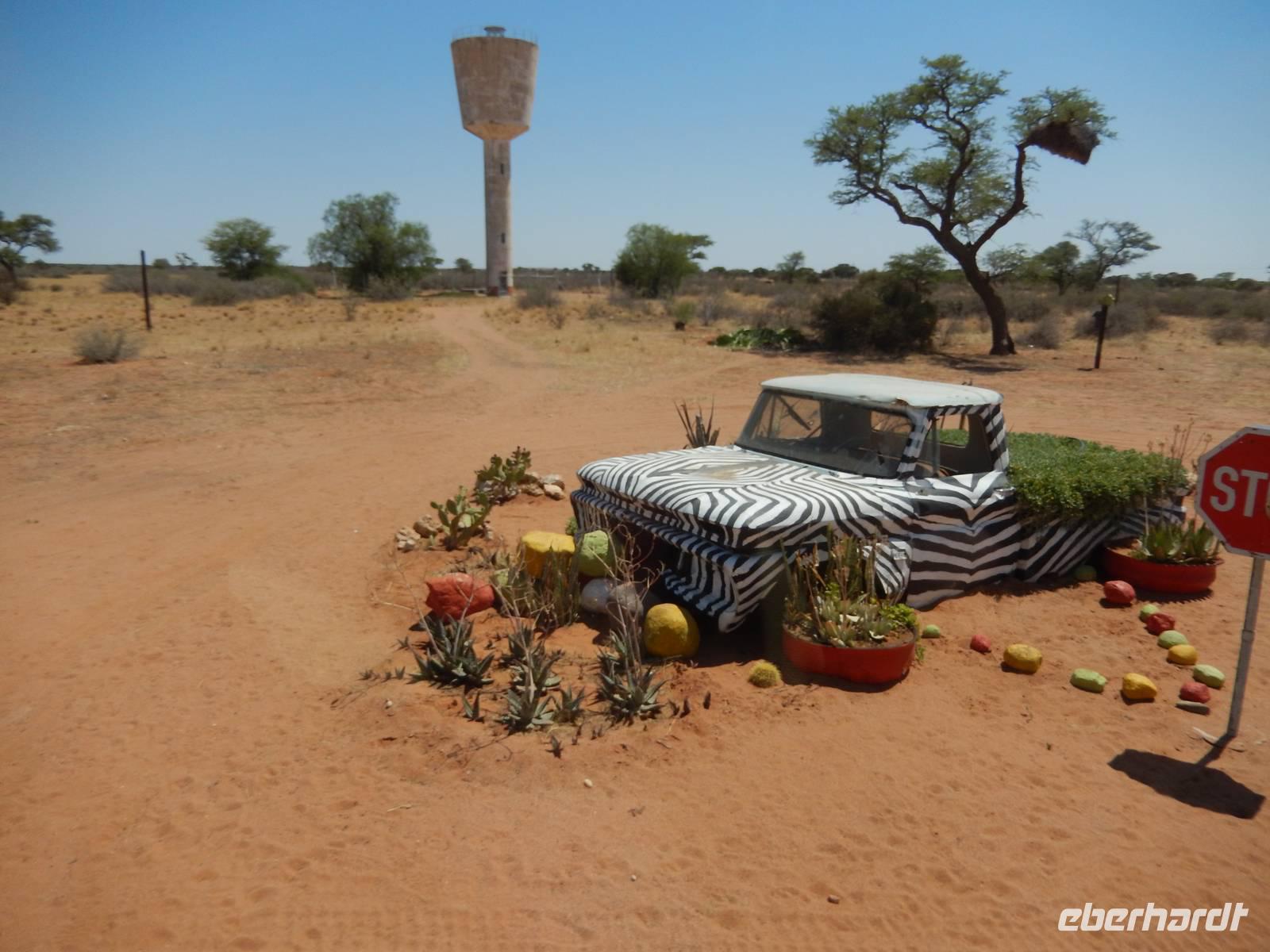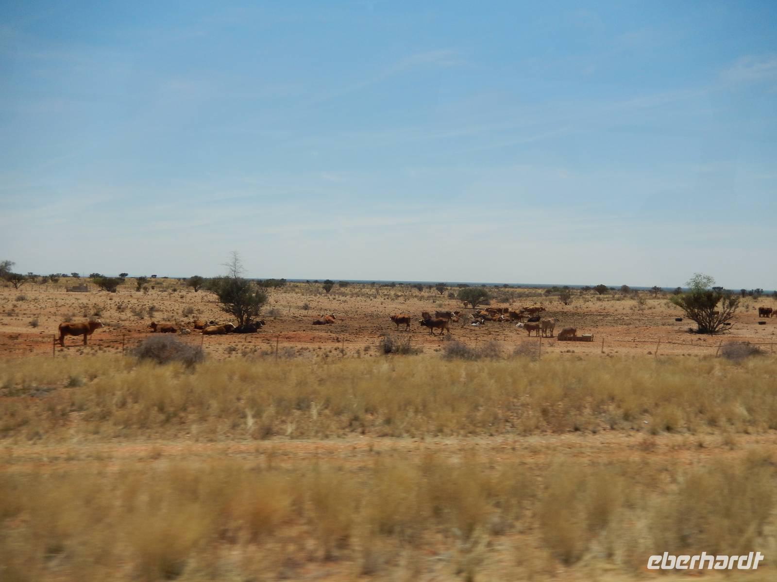 Unsere Fahrt brachte und immer weiter in Richtung Norden. Rechts von uns begleitete uns bis kurz vor dem Städtchen Maltahöhe, Zentrum der Karakulzucht und Versorgungsort der umliegenden Farmen, die Hochebene Schwarzrand. Sie gehört zum südnamibischen Schichtstufenland und bildet dessen westliche Grenze und ist mit der höchsten Erhebung von 1.792 Metern schon von Weitem zu erkennen. Da wir uns hier gerade inmitten von Bergmassiven befanden, erklärte uns Claus die äußerst interessante Geologie des Landes. Auf dem weiteren Weg in Richtung Hammerstein sahen wir einige Rinder- und Karakulherden, Windhosen fegten an uns vorbei und dann wurden wir von einigen Fata Morganas aufs Korn genommen.