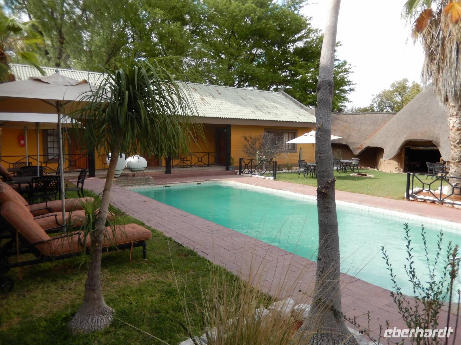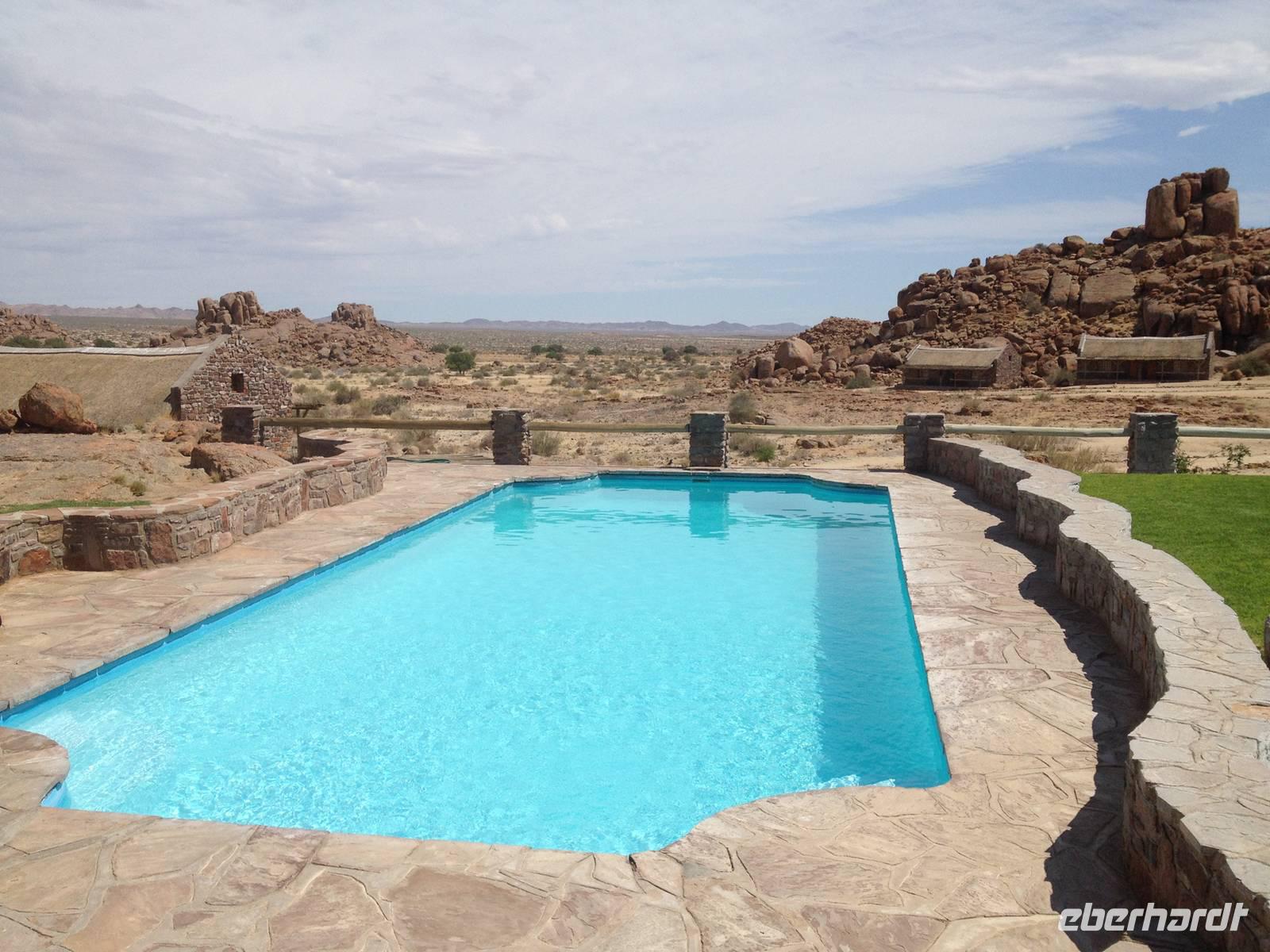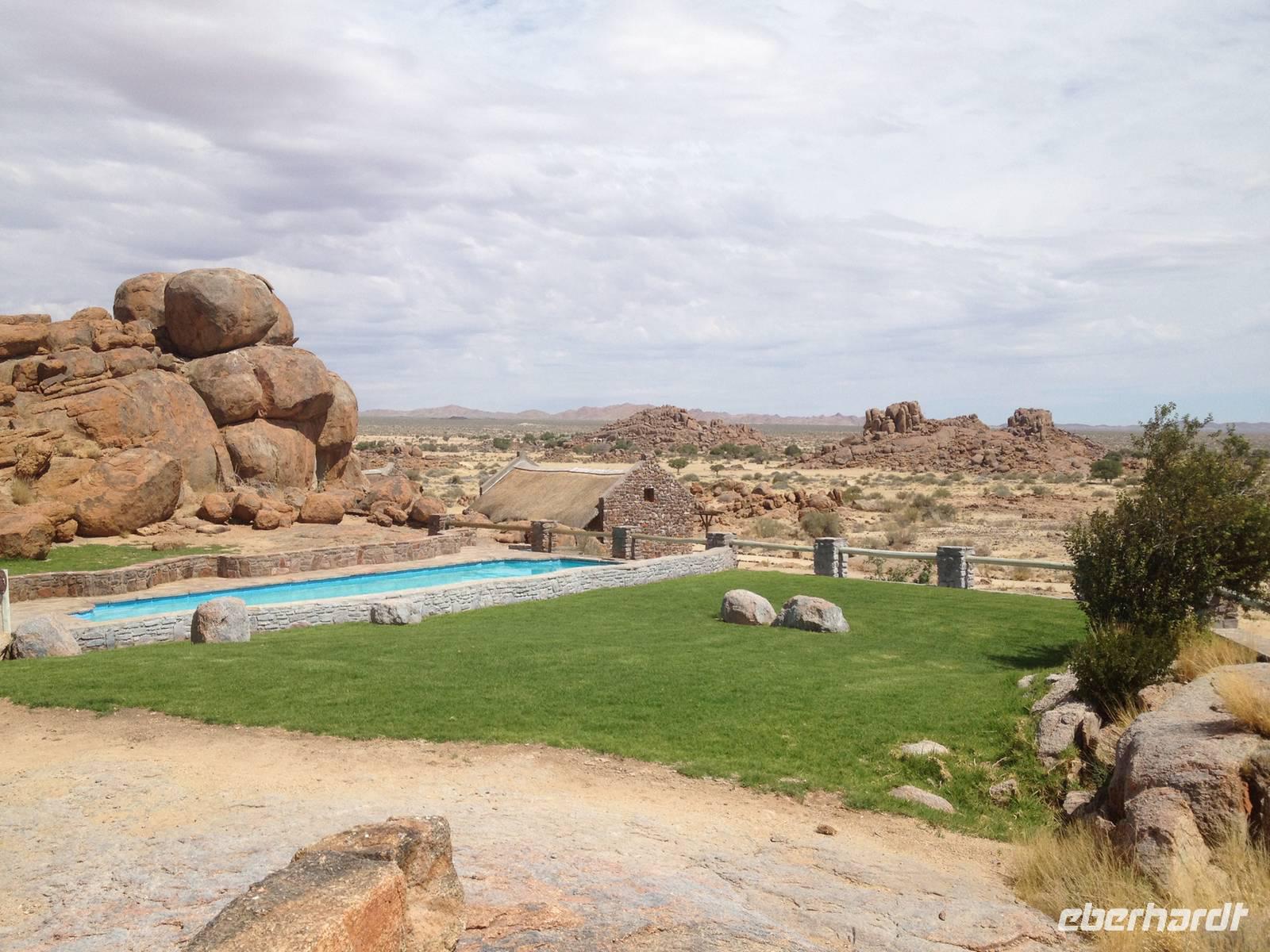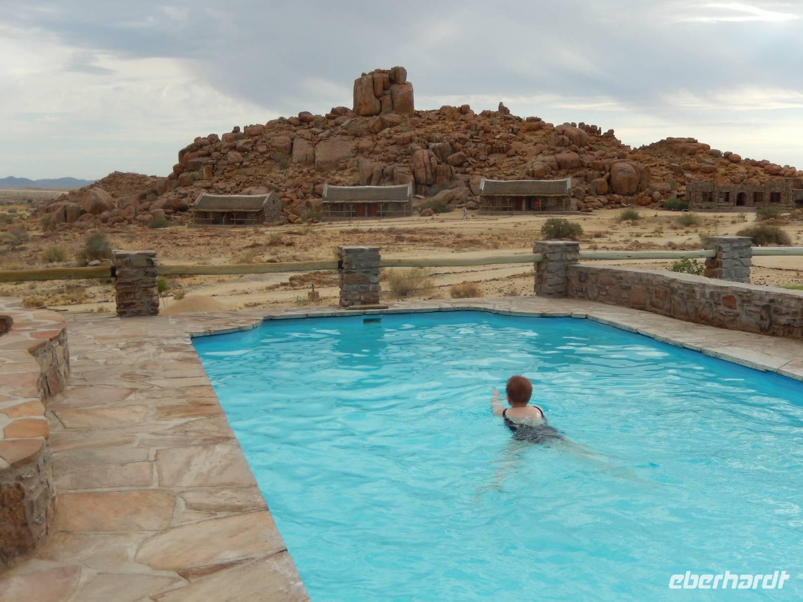 Nach wenigen Minuten erreichten wir dann unsere Canon Village Lodge - Meine Güte, war das ein Traum! Zwischen den verstreuten Felsenhaufen in der grenzenlosen Landschaft des Gondwana Canon Parks, lagen die dorfähnlich verteilten Gebäude als wären sie aus dem Boden gewachsen. Schnell hatten wir unsere eigenen Häuschen bezogen und trafen uns dann am kristallklaren Pool mit einem herrlichen Blick in die Landschaft. So lässt es sich leben!