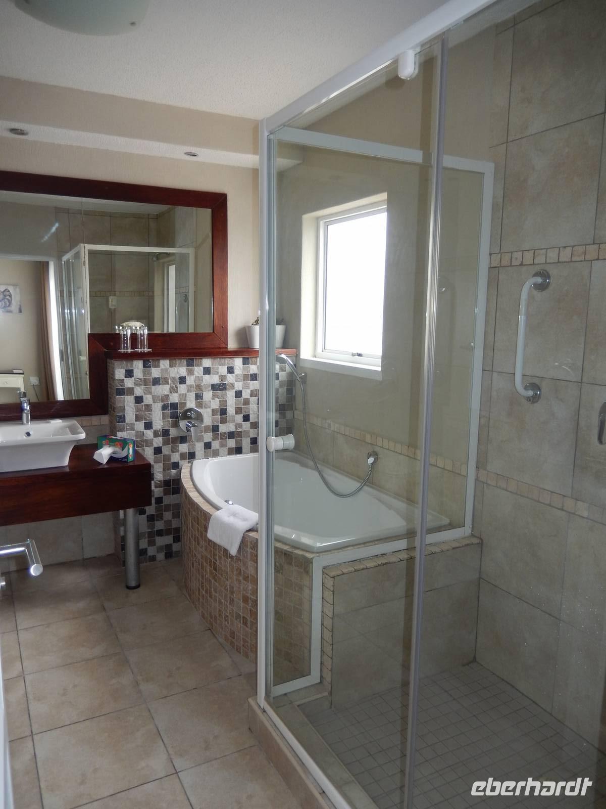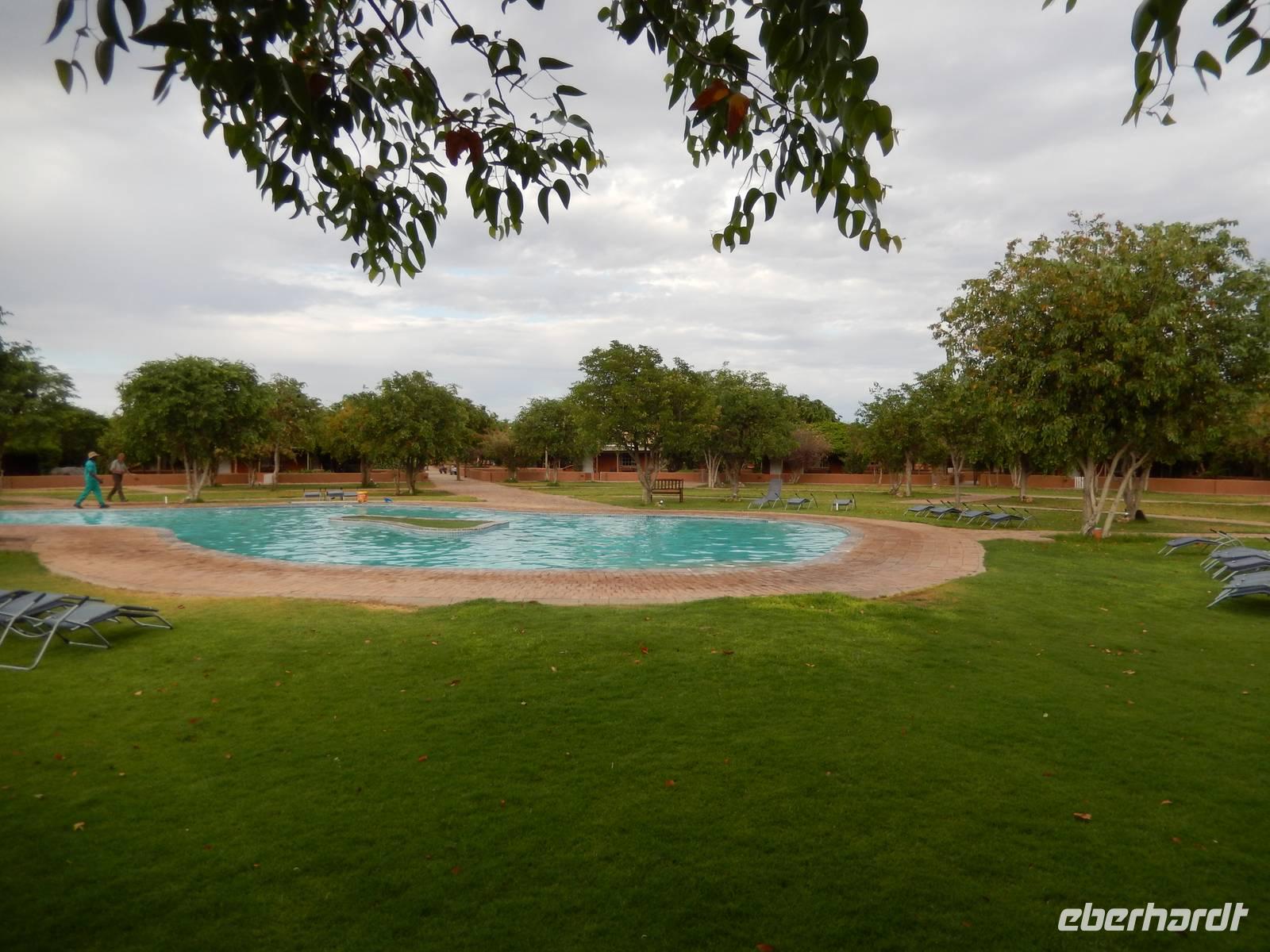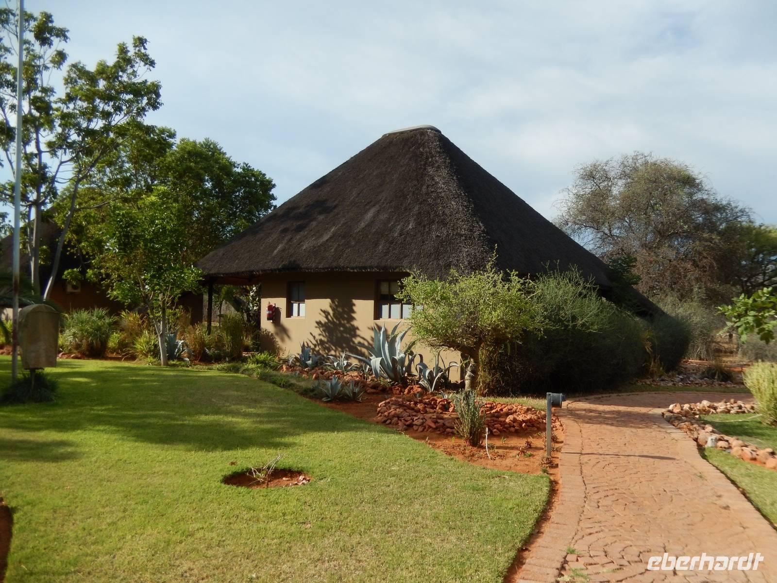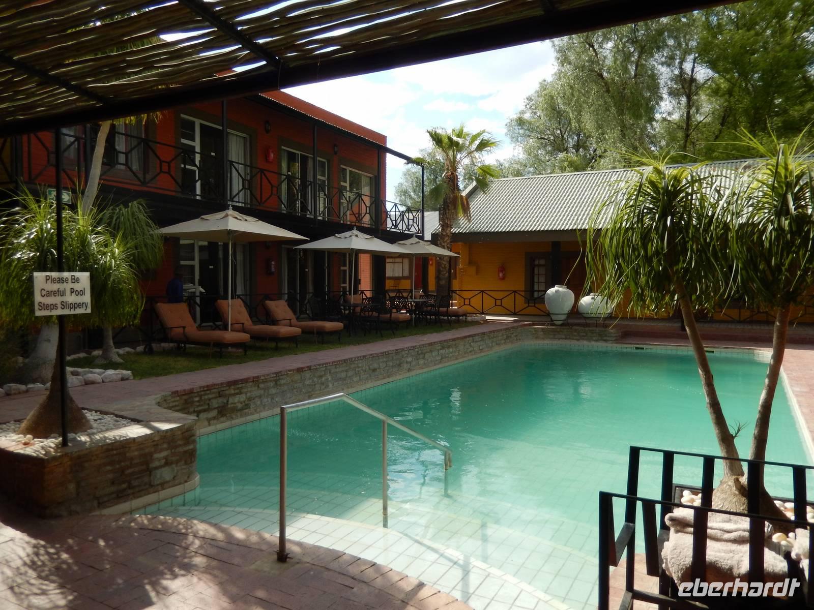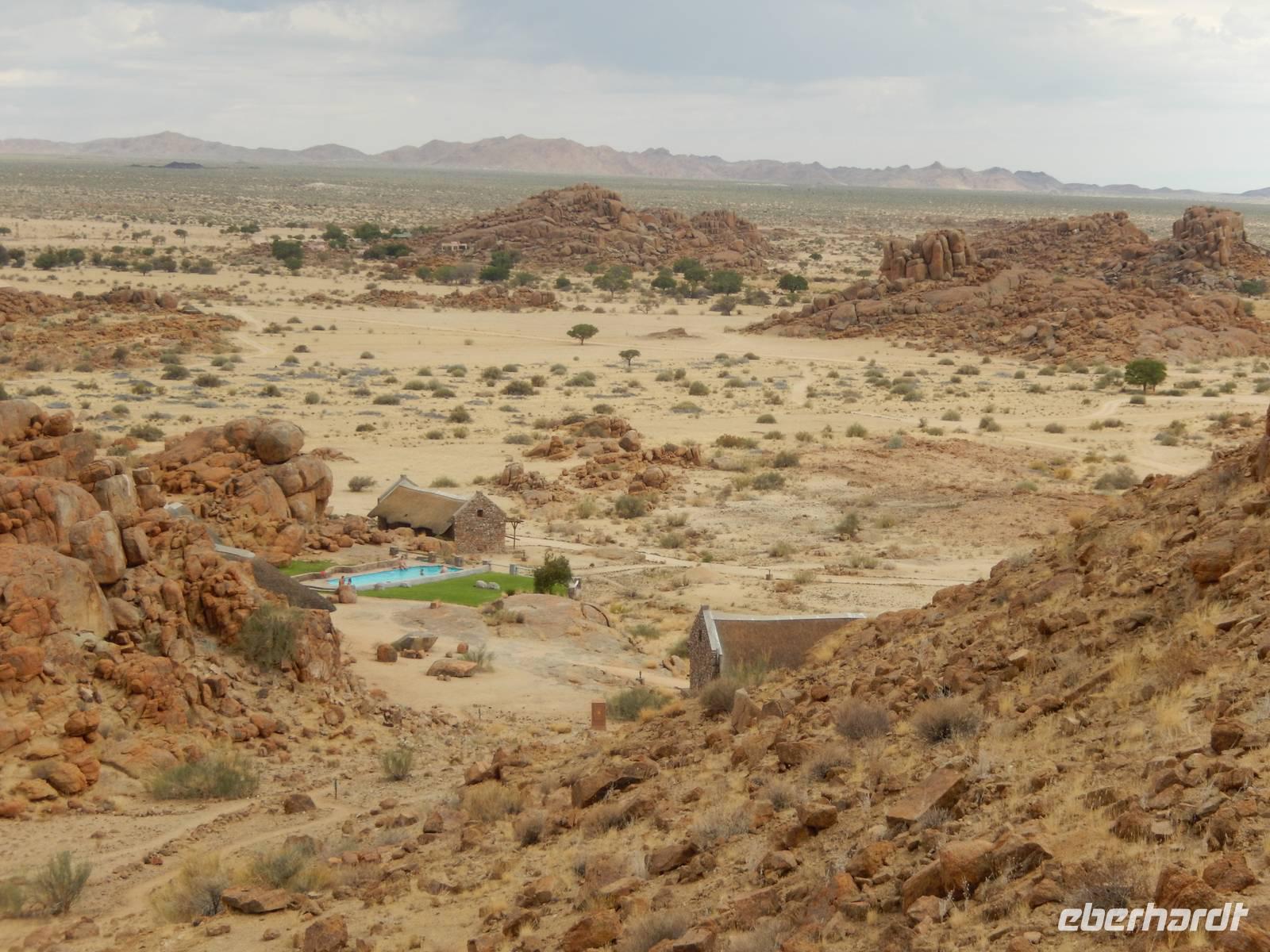 Nach wenigen Minuten erreichten wir dann unsere Canon Village Lodge - Meine Güte, war das ein Traum! Zwischen den verstreuten Felsenhaufen in der grenzenlosen Landschaft des Gondwana Canon Parks, lagen die dorfähnlich verteilten Gebäude als wären sie aus dem Boden gewachsen. Schnell hatten wir unsere eigenen Häuschen bezogen und trafen uns dann am kristallklaren Pool mit einem herrlichen Blick in die Landschaft. So lässt es sich leben!