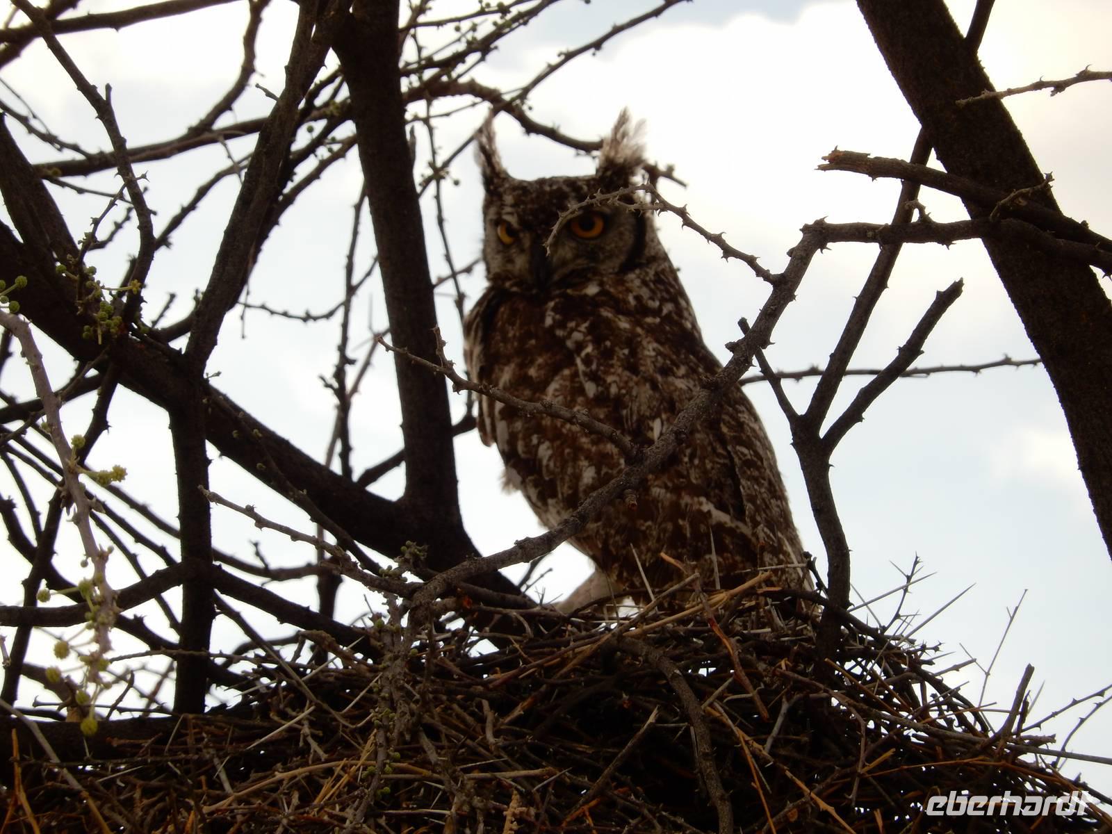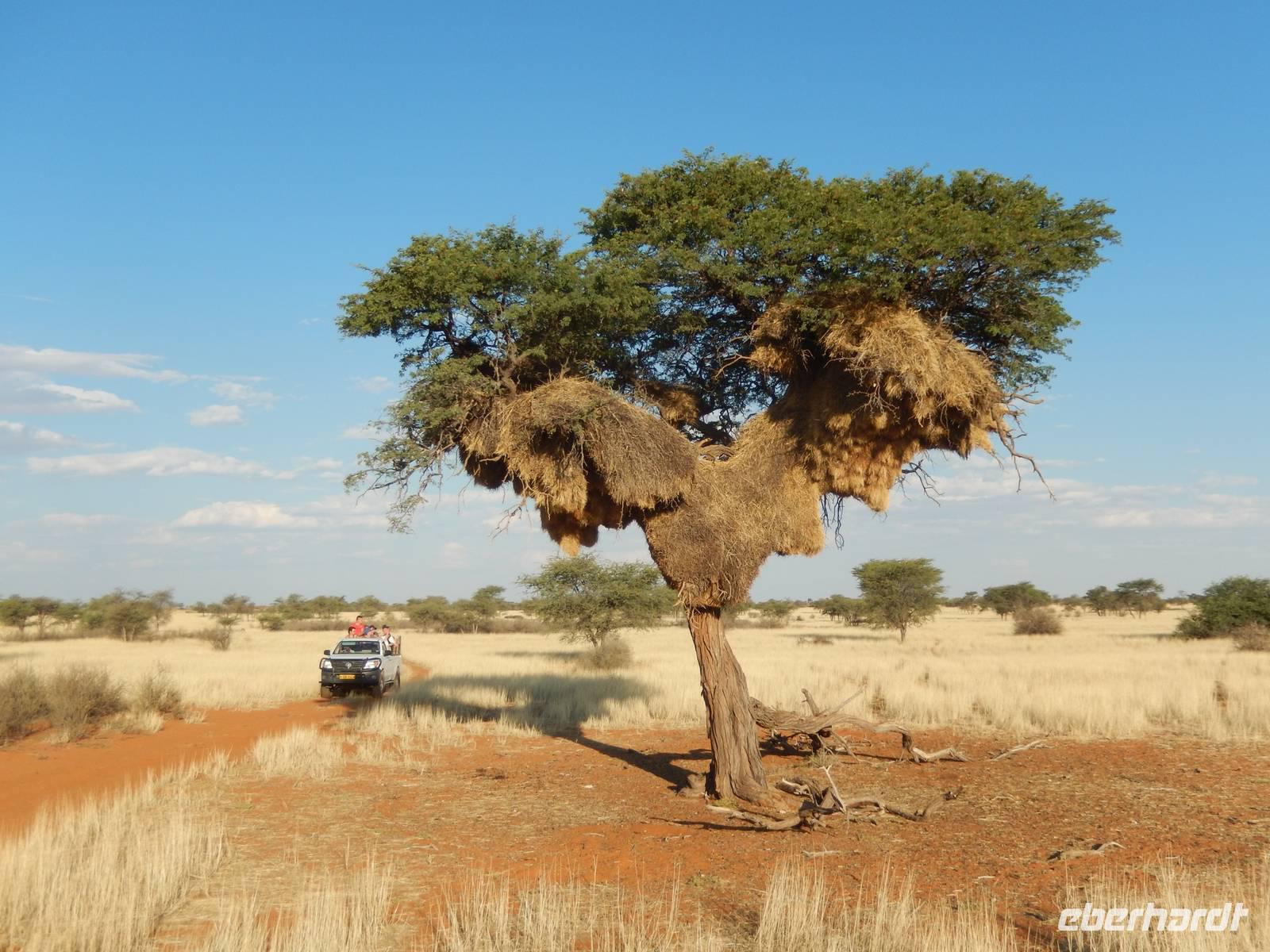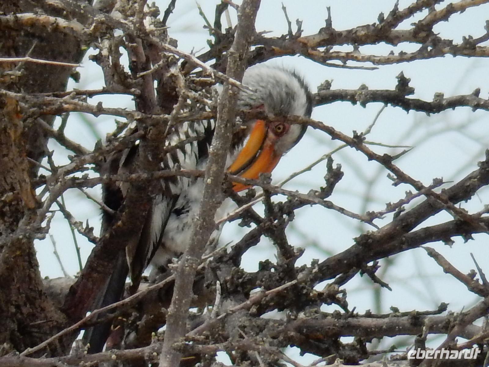 So rasten auf dem Grasland die Perlhühner neben uns her, eine Riesentrappe stellte sich in Pose und ein Flecken-Uhu sowie ein Gelbschnabeltoko schauten vom Baum auf uns herab. Auf der Fahrt durch den Park genossen wir auch einfach mal die schöne, unendliche Landschaft. Dafür hatten wir in den letzten Tagen gar keine Zeit. Also es hatte auch seinen Reiz! Wir trafen wieder einmal auf riesige Webervögelnester, die in den Schirmakazien hingen. Doch ab und zu schaute eine Giraffe zu uns, Gnus ruhten sich neben der Straße aus und ein Tausendfüßer rannte um sein Leben