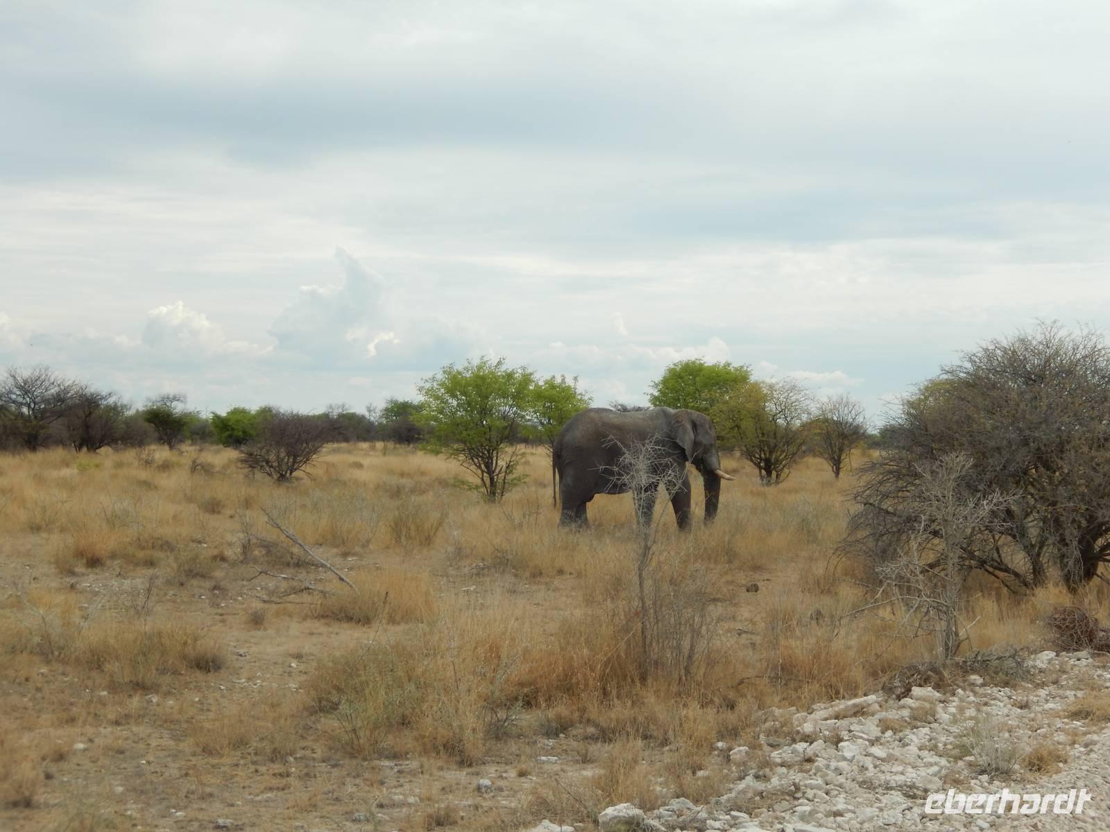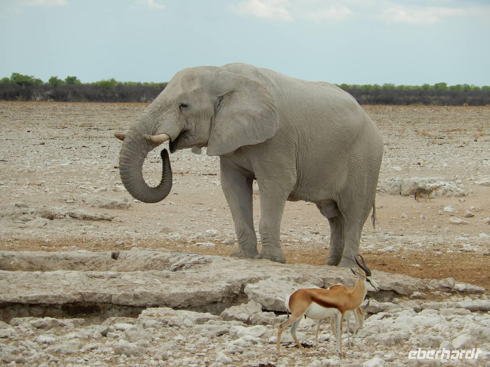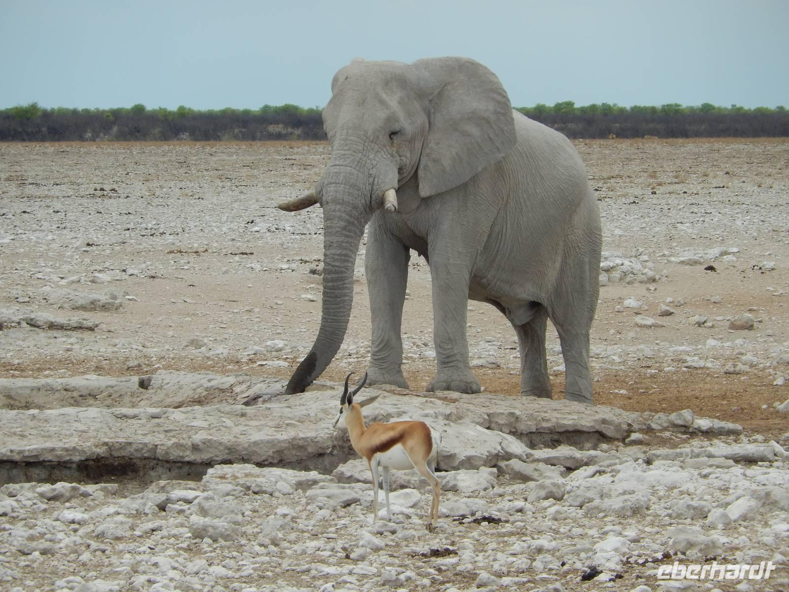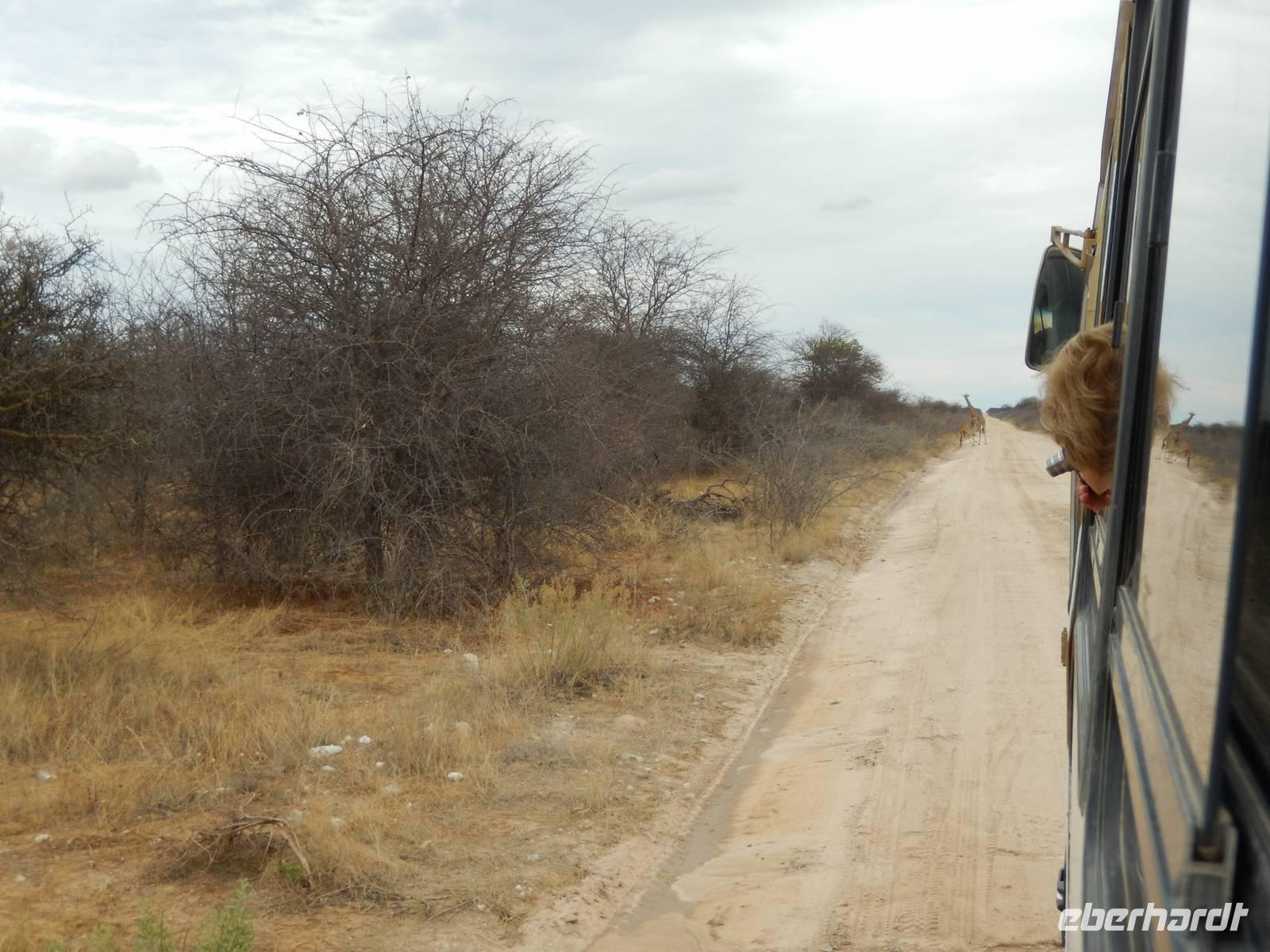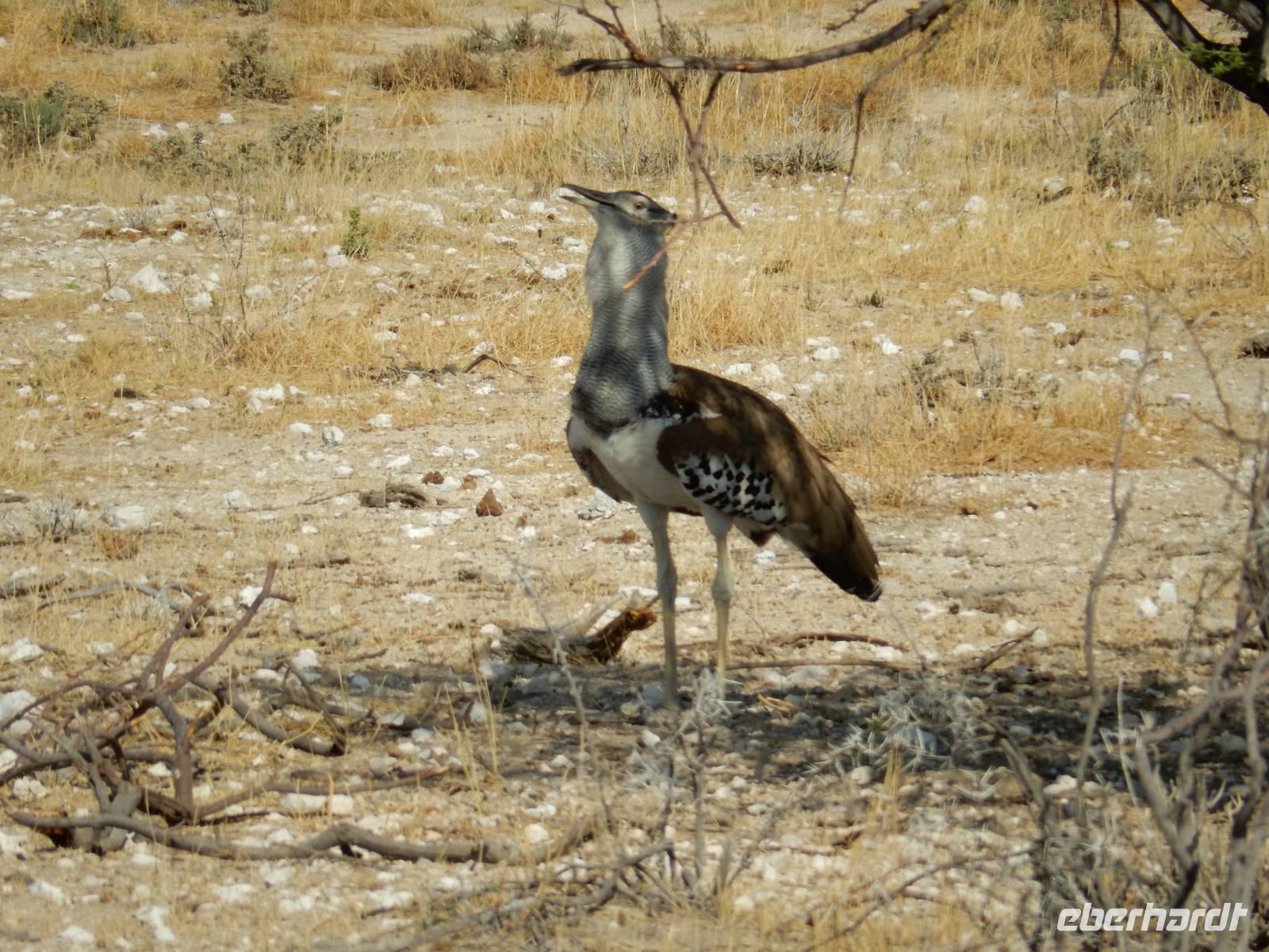 Und dann war der Tag perfekt: Giraffen schauten durch die lichten Bäume oder standen direkt vor unserem Bus auf der Straße, als aber dann ein grauer Dickhäuter neben unserem Bus stand, trauten wir unseren Augen kaum. Auf der weiteren Fahrt entlang der Etosha-Pfanne trafen wir noch auf eine Riesentrappe, eine Gackeltrappe, auf Steinböckchen, einen Schabrackenschakal, ein Weißbürzel-Singhabicht drehte seine Kreise und eine Kuduherde ließ sich auch noch sehen.