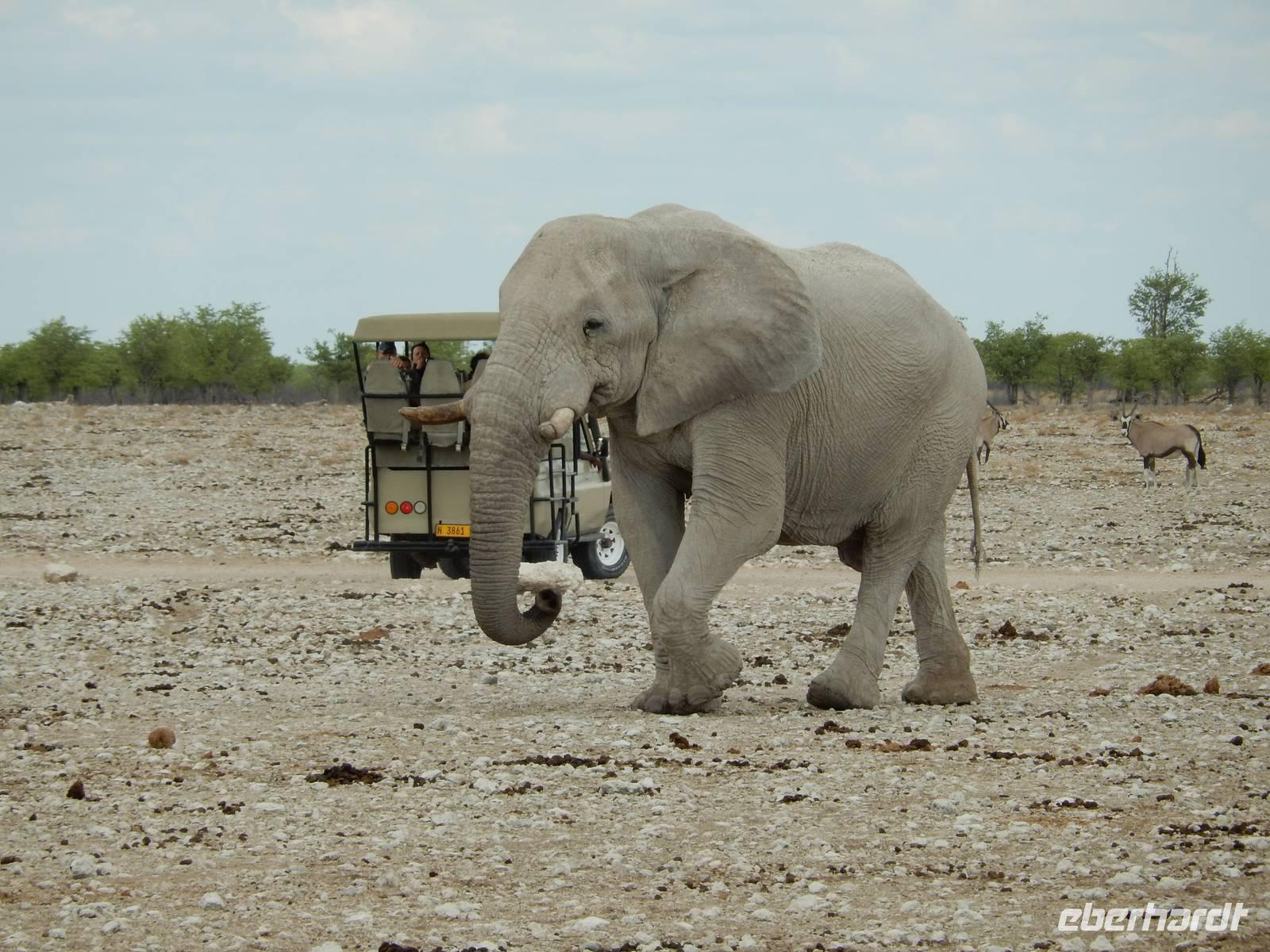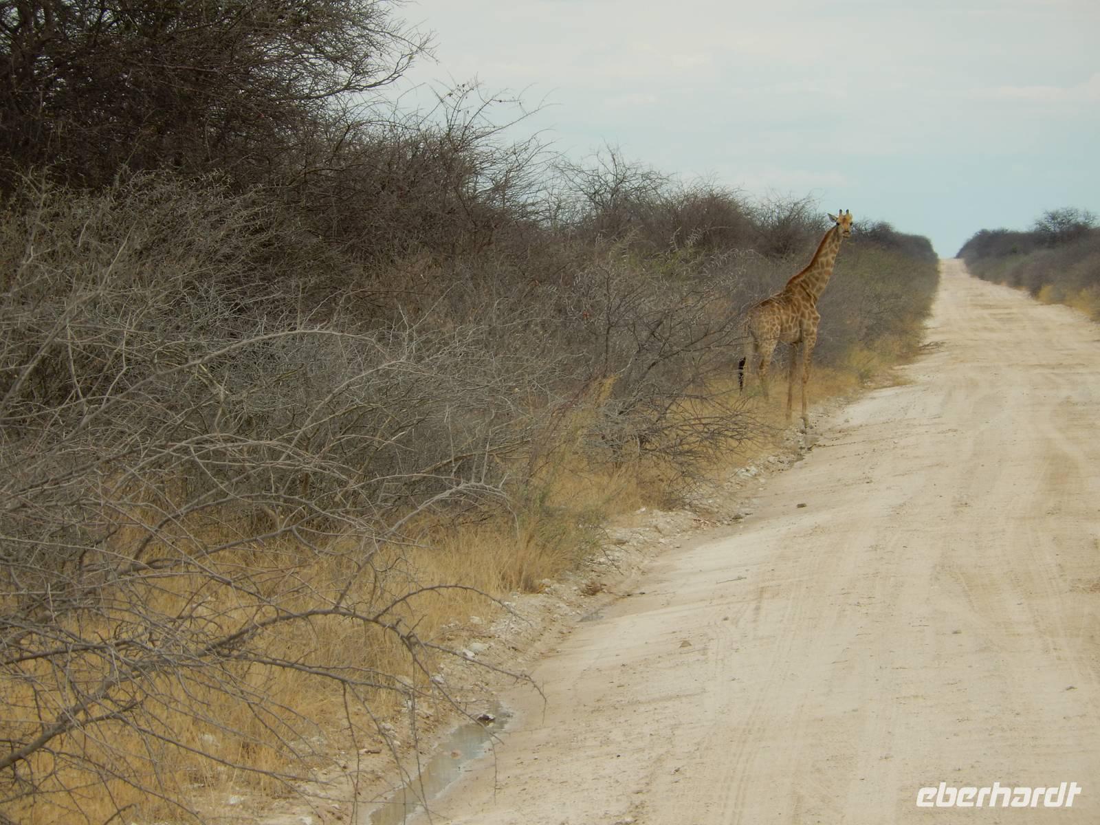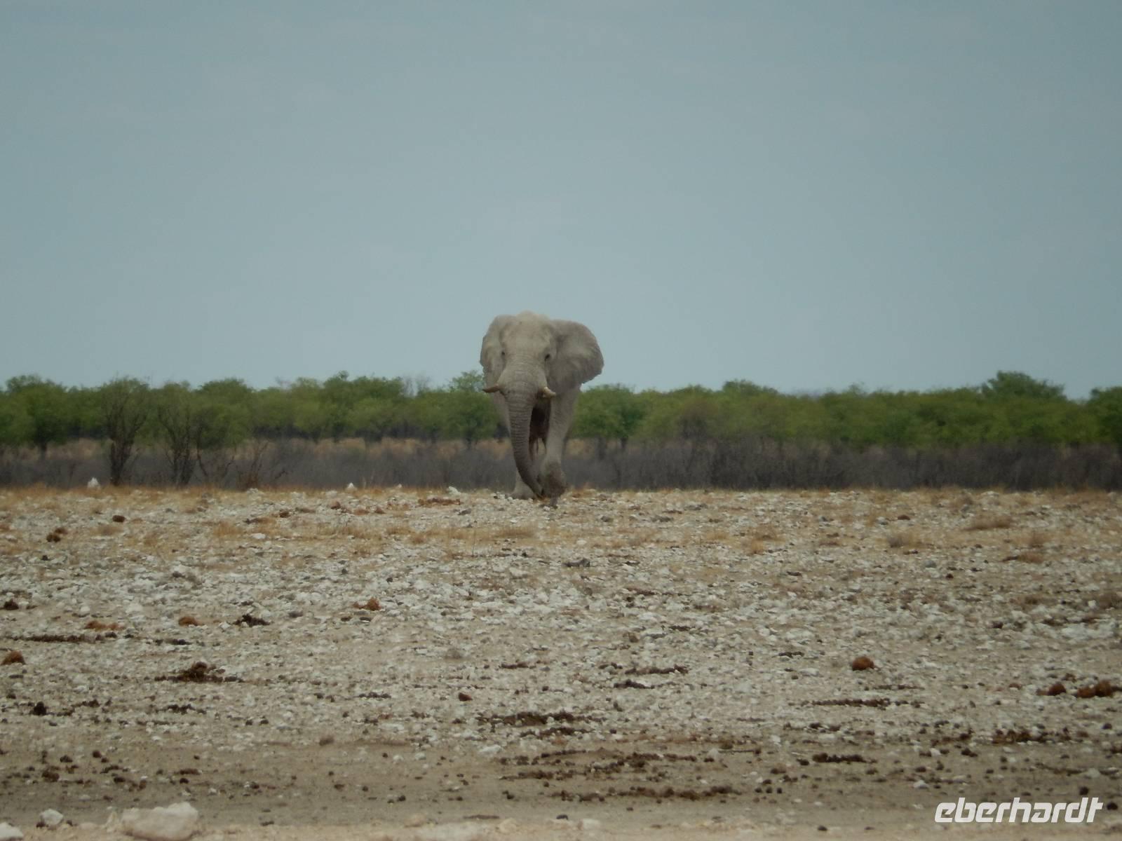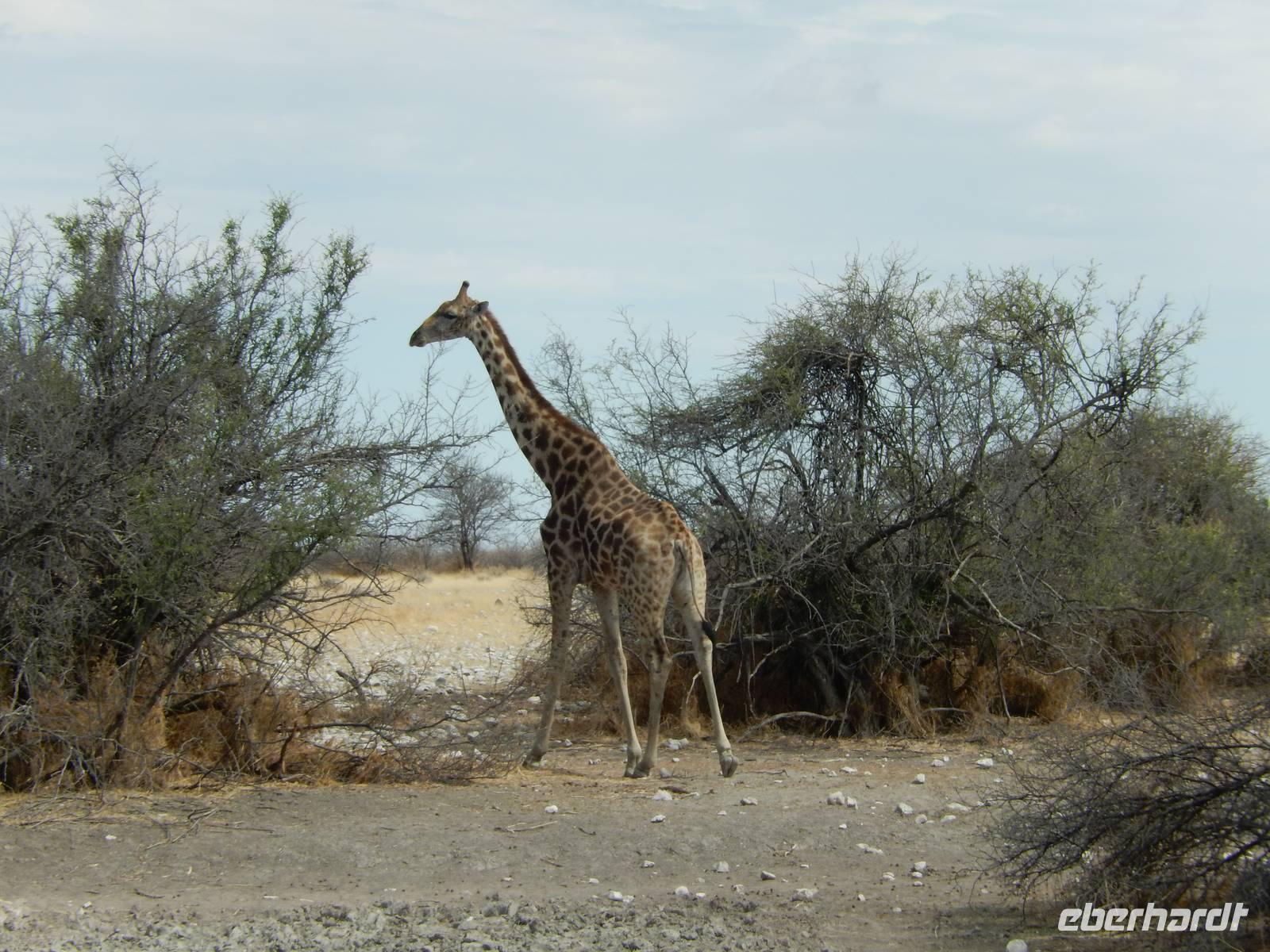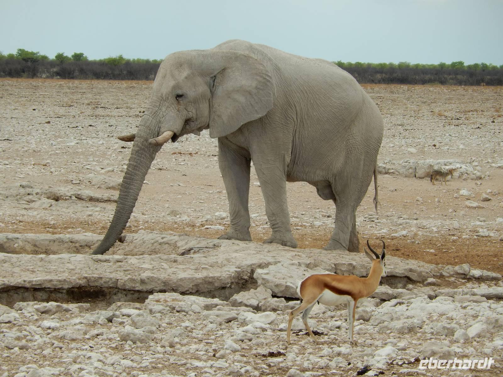 Und dann war der Tag perfekt: Giraffen schauten durch die lichten Bäume oder standen direkt vor unserem Bus auf der Straße, als aber dann ein grauer Dickhäuter neben unserem Bus stand, trauten wir unseren Augen kaum. Auf der weiteren Fahrt entlang der Etosha-Pfanne trafen wir noch auf eine Riesentrappe, eine Gackeltrappe, auf Steinböckchen, einen Schabrackenschakal, ein Weißbürzel-Singhabicht drehte seine Kreise und eine Kuduherde ließ sich auch noch sehen.