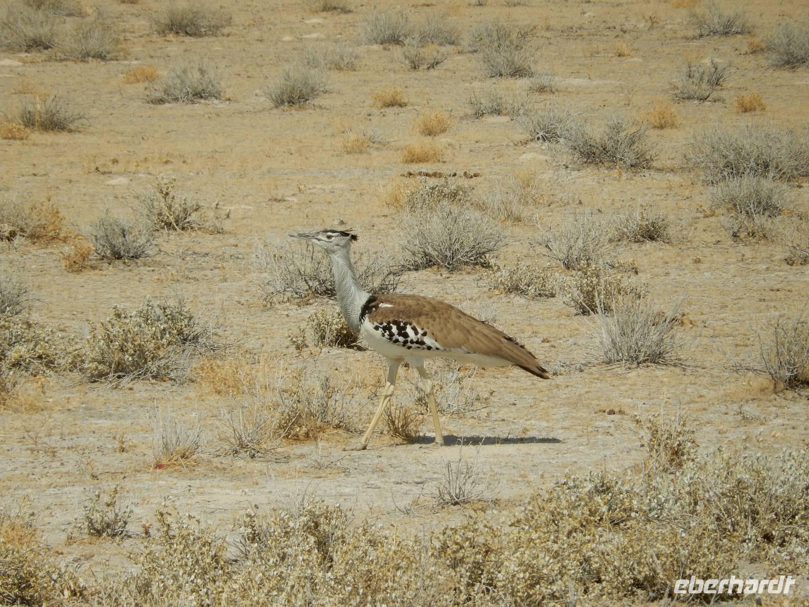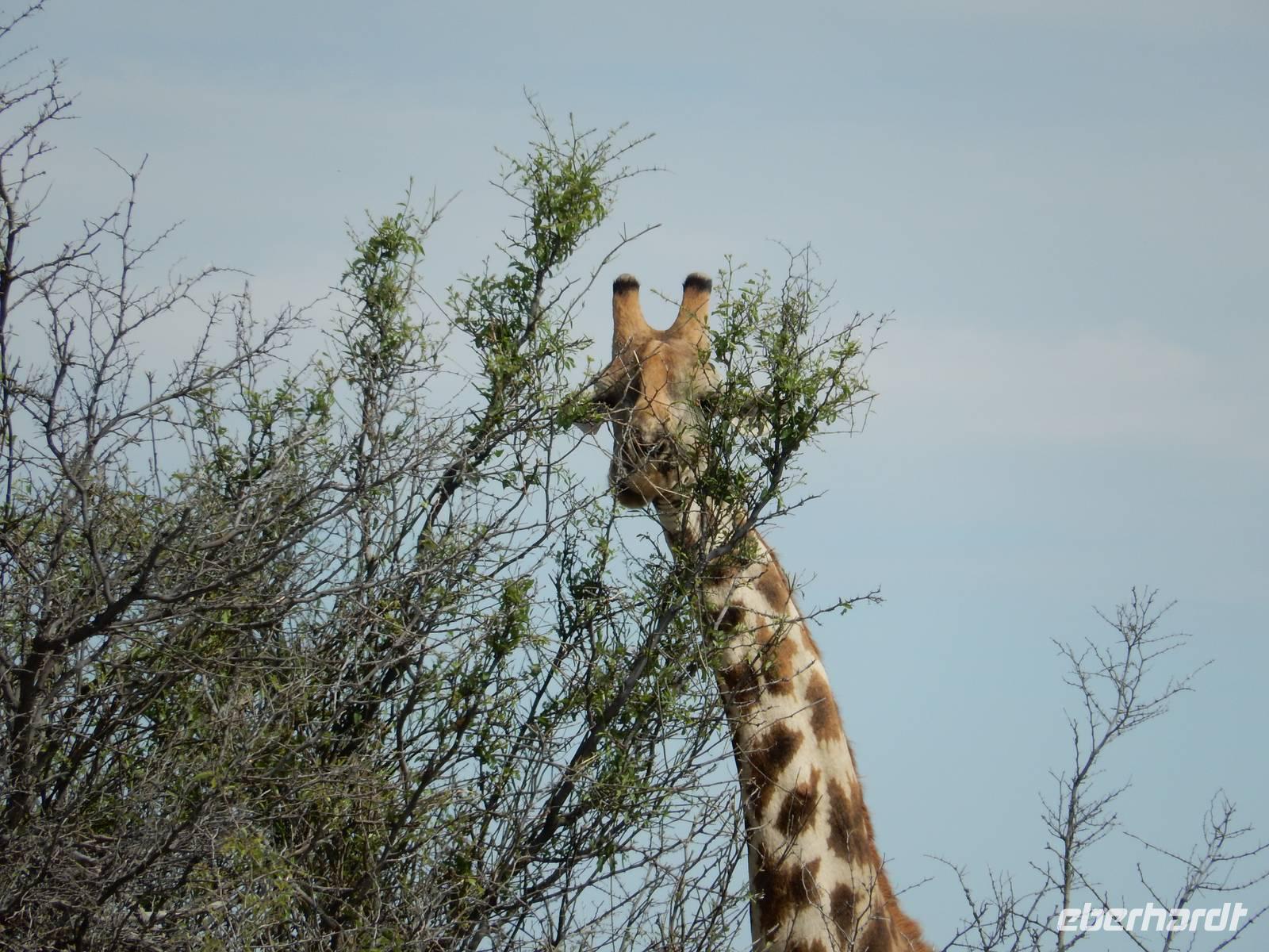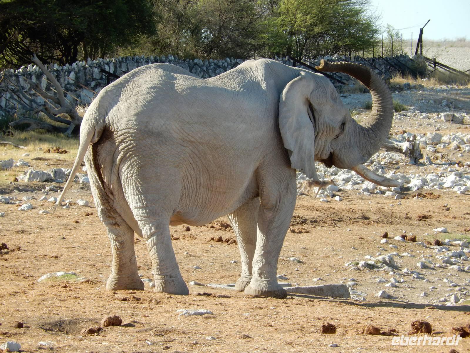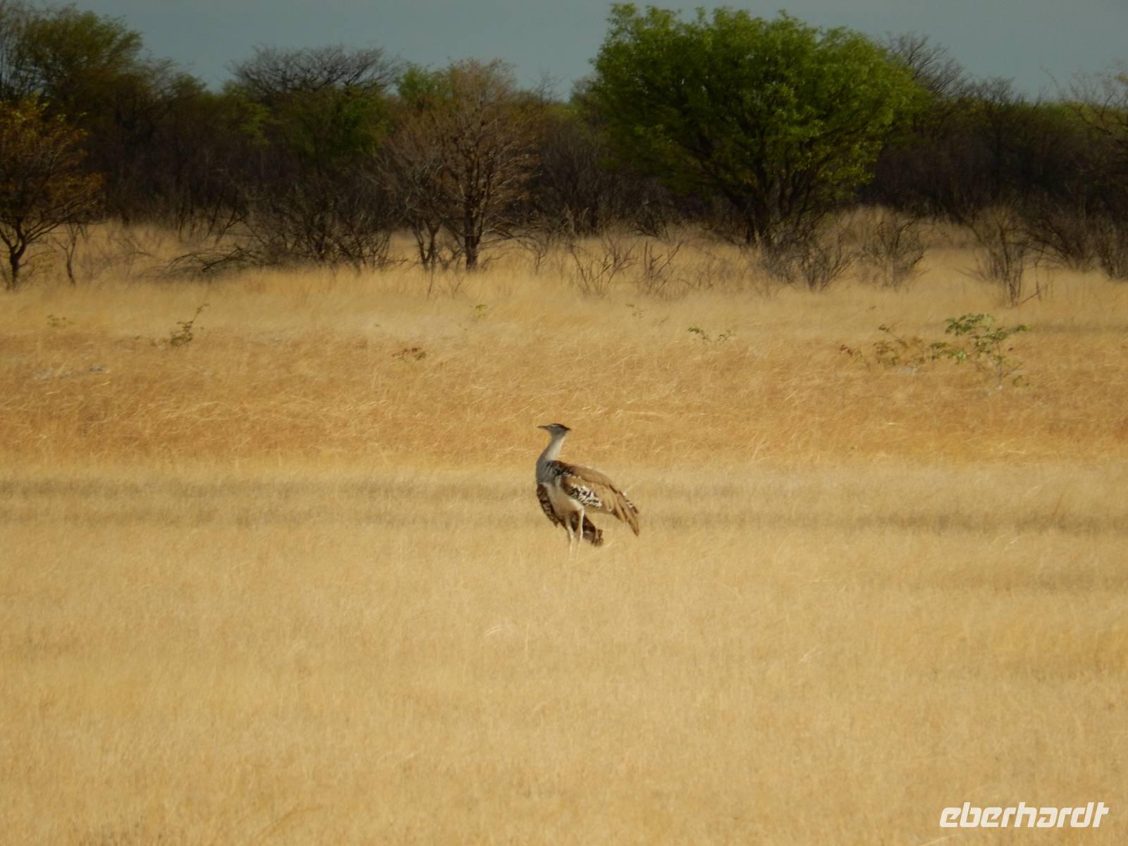 Und dann war der Tag perfekt: Giraffen schauten durch die lichten Bäume oder standen direkt vor unserem Bus auf der Straße, als aber dann ein grauer Dickhäuter neben unserem Bus stand, trauten wir unseren Augen kaum. Auf der weiteren Fahrt entlang der Etosha-Pfanne trafen wir noch auf eine Riesentrappe, eine Gackeltrappe, auf Steinböckchen, einen Schabrackenschakal, ein Weißbürzel-Singhabicht drehte seine Kreise und eine Kuduherde ließ sich auch noch sehen.