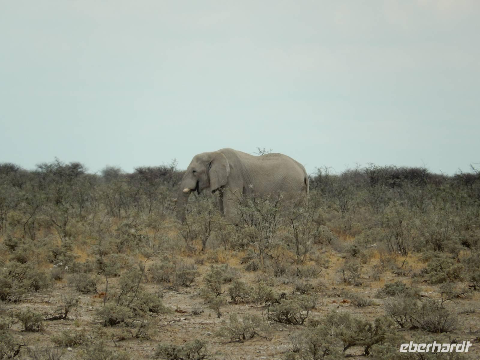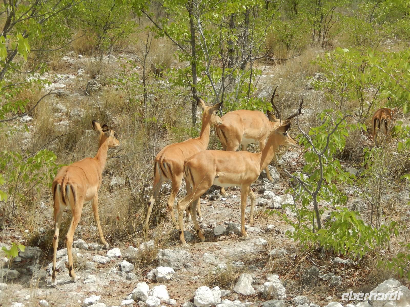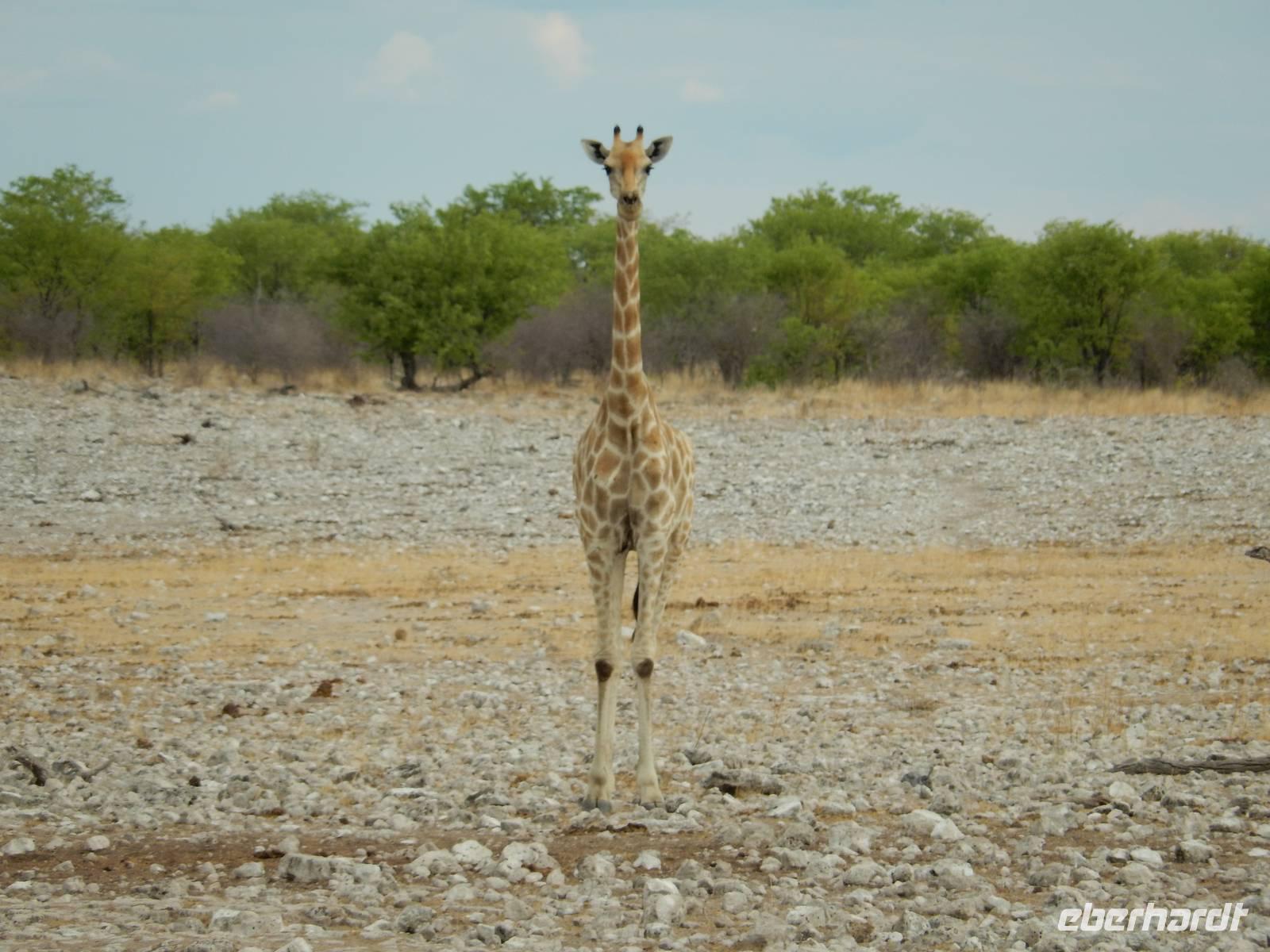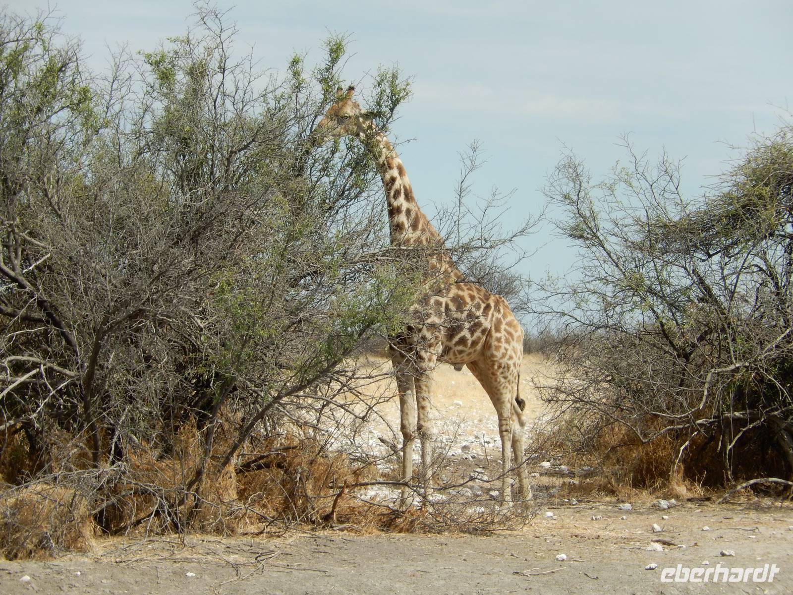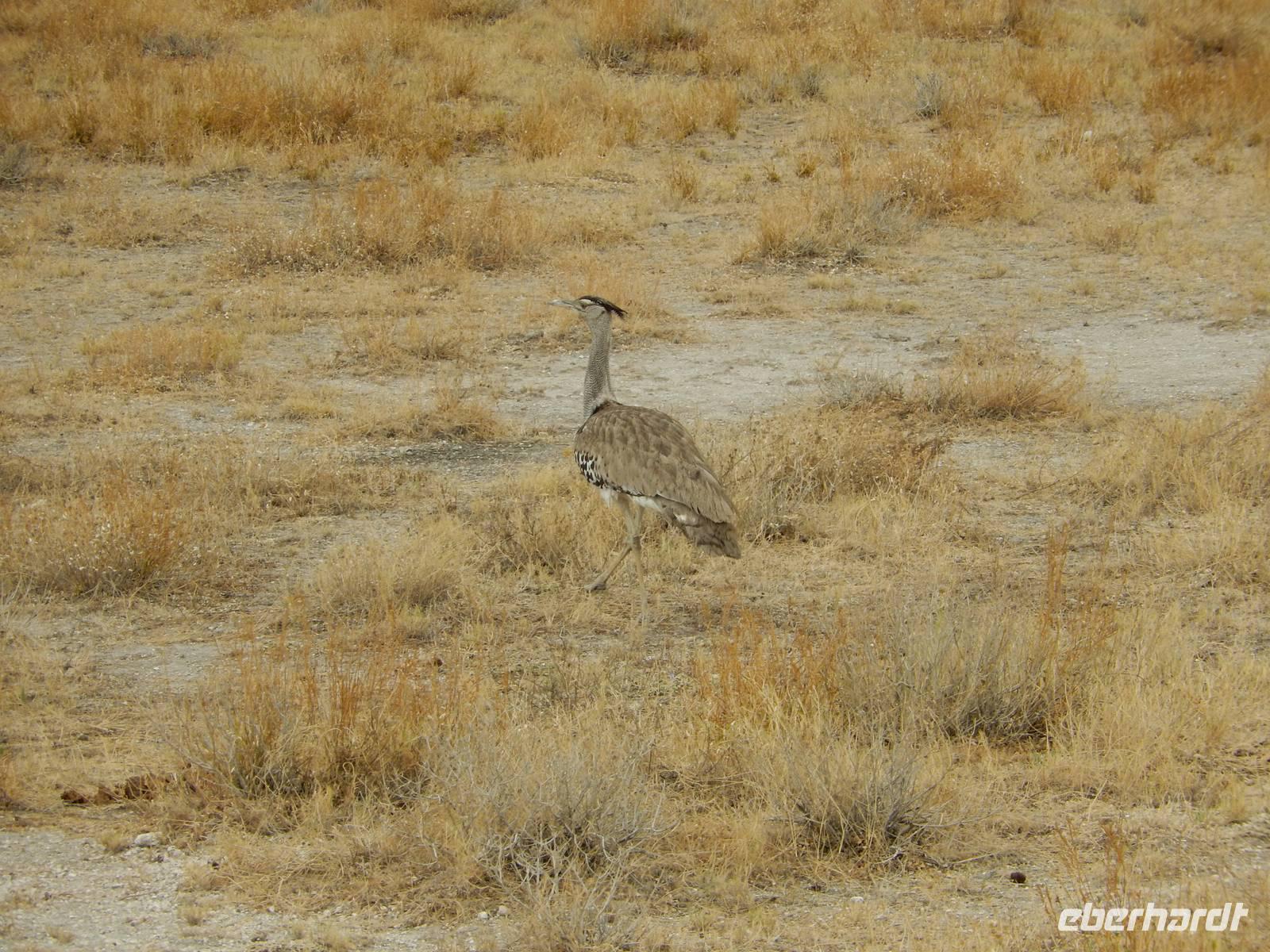 Und dann war der Tag perfekt: Giraffen schauten durch die lichten Bäume oder standen direkt vor unserem Bus auf der Straße, als aber dann ein grauer Dickhäuter neben unserem Bus stand, trauten wir unseren Augen kaum. Auf der weiteren Fahrt entlang der Etosha-Pfanne trafen wir noch auf eine Riesentrappe, eine Gackeltrappe, auf Steinböckchen, einen Schabrackenschakal, ein Weißbürzel-Singhabicht drehte seine Kreise und eine Kuduherde ließ sich auch noch sehen.