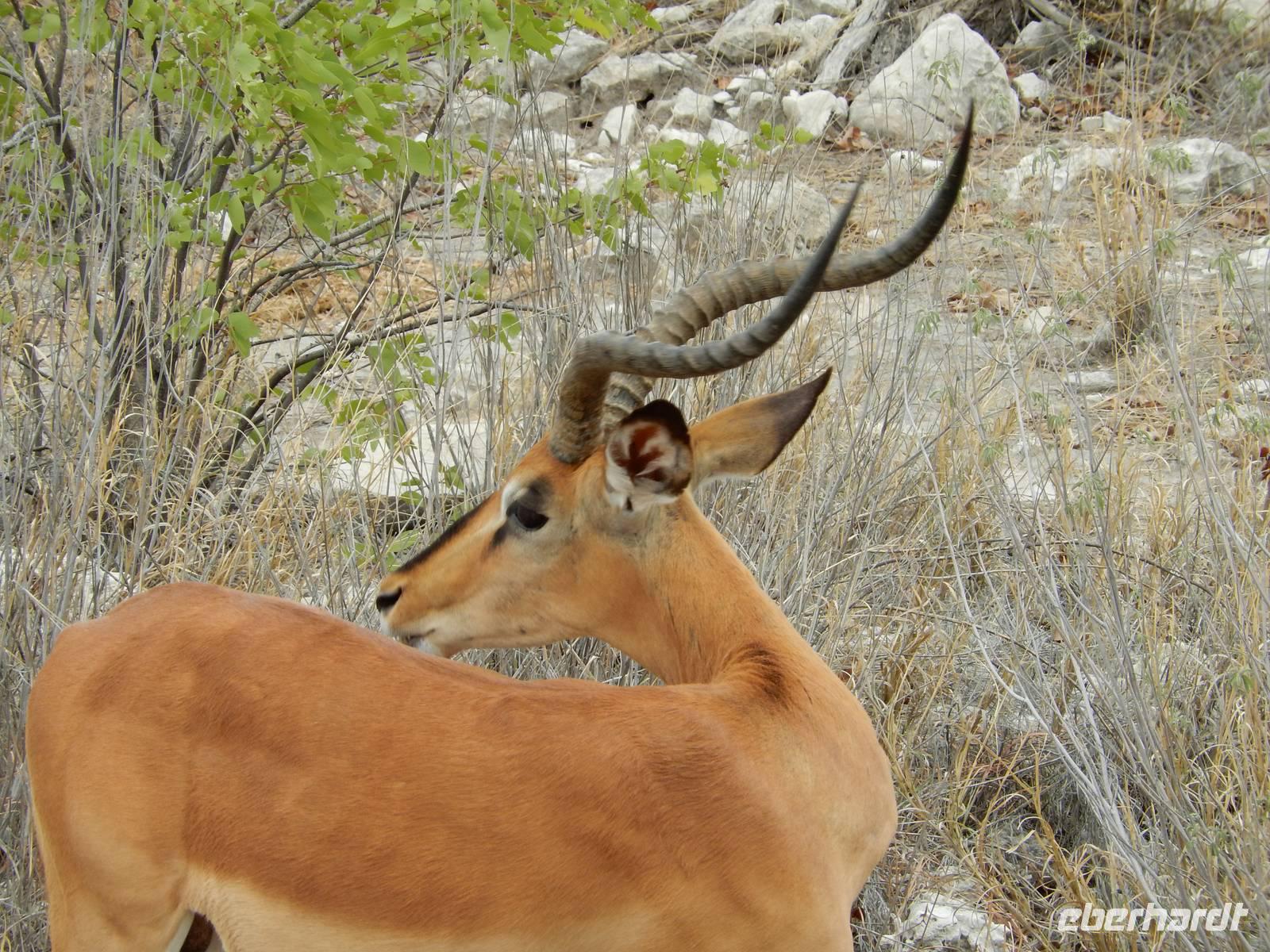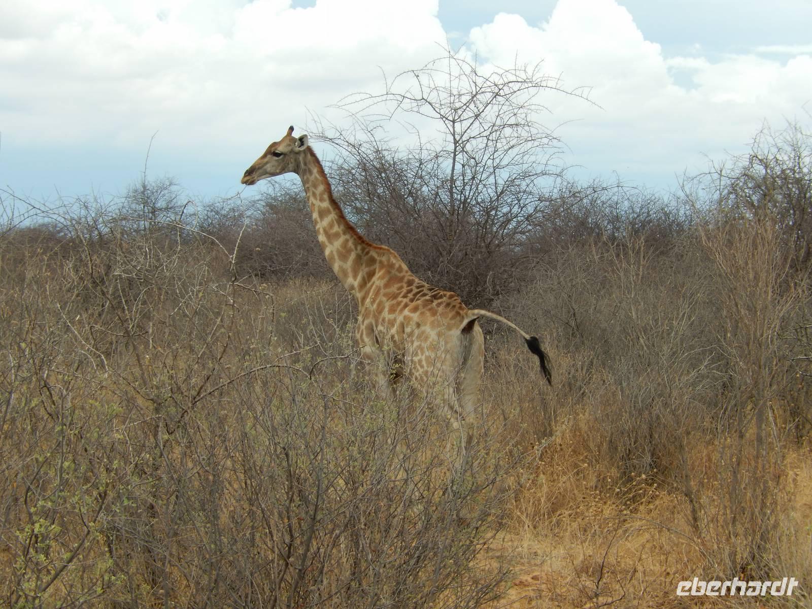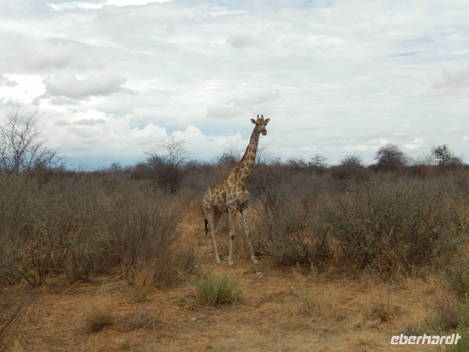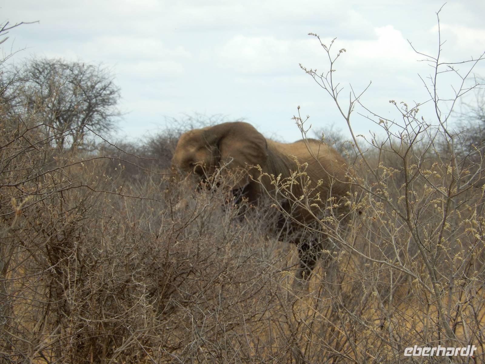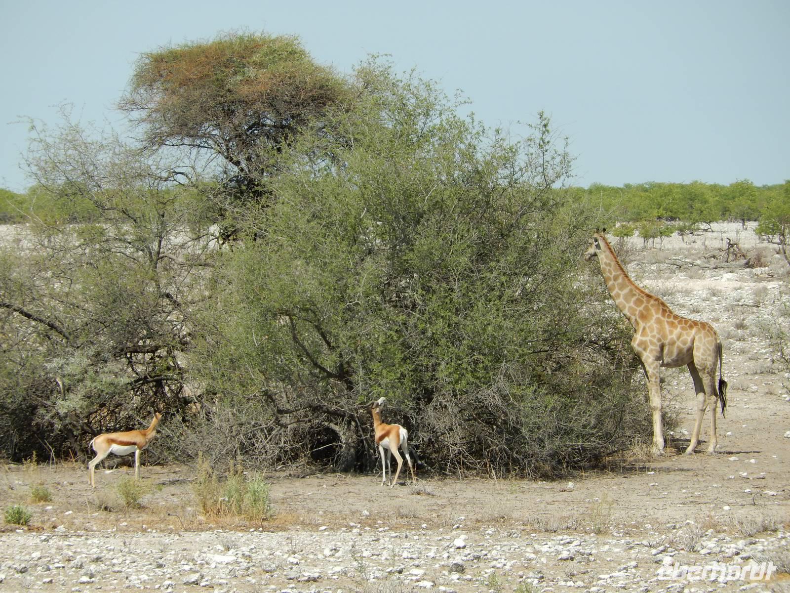Und dann war der Tag perfekt: Giraffen schauten durch die lichten Bäume oder standen direkt vor unserem Bus auf der Straße, als aber dann ein grauer Dickhäuter neben unserem Bus stand, trauten wir unseren Augen kaum. Auf der weiteren Fahrt entlang der Etosha-Pfanne trafen wir noch auf eine Riesentrappe, eine Gackeltrappe, auf Steinböckchen, einen Schabrackenschakal, ein Weißbürzel-Singhabicht drehte seine Kreise und eine Kuduherde ließ sich auch noch sehen.