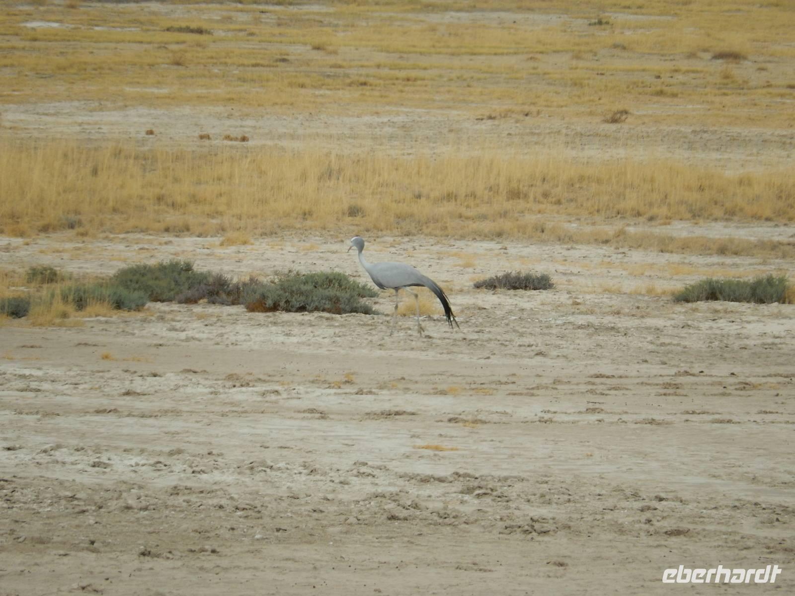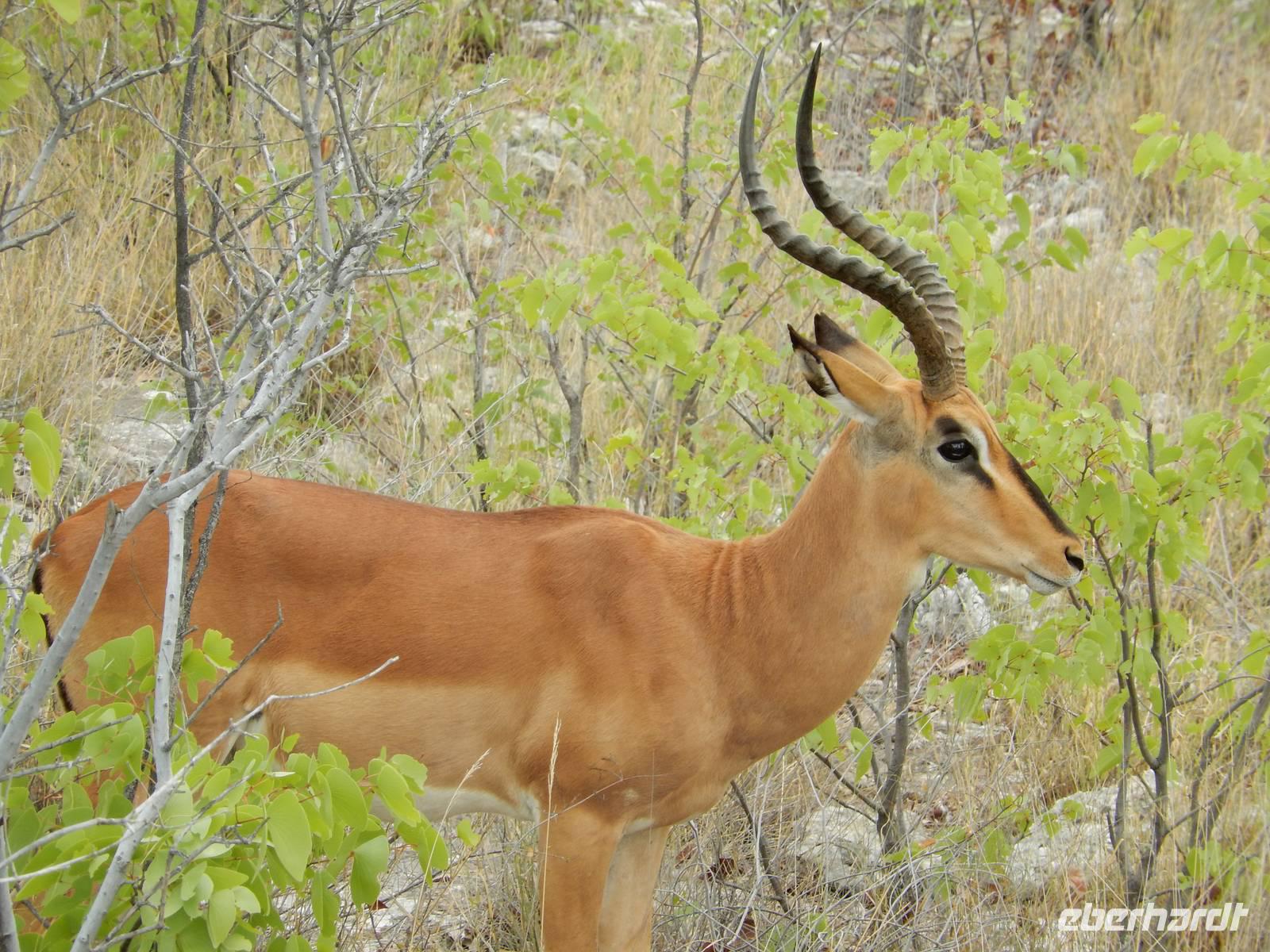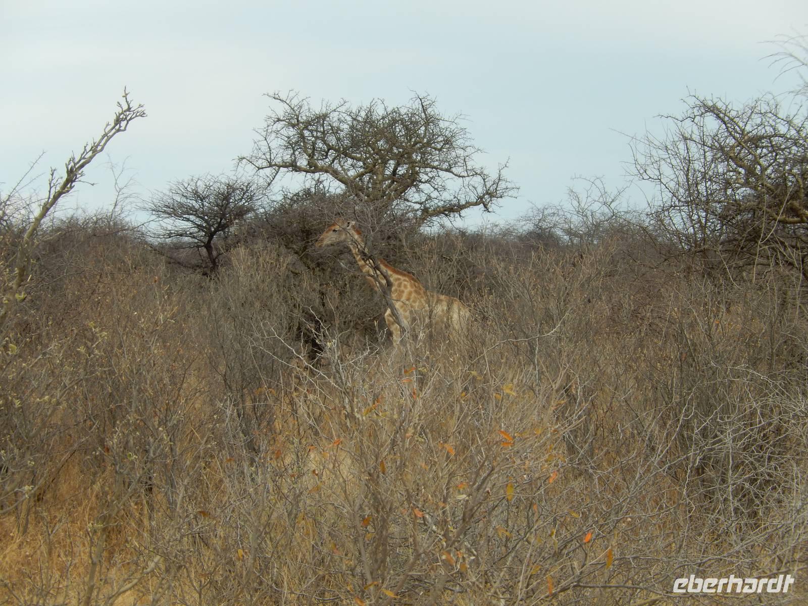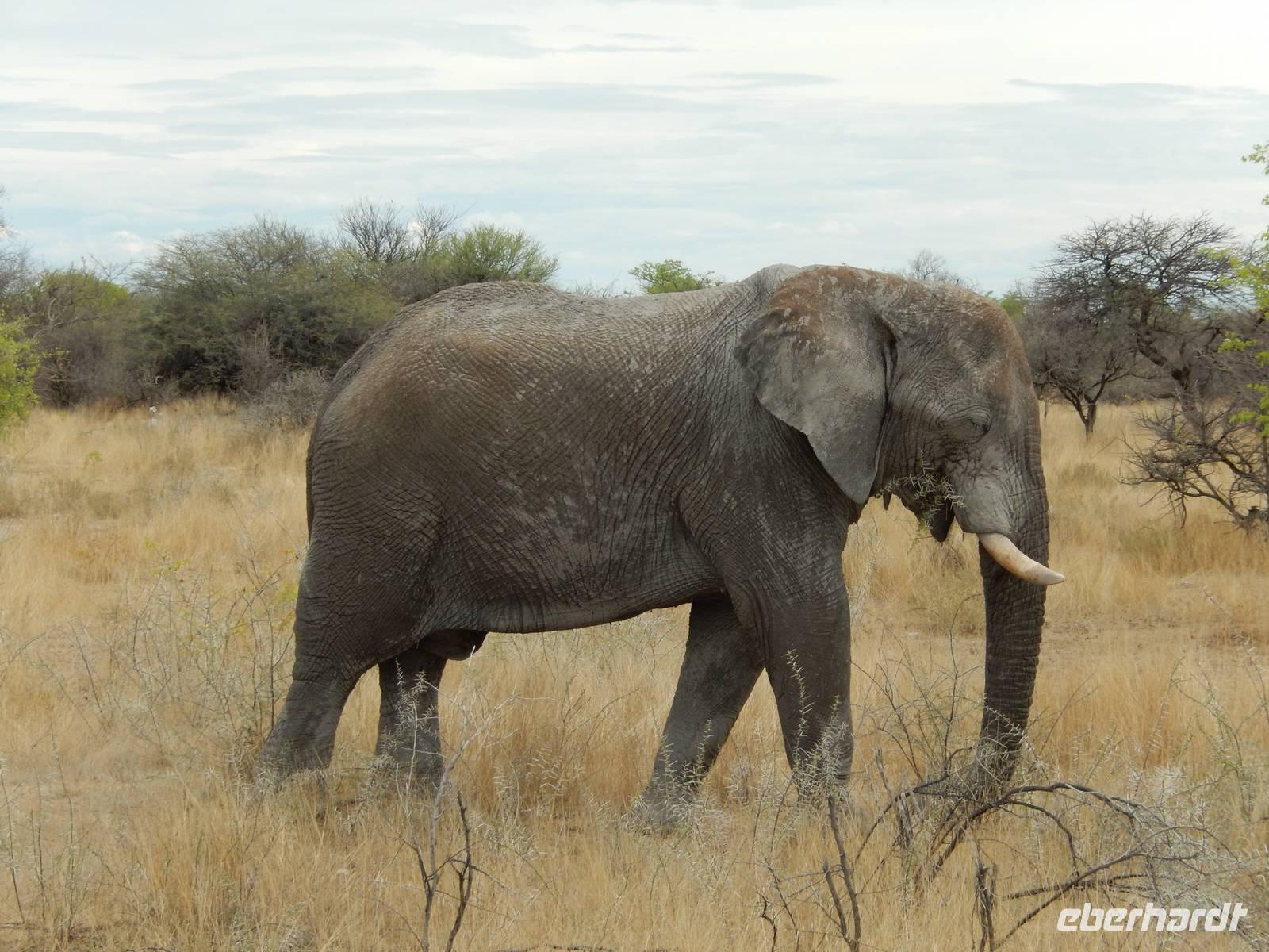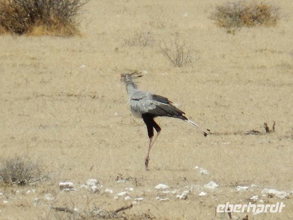 Und dann war der Tag perfekt: Giraffen schauten durch die lichten Bäume oder standen direkt vor unserem Bus auf der Straße, als aber dann ein grauer Dickhäuter neben unserem Bus stand, trauten wir unseren Augen kaum. Auf der weiteren Fahrt entlang der Etosha-Pfanne trafen wir noch auf eine Riesentrappe, eine Gackeltrappe, auf Steinböckchen, einen Schabrackenschakal, ein Weißbürzel-Singhabicht drehte seine Kreise und eine Kuduherde ließ sich auch noch sehen.