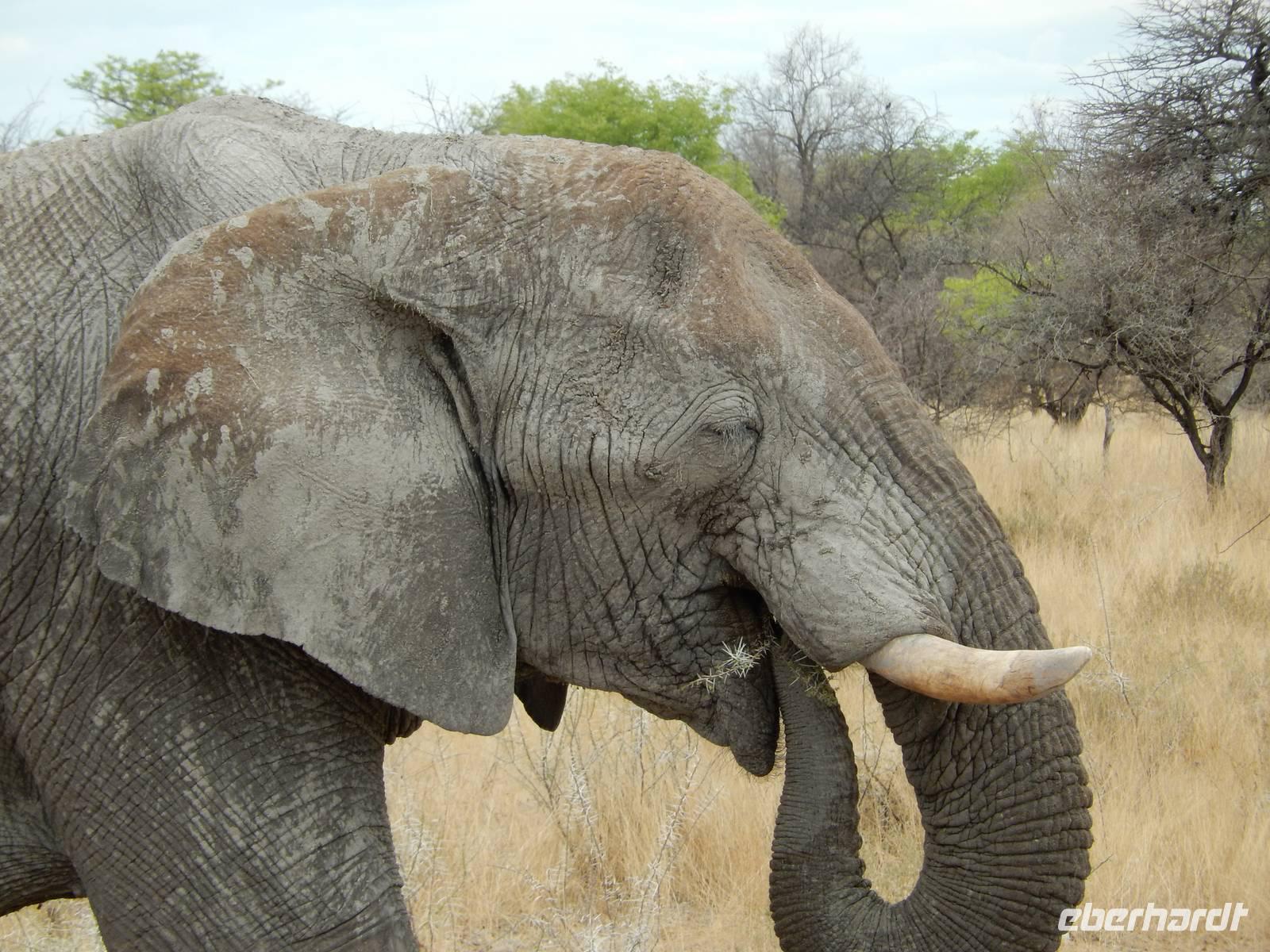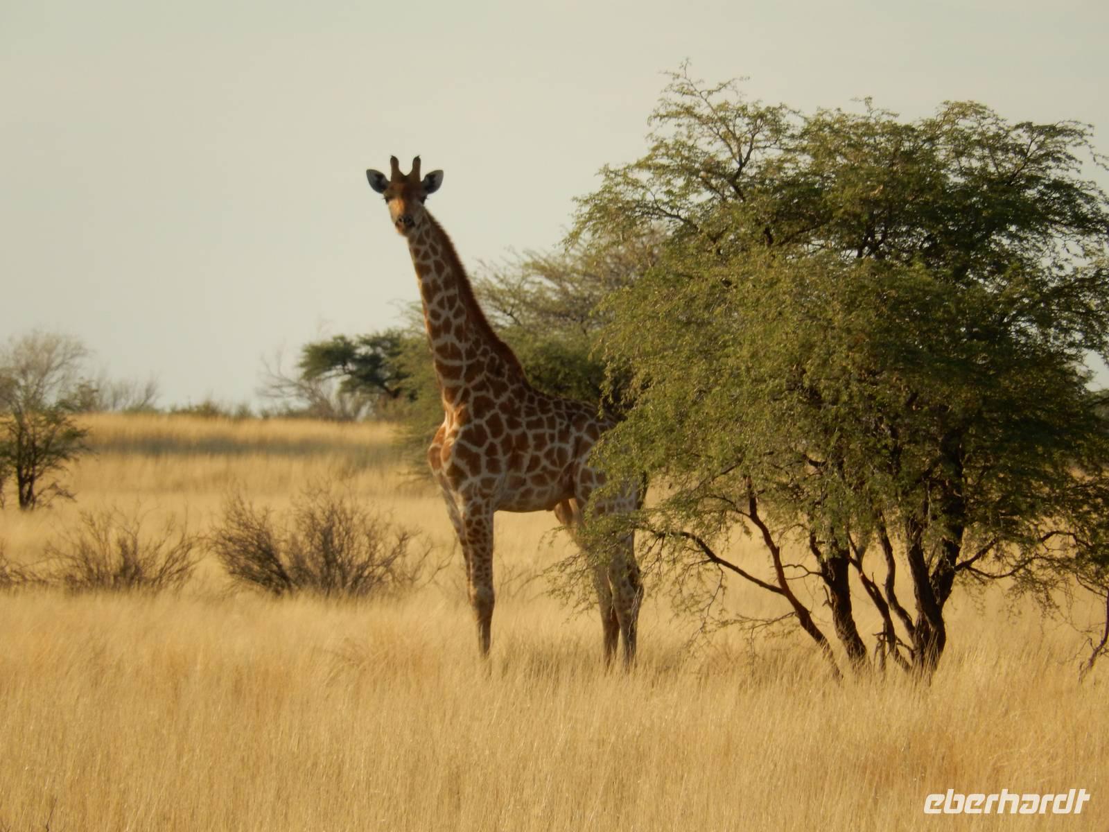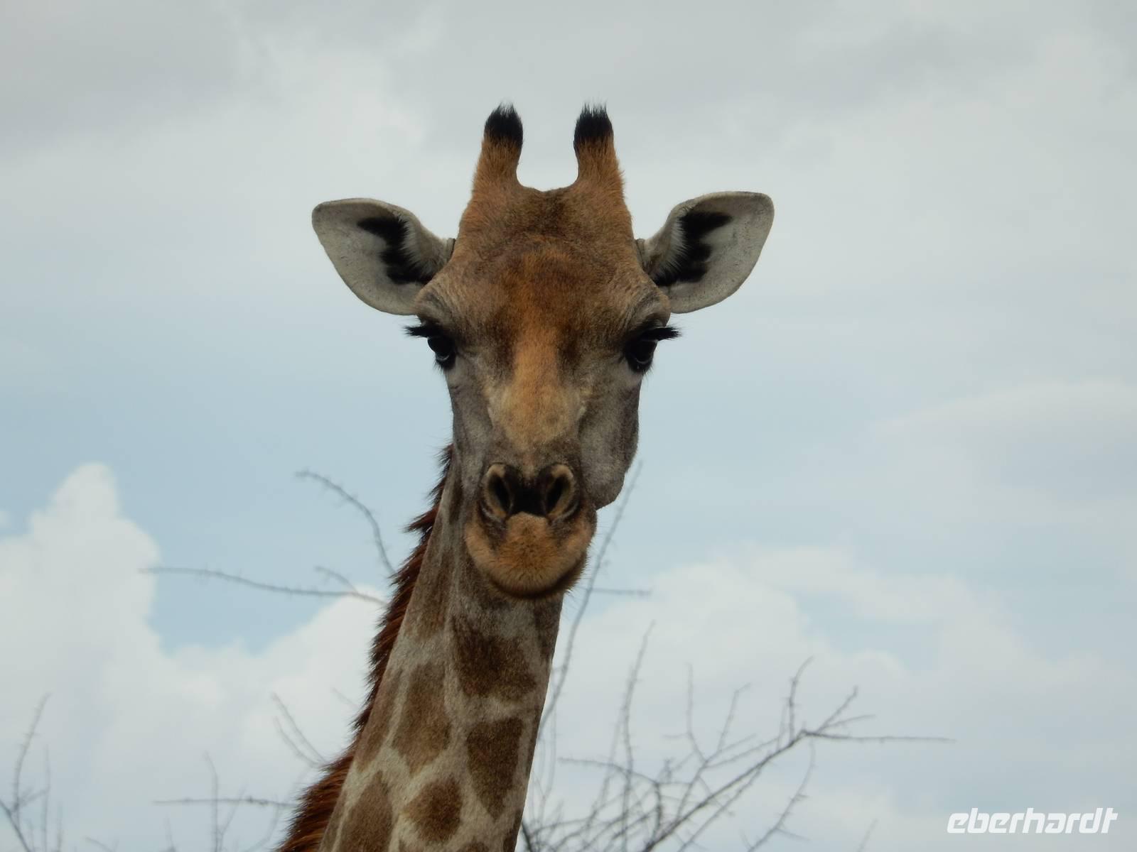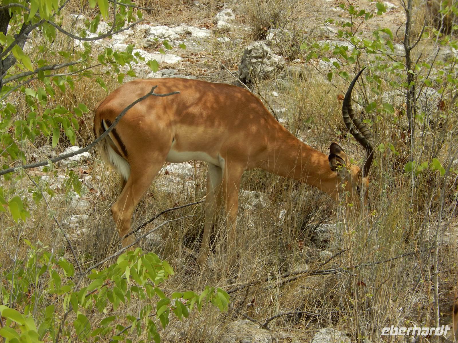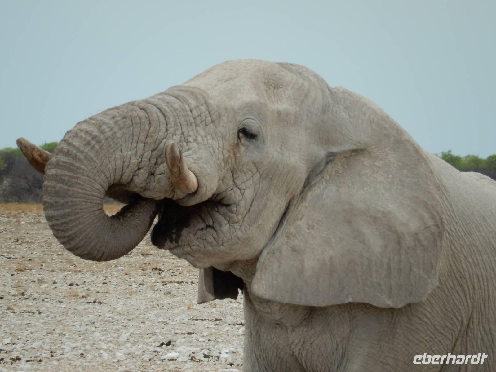 Und dann war der Tag perfekt: Giraffen schauten durch die lichten Bäume oder standen direkt vor unserem Bus auf der Straße, als aber dann ein grauer Dickhäuter neben unserem Bus stand, trauten wir unseren Augen kaum. Auf der weiteren Fahrt entlang der Etosha-Pfanne trafen wir noch auf eine Riesentrappe, eine Gackeltrappe, auf Steinböckchen, einen Schabrackenschakal, ein Weißbürzel-Singhabicht drehte seine Kreise und eine Kuduherde ließ sich auch noch sehen.