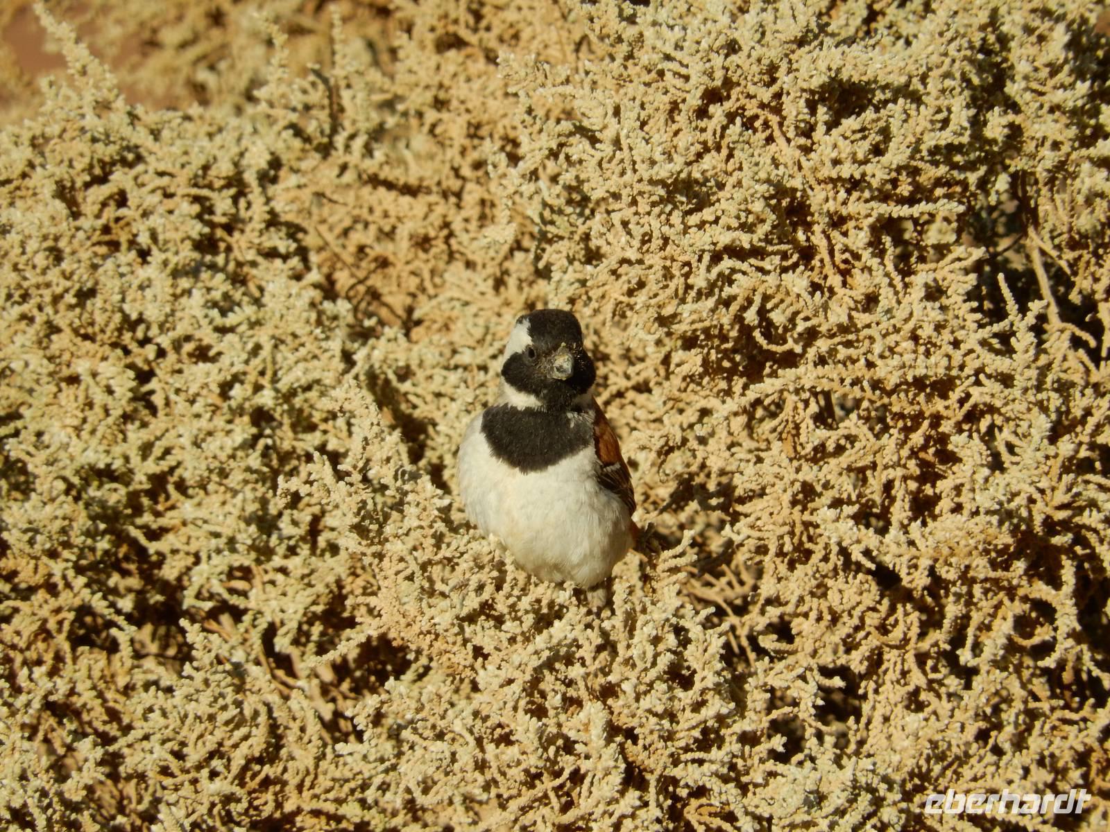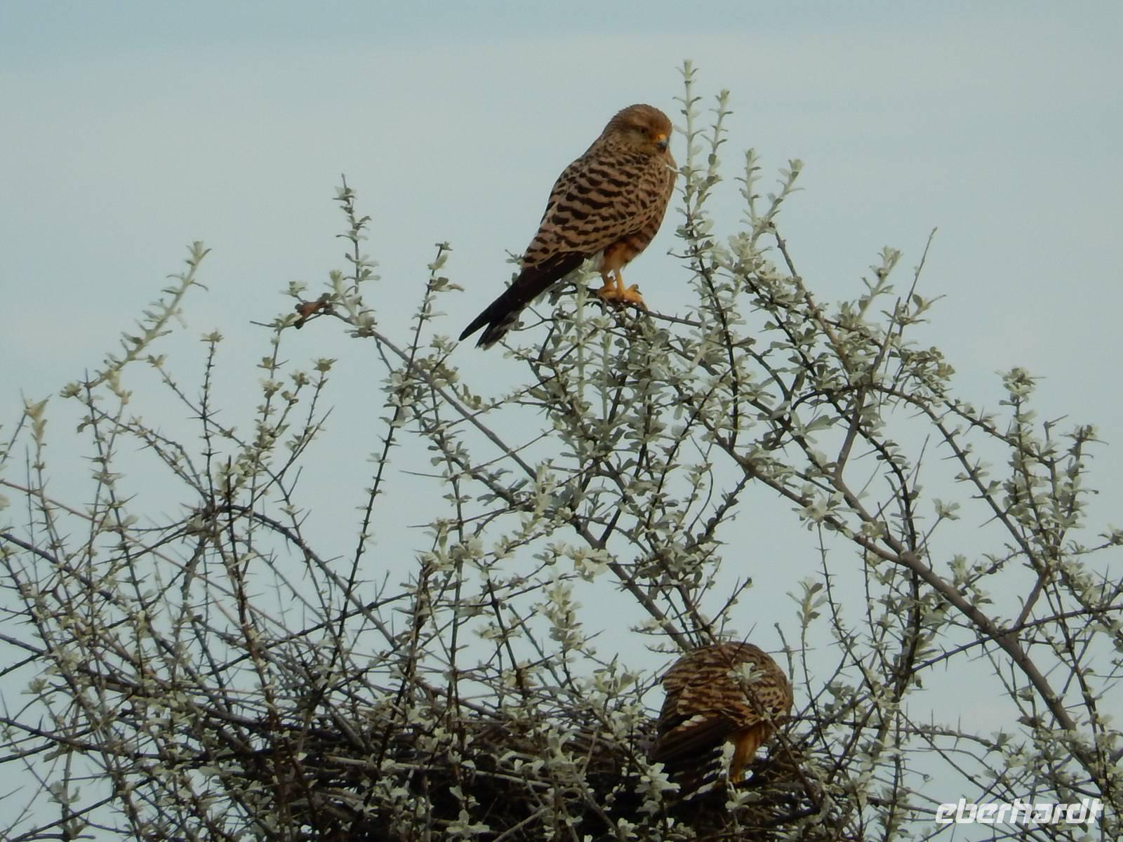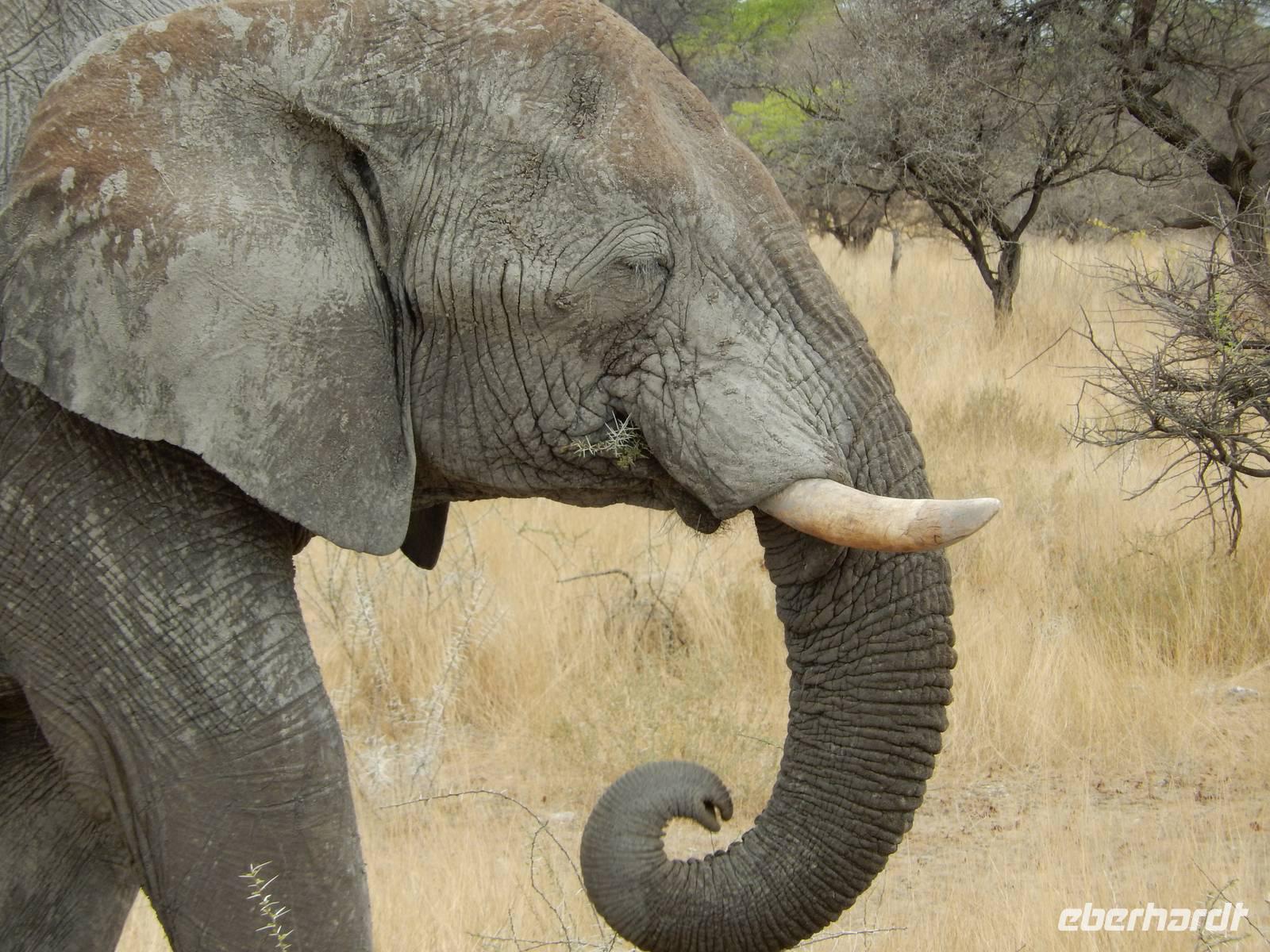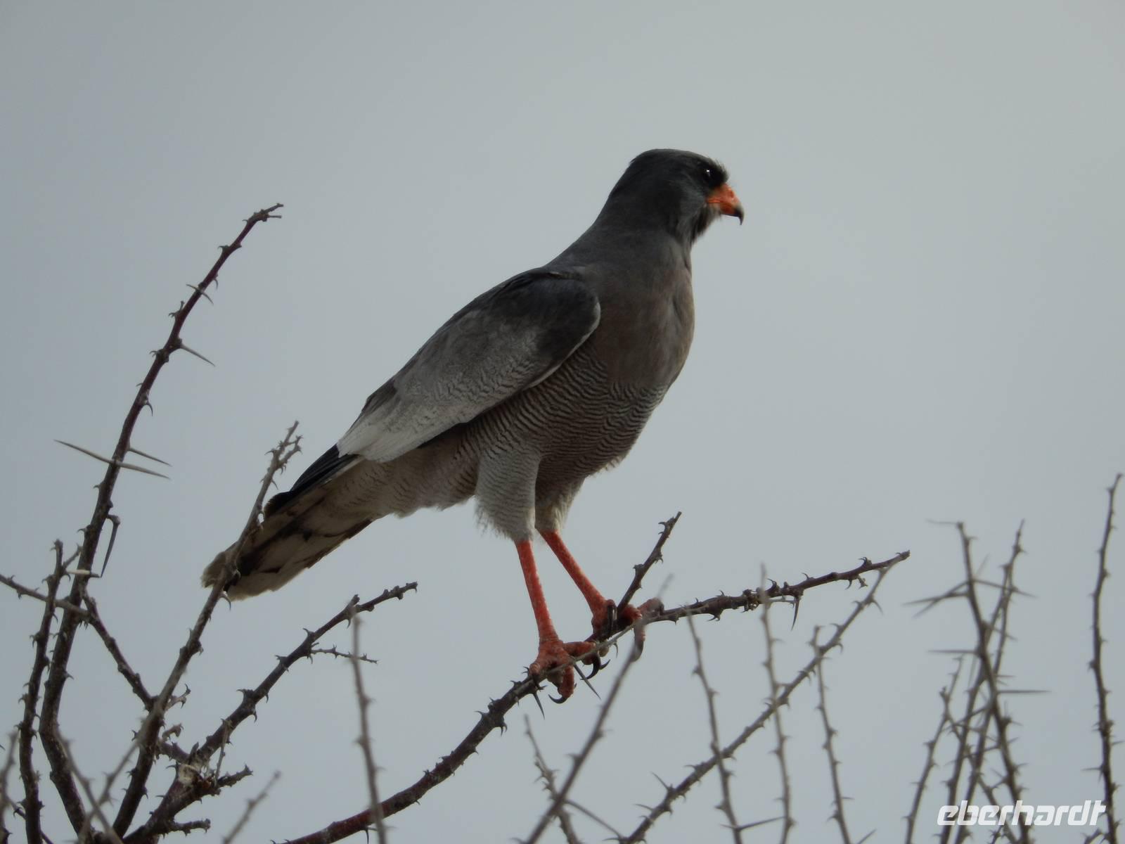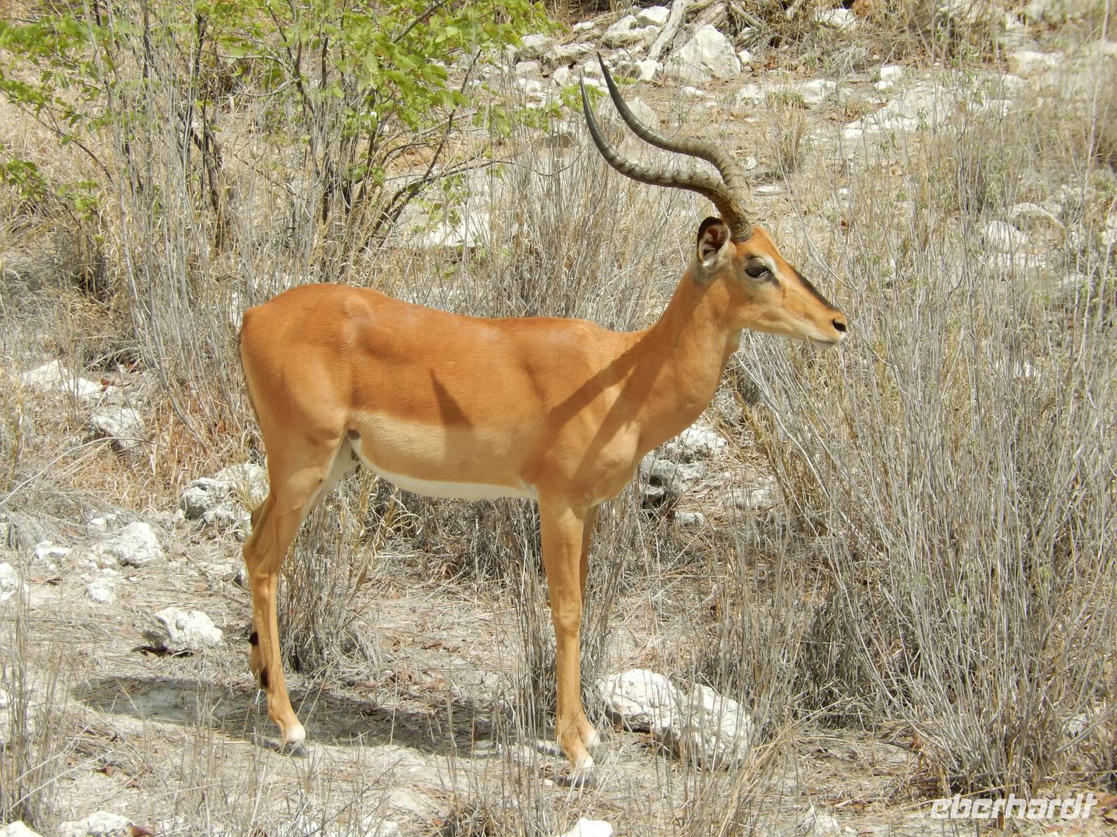 Und dann war der Tag perfekt: Giraffen schauten durch die lichten Bäume oder standen direkt vor unserem Bus auf der Straße, als aber dann ein grauer Dickhäuter neben unserem Bus stand, trauten wir unseren Augen kaum. Auf der weiteren Fahrt entlang der Etosha-Pfanne trafen wir noch auf eine Riesentrappe, eine Gackeltrappe, auf Steinböckchen, einen Schabrackenschakal, ein Weißbürzel-Singhabicht drehte seine Kreise und eine Kuduherde ließ sich auch noch sehen.
