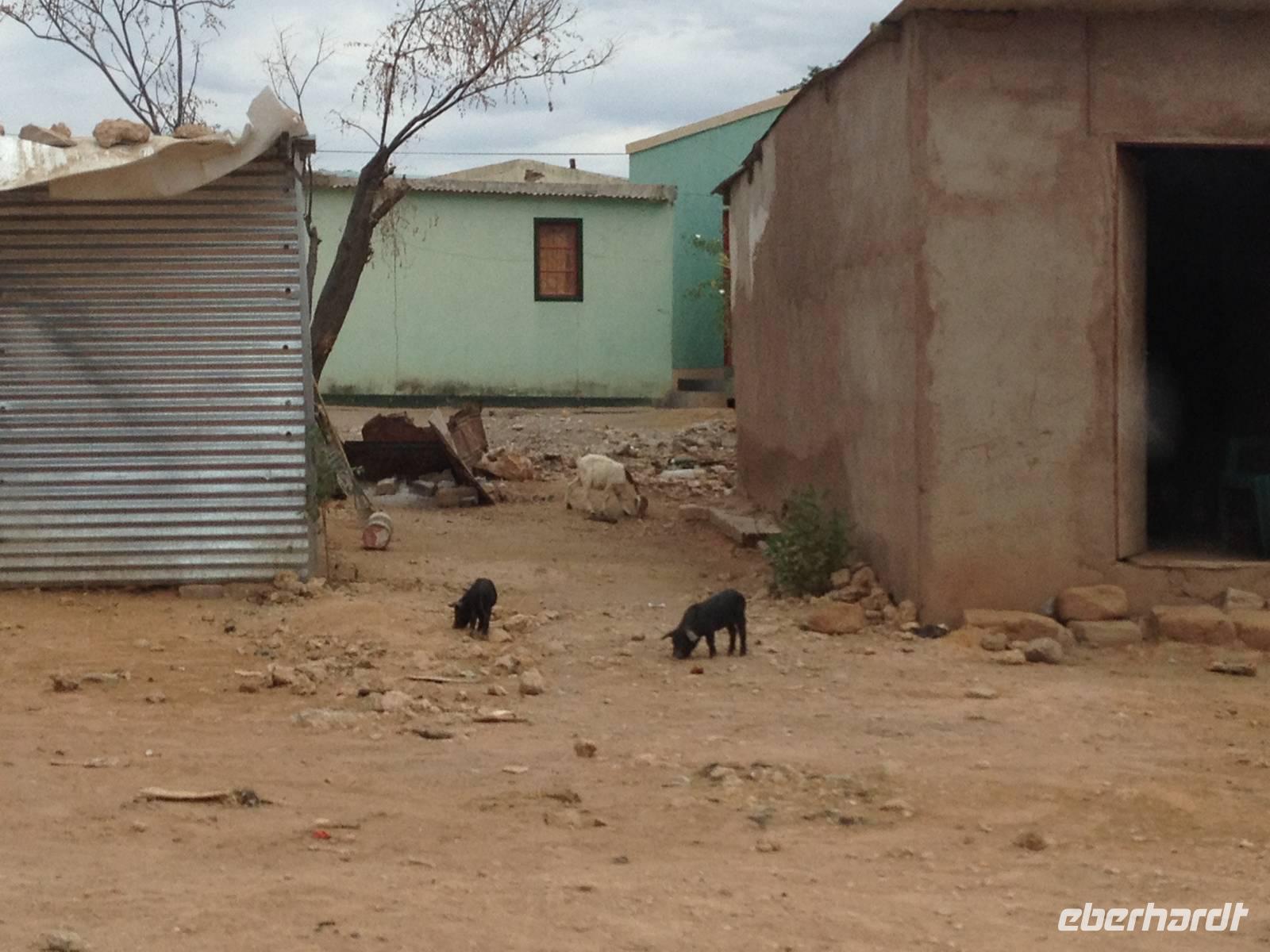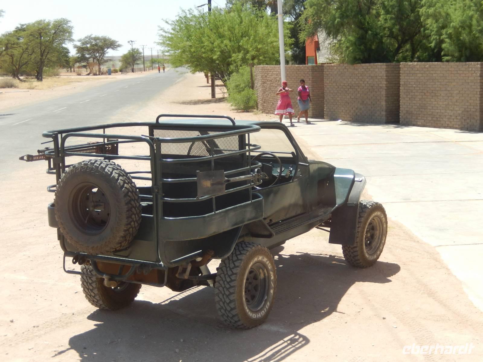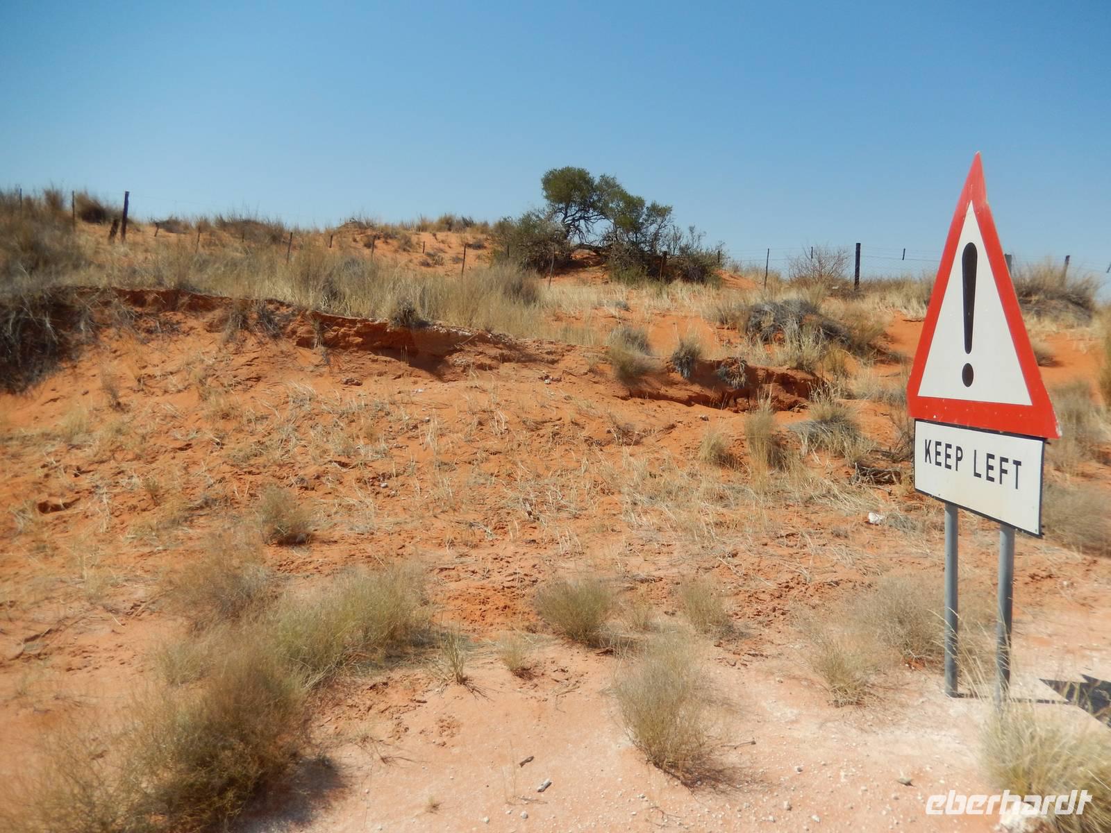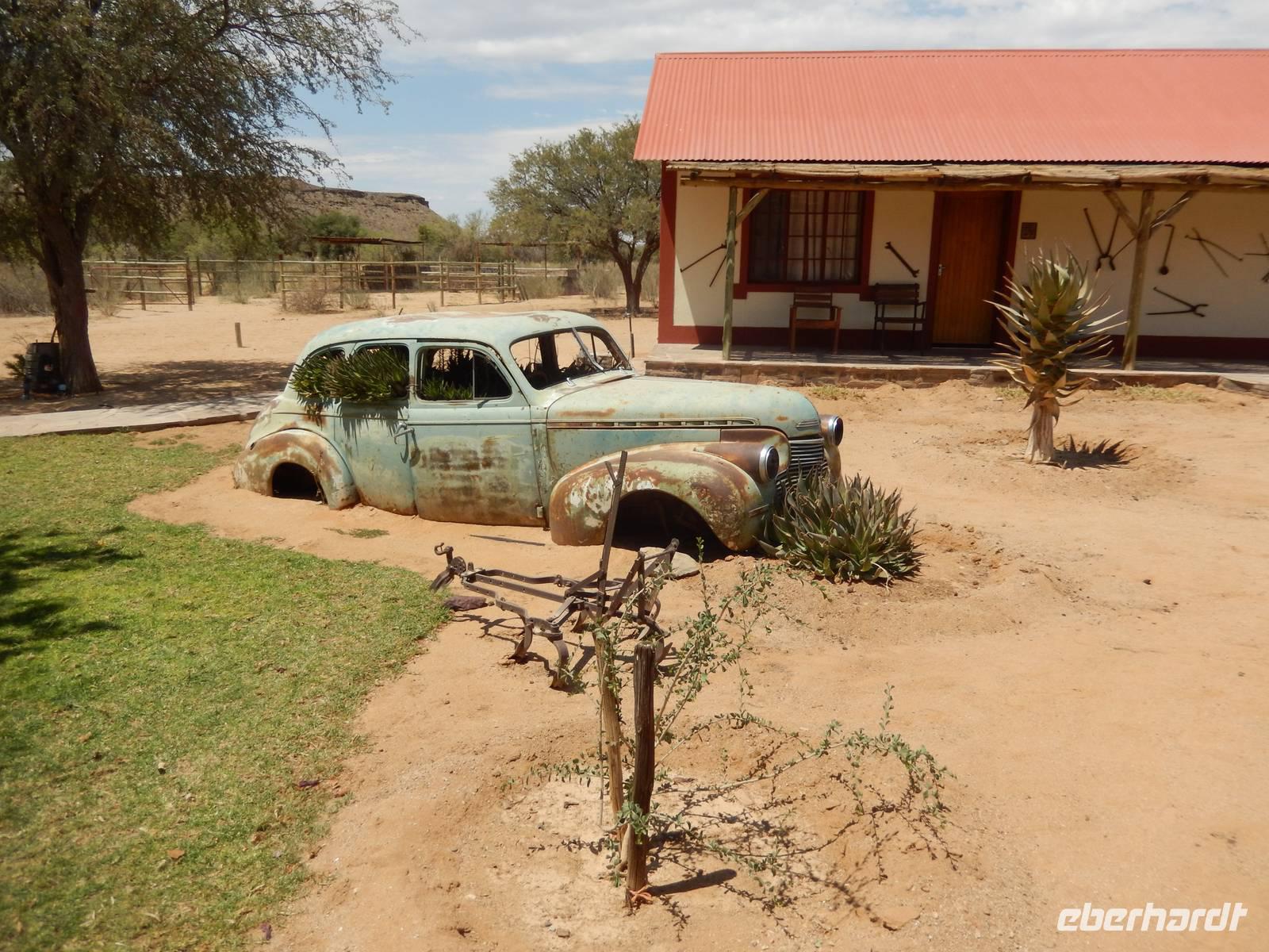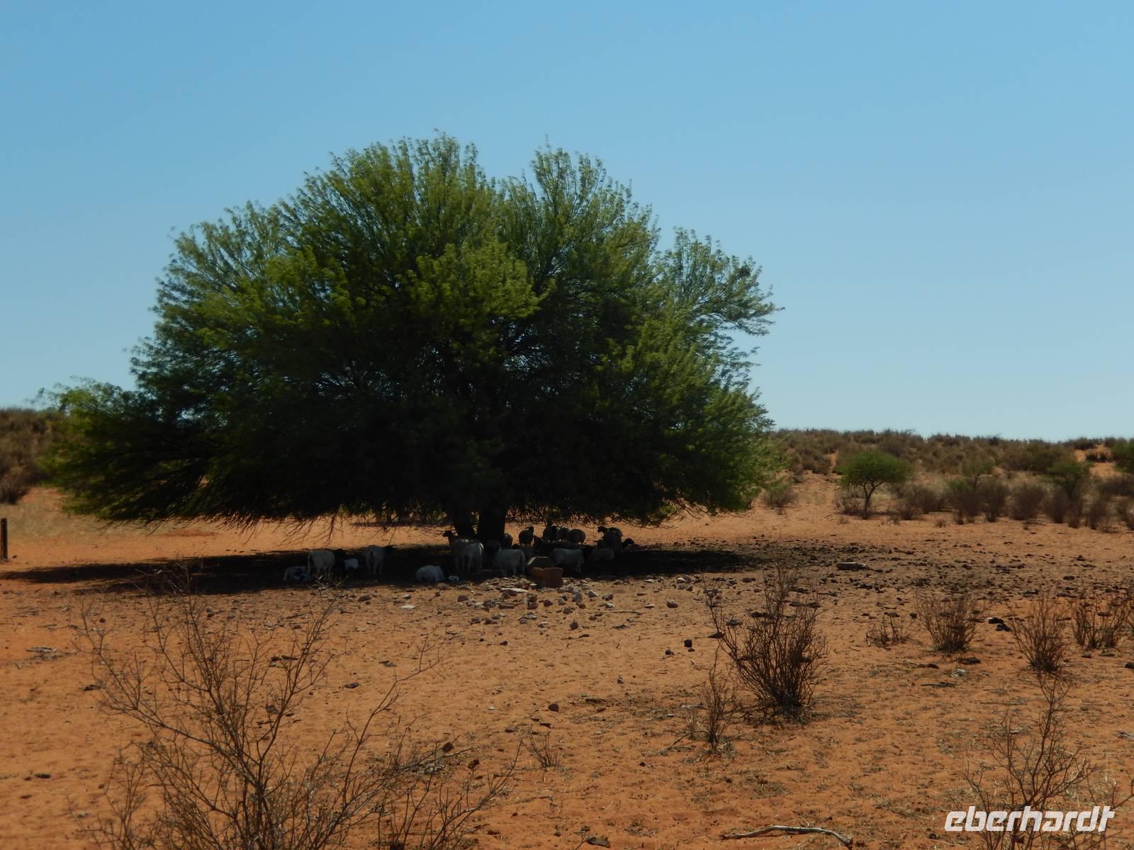 Die südafrikanische Sonne begrüßte uns auch an diesem Tag wieder und so setzten wir unsere Reise weiter in Richtung Süden fort. Über die Schotterpiste geht es überwiegend am Auob-Flusstal entlang. Links und rechts bilden die roten Sanddünen der Kalahari einen beeindruckenden Kontrast zu der Landschaft im ehemaligen Flussbett, das von weißem Kalkstein geprägt ist. Die teilweise doch recht grüne und üppige Vegetation auf den sanften Dünen ergeben ein tolles Bild! Auf der Fahrt sehen wir einige Herden der Karakulschafe, eine Steppenschafrasse, die ursprünglich in Usbekistan beheimatet war und jetzt auch in Namibia viel gehalten wird. Während wir die immer wieder wechselnde Landschaft an uns vorüberziehen ließen, erzählte uns Claus immer wieder interessante Dinge über seine Heimat. Für unsere kleine Pause wollten wir in der traditionellen Nama-Siedlung Koes in einem Kaffee halten, doch das war uns alles nicht so recht geheuer und somit stoppten wir am einzigen Hotel des Ortes für eine kleine Erfrischung.