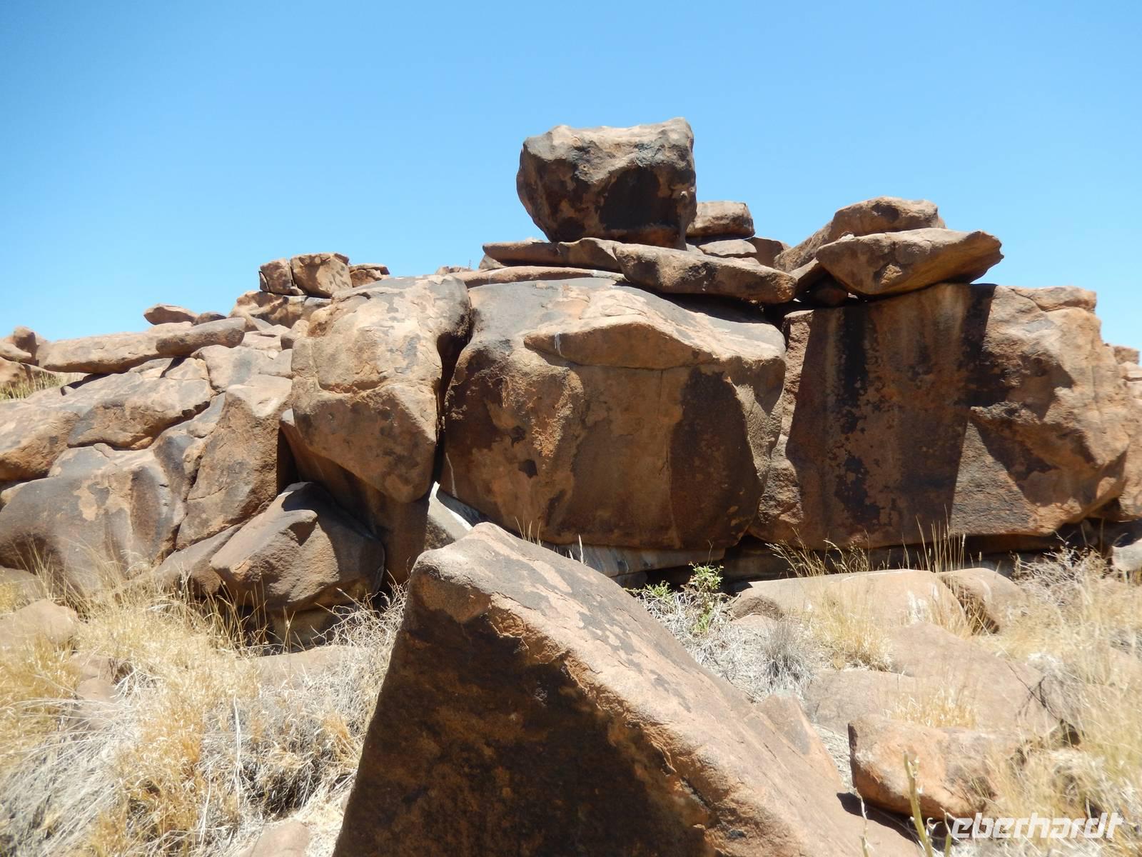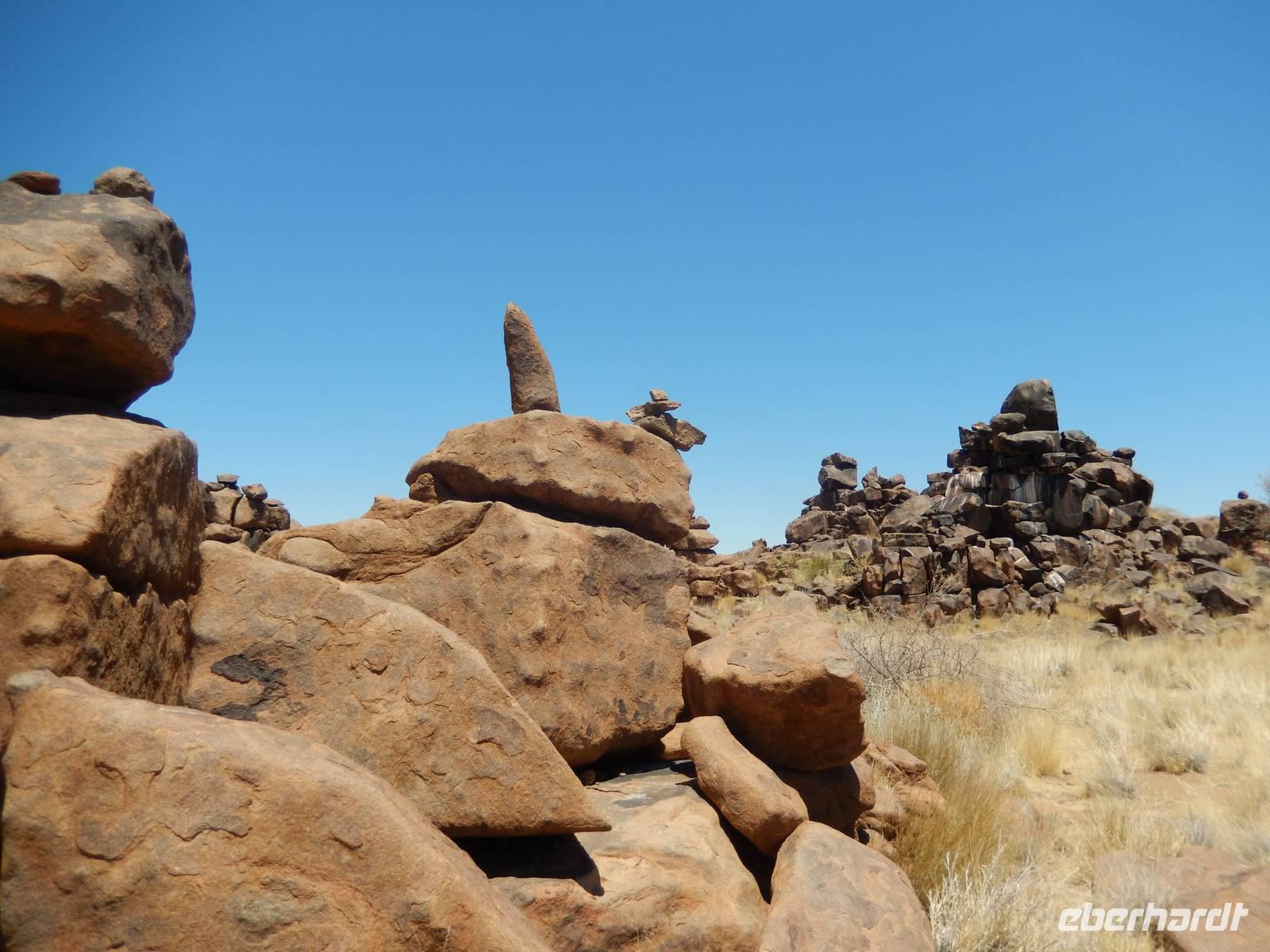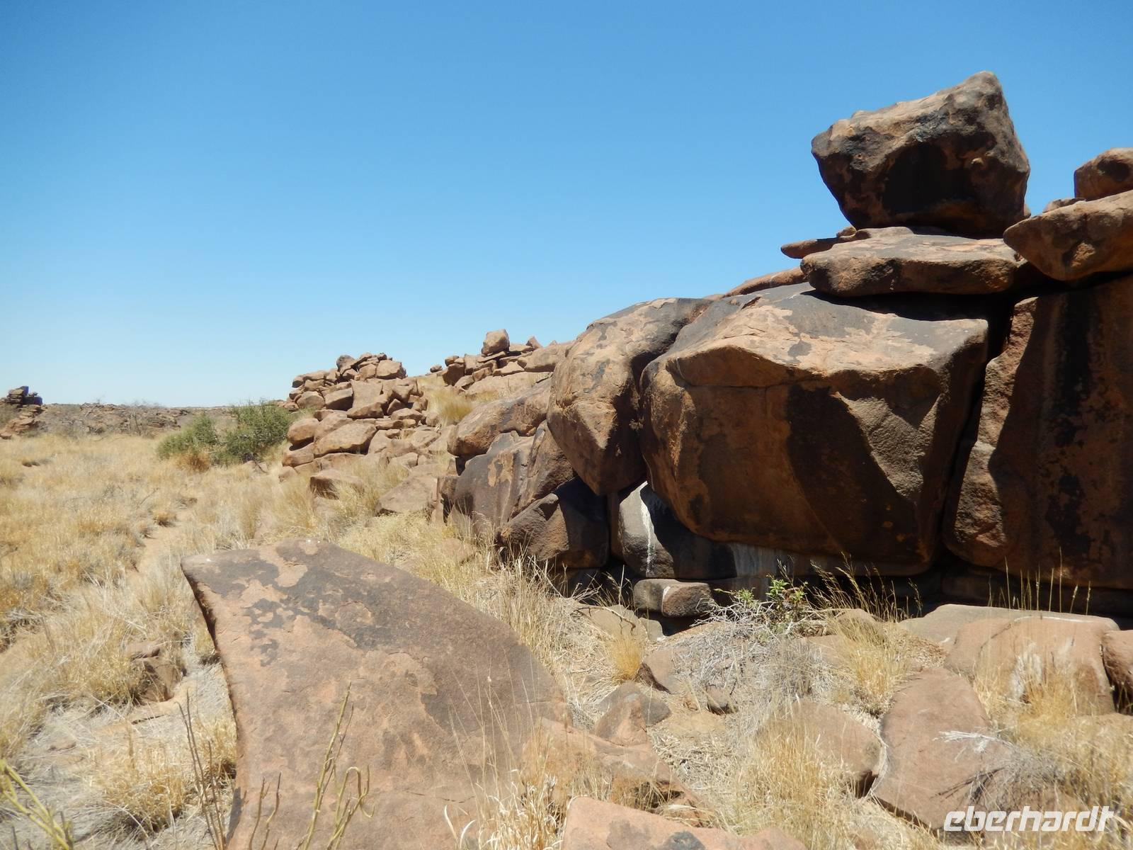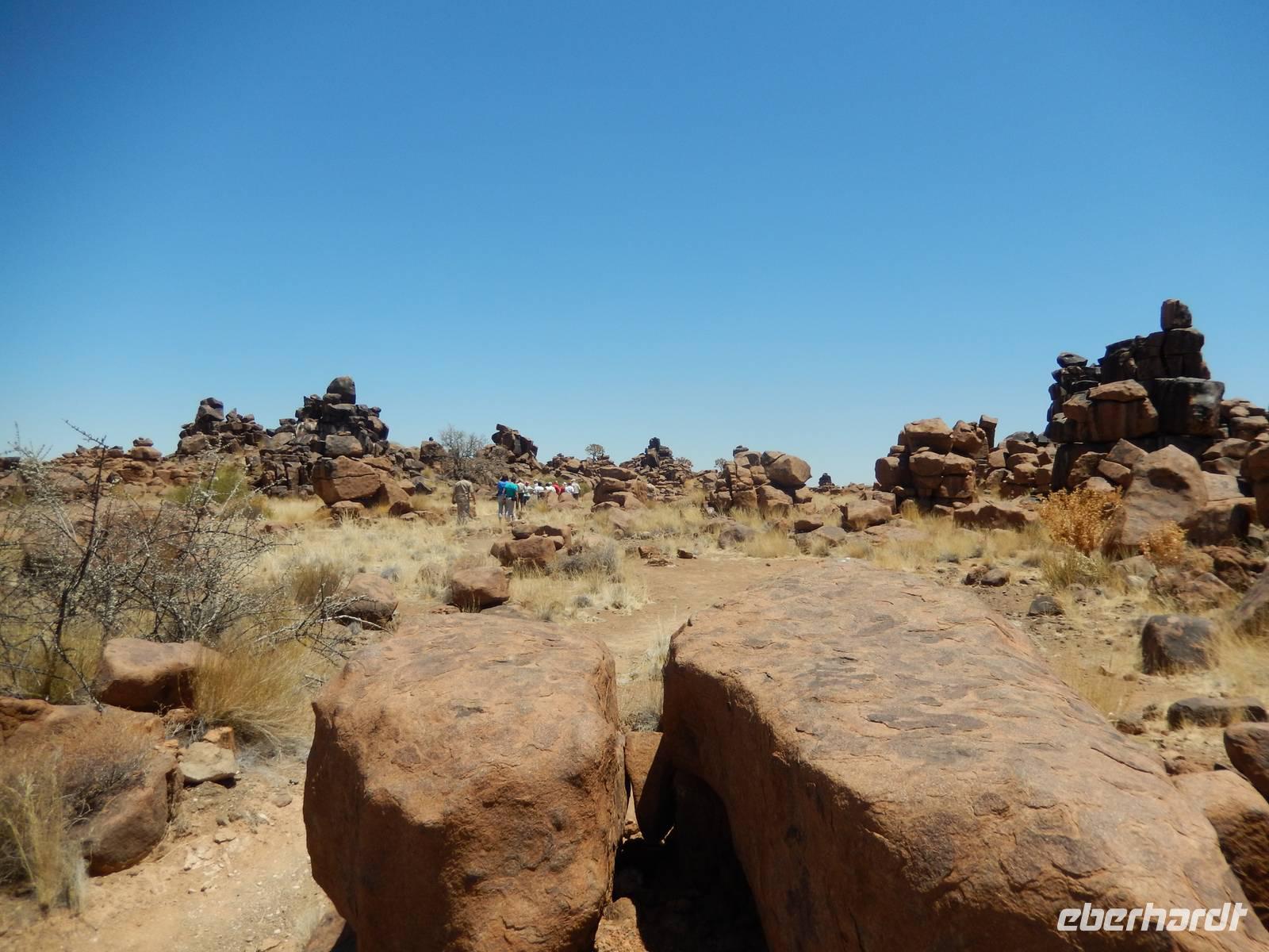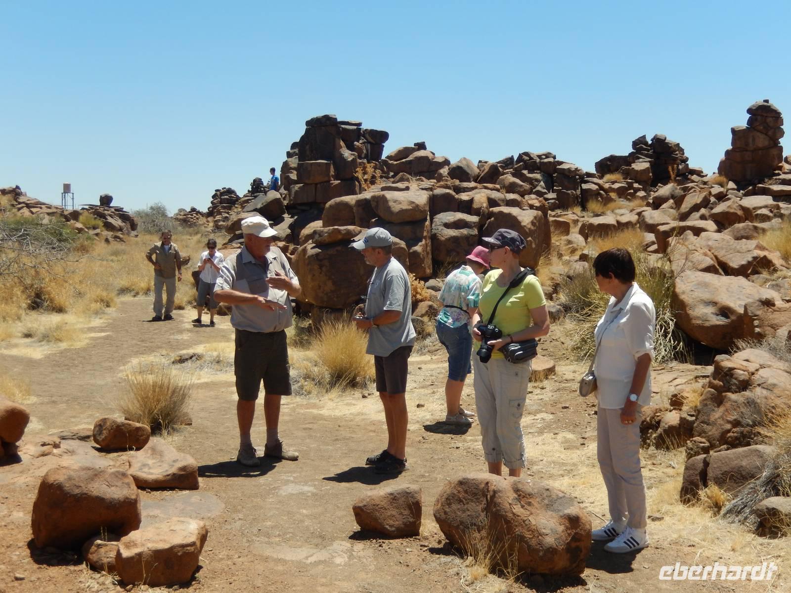 Entlang einer riesigen Kalkpfanne bei Koes führte uns der Weg weiter durch das Nama-Karoo-Becken zum "Spielplatz der Riesen" kurz vor Keetmanshoop. Wie eine zufällig umgekippte Lego-Kiste liegen hier, auf 5 km verstreut, größere Steinfelsen wahllos aufeinander getürmt. Die Formationen aus Doleritgestein muten wie ein faszinierendes Riesenpuzzle aus ungleichmäßigen Bausteinen an. Das Alter der mächtigen Steine wird auf ca. 180 Mio. Jahre geschätzt. Mit Claus spazierten wir auf einem Rundweg durch die Felsformationen, die durch den Sandschliff auf Hochglanz poliert wurden und nun in der Sonne glänzten. Besonders schön anzusehen waren die immer wieder dazwischenstehenden Köcherbäume.