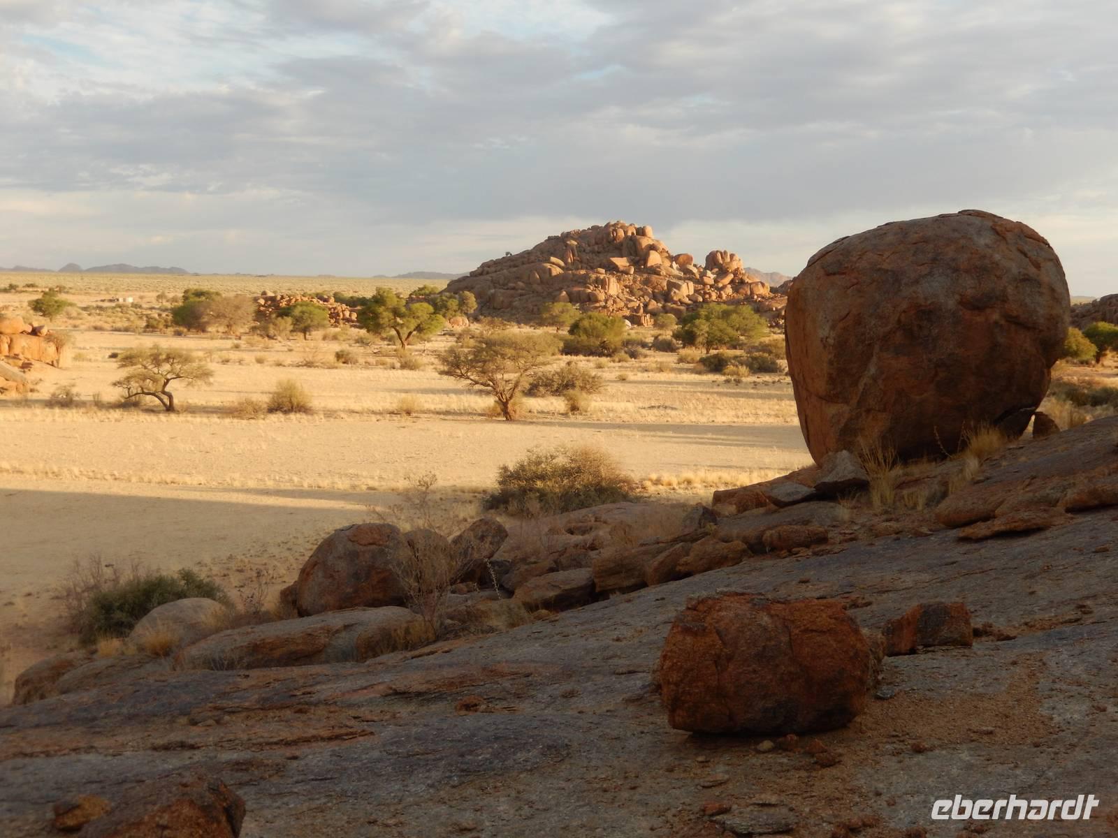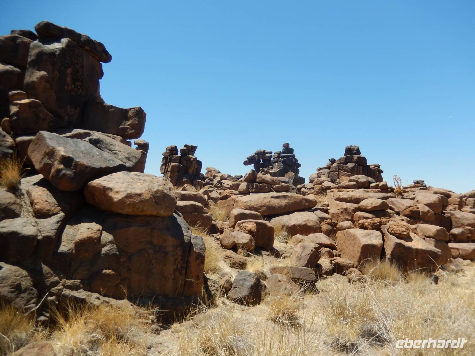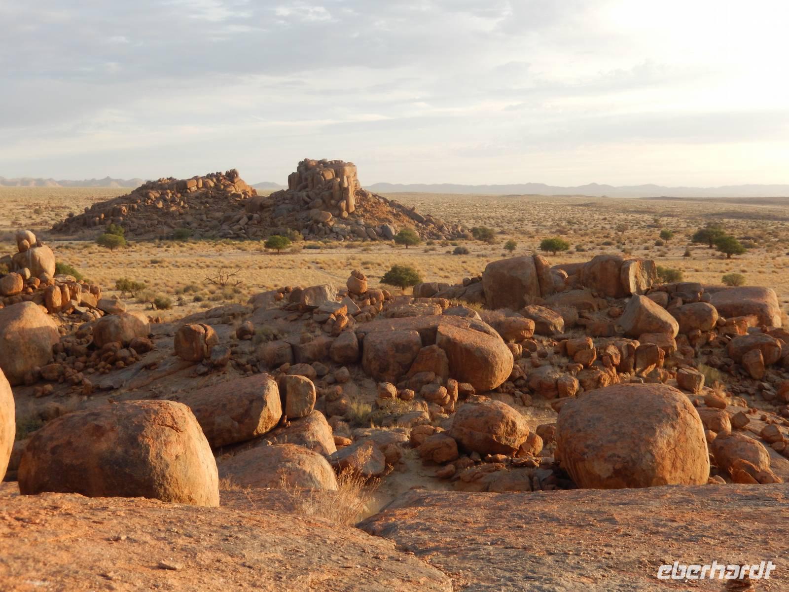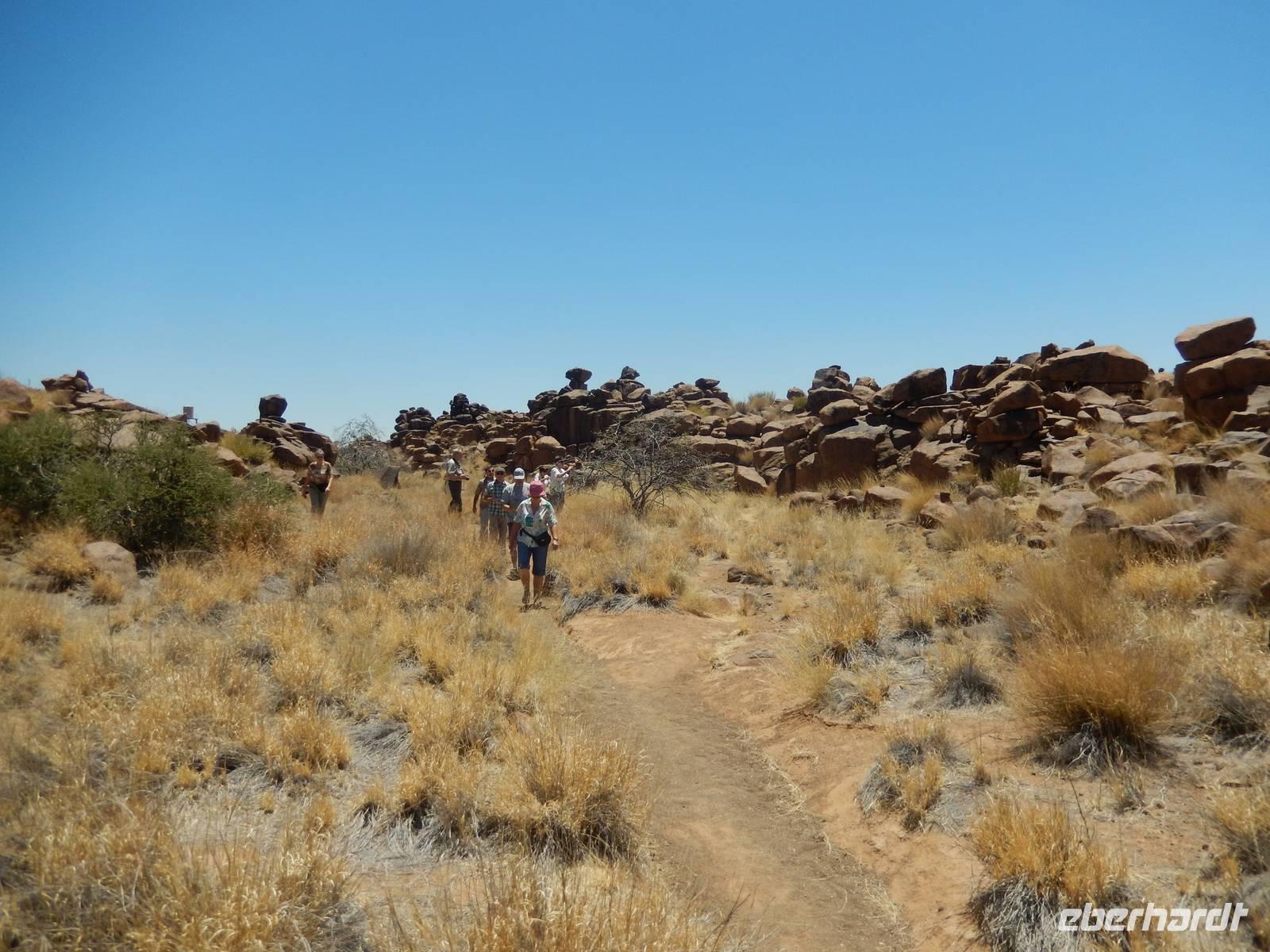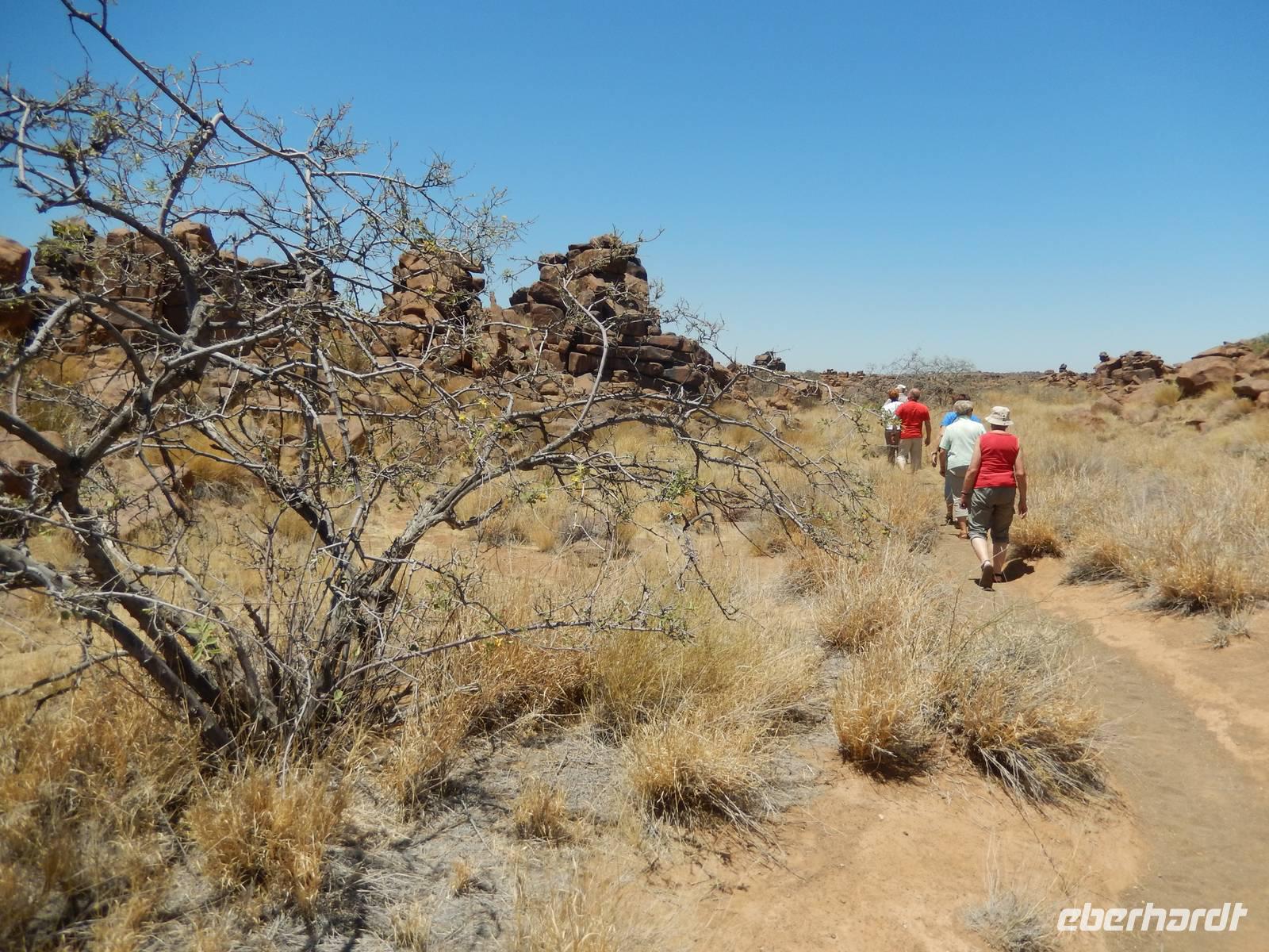 Entlang einer riesigen Kalkpfanne bei Koes führte uns der Weg weiter durch das Nama-Karoo-Becken zum "Spielplatz der Riesen" kurz vor Keetmanshoop. Wie eine zufällig umgekippte Lego-Kiste liegen hier, auf 5 km verstreut, größere Steinfelsen wahllos aufeinander getürmt. Die Formationen aus Doleritgestein muten wie ein faszinierendes Riesenpuzzle aus ungleichmäßigen Bausteinen an. Das Alter der mächtigen Steine wird auf ca. 180 Mio. Jahre geschätzt. Mit Claus spazierten wir auf einem Rundweg durch die Felsformationen, die durch den Sandschliff auf Hochglanz poliert wurden und nun in der Sonne glänzten. Besonders schön anzusehen waren die immer wieder dazwischenstehenden Köcherbäume.