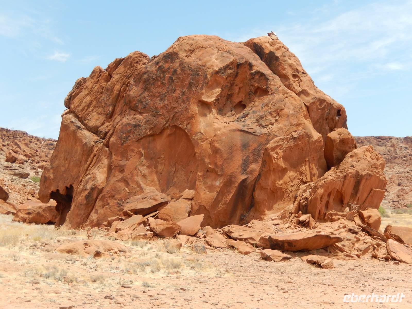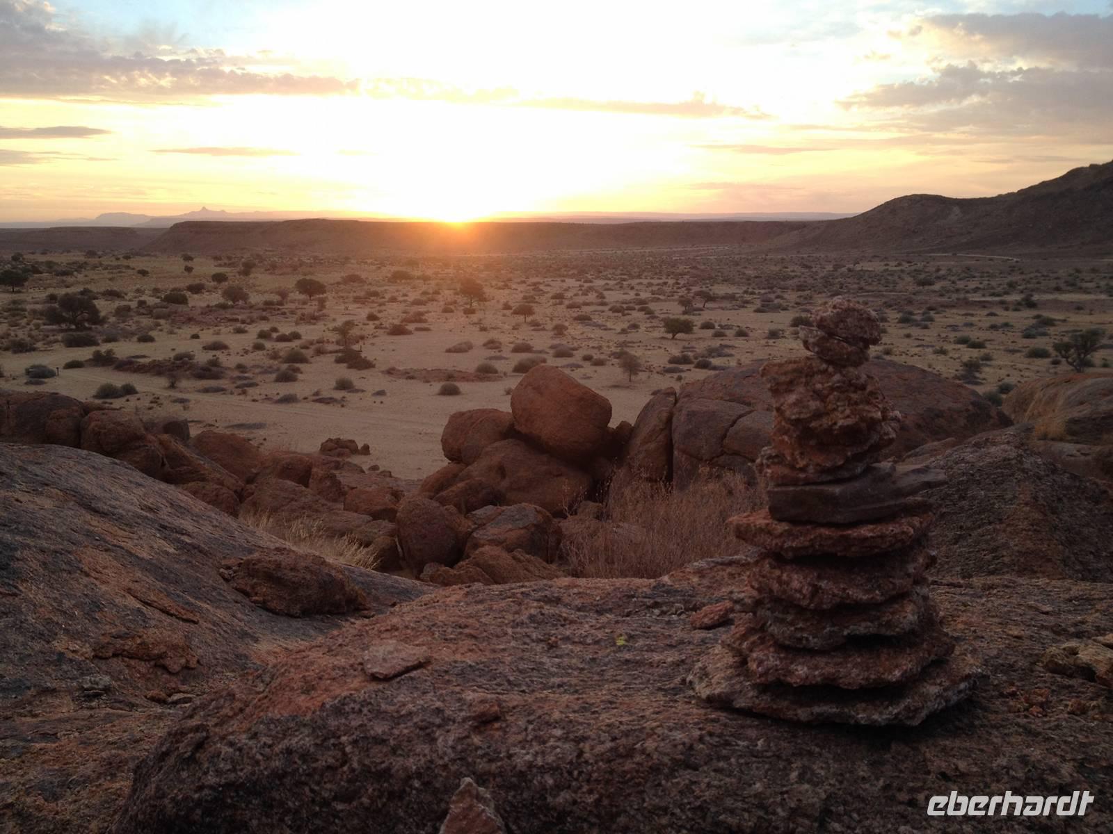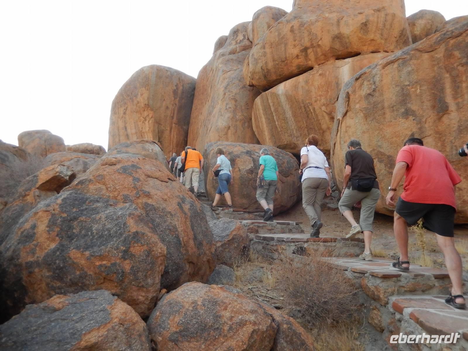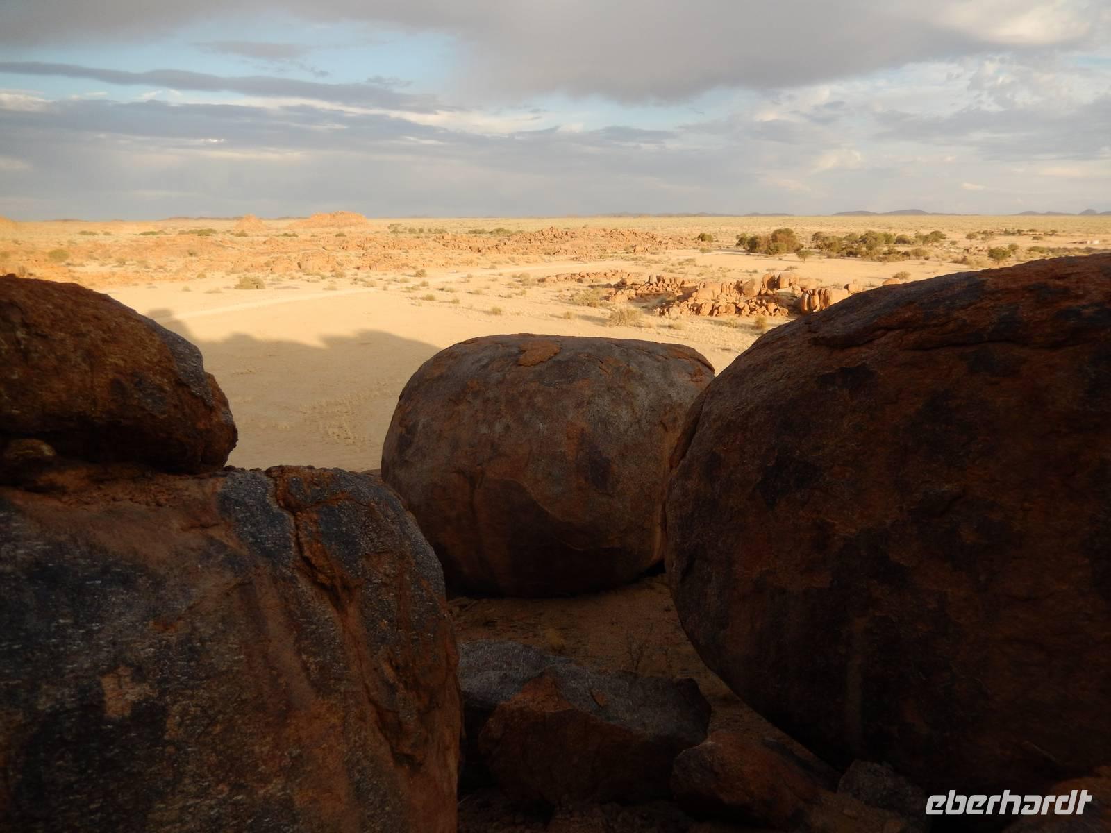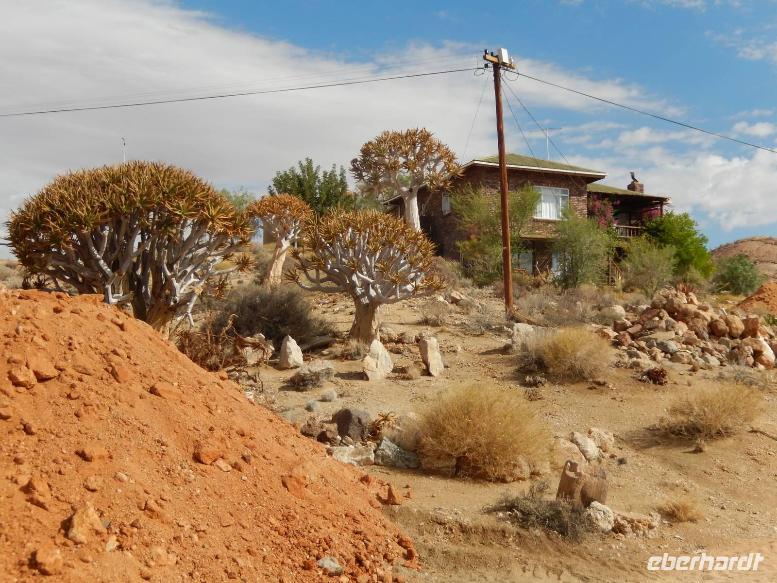 Entlang einer riesigen Kalkpfanne bei Koes führte uns der Weg weiter durch das Nama-Karoo-Becken zum "Spielplatz der Riesen" kurz vor Keetmanshoop. Wie eine zufällig umgekippte Lego-Kiste liegen hier, auf 5 km verstreut, größere Steinfelsen wahllos aufeinander getürmt. Die Formationen aus Doleritgestein muten wie ein faszinierendes Riesenpuzzle aus ungleichmäßigen Bausteinen an. Das Alter der mächtigen Steine wird auf ca. 180 Mio. Jahre geschätzt. Mit Claus spazierten wir auf einem Rundweg durch die Felsformationen, die durch den Sandschliff auf Hochglanz poliert wurden und nun in der Sonne glänzten. Besonders schön anzusehen waren die immer wieder dazwischenstehenden Köcherbäume.