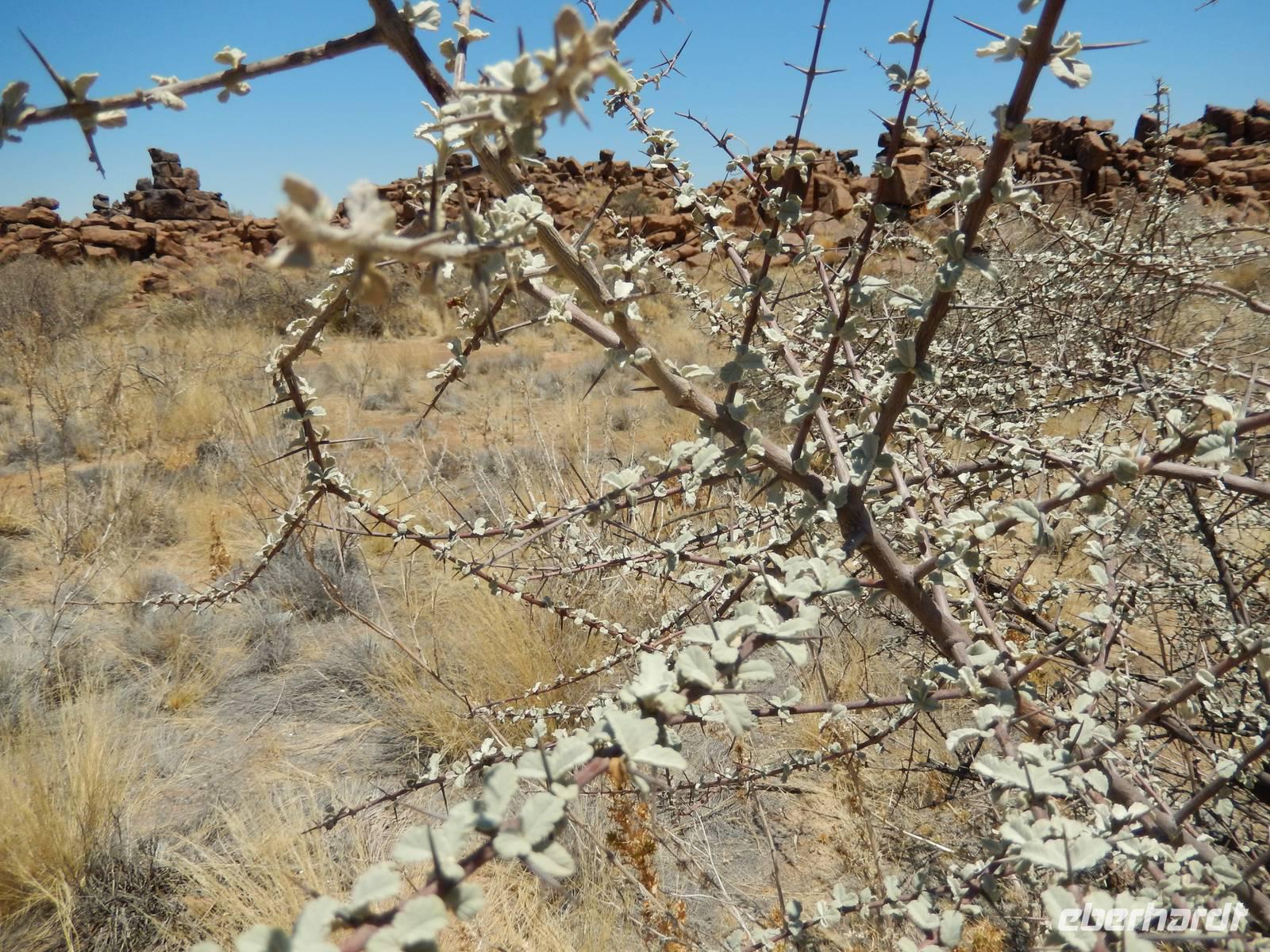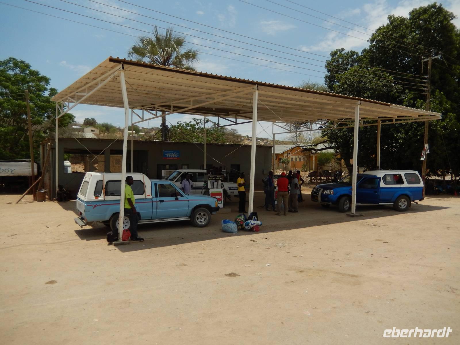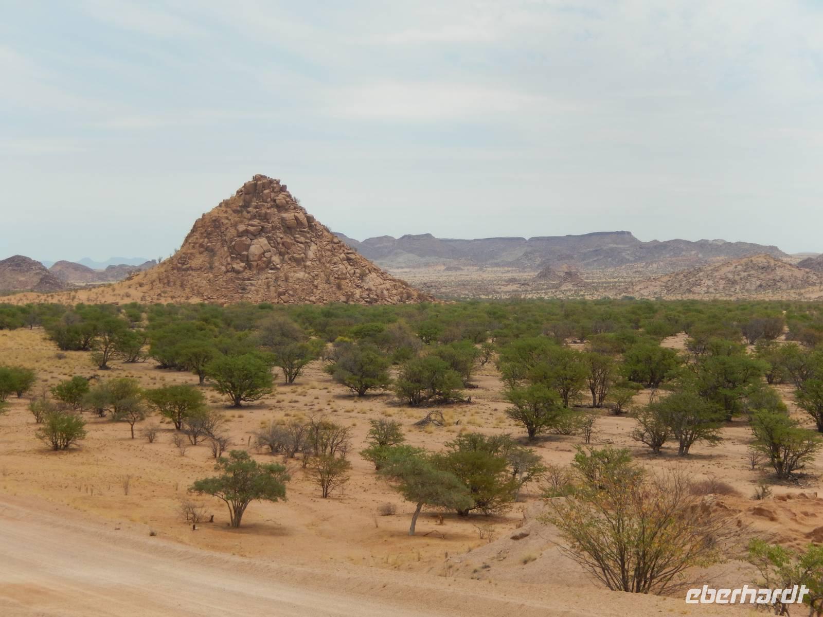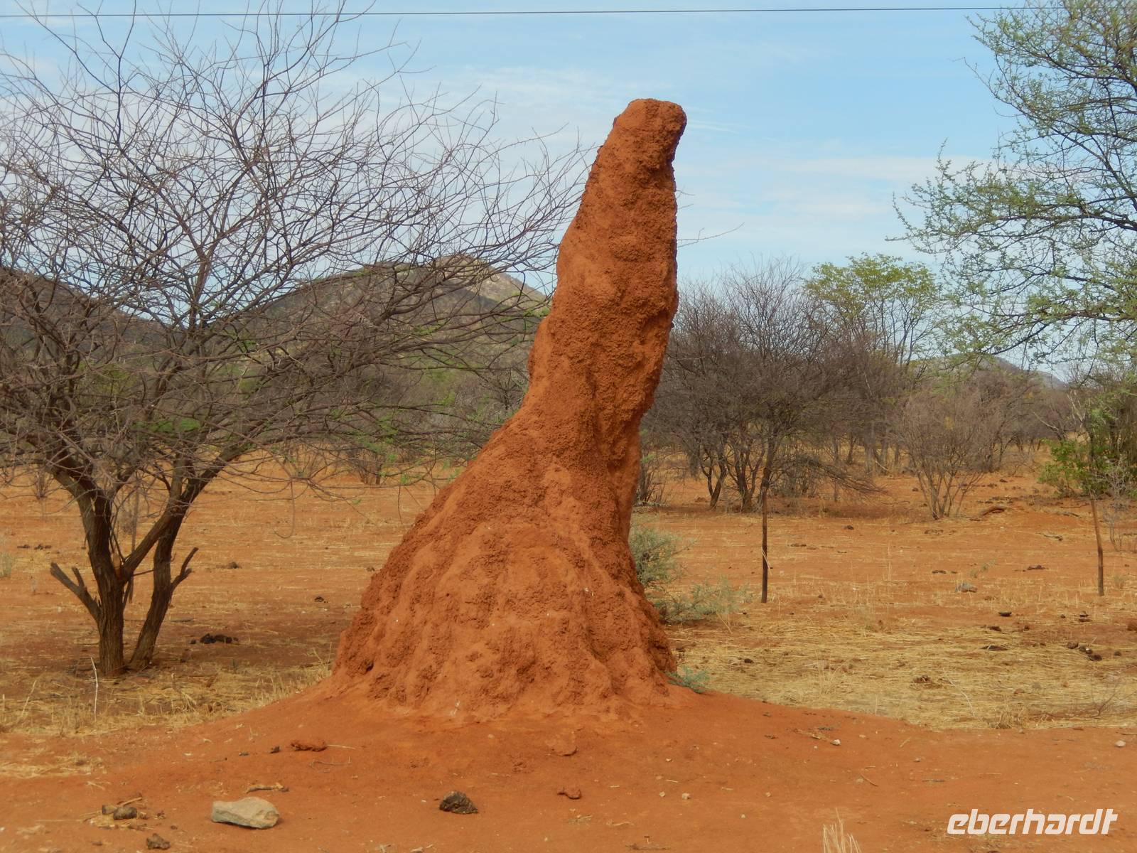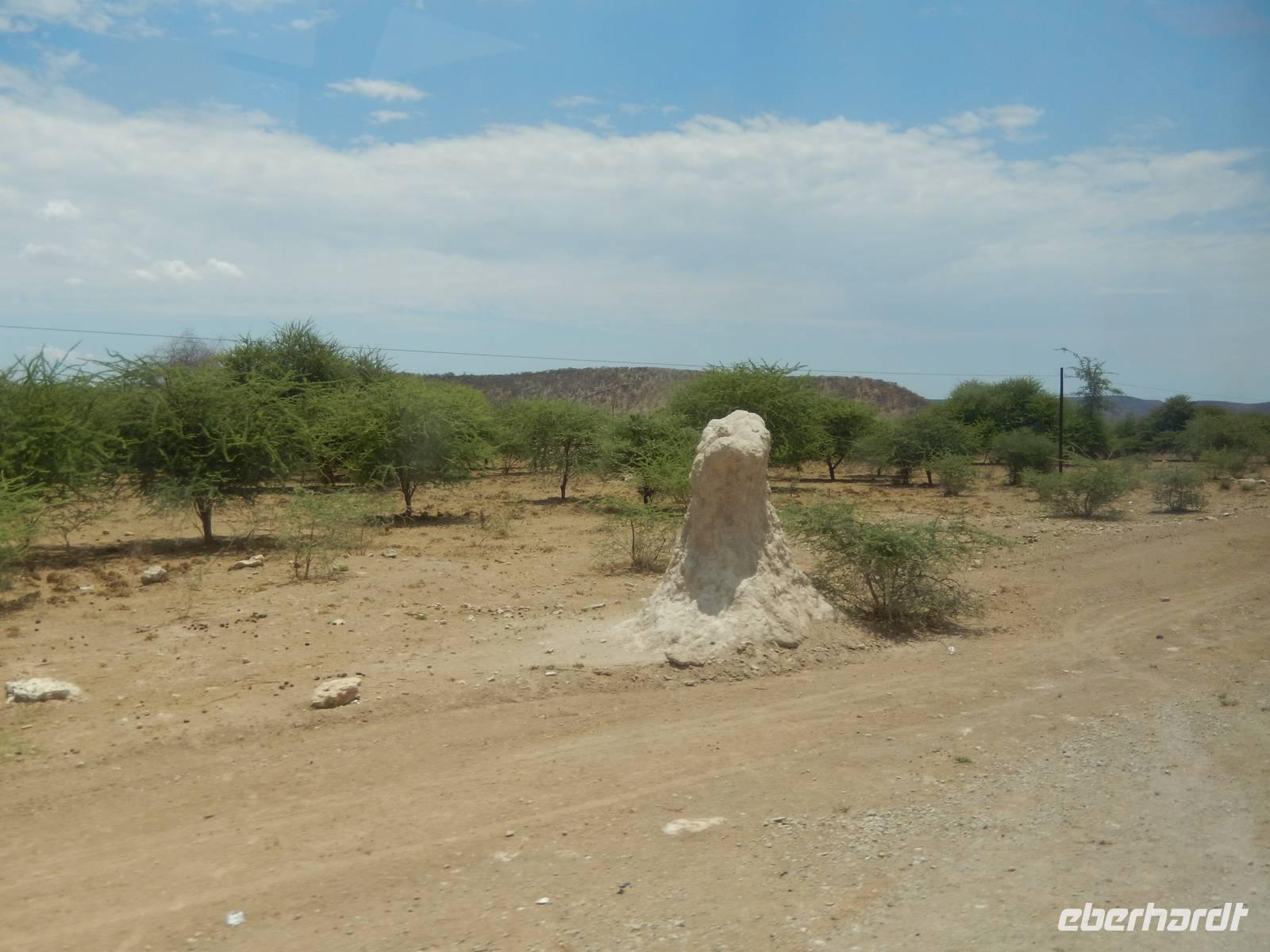Nach einem kurzen Tankstopp in Khorixas fuhren wir auf der Schotterpiste in Richtung Norden. Wir befanden uns mitten im Damaraland und unsere Blicke schweiften über die abwechslungsreiche Landschaft. Unzählige, teilweise meterhohe Termitenhügel in warmen Rot- und Brauntönen zierten die Landschaft. Wir stoppten in Kamanjab, einer kleinen Siedlung mit ca. 6.000 Einwohnern. Im kleinen Supermarkt kamen wir wieder mit den Einheimischen in Kontakt und trafen auf ein schönes Völkergemisch aus Damara, Herero, Nama und San. Eindrucksvoll zu hören war die Sprache mit den vielen Klicklauten (Khoisansprache).