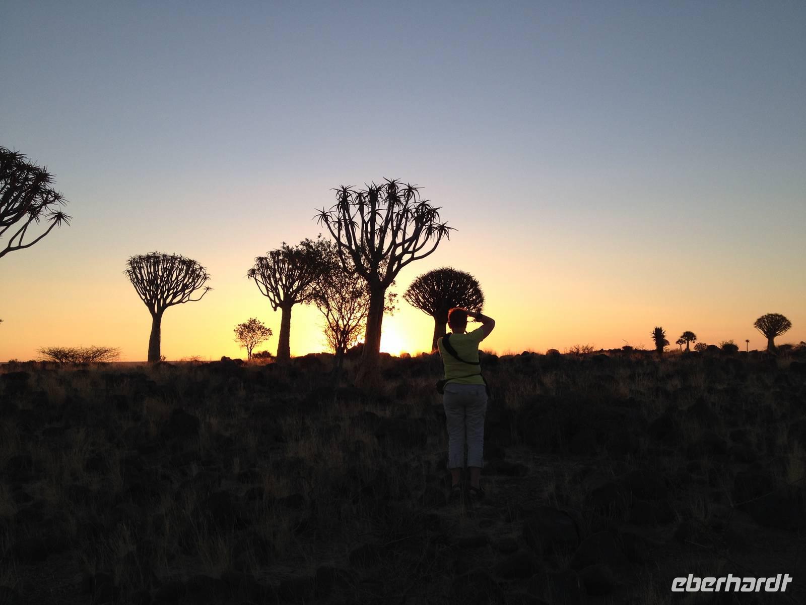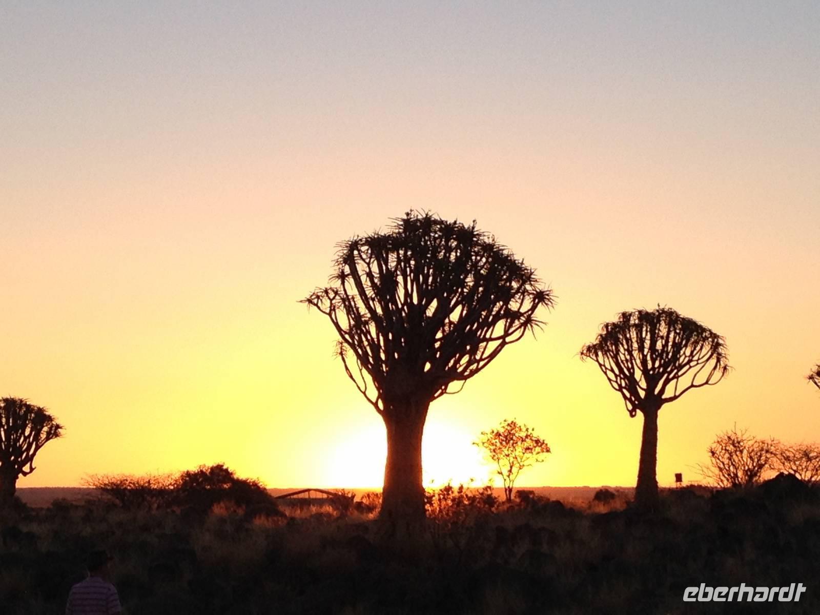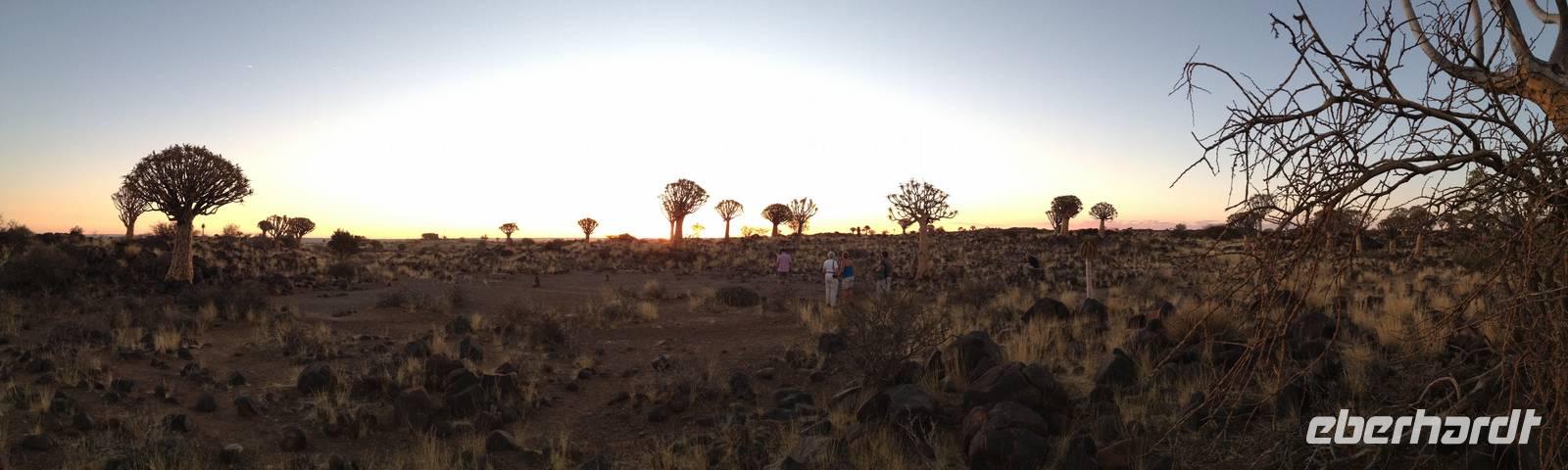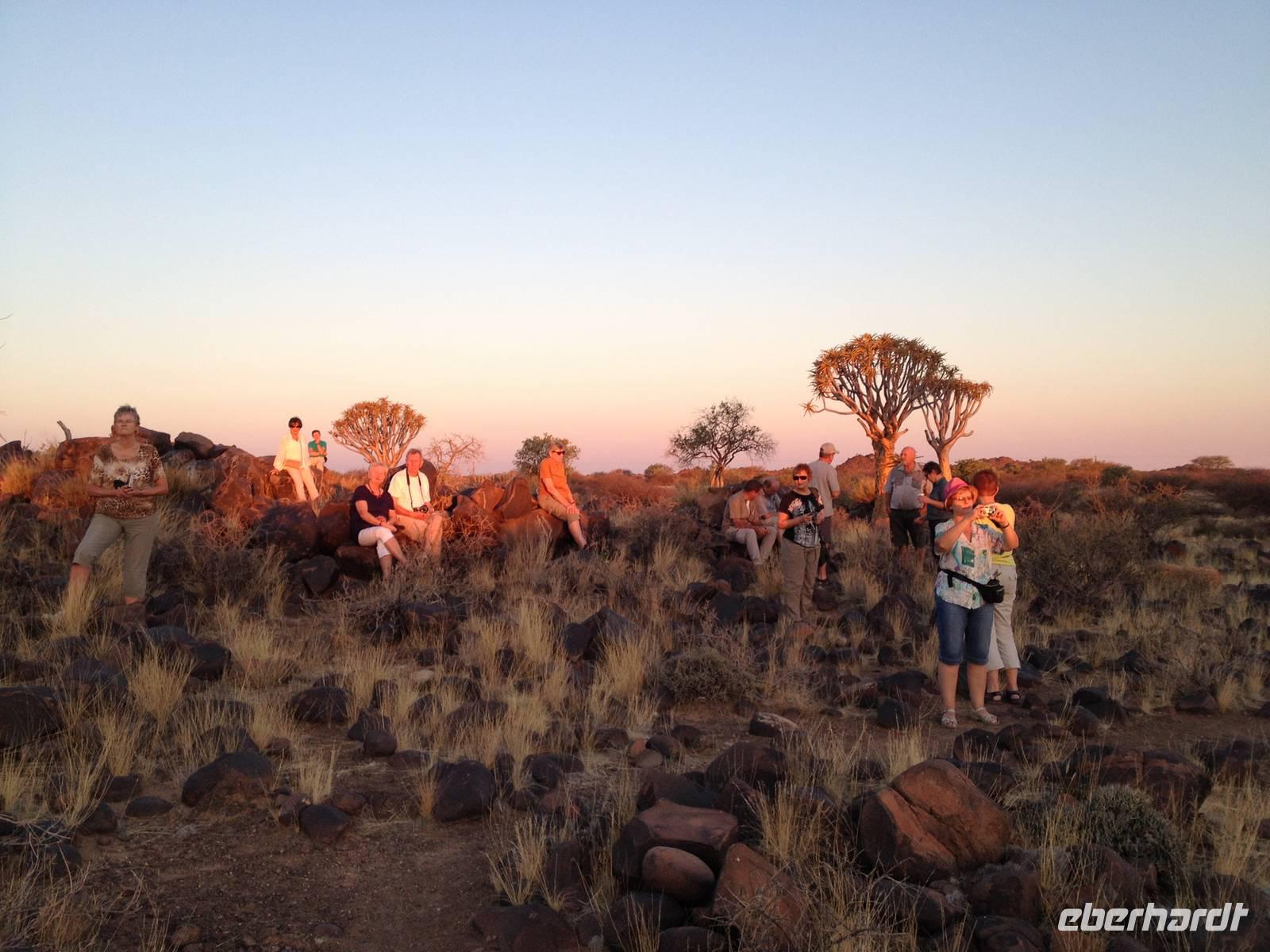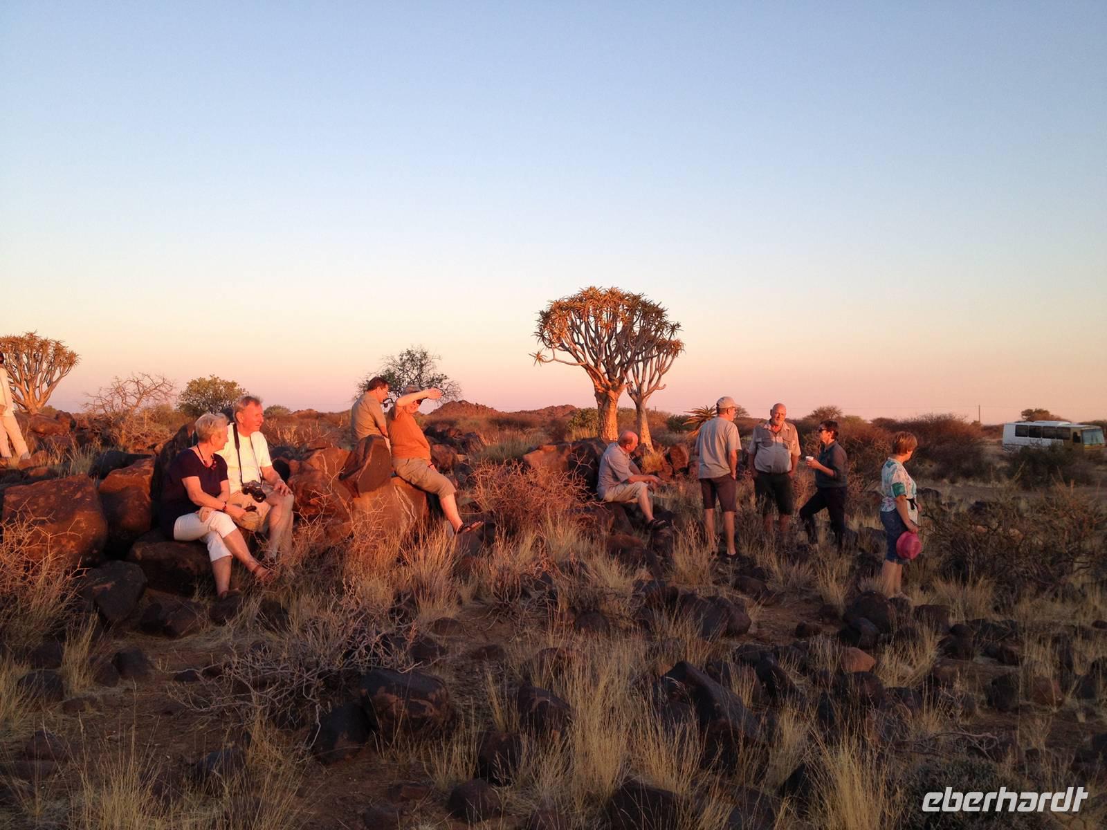Der Höhepunkt des Tages war sicherlich unser "Sundowner" im Köcherbaumwald auf dem Gelände der Farm Gariganus. Dieses spektakuläre, viel fotografierte Areal wurde mittlerweile zum National Monument deklariert und zieht gerade am Abend viele Leute an. Bei einem Gläschen Rotwein genossen wir den Sonnenuntergang und ließen die mächtigen Köcherbäume, das Wahrzeichen Süd-Namibias, auf uns wirken. Die Köcherbäume, die eigentlich gar keine Bäume, sondern Aloen sind, sind wahre Überlebenskünstler und können bis zu 300 Jahre alt werden. Den Namen Köcherbaum (oder Kokerboom in Afrikaans) erhielten sie von den hier lebenden San (Buschmänner), die den schwammigen Stamm aushöhlten und ihn als Köcher für ihre Pfeile nutzen. Am Ende entdeckten wir auch noch die kleinen Klippschliefer, murmeltierähnliche Nagetiere, die erstaunlicherweise mit dem Elefanten verwandt sind.