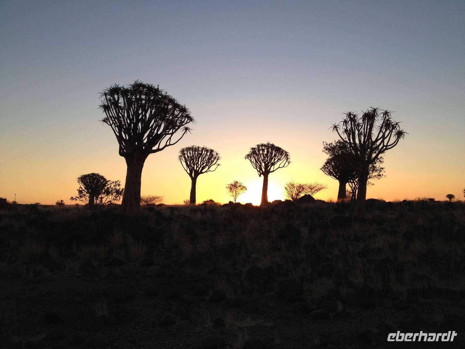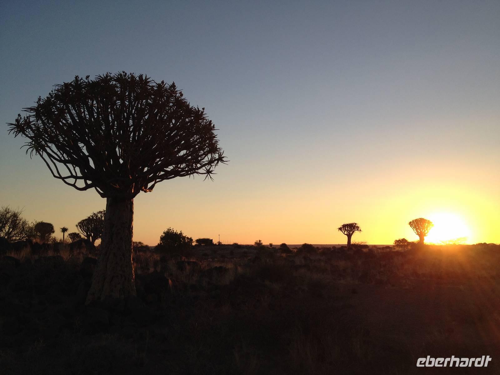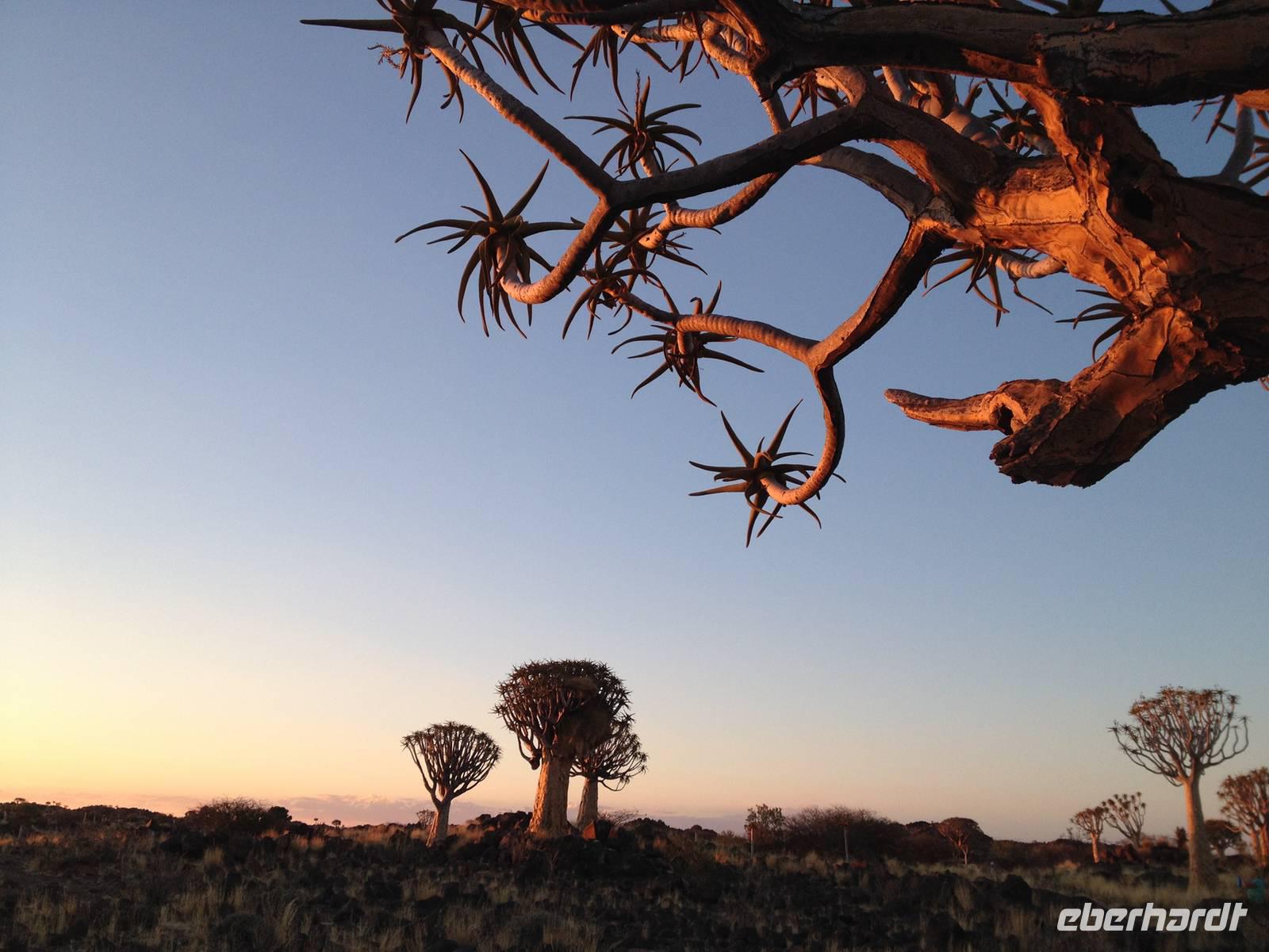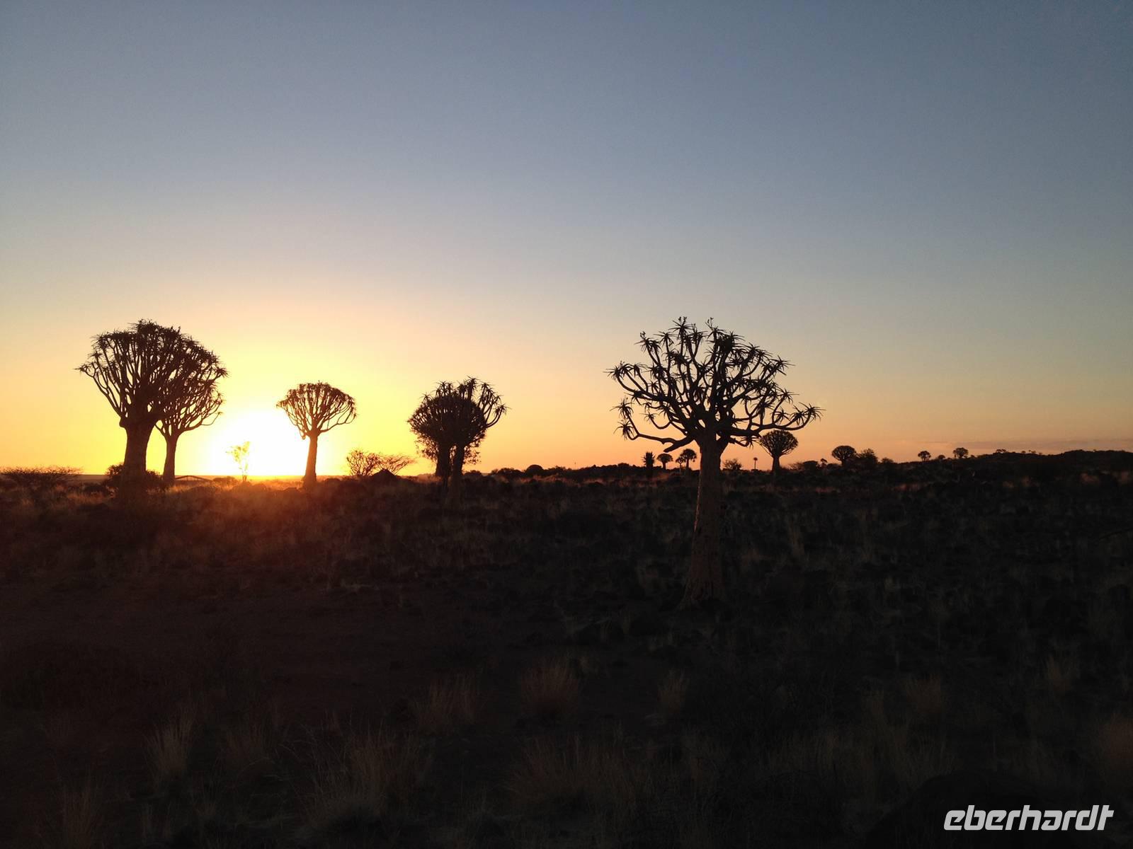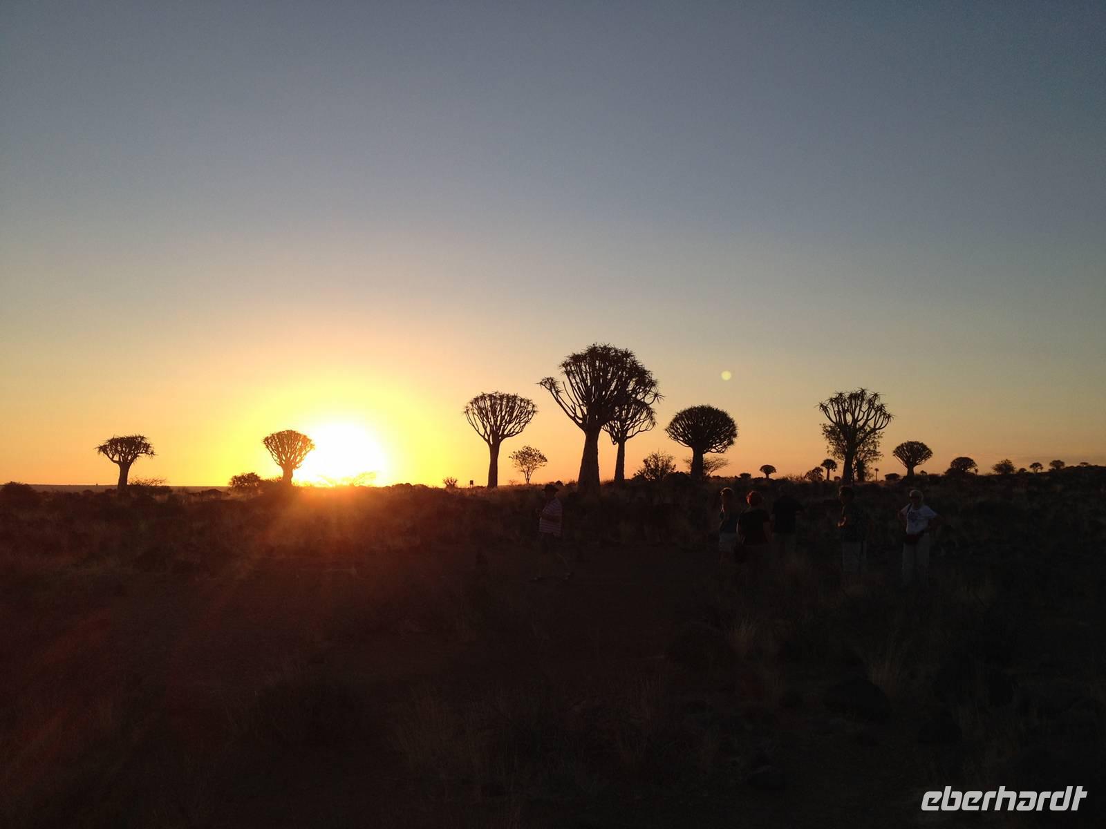 Der Höhepunkt des Tages war sicherlich unser "Sundowner" im Köcherbaumwald auf dem Gelände der Farm Gariganus. Dieses spektakuläre, viel fotografierte Areal wurde mittlerweile zum National Monument deklariert und zieht gerade am Abend viele Leute an. Bei einem Gläschen Rotwein genossen wir den Sonnenuntergang und ließen die mächtigen Köcherbäume, das Wahrzeichen Süd-Namibias, auf uns wirken. Die Köcherbäume, die eigentlich gar keine Bäume, sondern Aloen sind, sind wahre Überlebenskünstler und können bis zu 300 Jahre alt werden. Den Namen Köcherbaum (oder Kokerboom in Afrikaans) erhielten sie von den hier lebenden San (Buschmänner), die den schwammigen Stamm aushöhlten und ihn als Köcher für ihre Pfeile nutzen. Am Ende entdeckten wir auch noch die kleinen Klippschliefer, murmeltierähnliche Nagetiere, die erstaunlicherweise mit dem Elefanten verwandt sind.