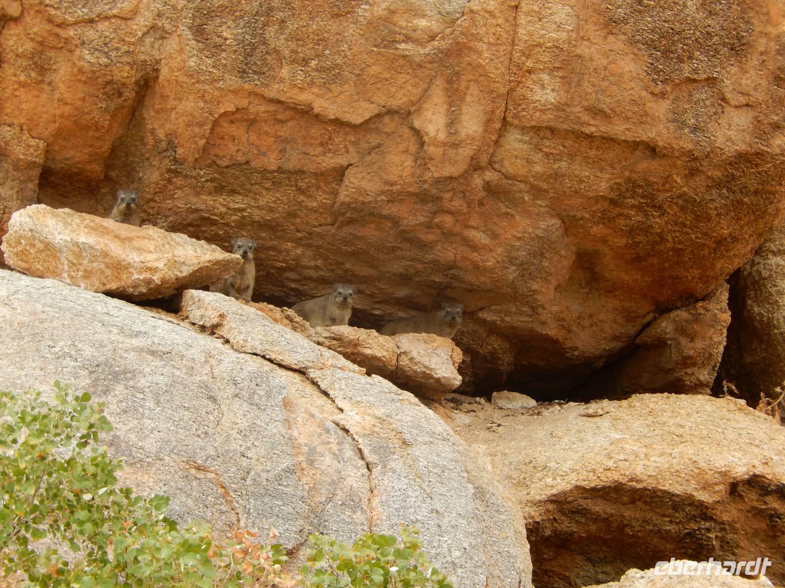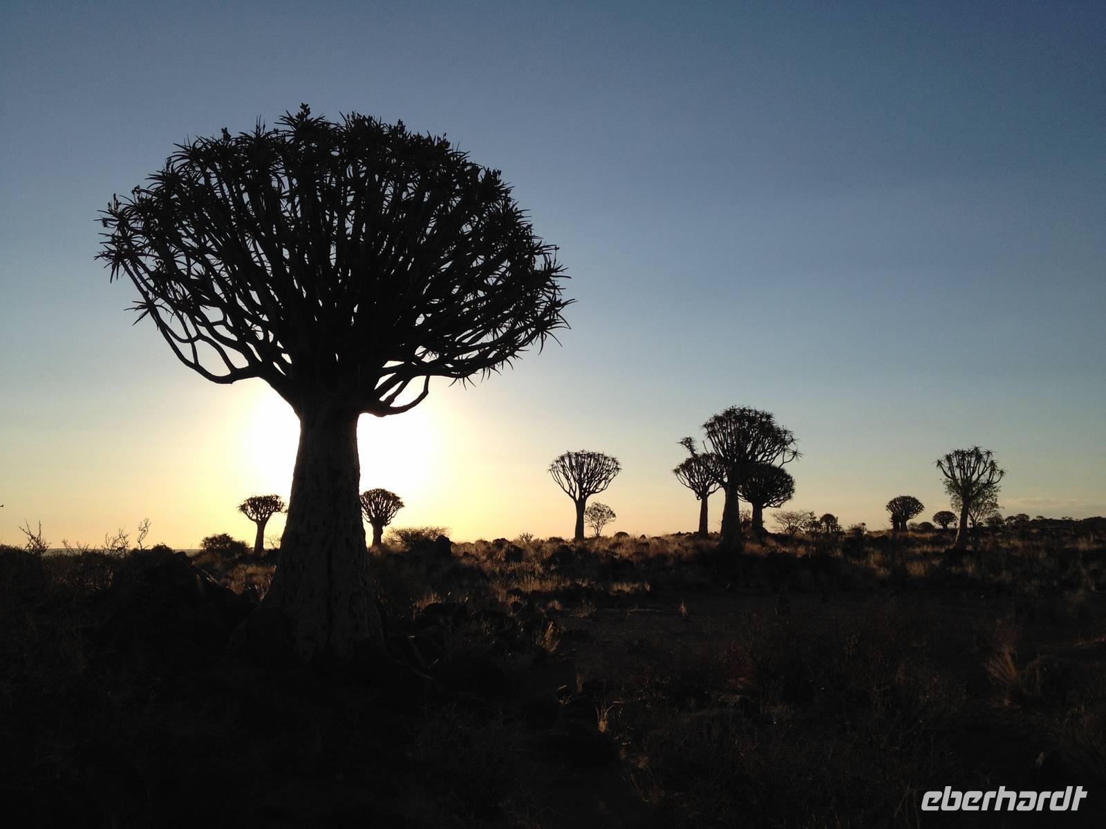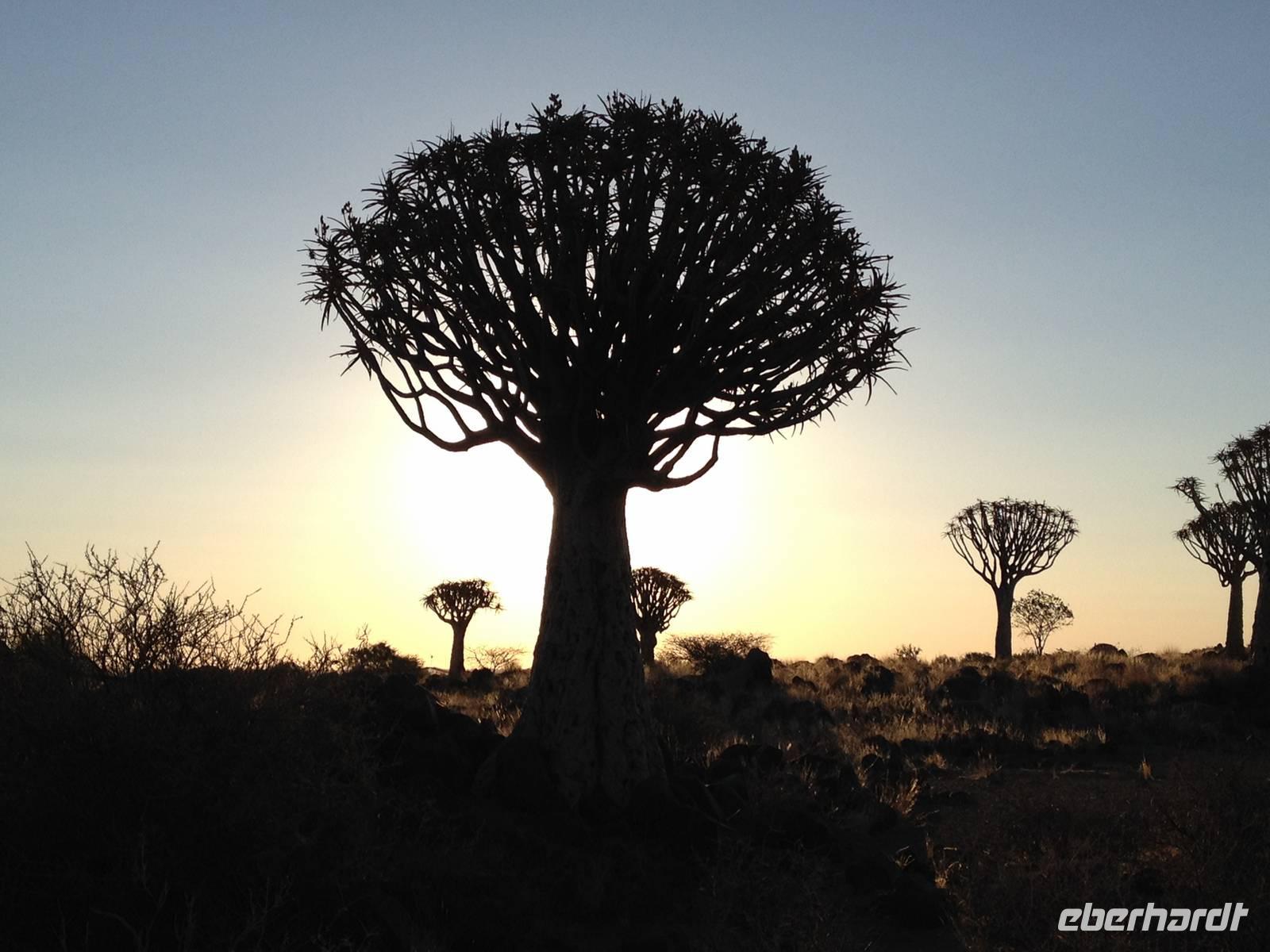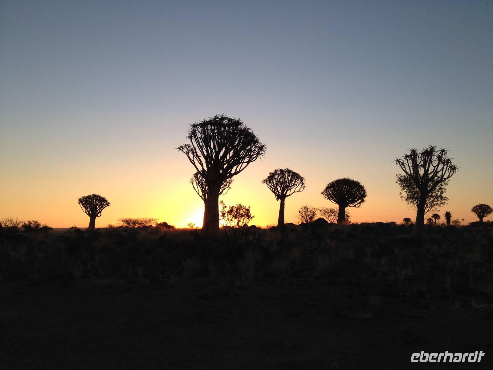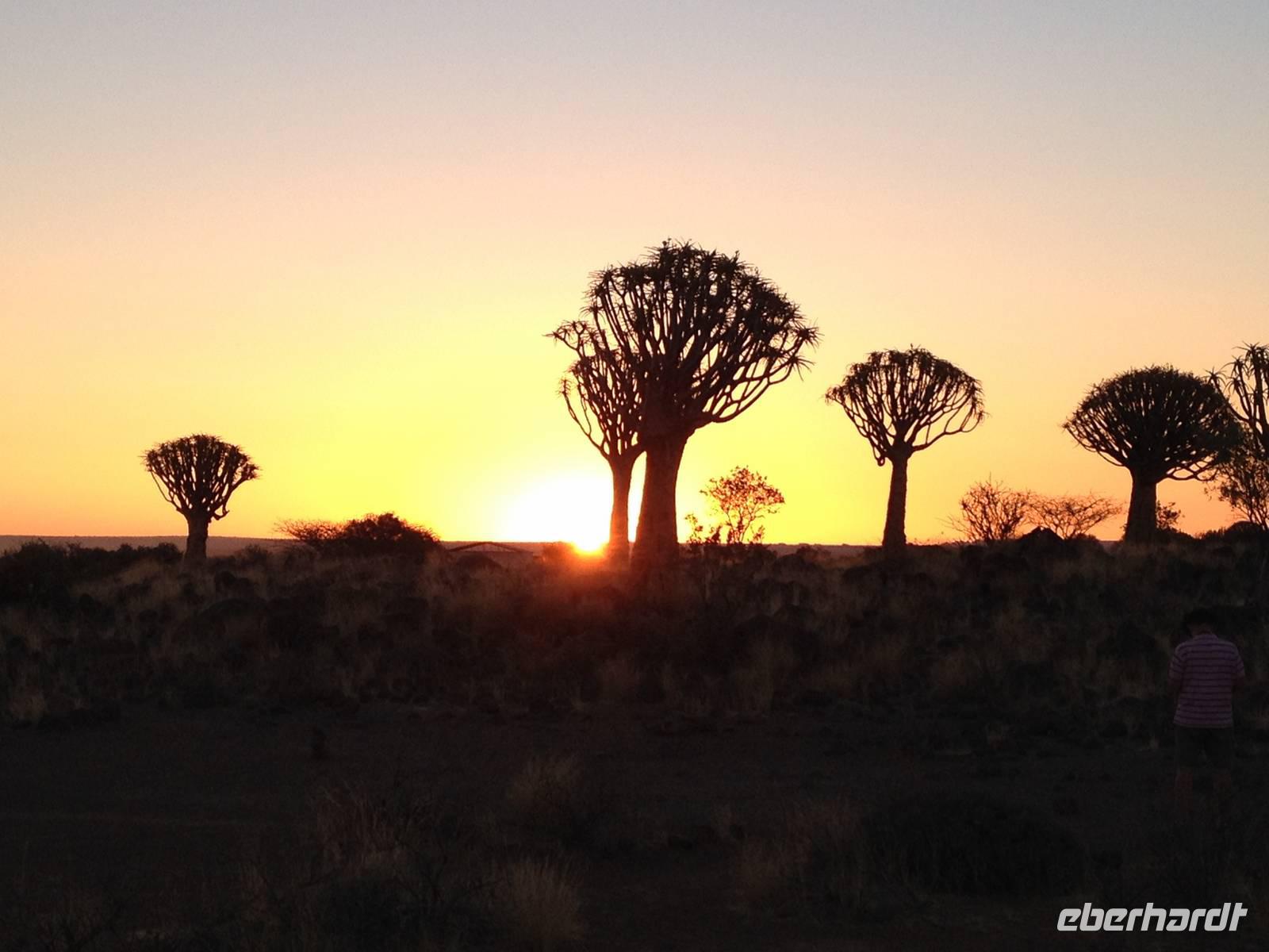 Der Höhepunkt des Tages war sicherlich unser "Sundowner" im Köcherbaumwald auf dem Gelände der Farm Gariganus. Dieses spektakuläre, viel fotografierte Areal wurde mittlerweile zum National Monument deklariert und zieht gerade am Abend viele Leute an. Bei einem Gläschen Rotwein genossen wir den Sonnenuntergang und ließen die mächtigen Köcherbäume, das Wahrzeichen Süd-Namibias, auf uns wirken. Die Köcherbäume, die eigentlich gar keine Bäume, sondern Aloen sind, sind wahre Überlebenskünstler und können bis zu 300 Jahre alt werden. Den Namen Köcherbaum (oder Kokerboom in Afrikaans) erhielten sie von den hier lebenden San (Buschmänner), die den schwammigen Stamm aushöhlten und ihn als Köcher für ihre Pfeile nutzen. Am Ende entdeckten wir auch noch die kleinen Klippschliefer, murmeltierähnliche Nagetiere, die erstaunlicherweise mit dem Elefanten verwandt sind.